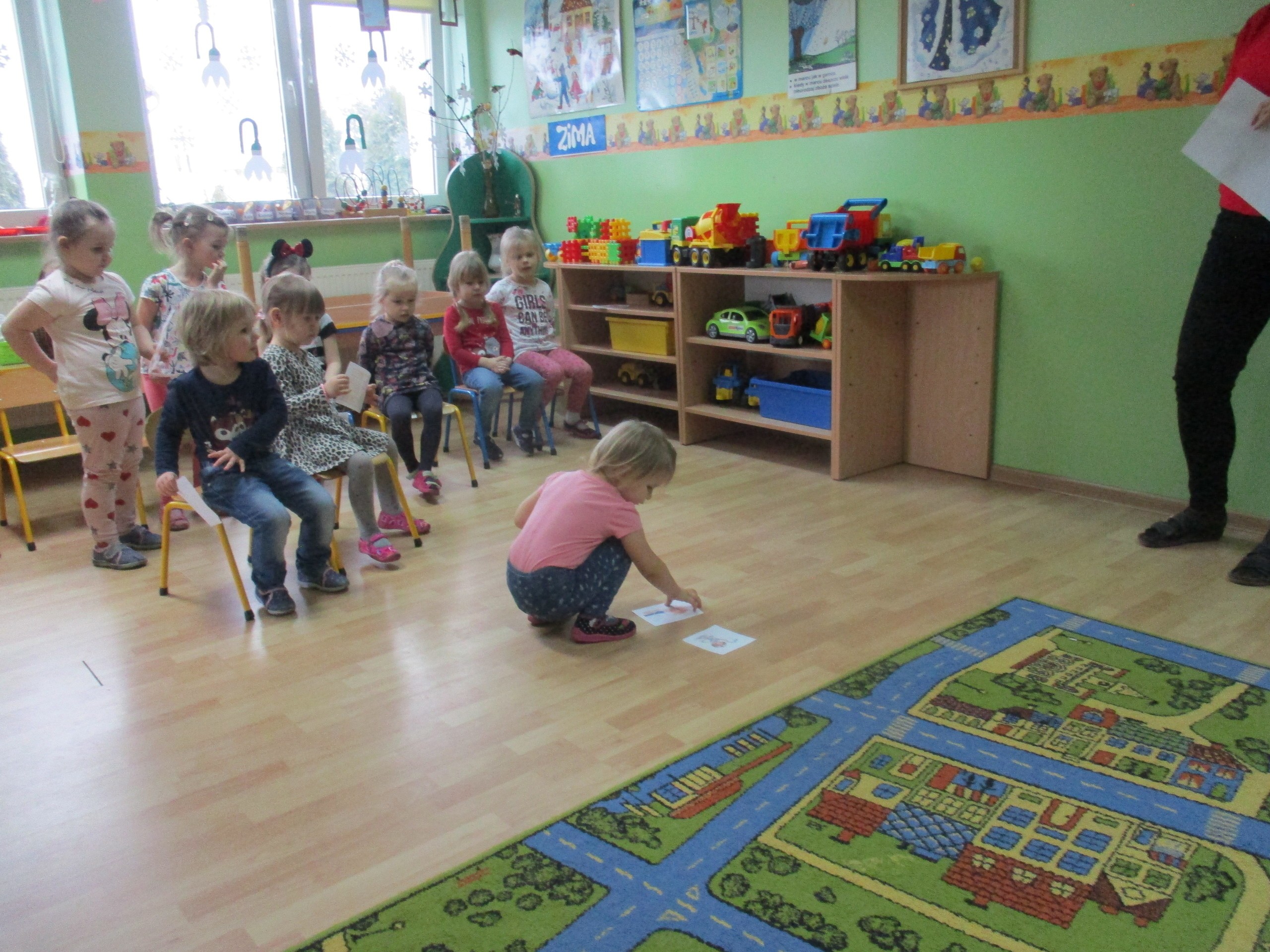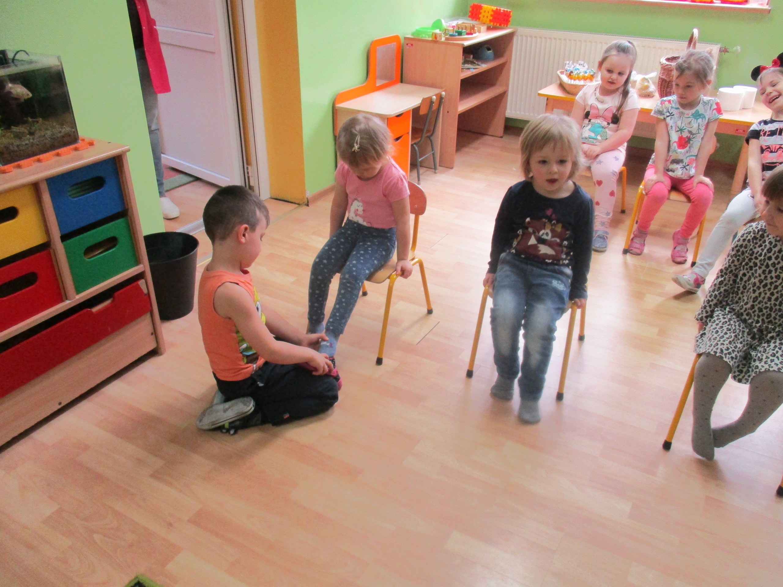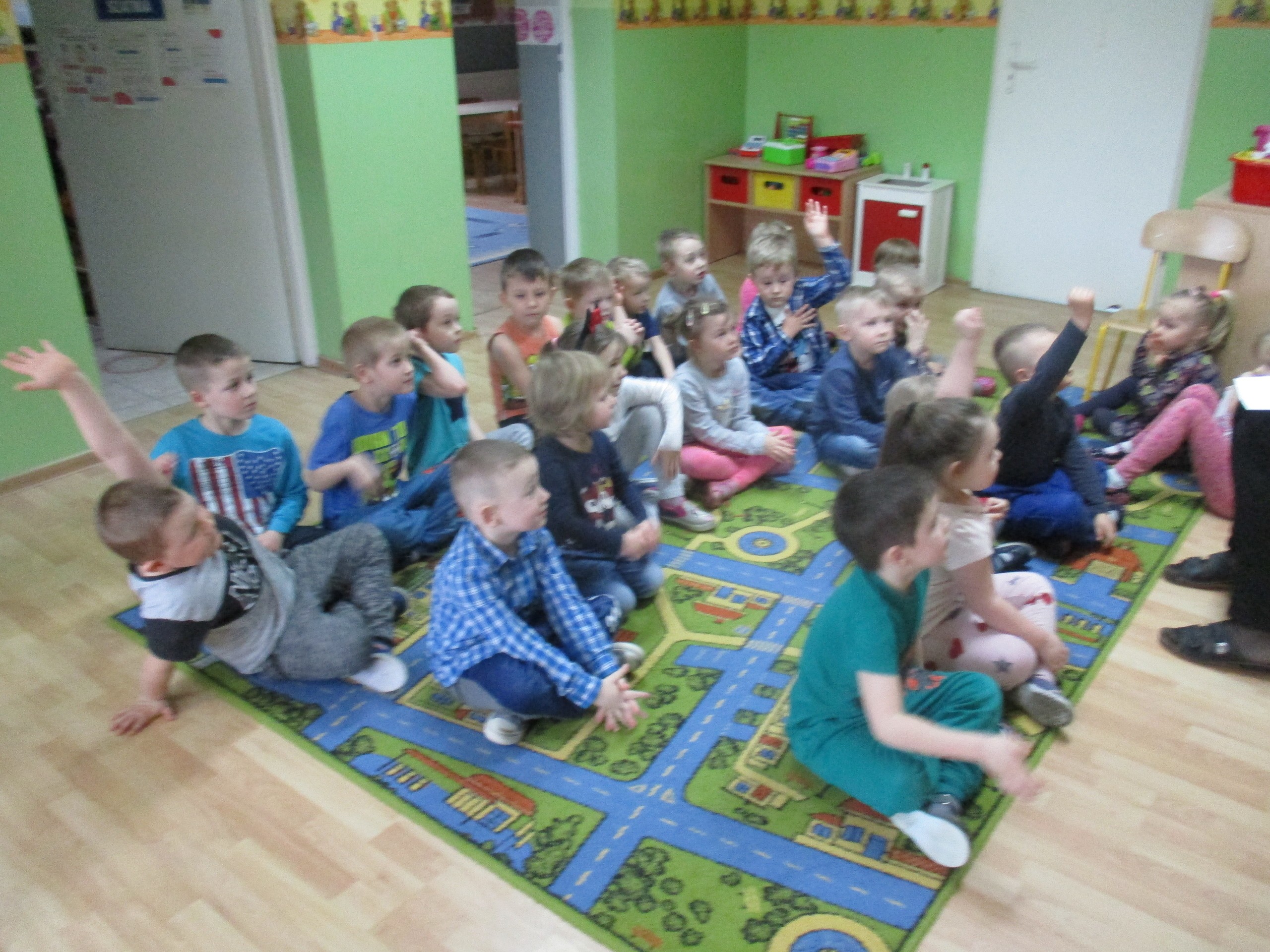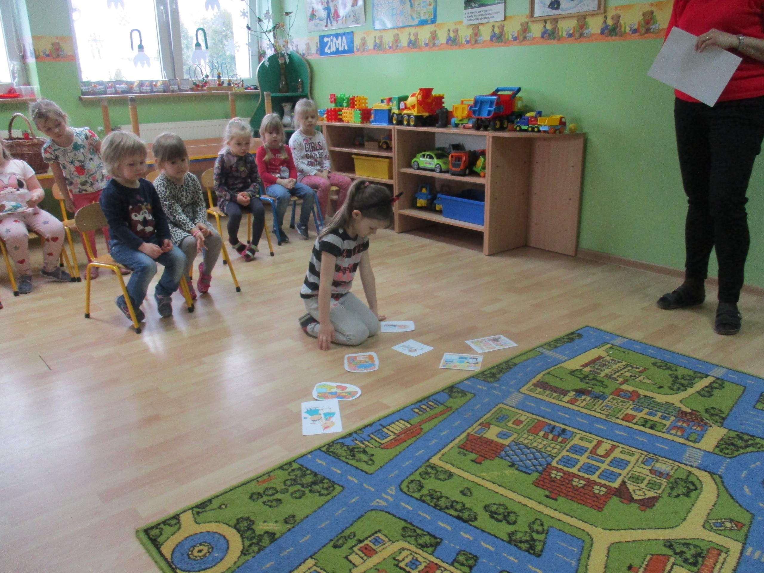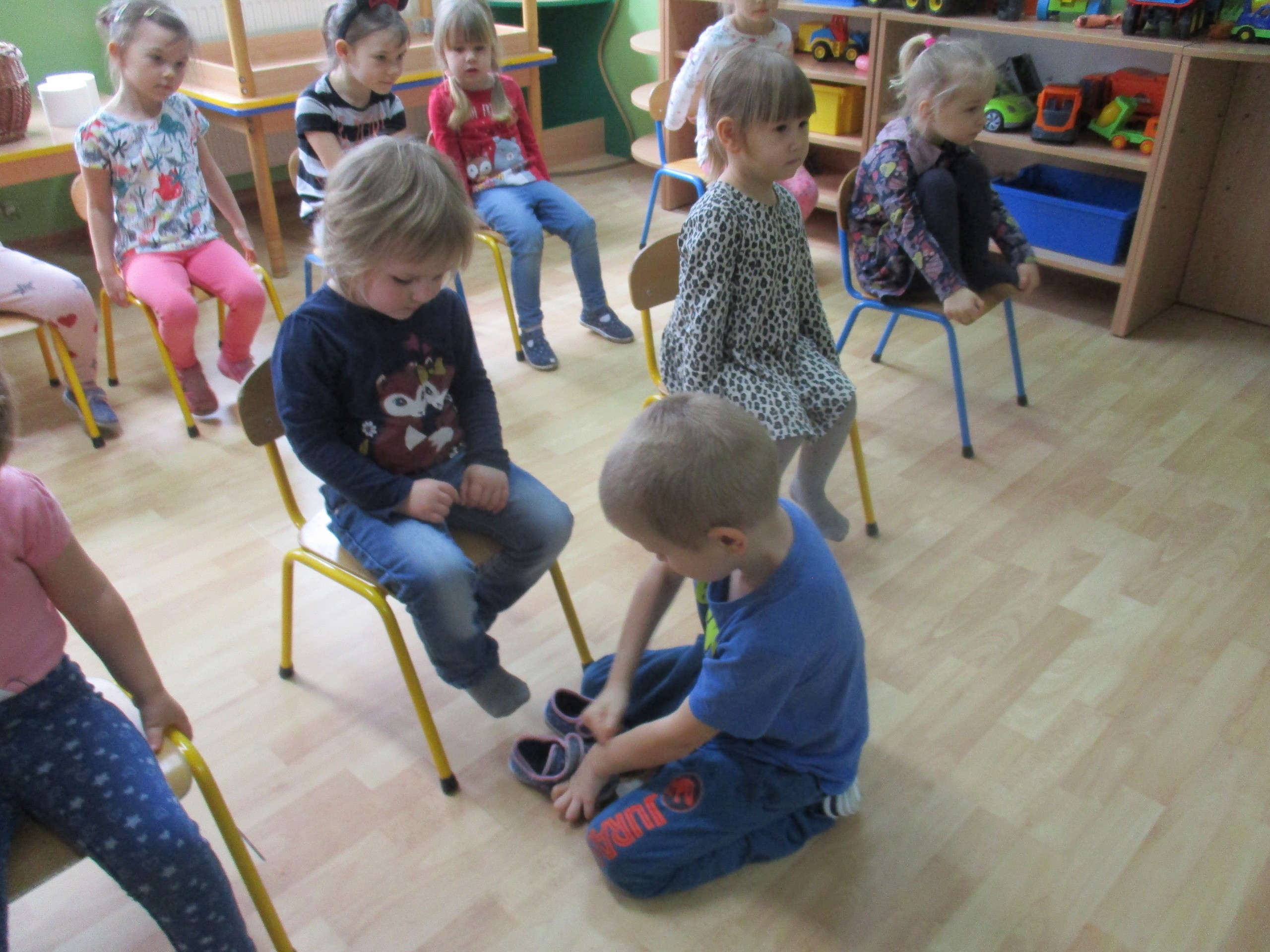 W miłej atmosferze rozpoczęliśmy wspólną zabawę. Chłopcy zamienili się w rycerzy a dziewczynki zostały księżniczkami. Na miano tego tytułu dziewczynki przy pomocy rycerzy musiały wykonać kilka zadań. Rozwiązywały zagadki, dopasowywały odpowiednie atrybuty księżniczki i rycerza, tworzyły z papieru toaletowego sukienkę dla księżniczki, oddzielały guziki od fasoli (tak jak to robił Kopciuszek), rycerze dopasowywali odpowiednie pantofelki do dziewczynek. Na koniec rycerze (chłopcy) założyli dziewczynkom i paniom korony, które w ten sposób oficjalnie zostały księżniczkami. Następnie dziewczynki i panie przeszły się po czerwonym dywanie. Chłopcy z wielką elegancją złożyli swoim koleżankom i paniom najserdeczniejsze życzenia, zaśpiewali sto lat i wręczyli słodkie upominki. Szczególne podziękowania od dziewczynek i pań otrzymali Antoś Durmna i Ksawery za osobiste upominki.