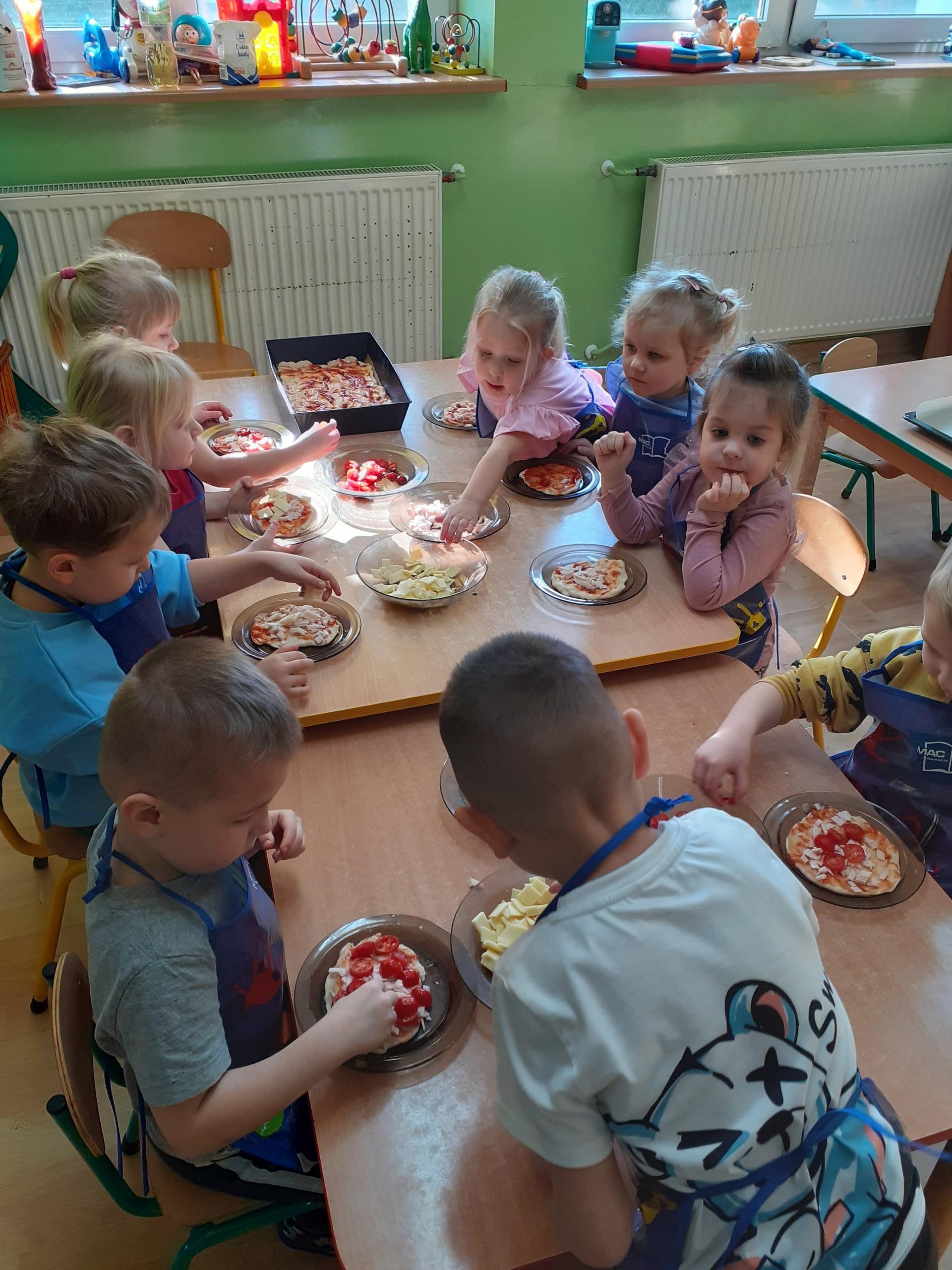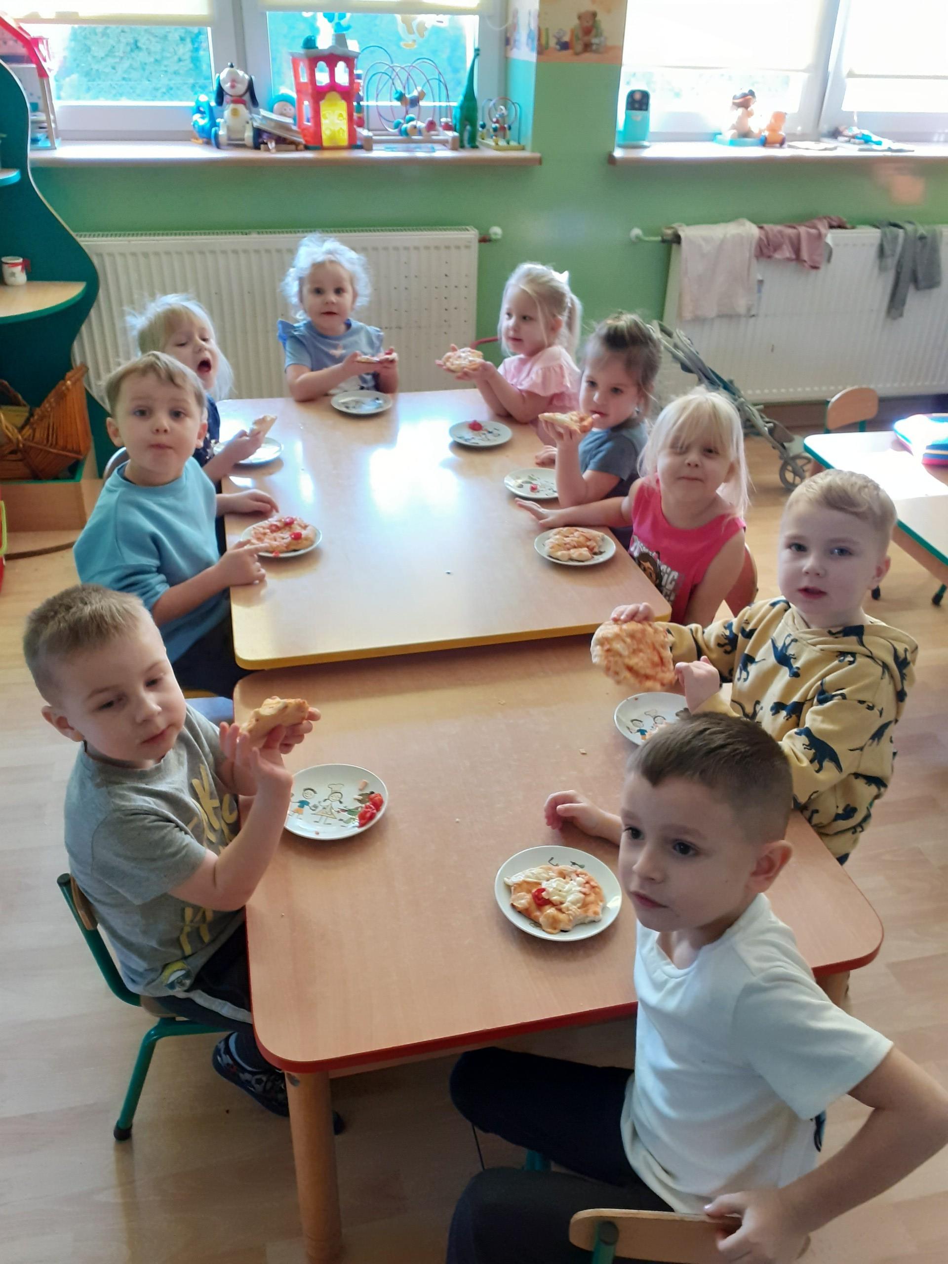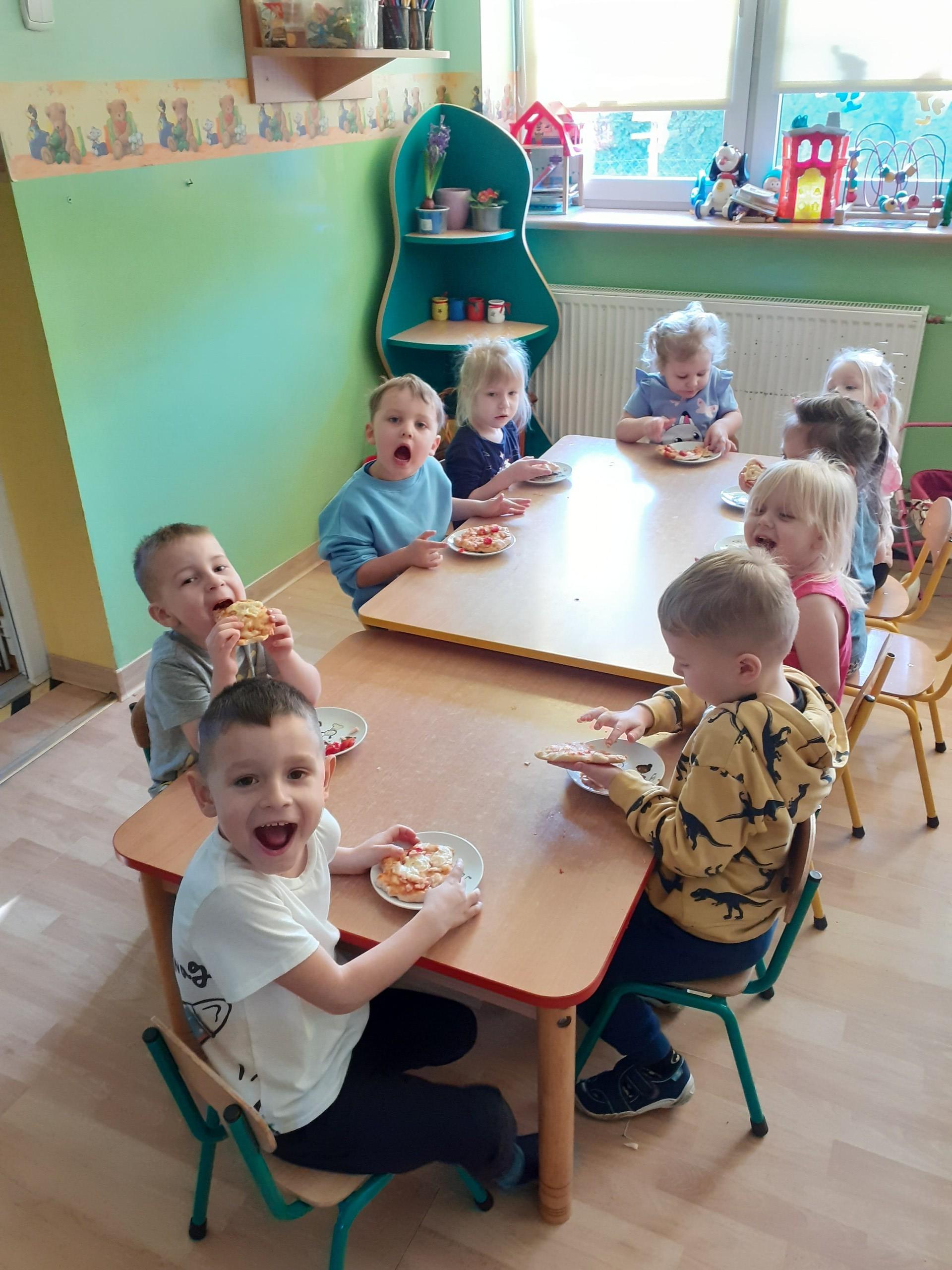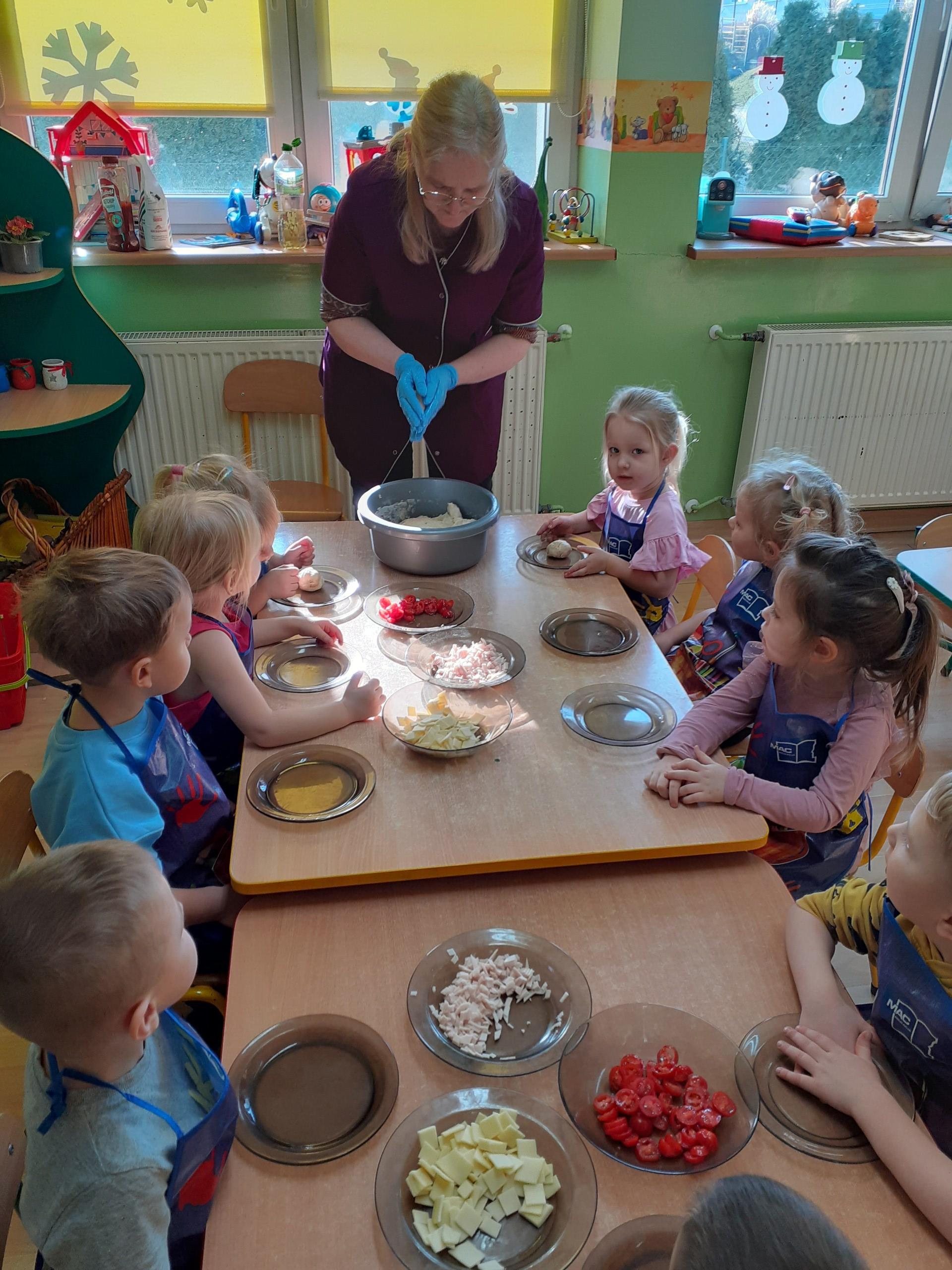 Dzisiaj dzieci z młodszej grupy obchodziły Dzień Pizzy. Dzieciaki spędziły dzień w „Pizzerii MUCHOMORKI”, przygotowując pizzę z ulubionymi składnikami: szynką, serem i pomidorkami. Było pysznie…, mniam, mniam, mniam…