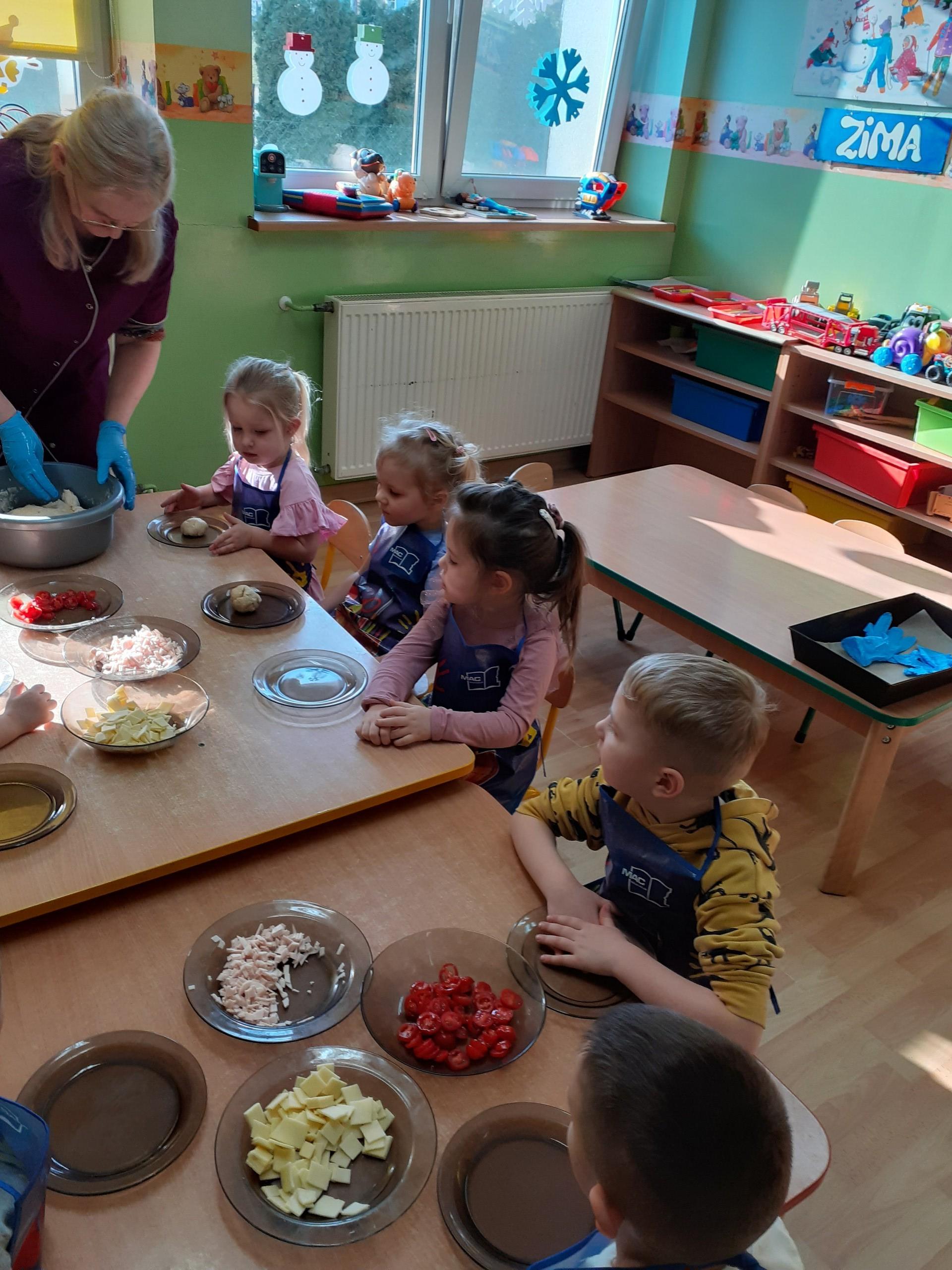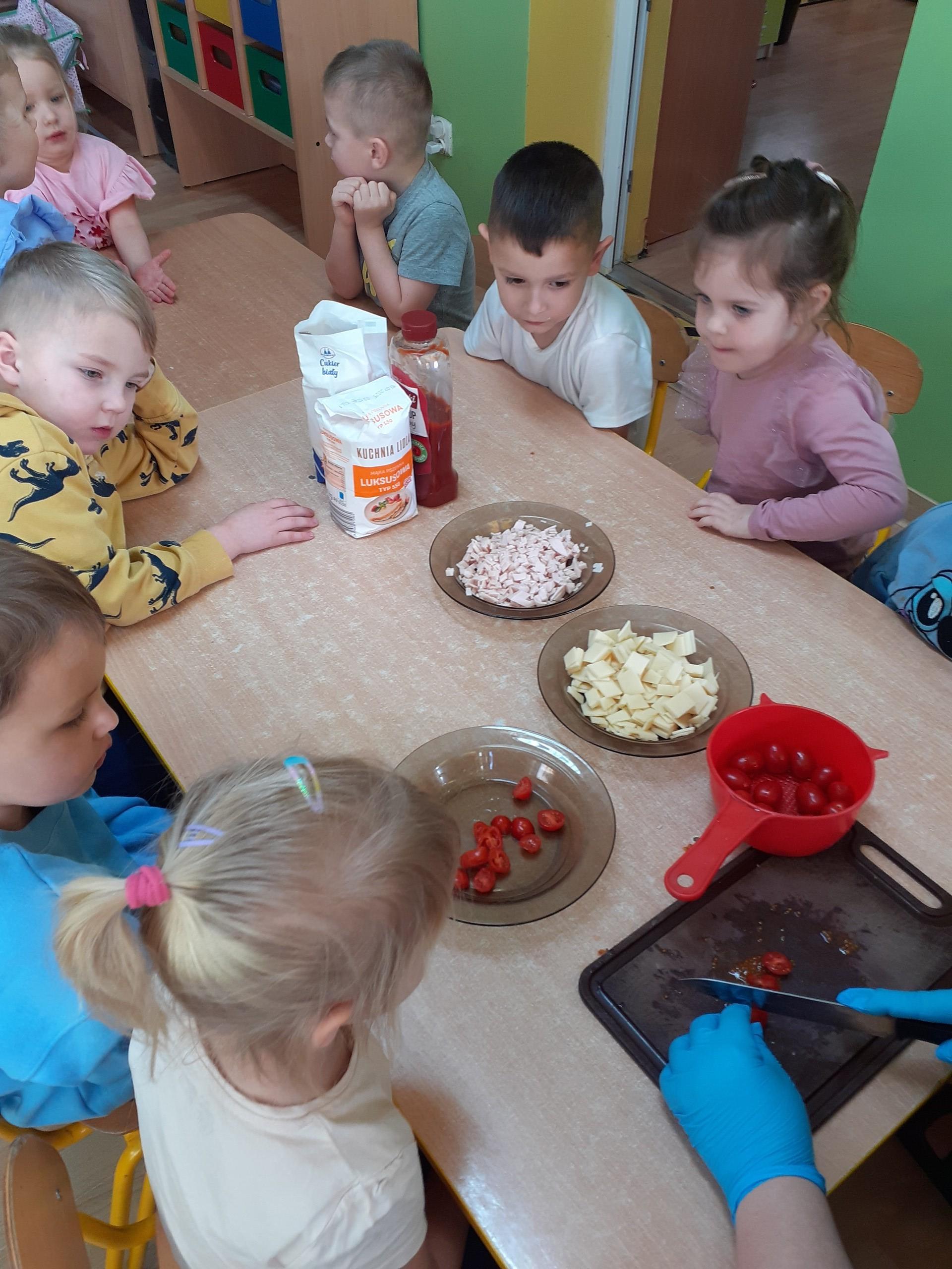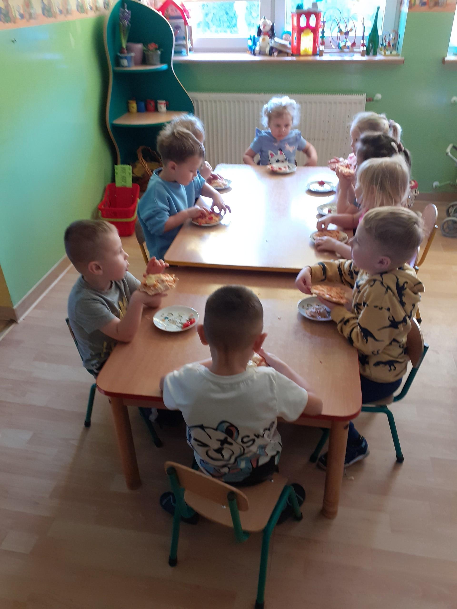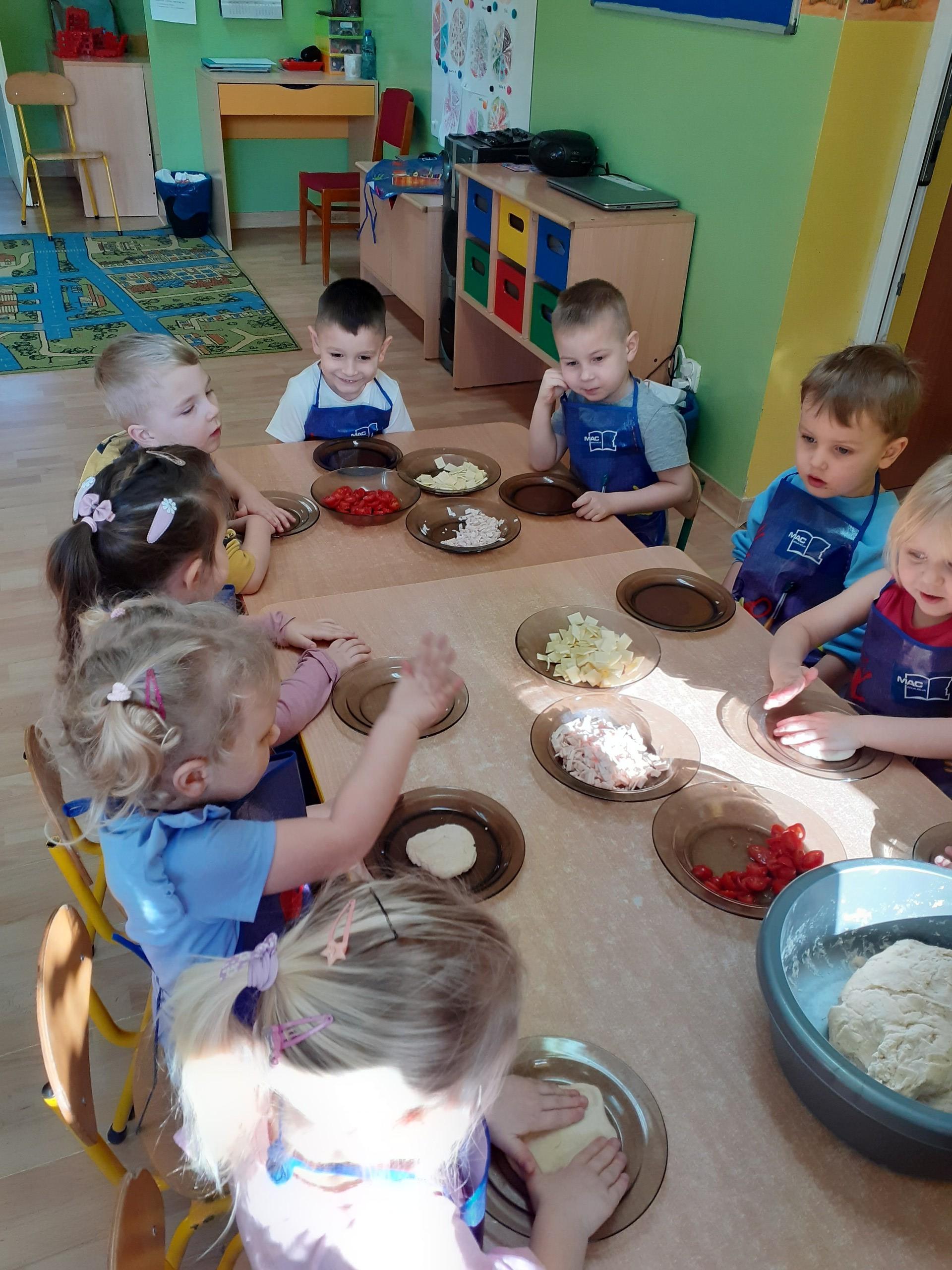 Dzisiaj dzieci z młodszej grupy obchodziły Dzień Pizzy. Dzieciaki spędziły dzień w „Pizzerii MUCHOMORKI”, przygotowując pizzę z ulubionymi składnikami: szynką, serem i pomidorkami. Było pysznie…, mniam, mniam, mniam…