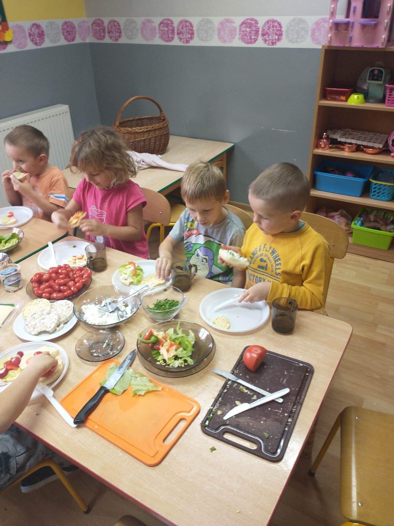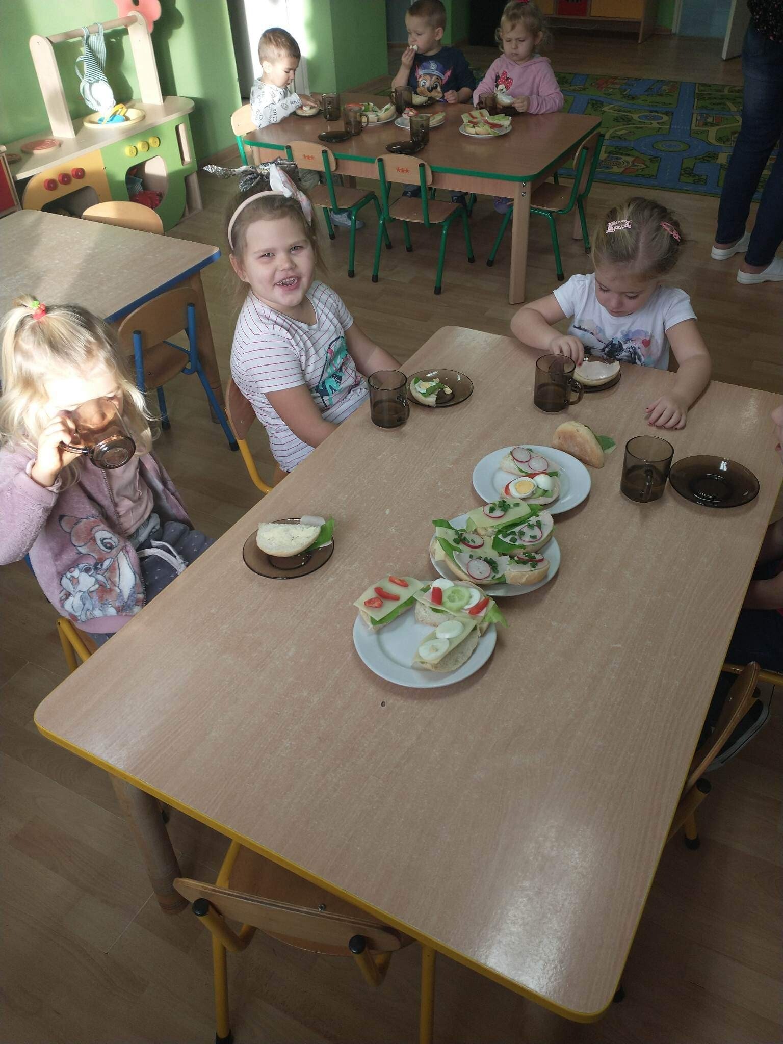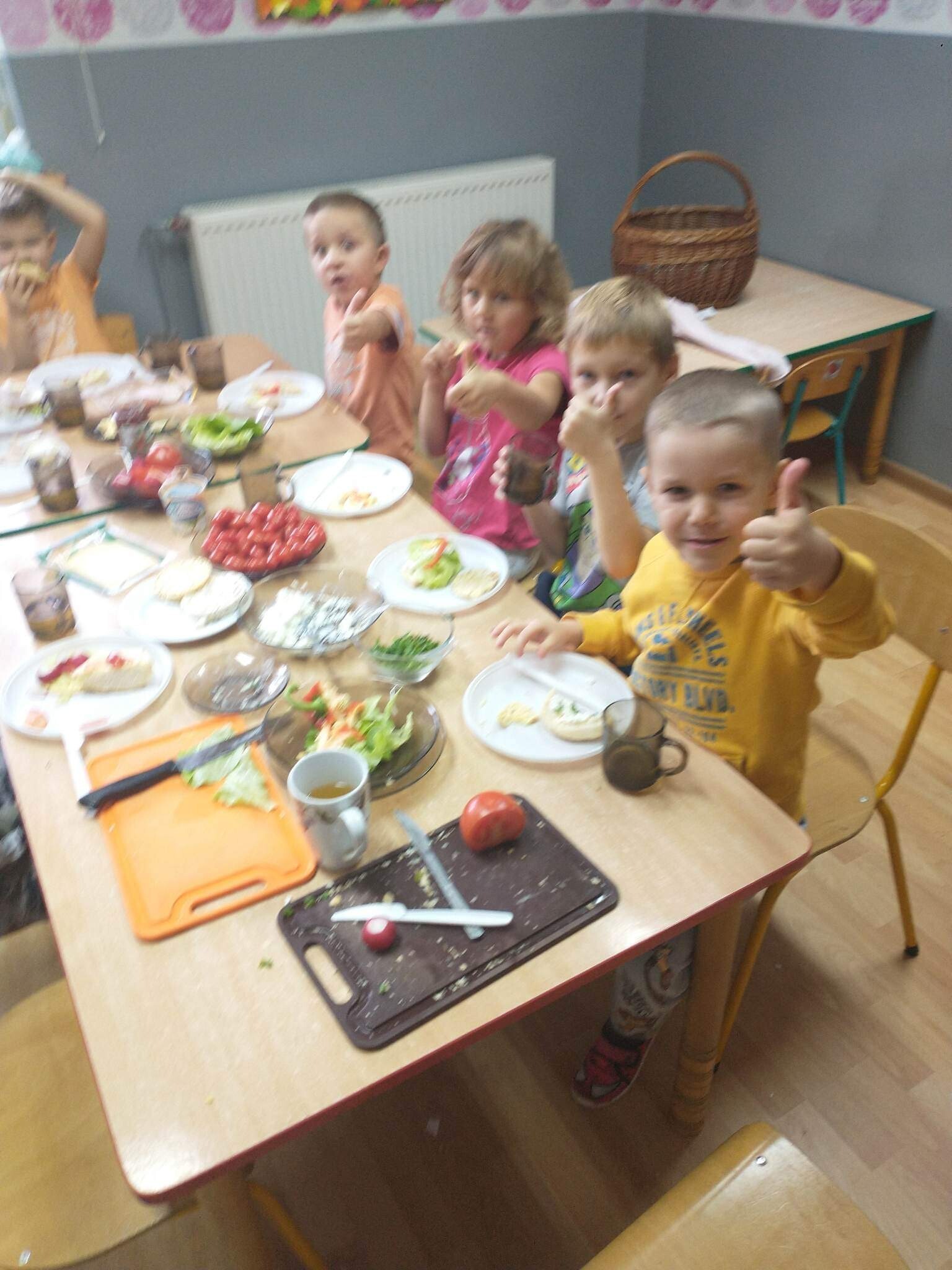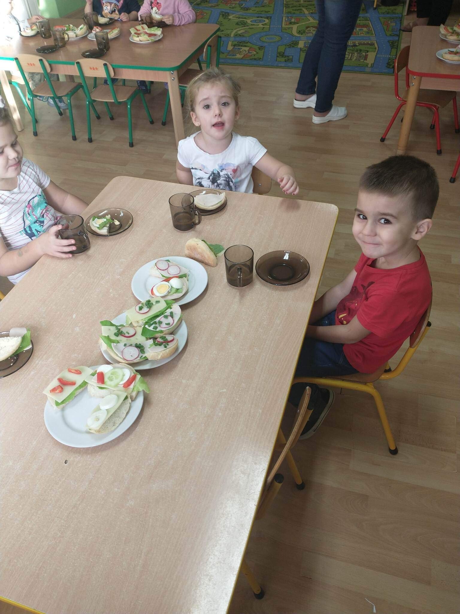 Dzisiaj w naszym przedszkolu był Dzień Zdrowego Śniadania. Starszaki przygotowały śniadanko dla wszystkich dzieci w przedszkolu. Samodzielnie smarowały bułeczki, i układały na nich wybrane przez siebie produkty. Okazało się, że dzieci jednak lubią warzywa, a najlepiej smakują im kanapki zrobione własnoręcznie.