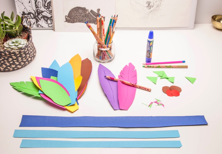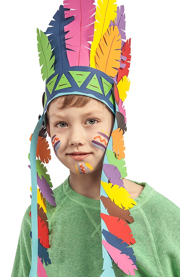 W pióropuszu najważniejsze są PIÓRA. Nasze dzieło zaczynamy zatem od wycinania kształtów o różnych długościach i szerokościach, które mają przypominać pióra. Nie muszą być idealne, ponieważ prawdziwe pióra też nie są identyczne. Nacięcia na końcówkach piór dodadzą całości charakteru. Następnie wycinamy opaskę dopasowując ją do obwodu głowy naszego Indianina. Rozkładamy opaskę na stole i układamy pióra. Kiedy uzyskamy zadowalający efekt przyklejamy pióra do opaski i naklejamy jeszcze jeden pasek ozdobny. Na koniec możemy opaskę ozdobić trójkątami lub innym wzorami nawiązującymi do indiańskich tradycji. Opcjonalnie możemy jeszcze wykonać boki pióropusza - mniejsze piórka poprzyklejać na pasku papieru i całość przykleić prostopadle do opaski. W takim nakryciu głowy nasz Indianin zostanie prawdziwym wodzem.
