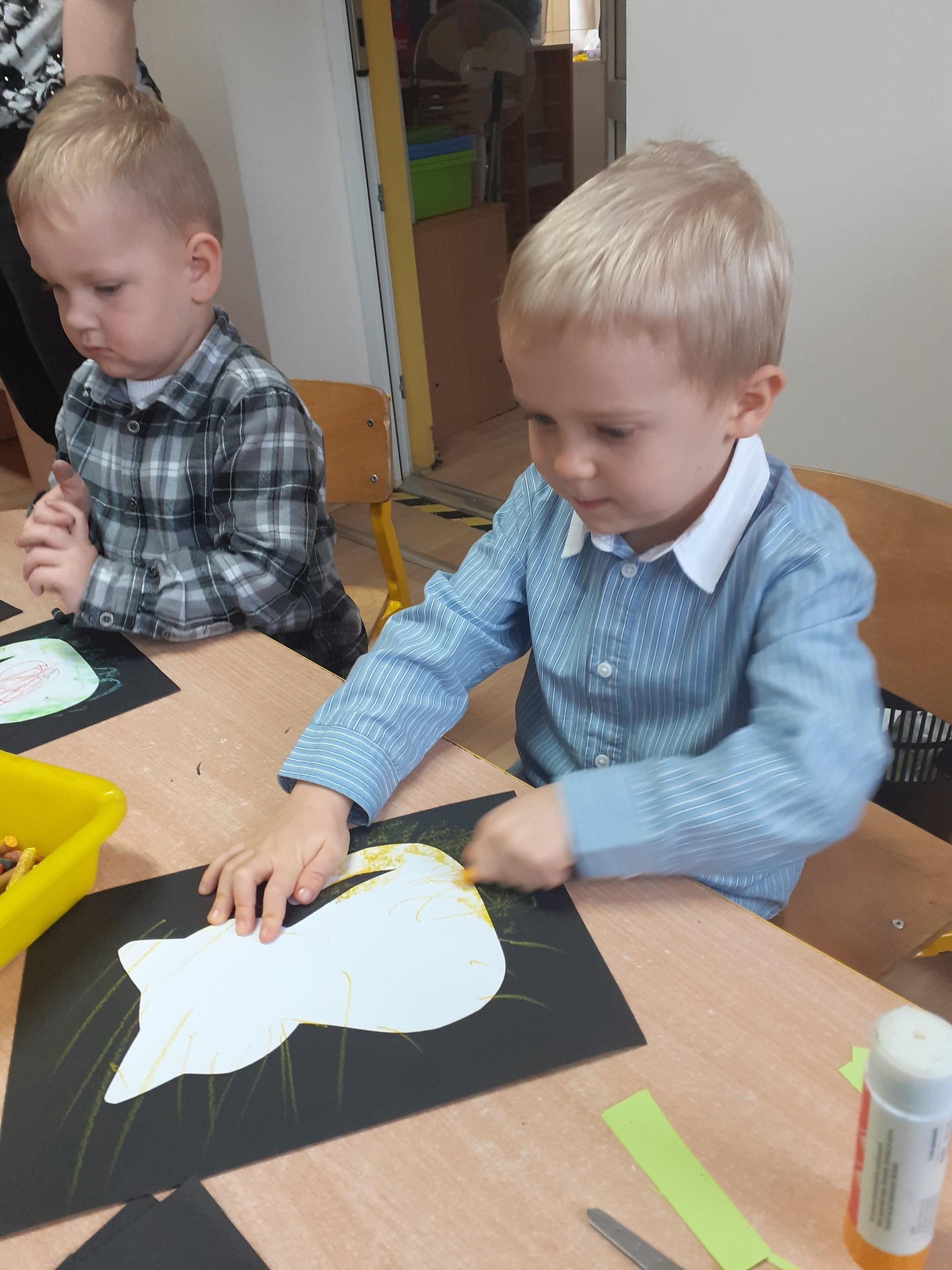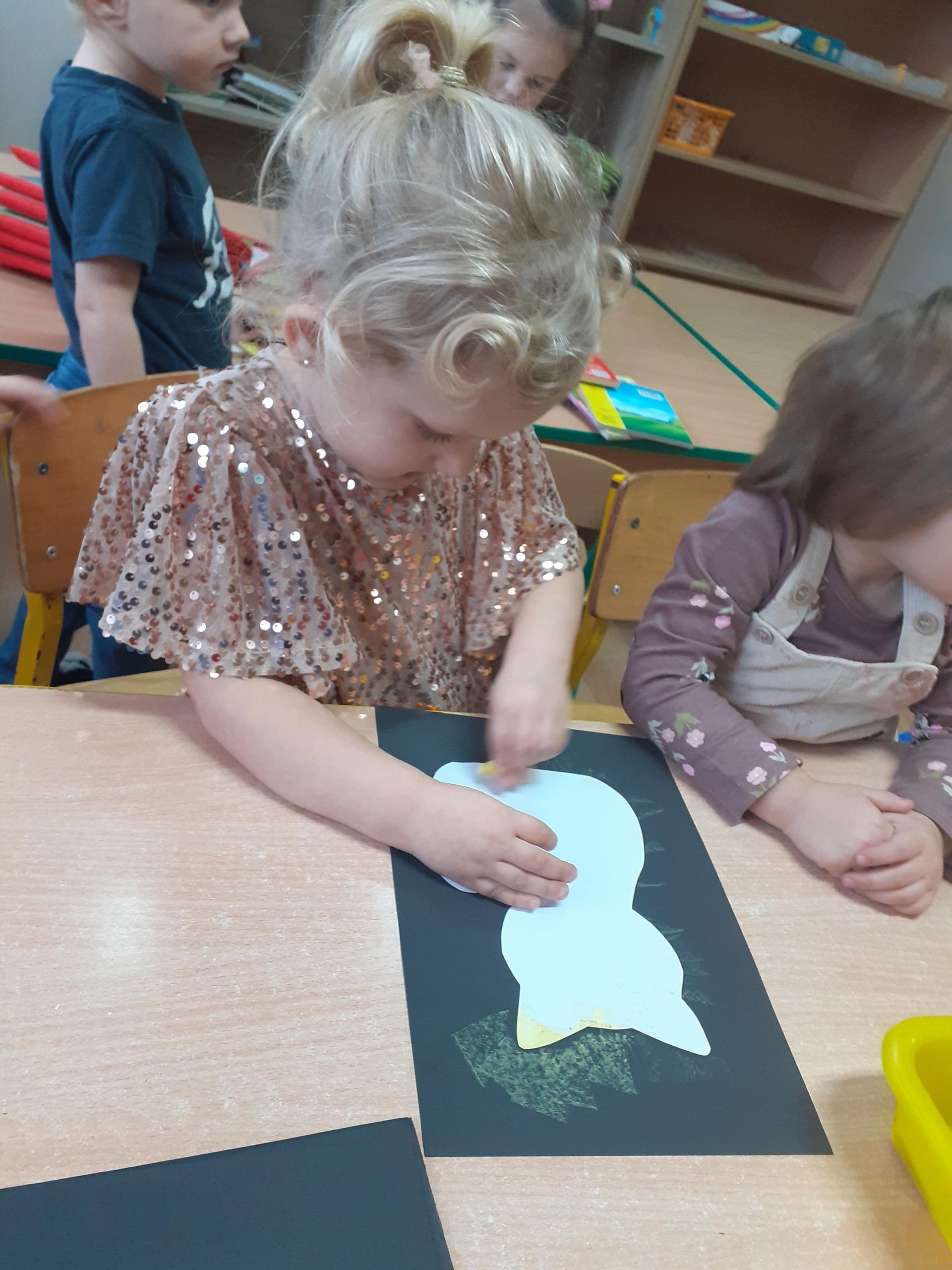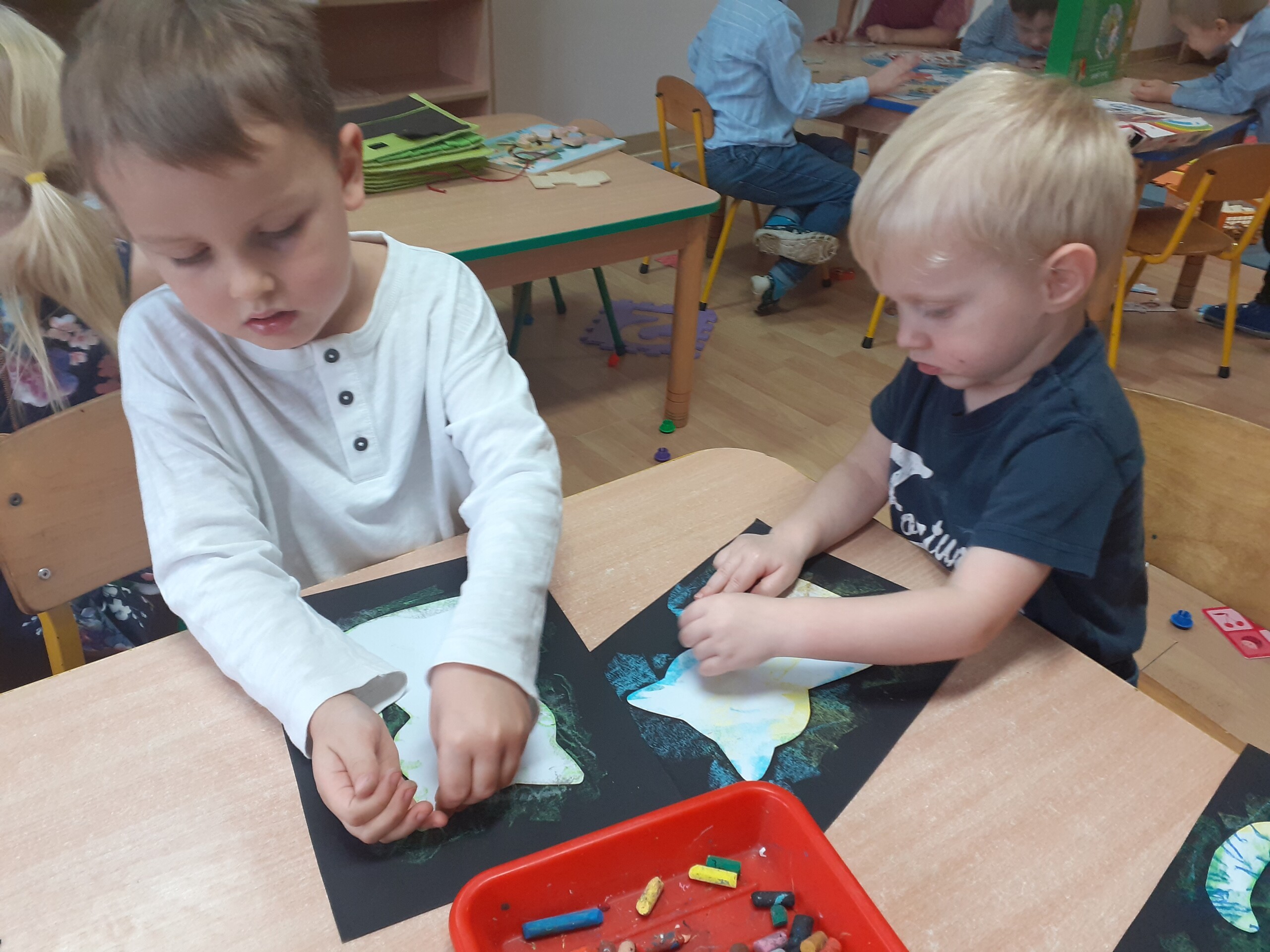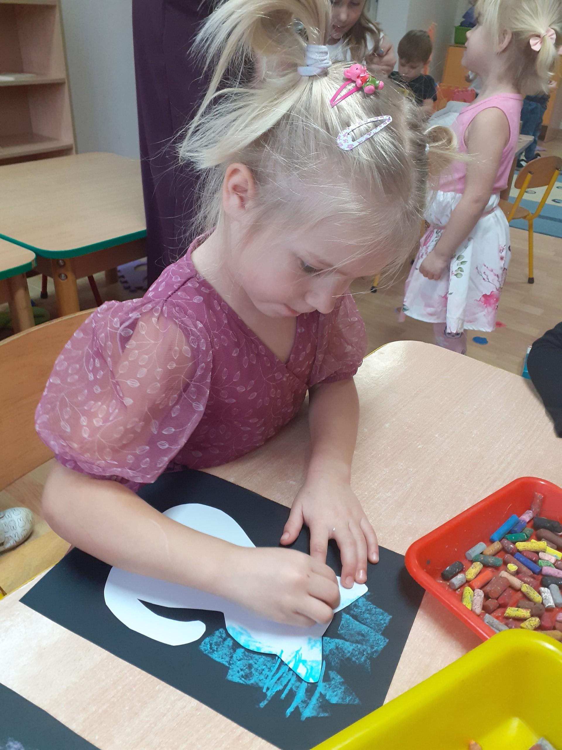 Praca plastyczna wykonana przy pomocy kredek pastelowych.