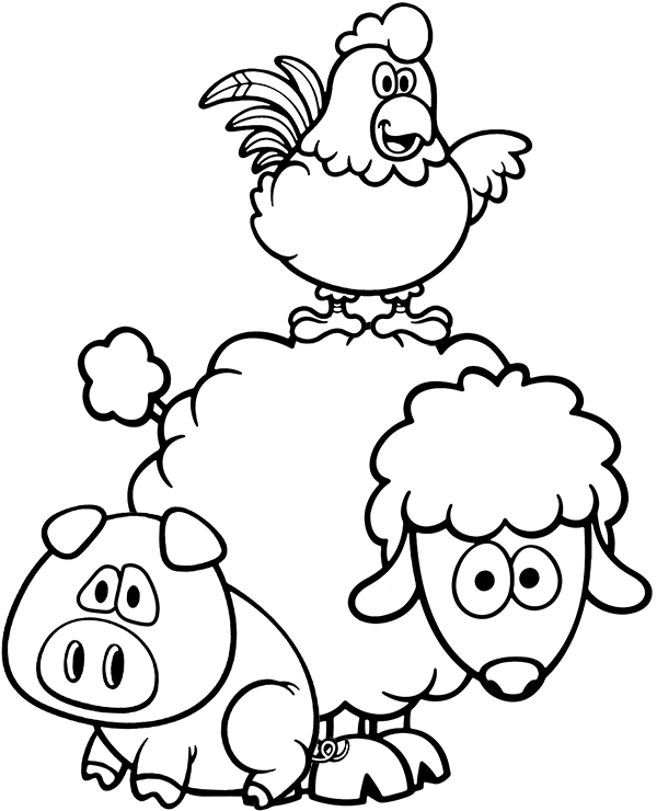 Kolorowanki przedstawiające: świnię, owcę, konia, kurę, kredki. Dziecko wybiera dowolną kolorowankę i starannie ją koloruje (kolorowanki do wydruku poniżej).