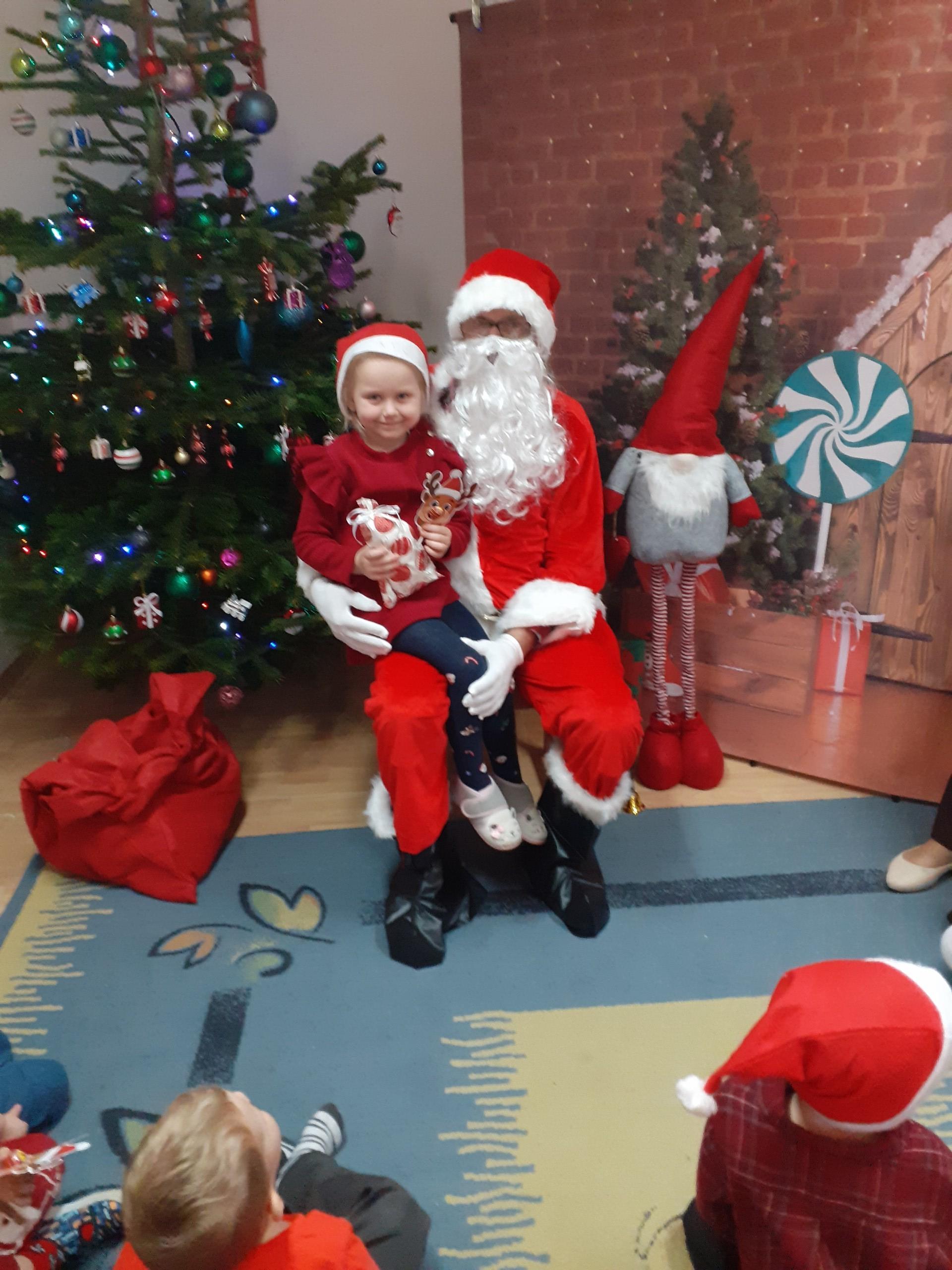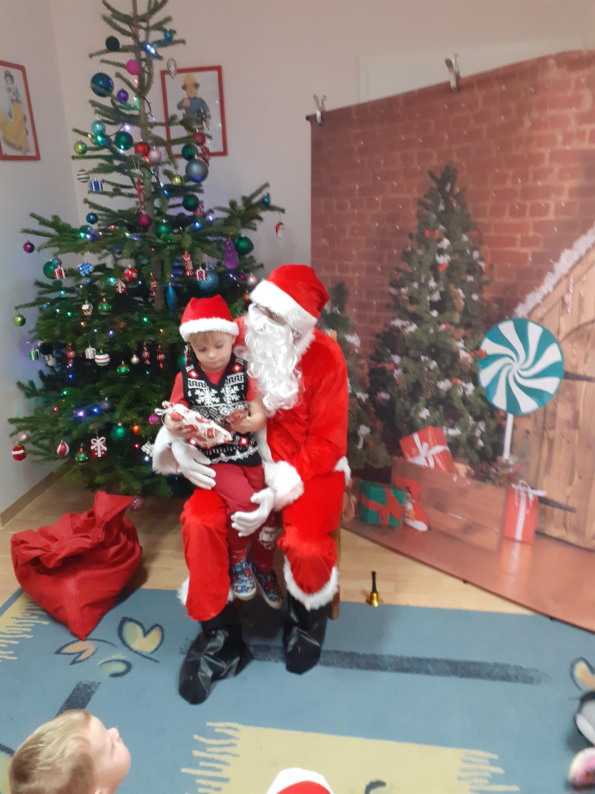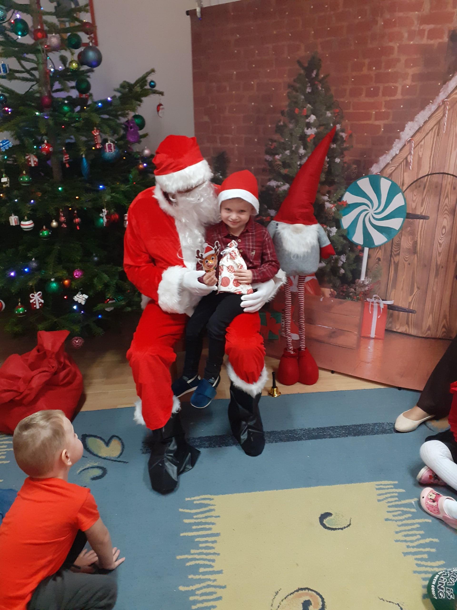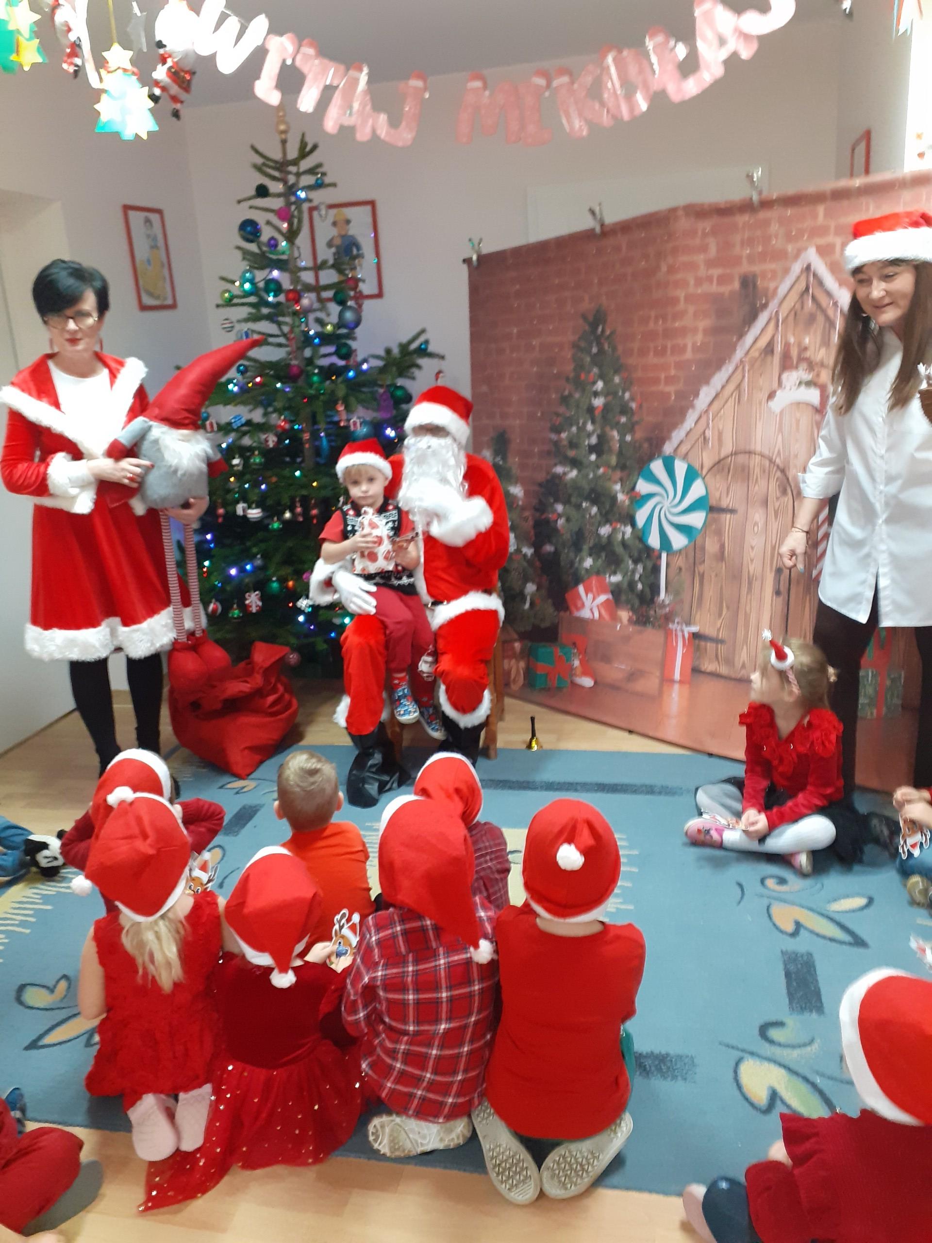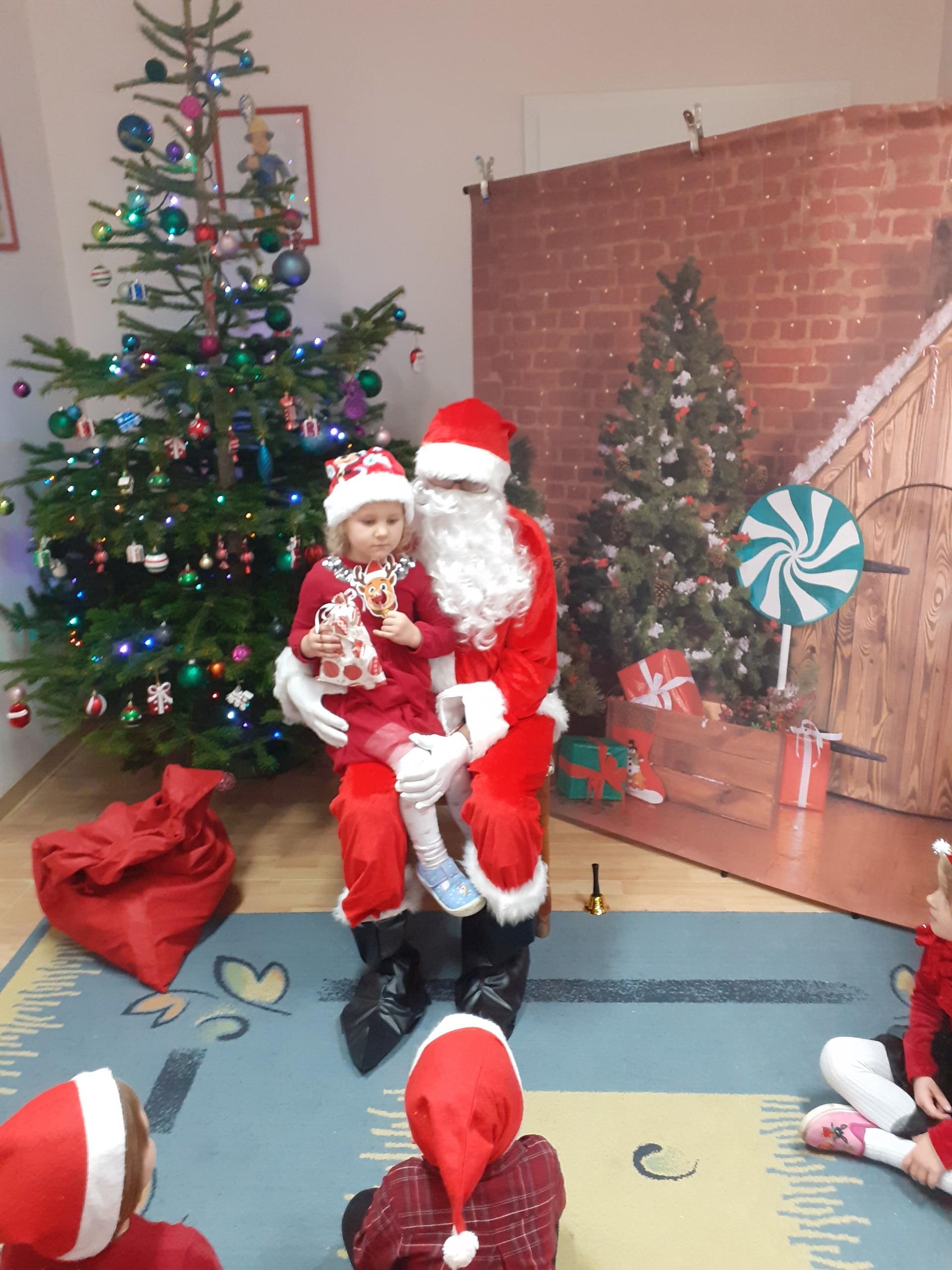 Dzisiaj do naszego przedszkola przybył Mikołaj z workiem prezentów. Po powitaniu gościa dzieci zatańczyły z Mikołajem i zaśpiewały gościowi piosenkę. Po części artystycznej Mikołaj wręczył dzieciom upominki a przy okazji sfotografował się z każdym przedszkolakiem. Do przedszkola zawitała także nasza Pani dyrektor Alicja Guźniczak, która złożyła wszystim mikołajkowe życzenia oraz w prezencie podarowała skrzata, któremu dzieci mają nadać imię. Na pożegnanie dzieci wręczyły Mikołajowi książeczkę zrobioną z własnoręcznie przygotowanych przez pociechy rysunków oraz pierniczki - bo Mikołaj uwielbia ciasteczka.