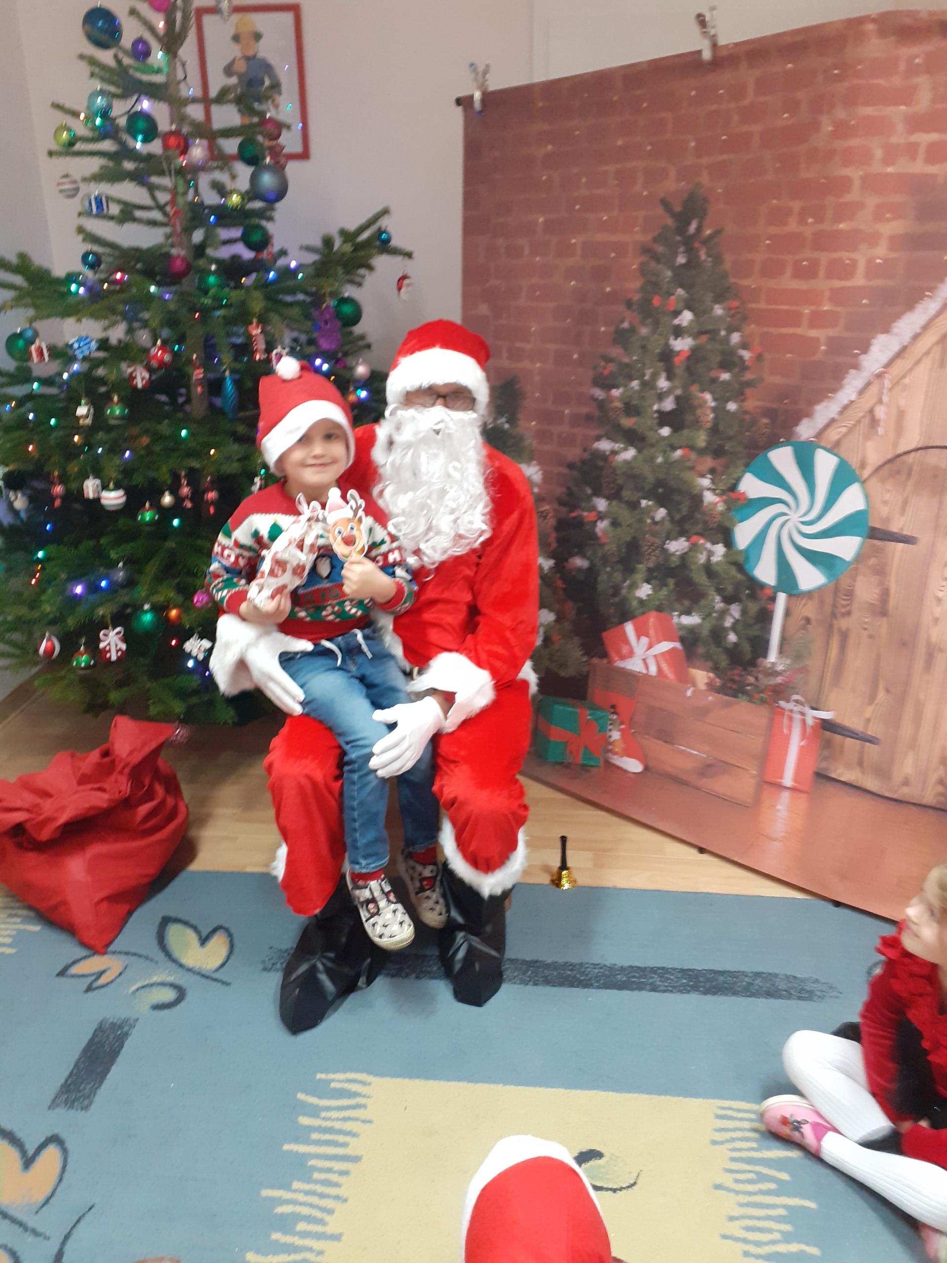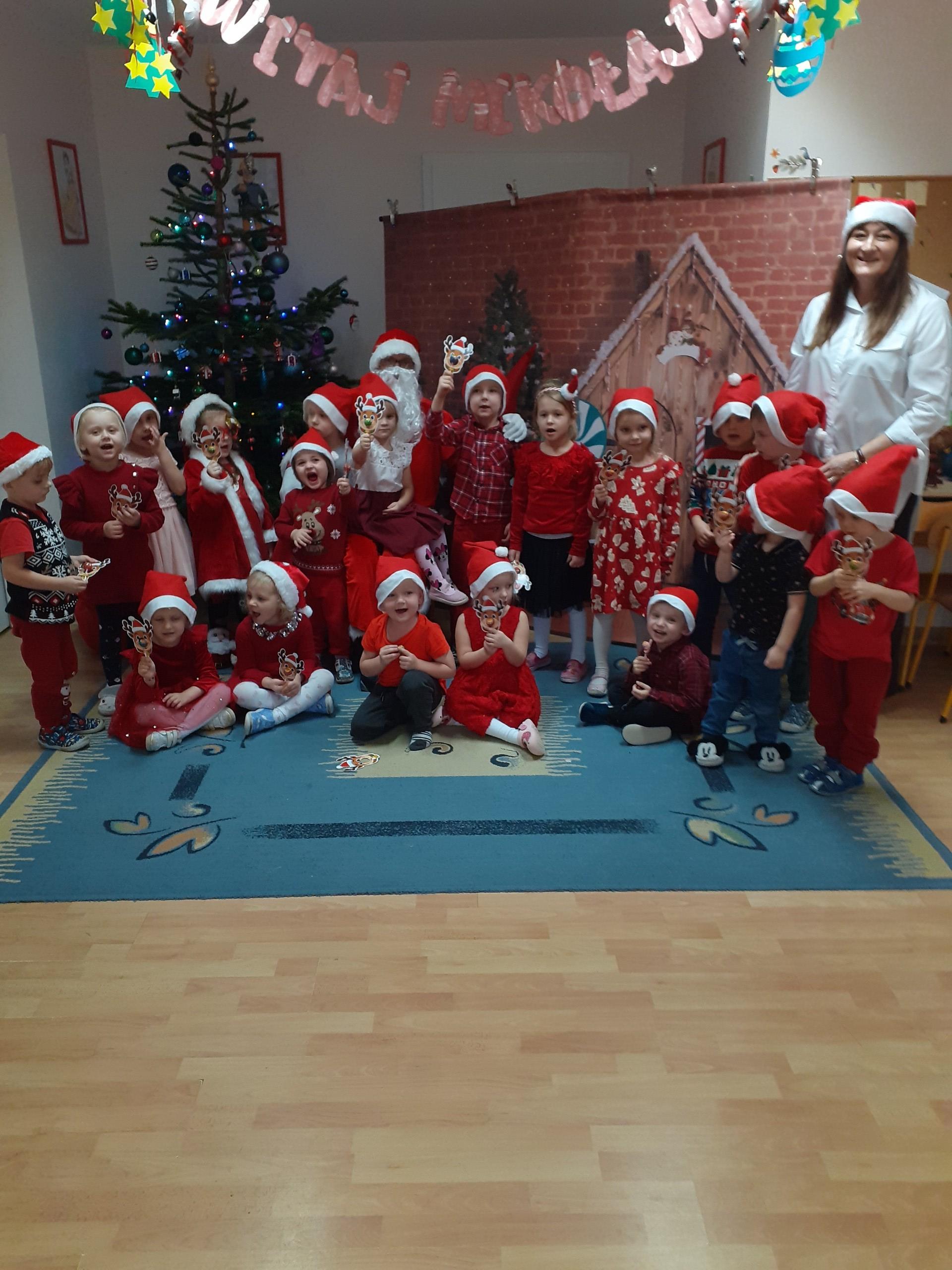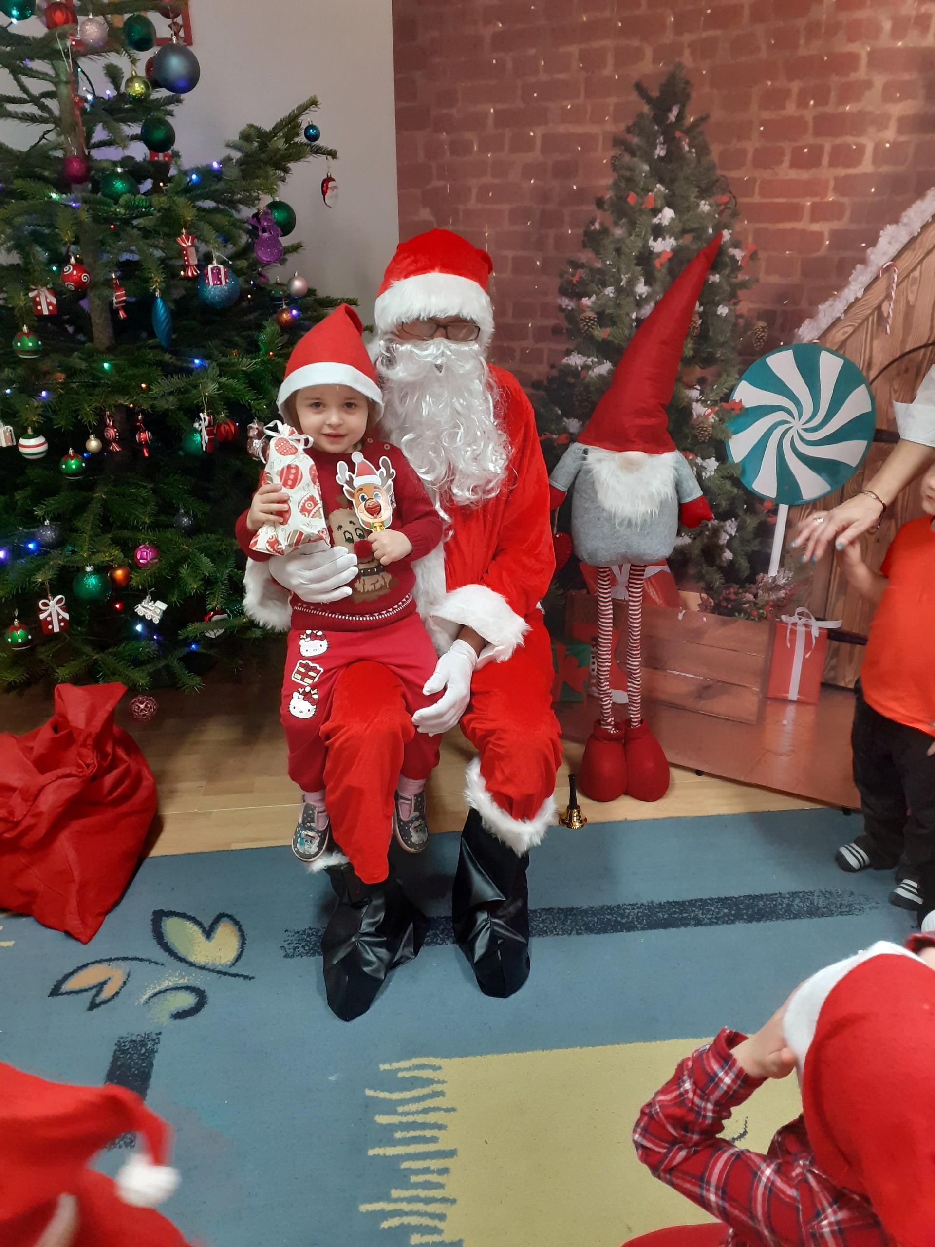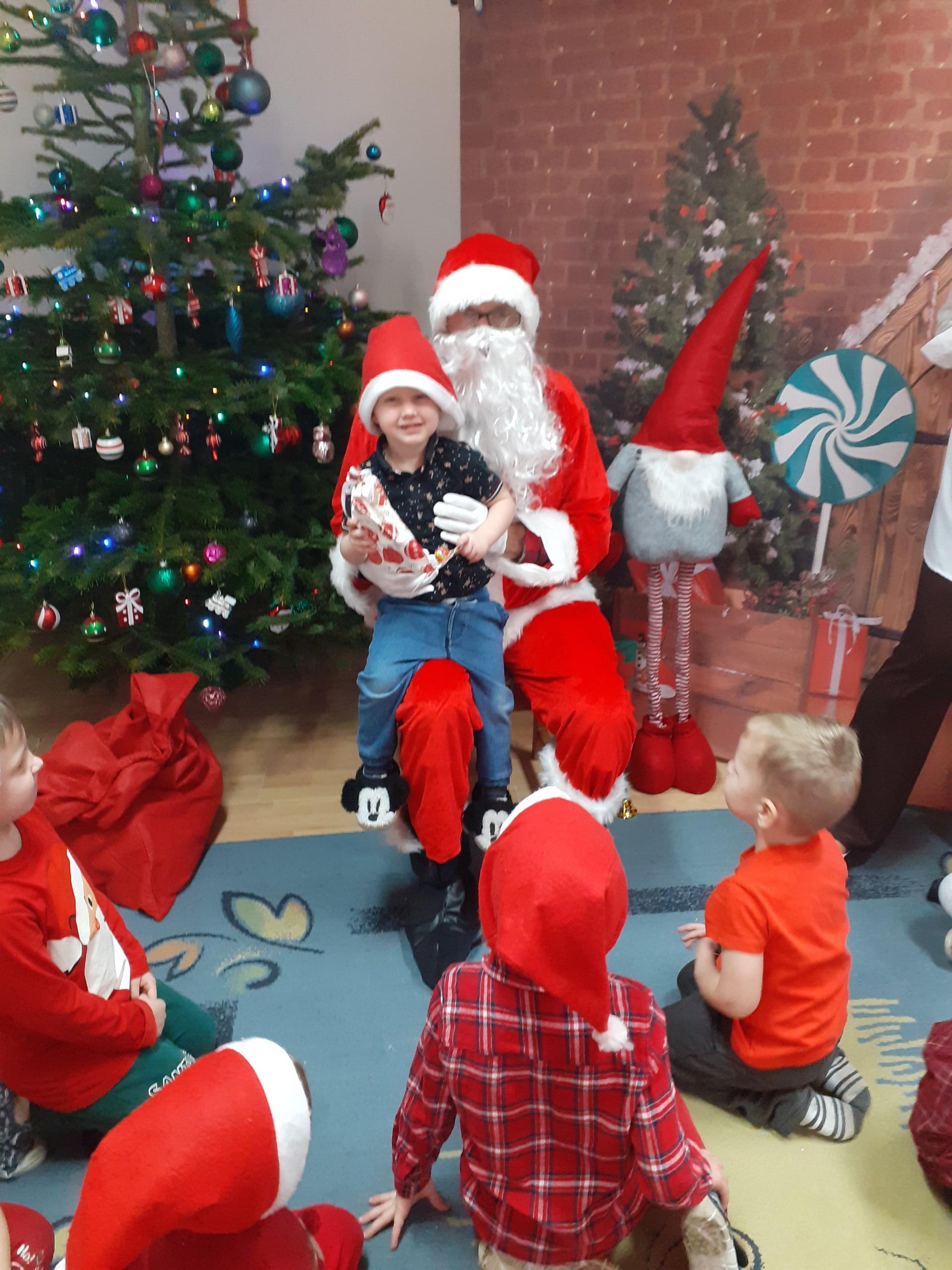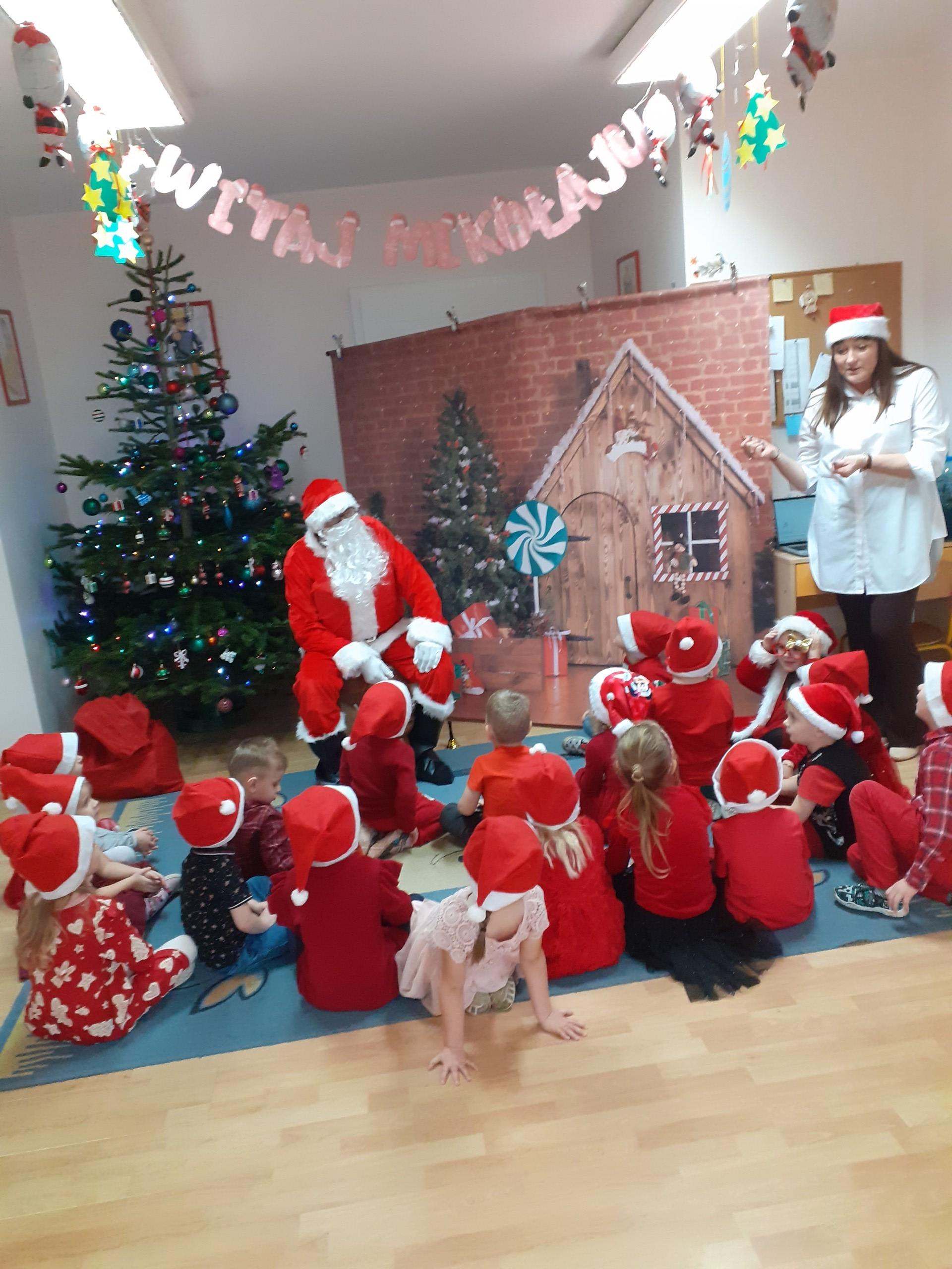 Dzisiaj do naszego przedszkola przybył Mikołaj z workiem prezentów. Po powitaniu gościa dzieci zatańczyły z Mikołajem i zaśpiewały gościowi piosenkę. Po części artystycznej Mikołaj wręczył dzieciom upominki a przy okazji sfotografował się z każdym przedszkolakiem. Do przedszkola zawitała także nasza Pani dyrektor Alicja Guźniczak, która złożyła wszystim mikołajkowe życzenia oraz w prezencie podarowała skrzata, któremu dzieci mają nadać imię. Na pożegnanie dzieci wręczyły Mikołajowi książeczkę zrobioną z własnoręcznie przygotowanych przez pociechy rysunków oraz pierniczki - bo Mikołaj uwielbia ciasteczka.