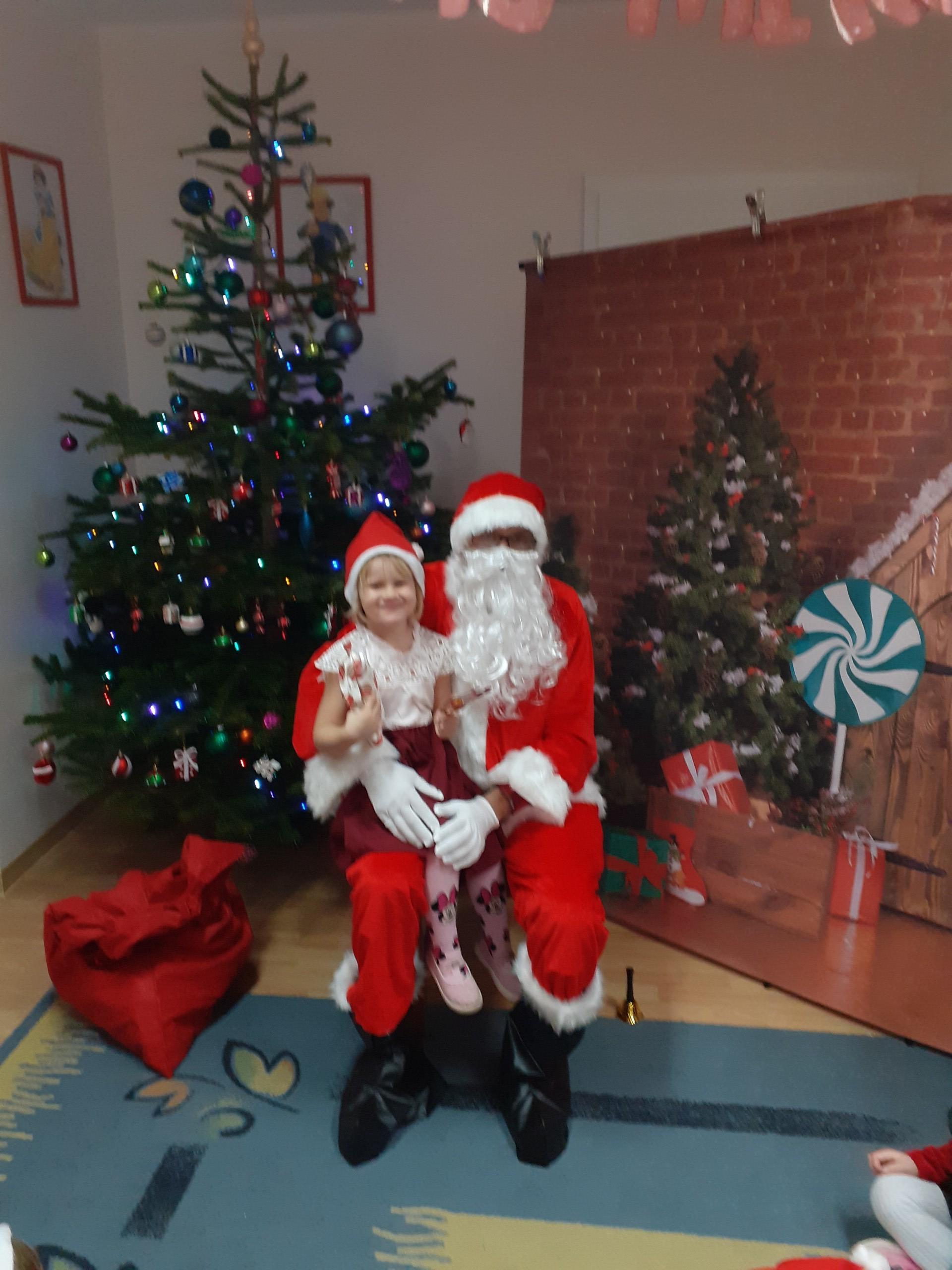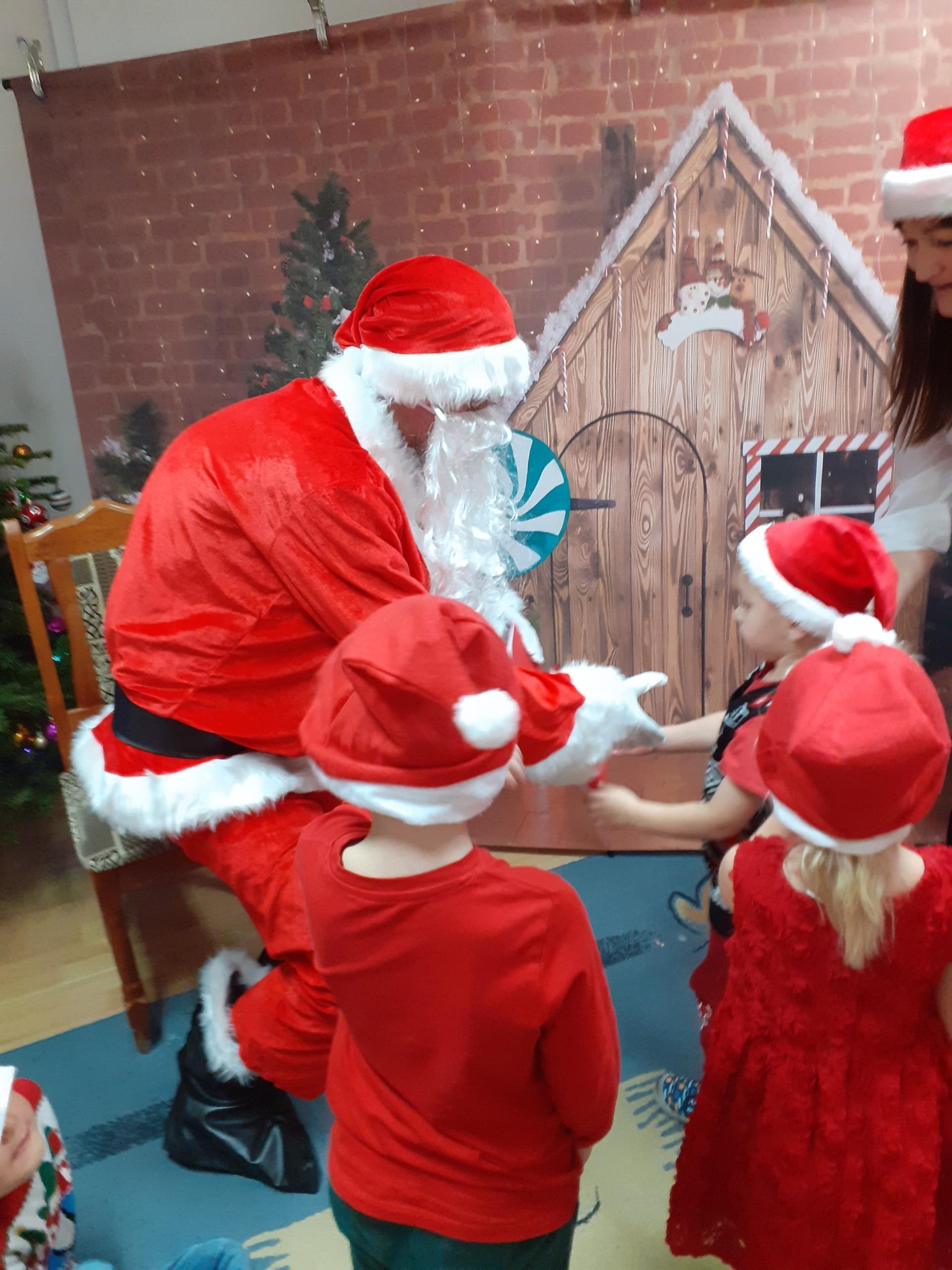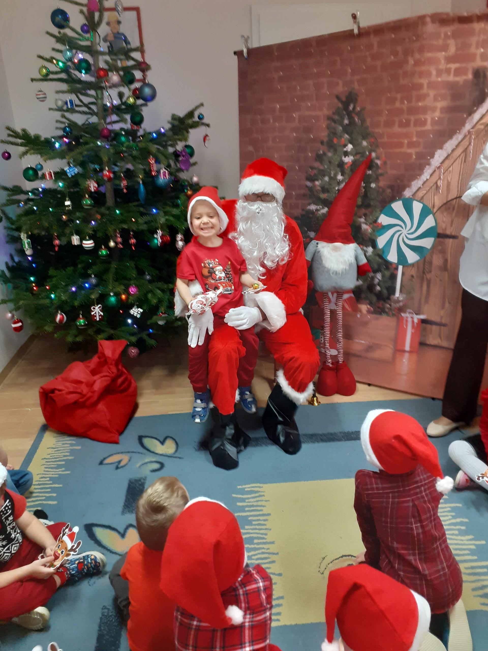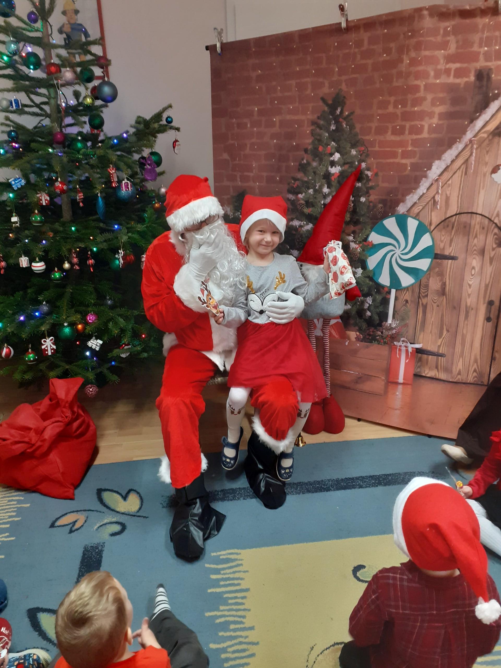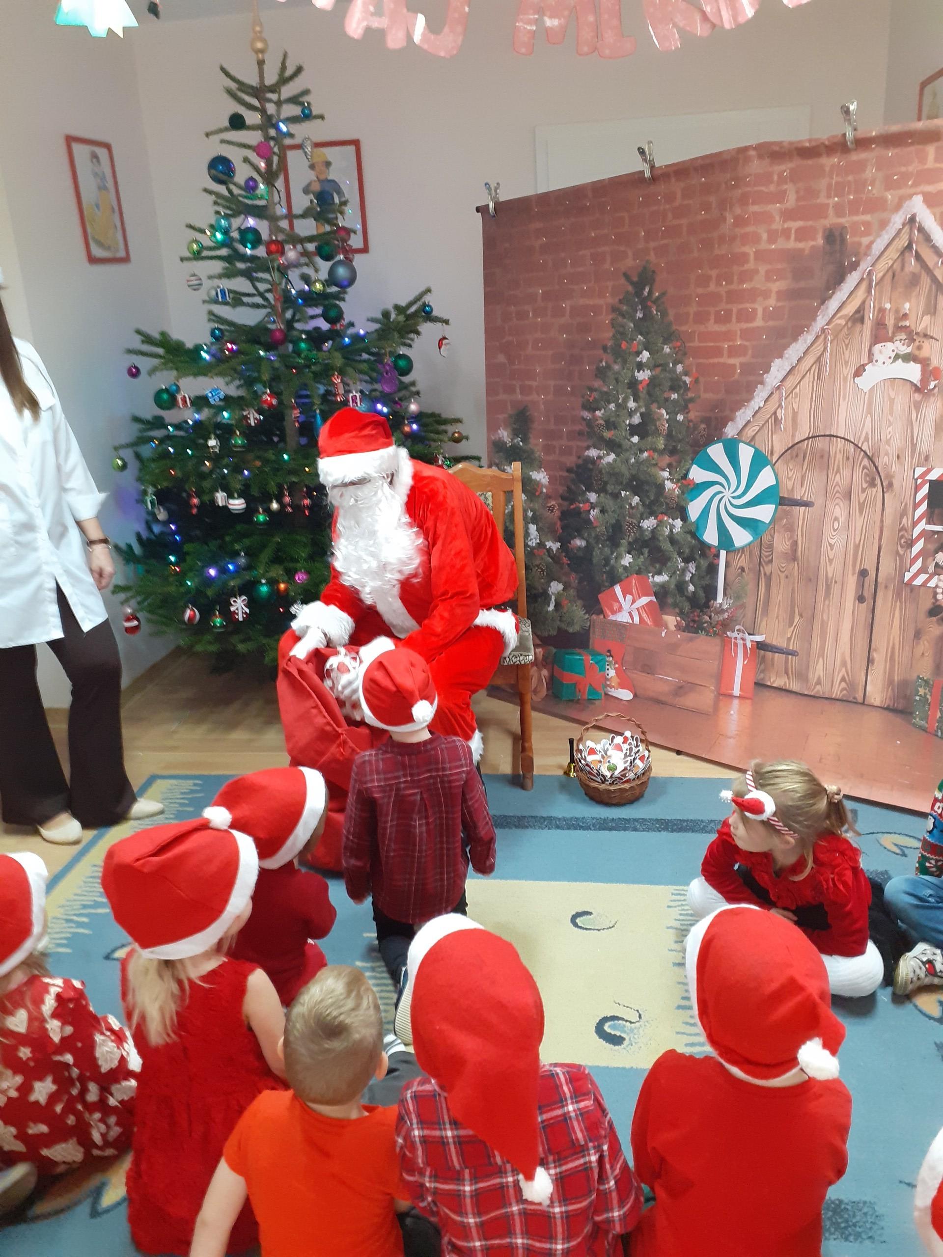 Dzisiaj do naszego przedszkola przybył Mikołaj z workiem prezentów. Po powitaniu gościa dzieci zatańczyły z Mikołajem i zaśpiewały gościowi piosenkę. Po części artystycznej Mikołaj wręczył dzieciom upominki a przy okazji sfotografował się z każdym przedszkolakiem. Do przedszkola zawitała także nasza Pani dyrektor Alicja Guźniczak, która złożyła wszystim mikołajkowe życzenia oraz w prezencie podarowała skrzata, któremu dzieci mają nadać imię. Na pożegnanie dzieci wręczyły Mikołajowi książeczkę zrobioną z własnoręcznie przygotowanych przez pociechy rysunków oraz pierniczki - bo Mikołaj uwielbia ciasteczka.