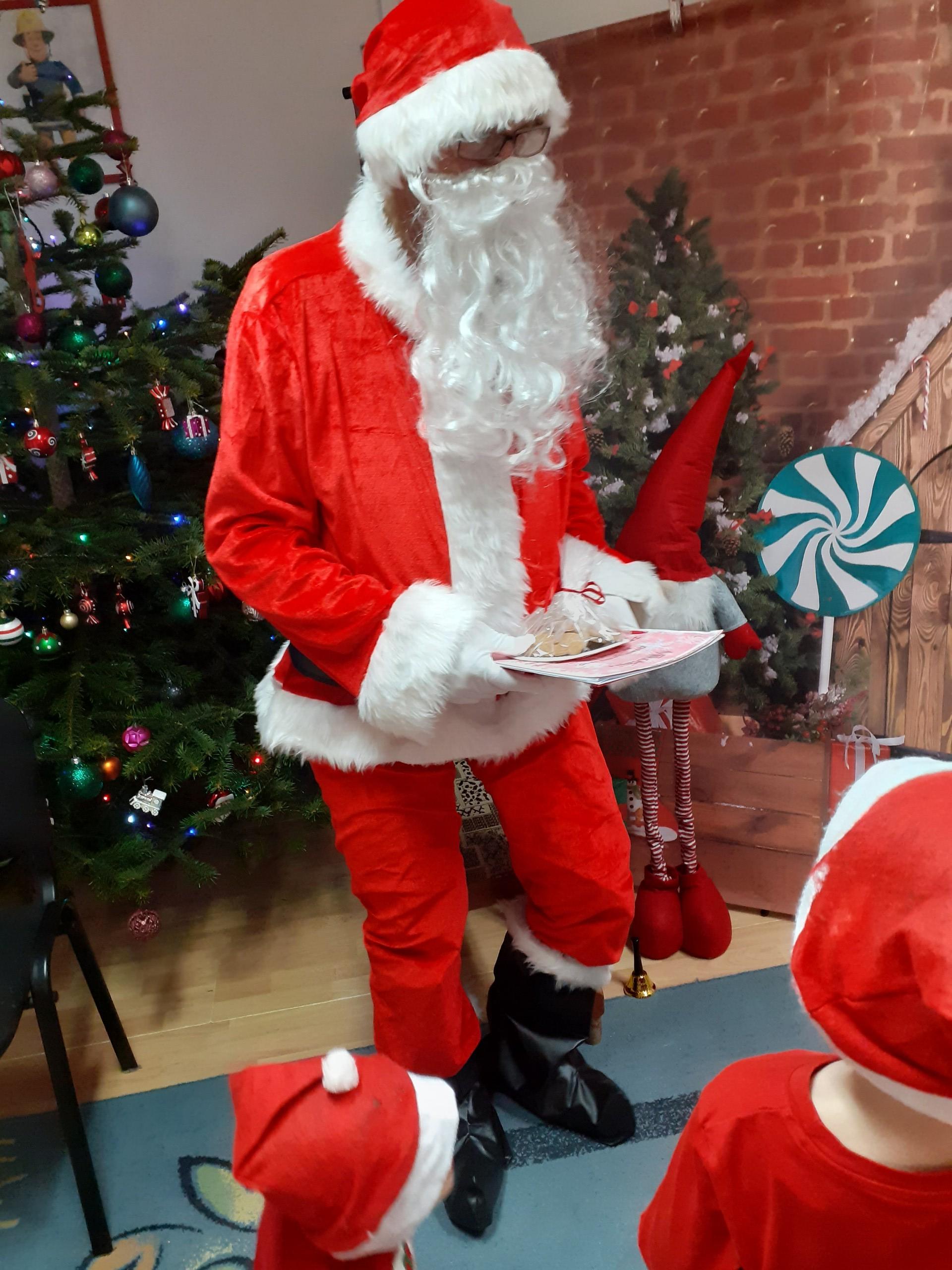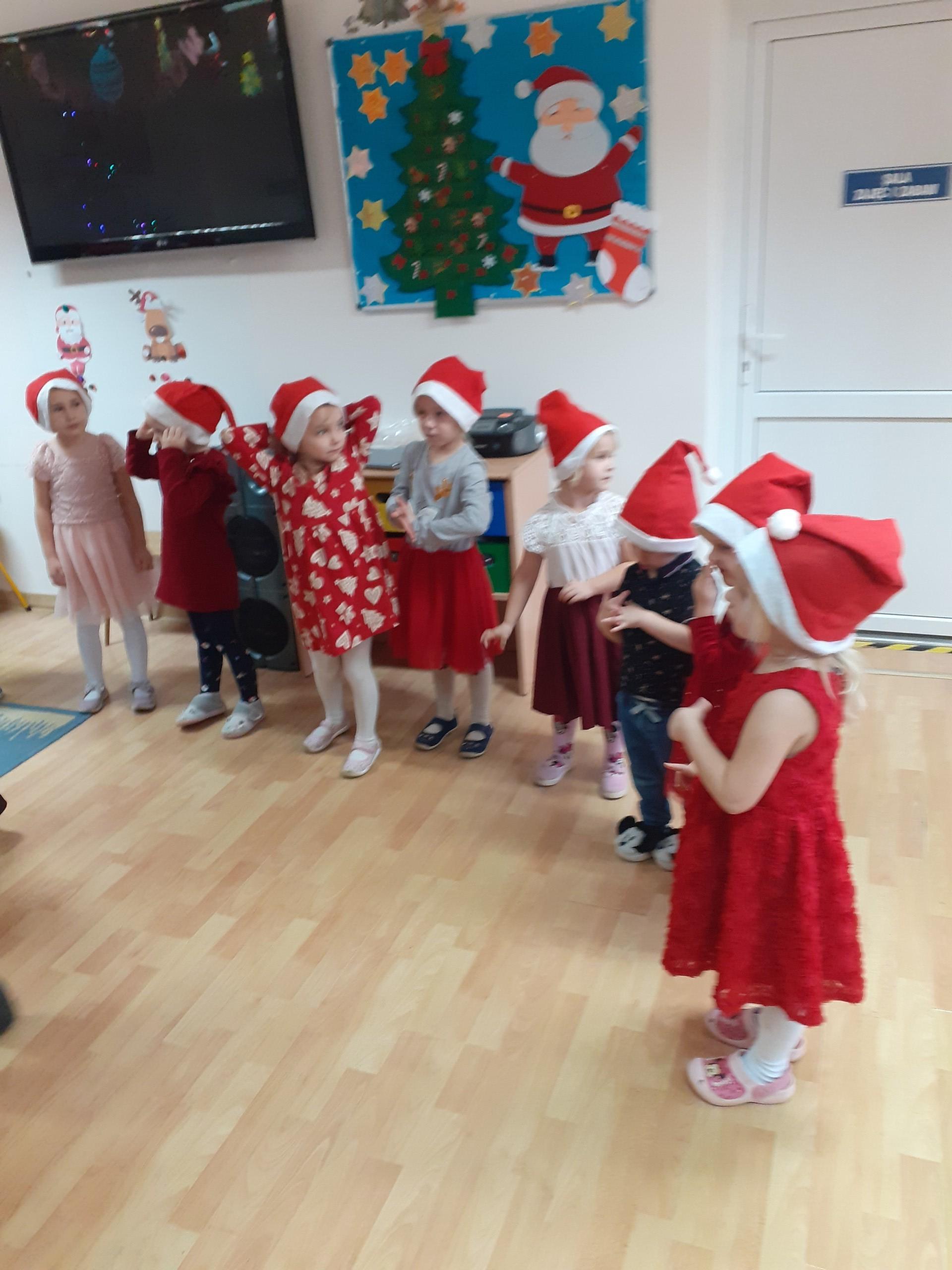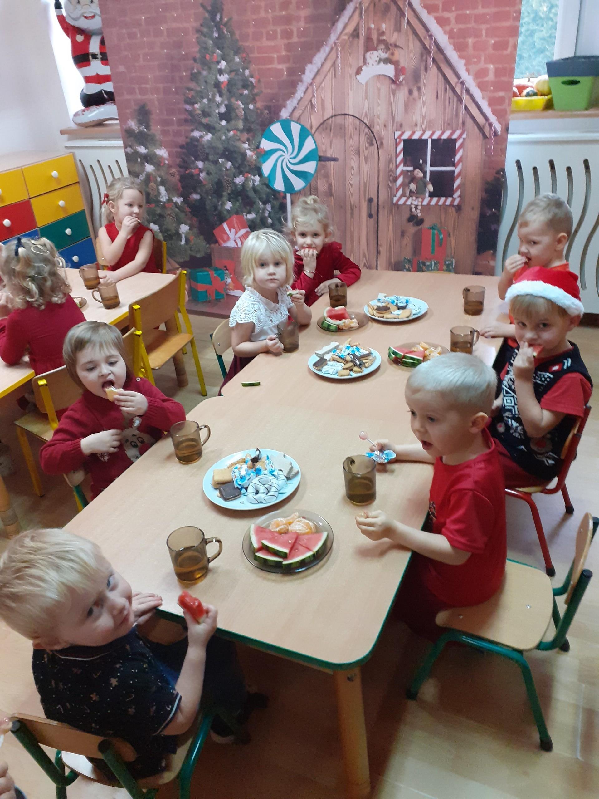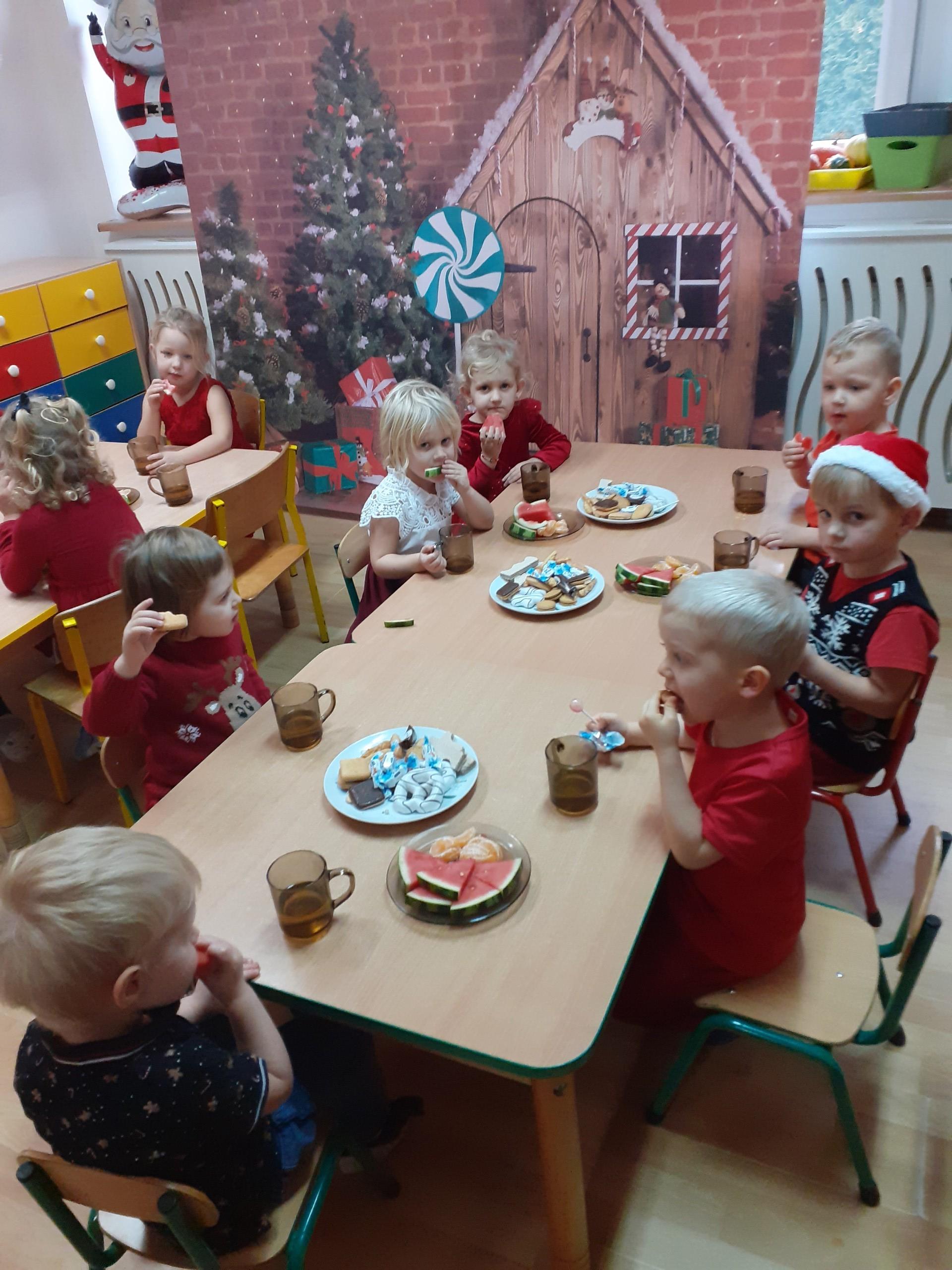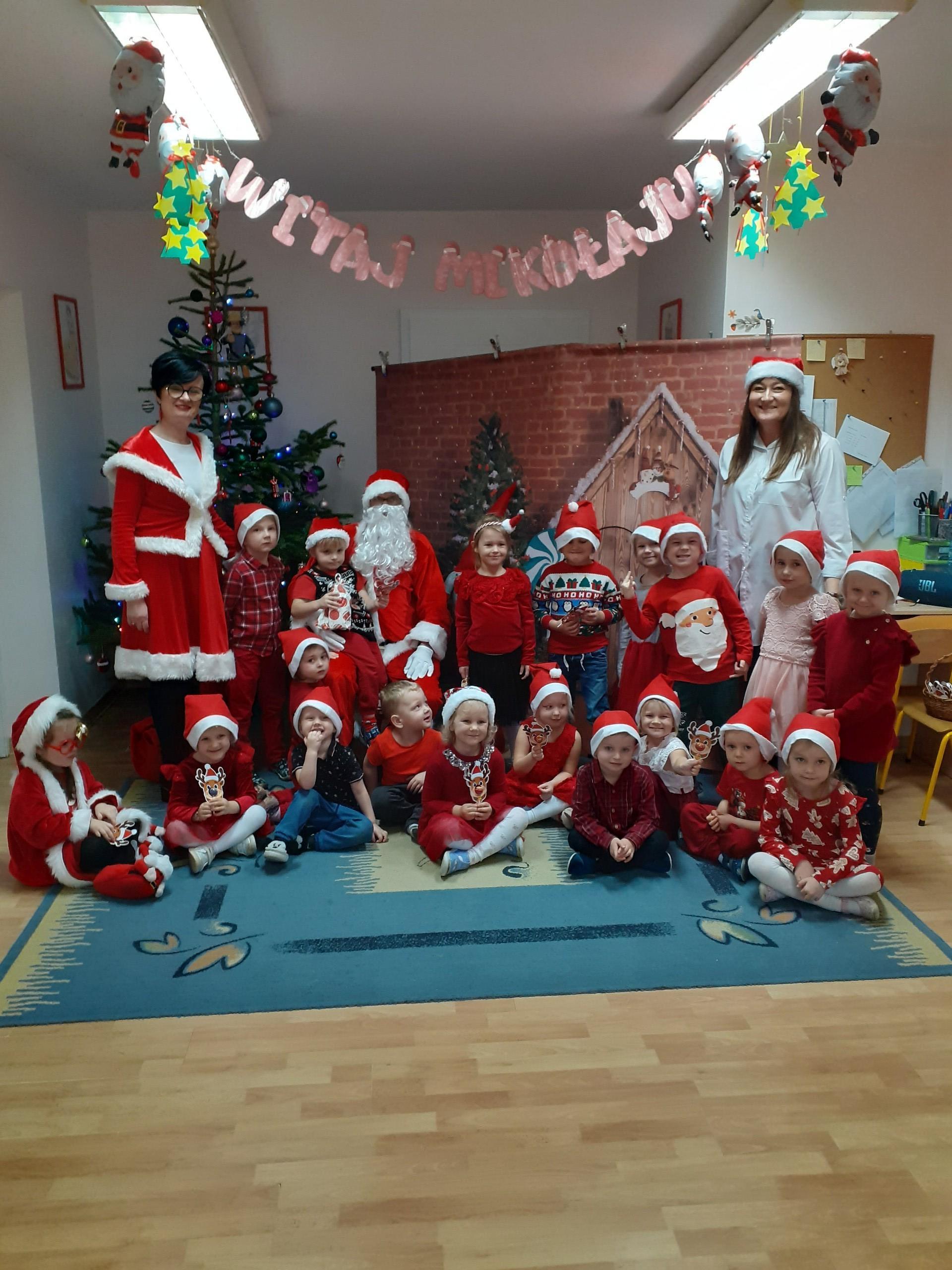 Dzisiaj do naszego przedszkola przybył Mikołaj z workiem prezentów. Po powitaniu gościa dzieci zatańczyły z Mikołajem i zaśpiewały gościowi piosenkę. Po części artystycznej Mikołaj wręczył dzieciom upominki a przy okazji sfotografował się z każdym przedszkolakiem. Do przedszkola zawitała także nasza Pani dyrektor Alicja Guźniczak, która złożyła wszystim mikołajkowe życzenia oraz w prezencie podarowała skrzata, któremu dzieci mają nadać imię. Na pożegnanie dzieci wręczyły Mikołajowi książeczkę zrobioną z własnoręcznie przygotowanych przez pociechy rysunków oraz pierniczki - bo Mikołaj uwielbia ciasteczka.