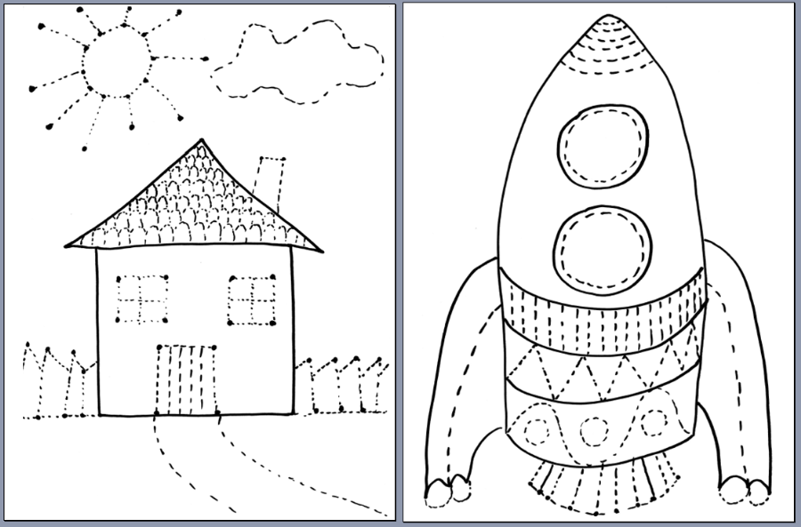 Domek i rakieta do wydruku poniżej. Rysuj po linii i pokoloruj.