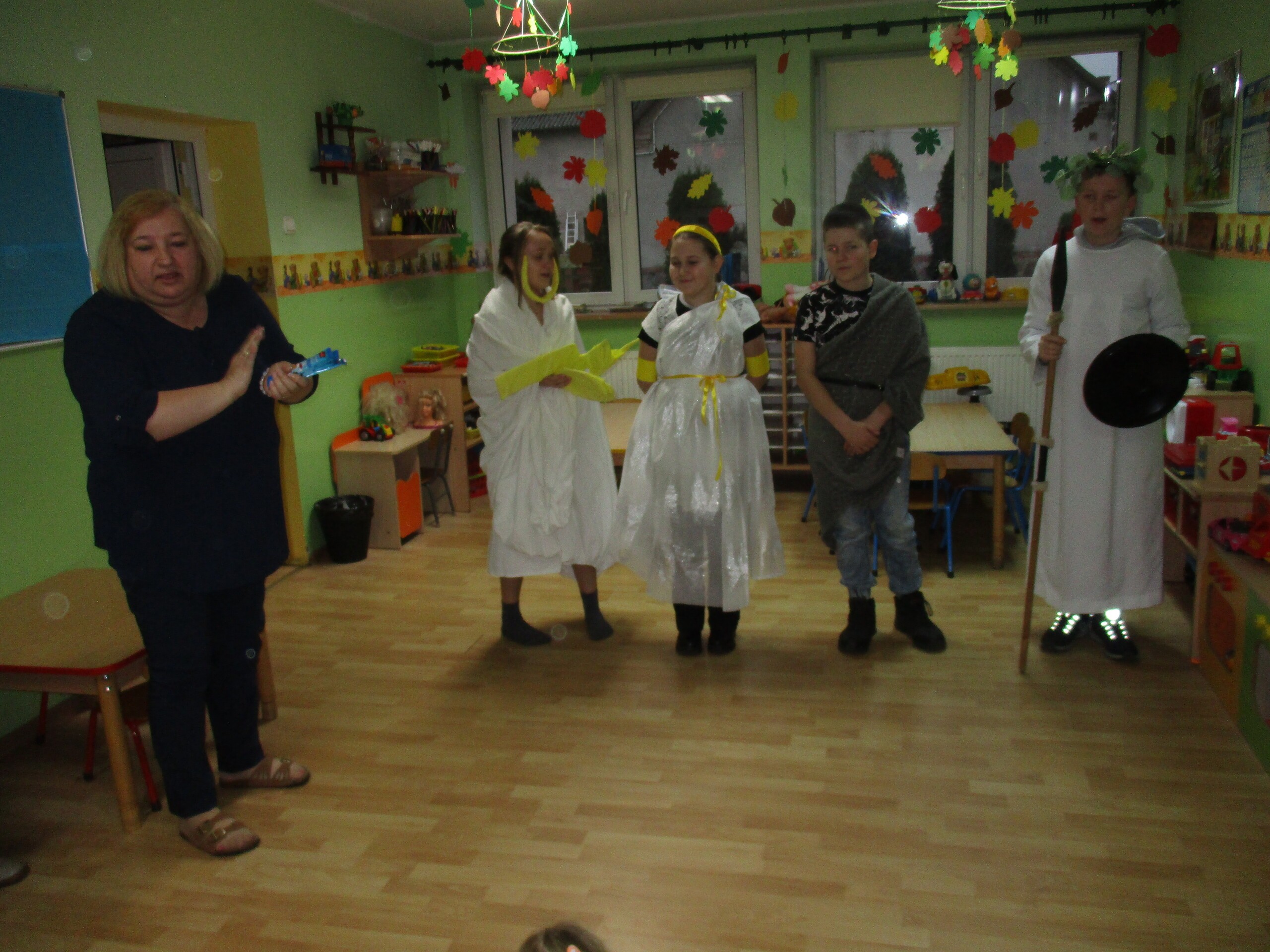 Dzisiaj odwiedzili nas uczniowie 5 klasy Zespołu Szkół w Garczegorzu. Uczniowie pod kierunkiem Pani Ireny Bednarczyk przygotowali dla naszych dzieci prezentację wybranych mitycznych Bogów. Przedszkolaki z wieką uwagą przysłuchiwali się prezentacjom. Dzieci ze szkoły były doskonale przygotowani do pełnienia przypisanych przez nauczyciela ról. Bardzo dziękujemy gościom za odwiedziny. To było dla przedszkolaków udane i pouczające doświadczenie.