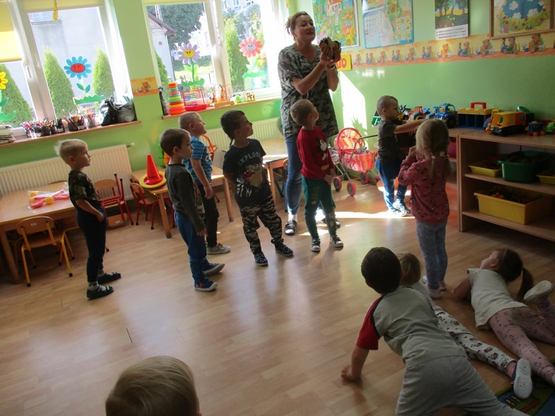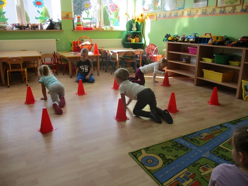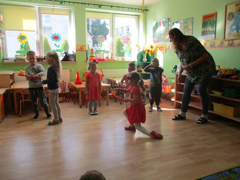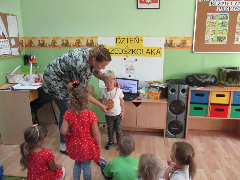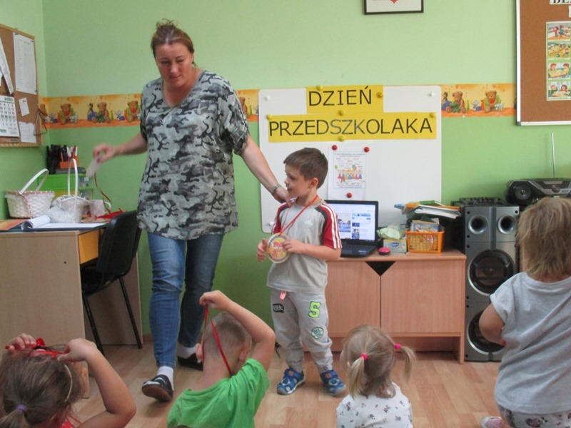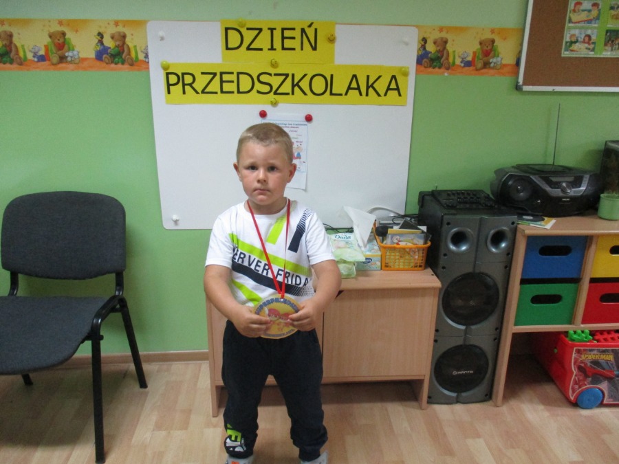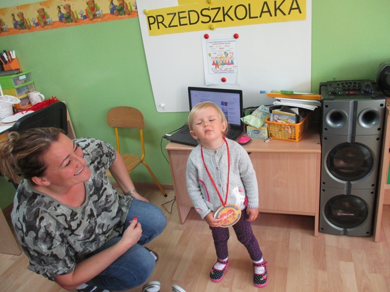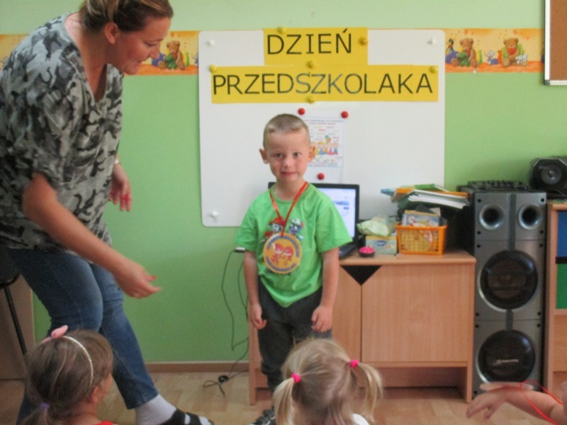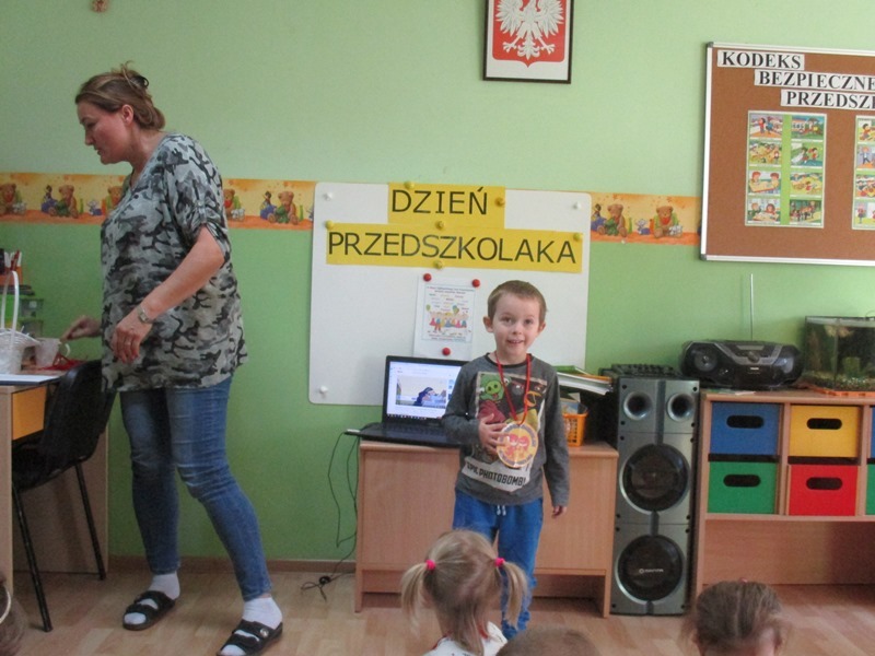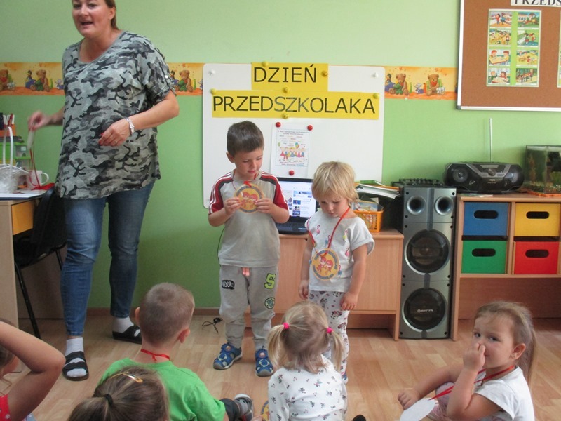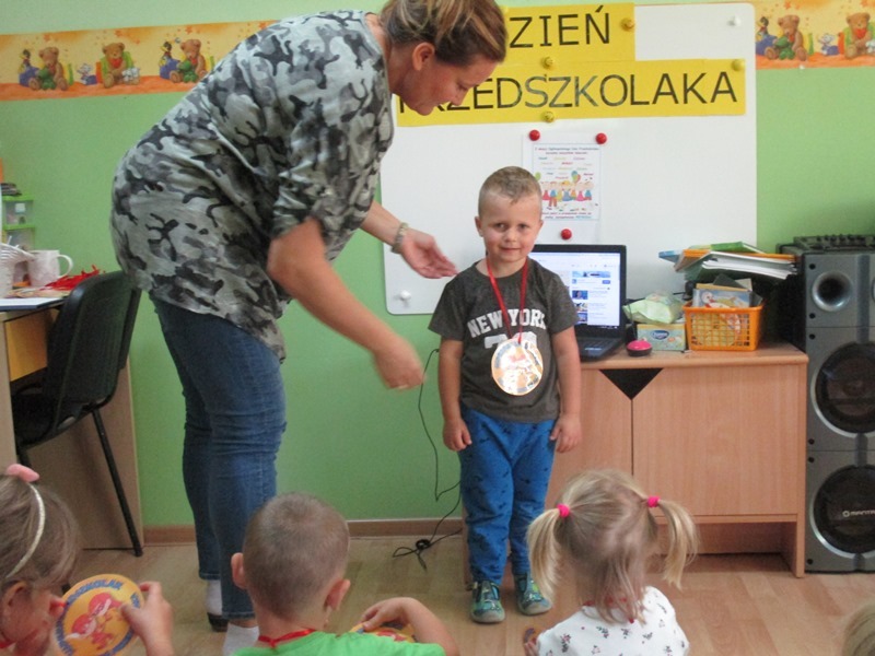 Tego dnia, dzieci zostały zaproszone do wspólnej zabawy i udziału w konkursach. Przedszkolaki rzucały kółkami do celu, chodziły na czworaka pomiędzy pachołkami, przenosiły piłeczki na specjalnych lizakach, zmagały się z oddzieleniem owoców od warzyw, bawiły się z wykorzystaniem śladów stóp. Radość, śmiech i głośny doping uczestników świadczyły o wspaniałej zabawie. Na koniec dzieci otrzymały wyjątkowy medal dla super przedszkolaka.