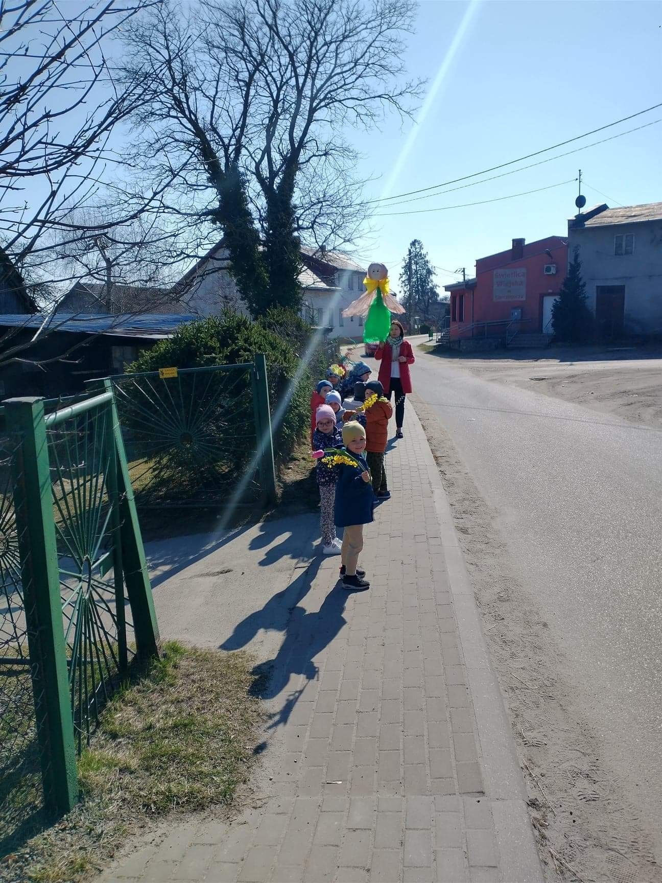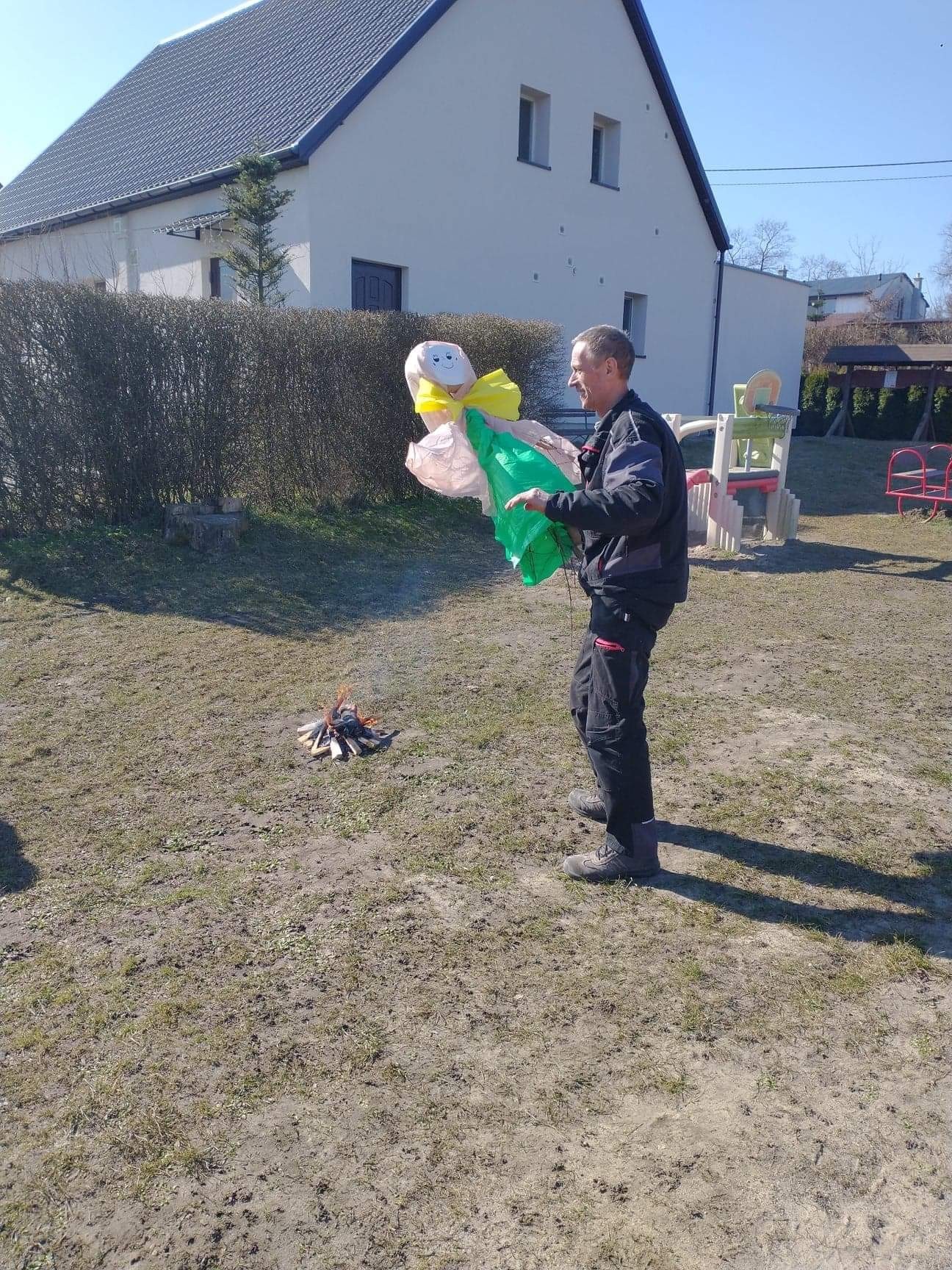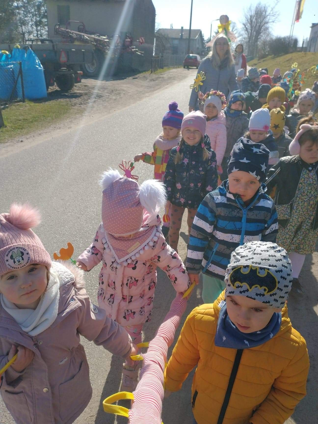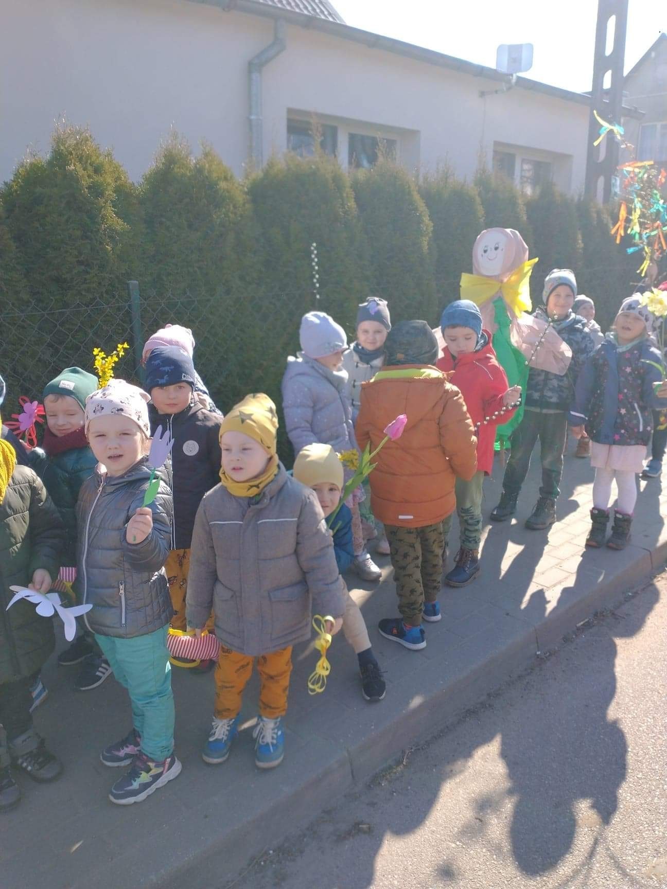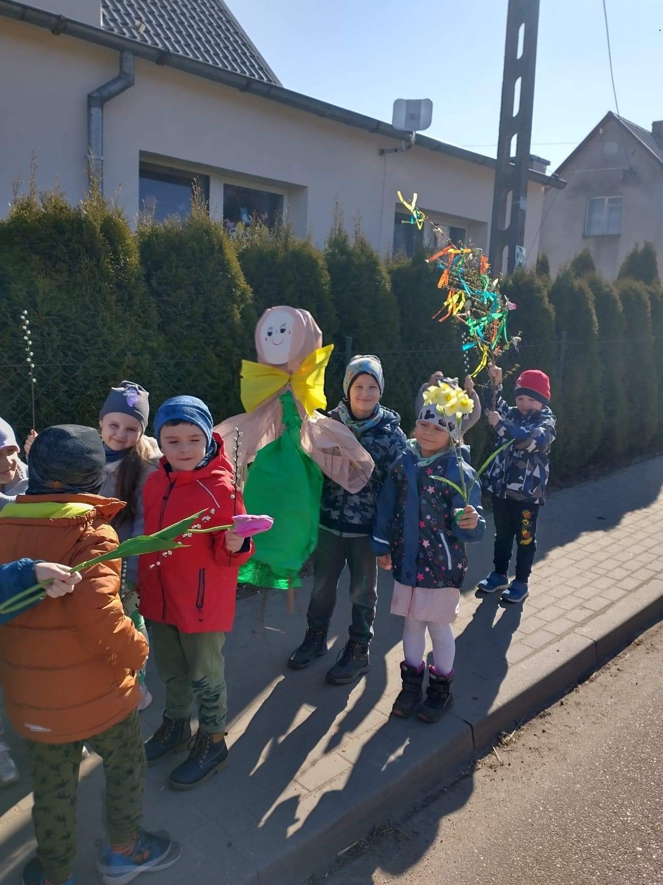 21 marca przedszkolaki świętowały Pierwszy Dzień Wiosny. Aby podkreślić charakter tego dnia, dzieci przyszły ubrane w kolorach wiosny. Na początek grupa młodsza przygotowała wiosenny plakat. Następnie wszystkie przedszkolaki z instrumentami muzycznymi, kwiatami przeszli ulicami wsi, na czele którego widniała Marzanna, symbol przemijającej zimy oraz gaik symbolizujący nadejście wiosny. Korowód zakończył swoją podróż w ogrodzie przedszkolnym, gdzie Marzanna została pożegnana według tradycji. W tak piękny i słoneczny dzień na naszym placu po długiej zimowej przerwie pojawiły się ogrodowe zabawki. To był wspaniały dzień i mamy nadzieję, że Wiosna zawita do nas na dobre.