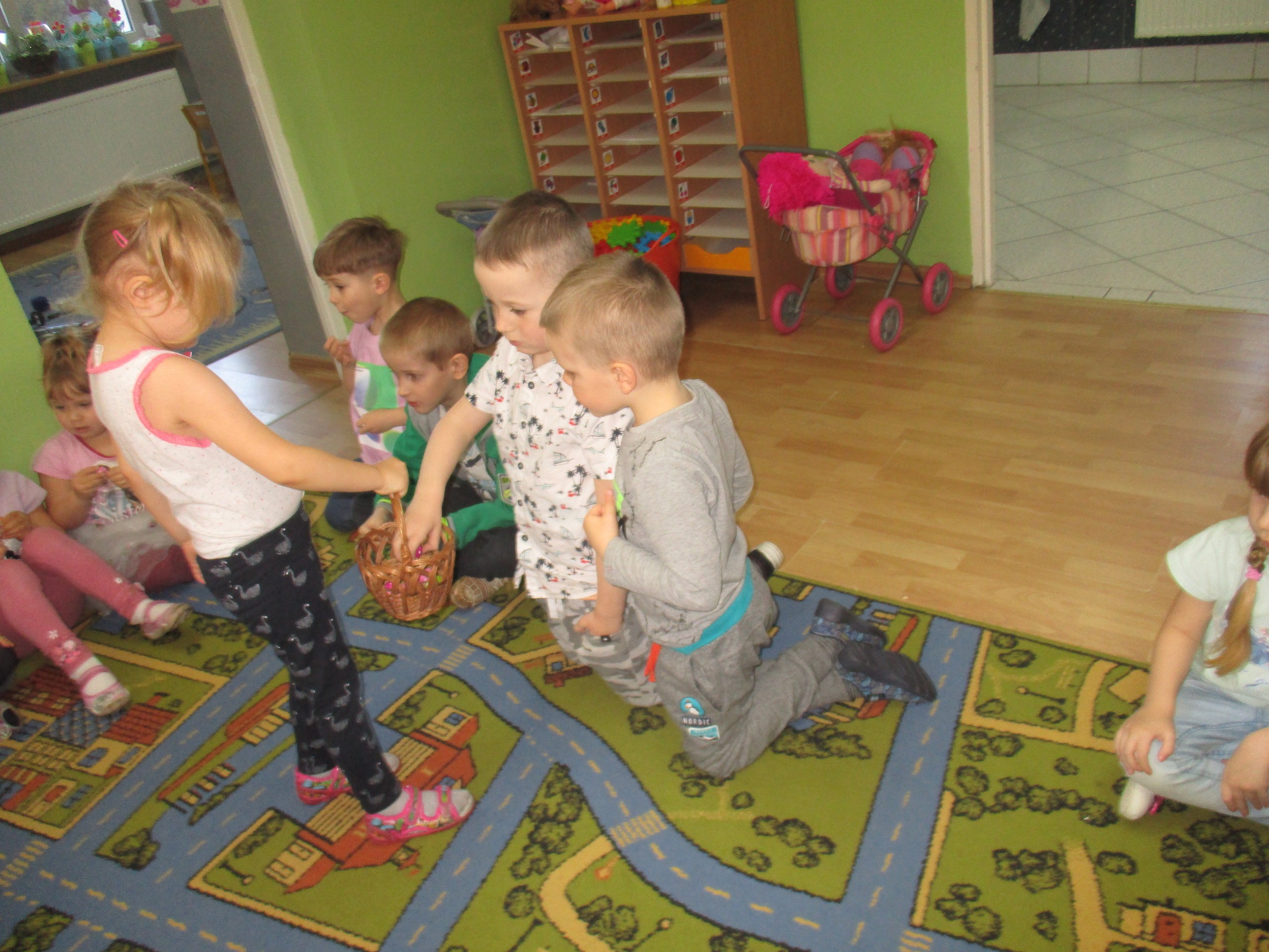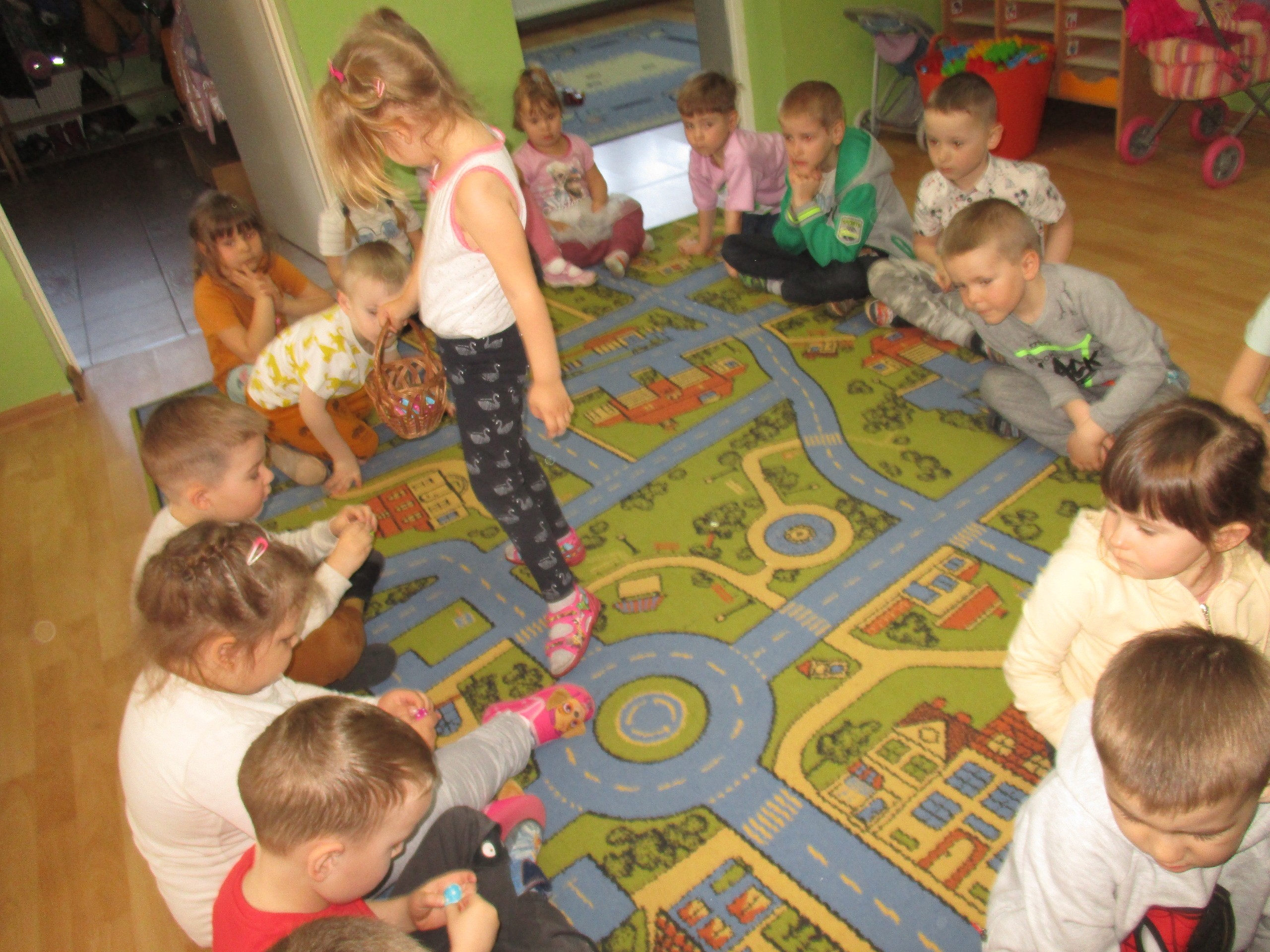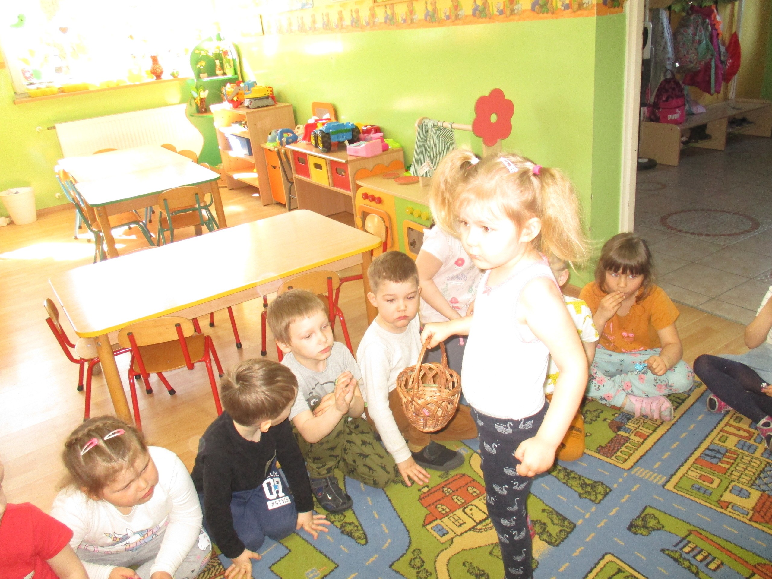 Maluchy zaprosiły do siebie Starszaki, aby wspólnie poszukać koszyka ze słodkimi jajkami. Marta pierwsza znalazła słodkości, którymi poczęstowała koleżanki i kolegów.