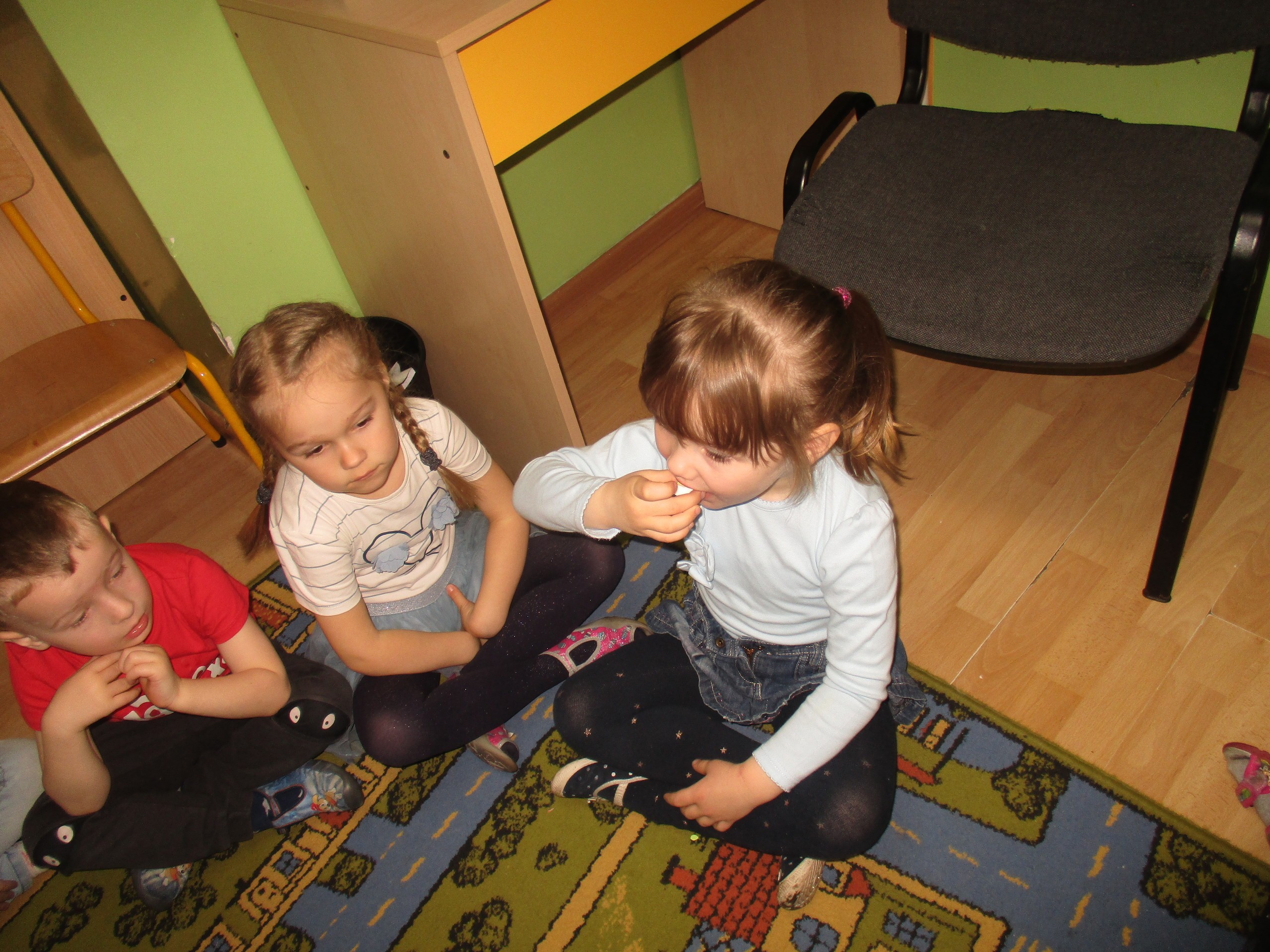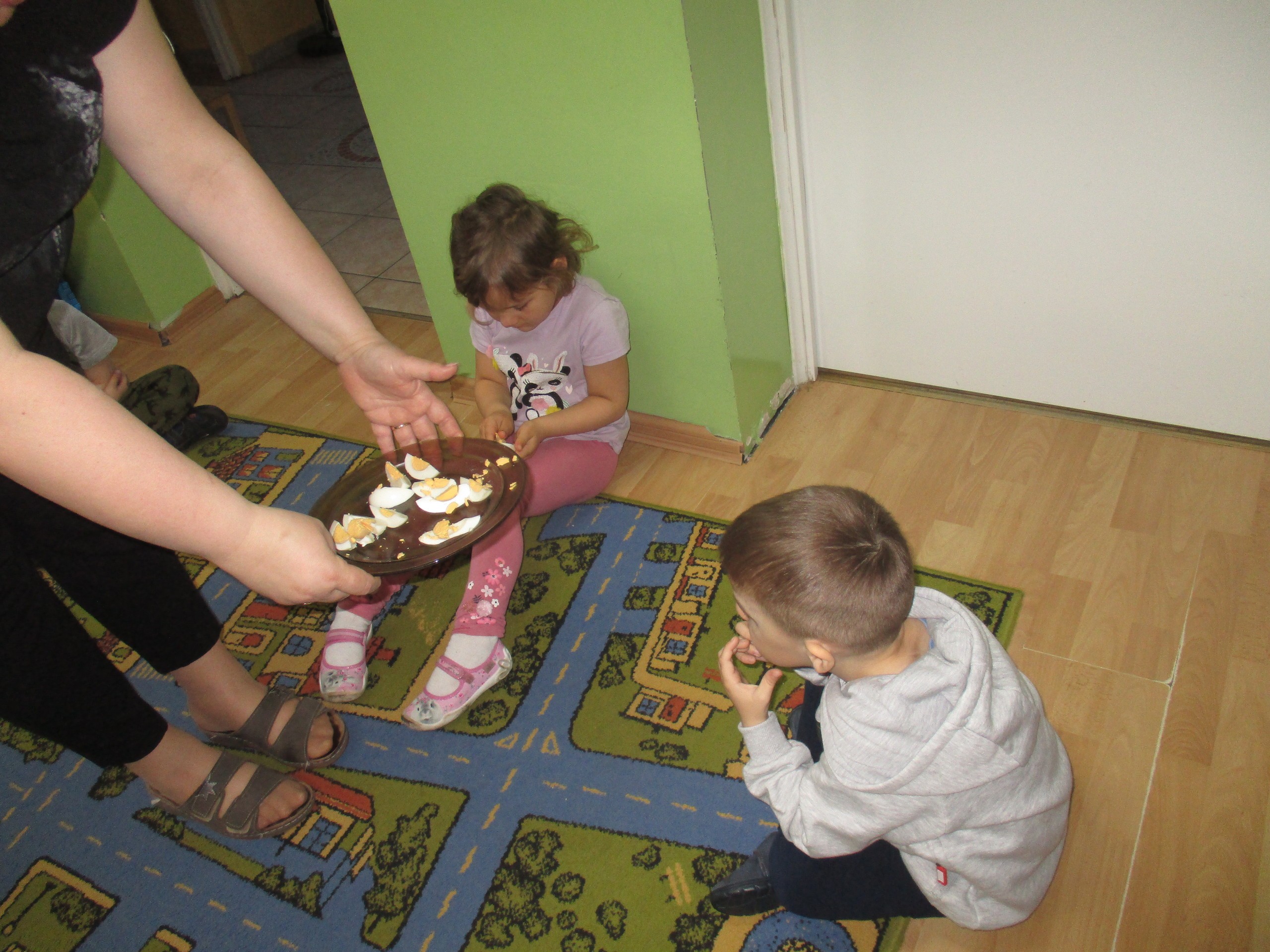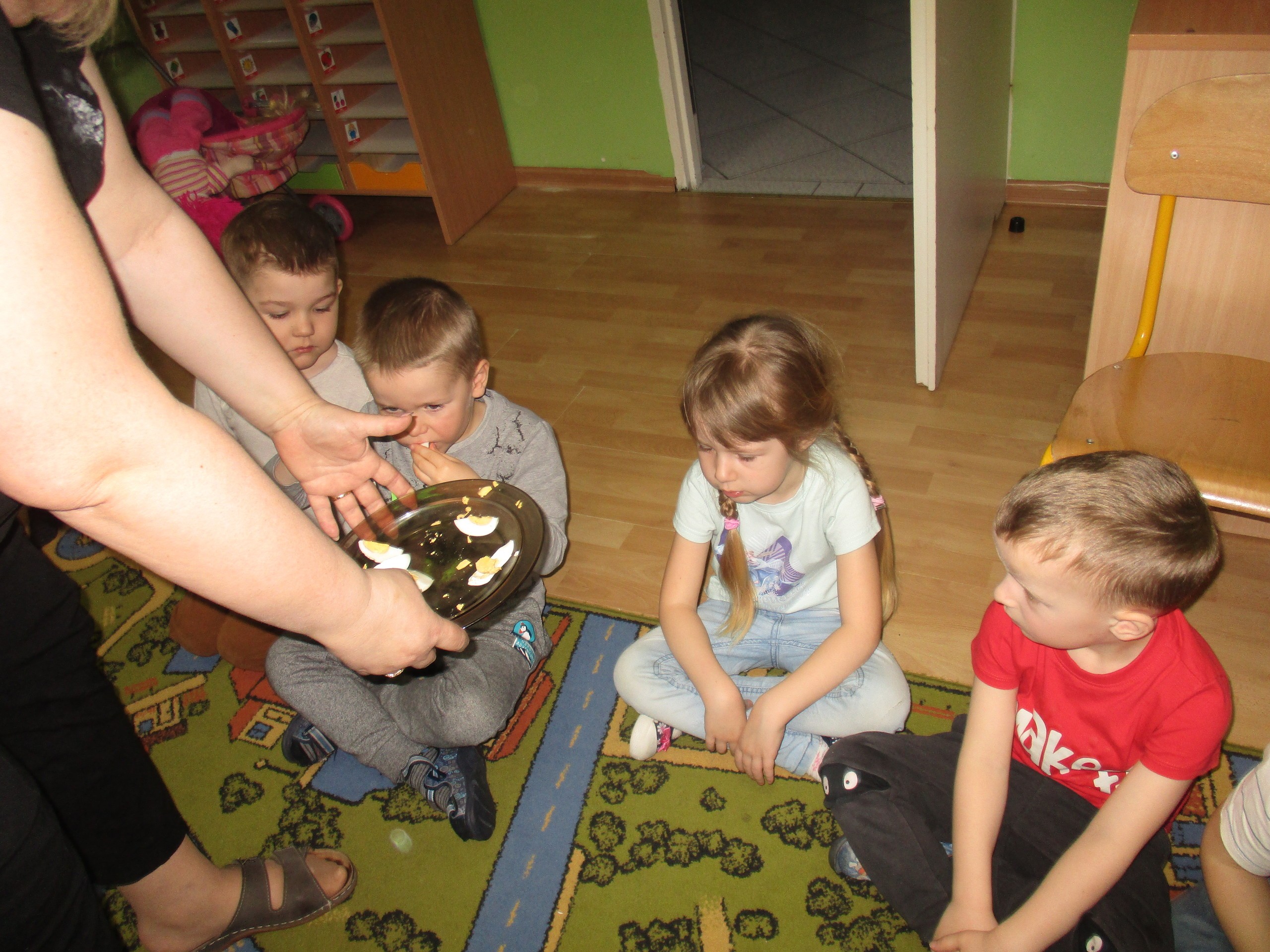 Maluchy zaprosiły do siebie Starszaki, aby wspólnie poszukać koszyka ze słodkimi jajkami. Marta pierwsza znalazła słodkości, którymi poczęstowała koleżanki i kolegów.