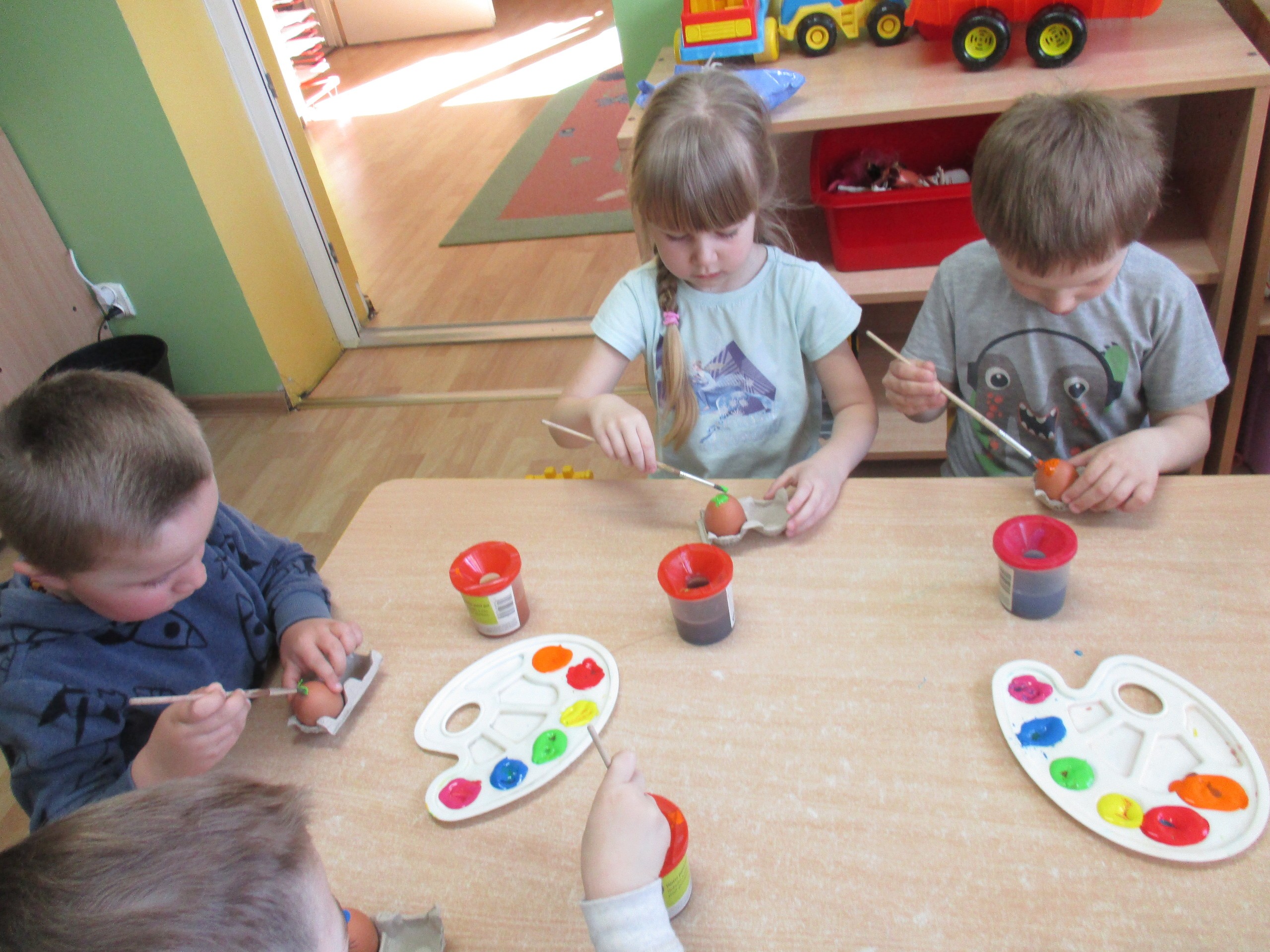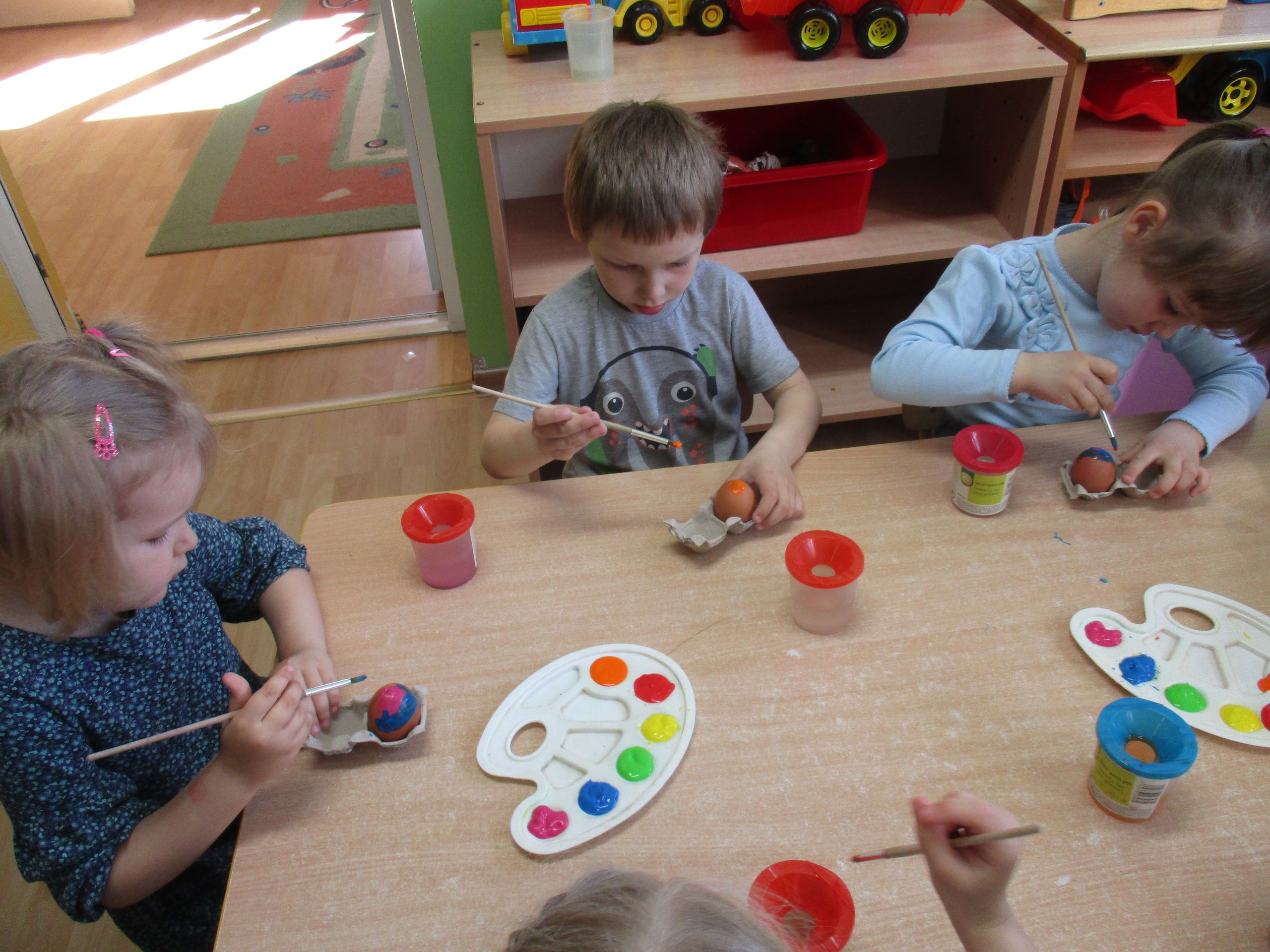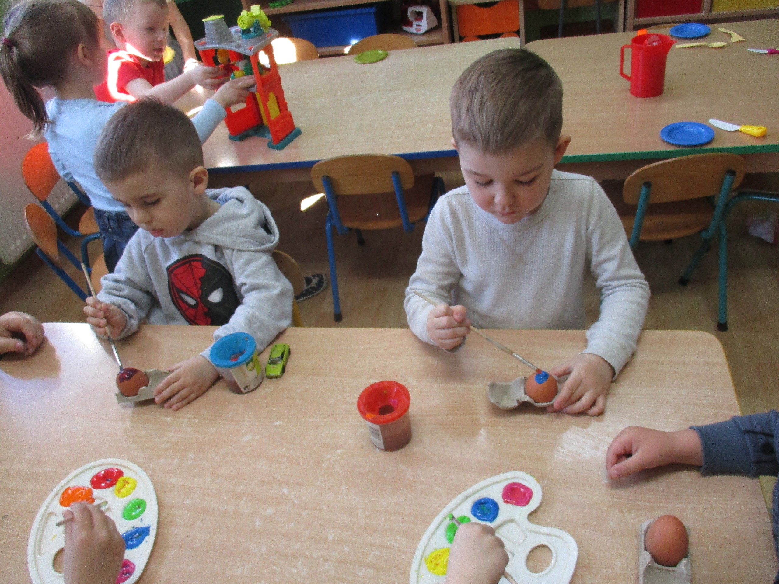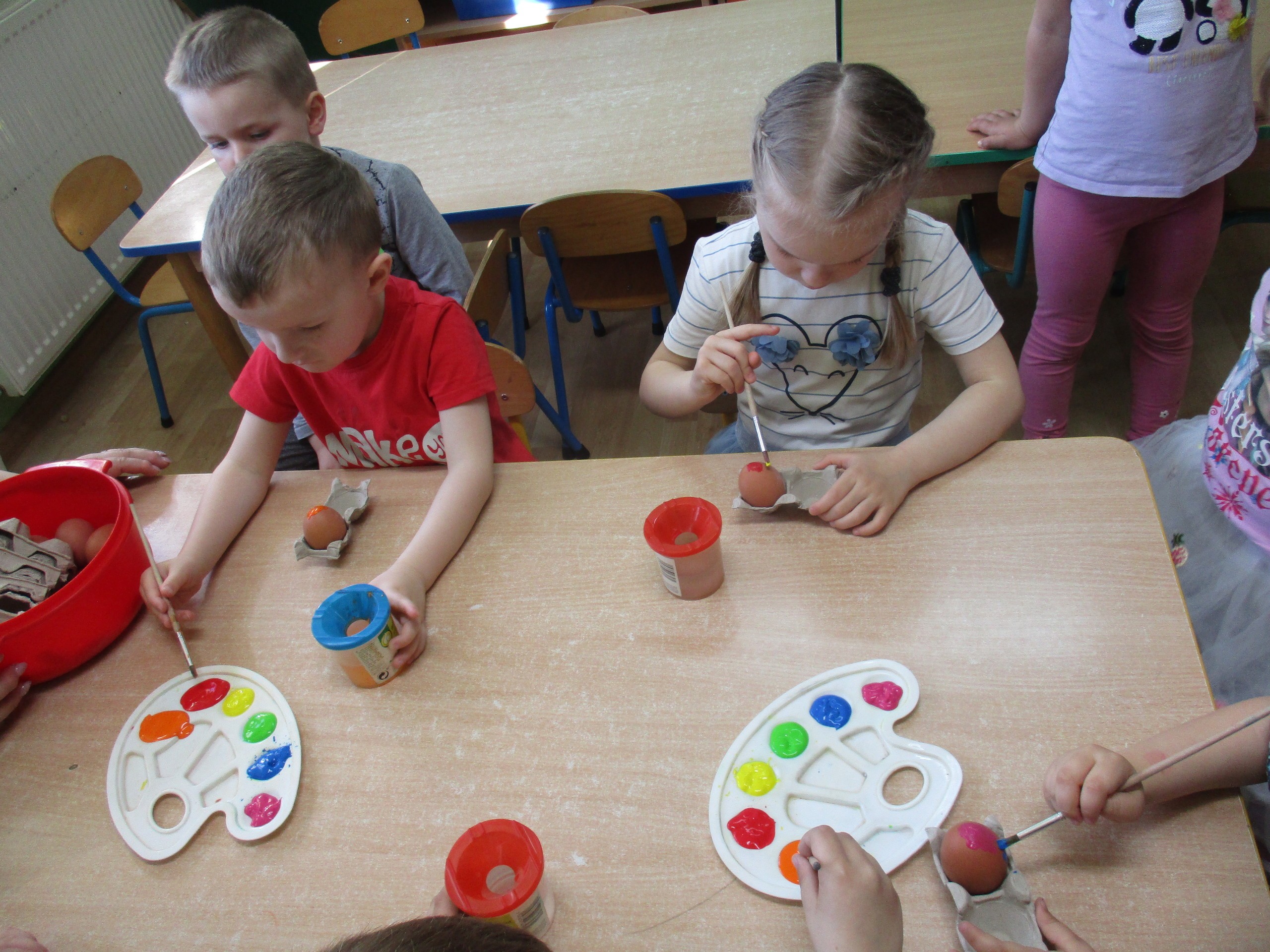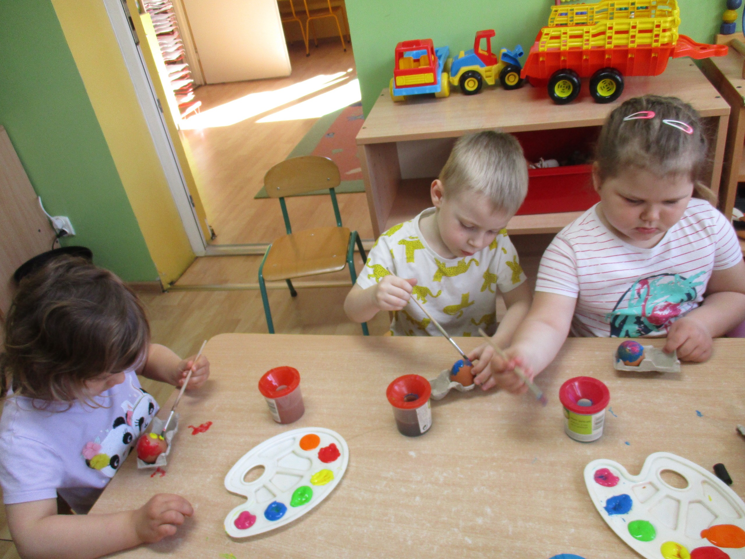 Przedszkolaki z młodszej grupy również wykazały się pomysłowością i kreatywnością z malowania pisanek. Mali twórcy wykonali za pomocą farby i pędzla ozdoby na jajkach według własnych pomysłów, wykazali się inwencją twórczą. Powstały wspaniałe pisanki wielkanocne, które dzieci zabiorą do domu.