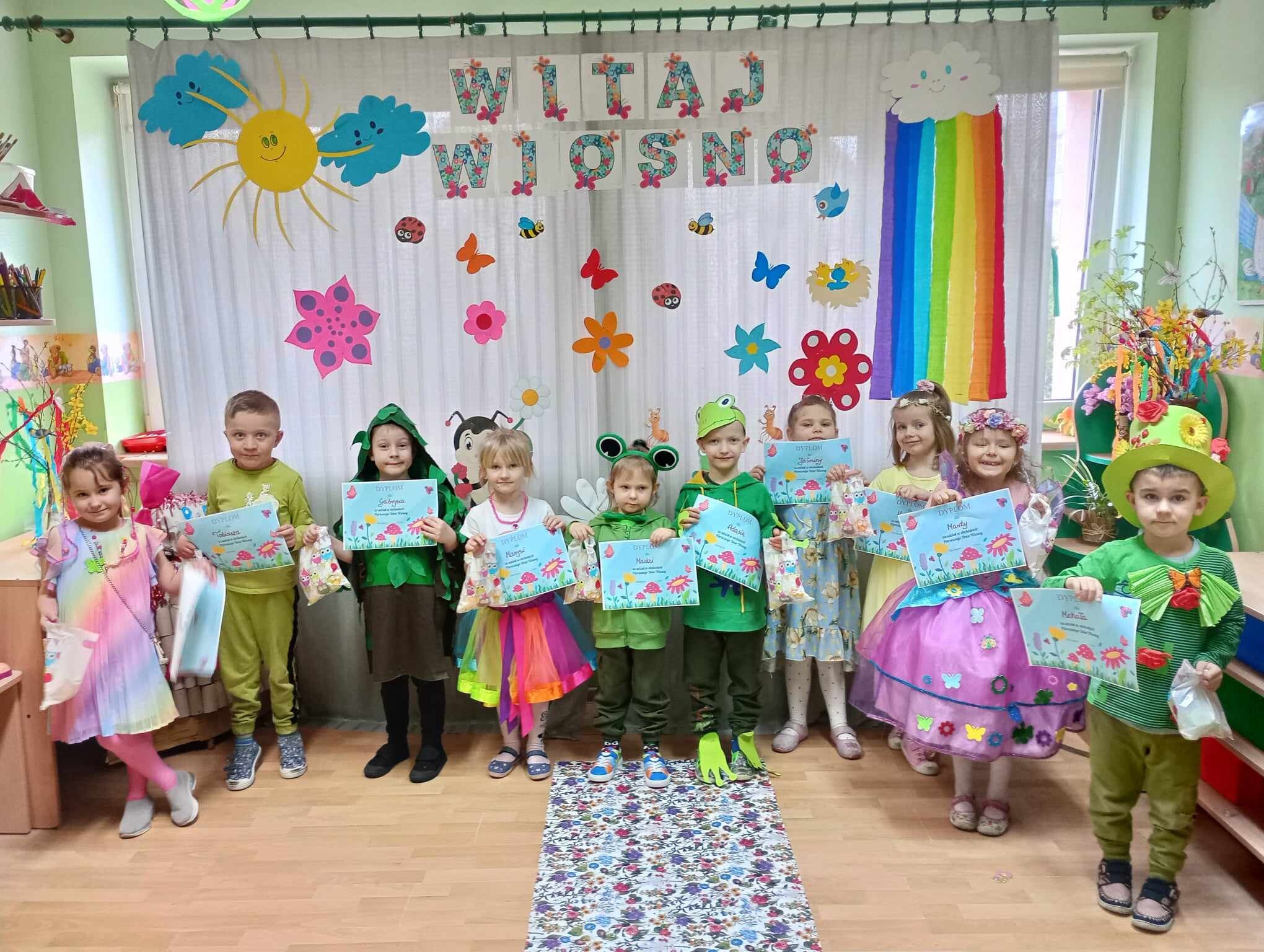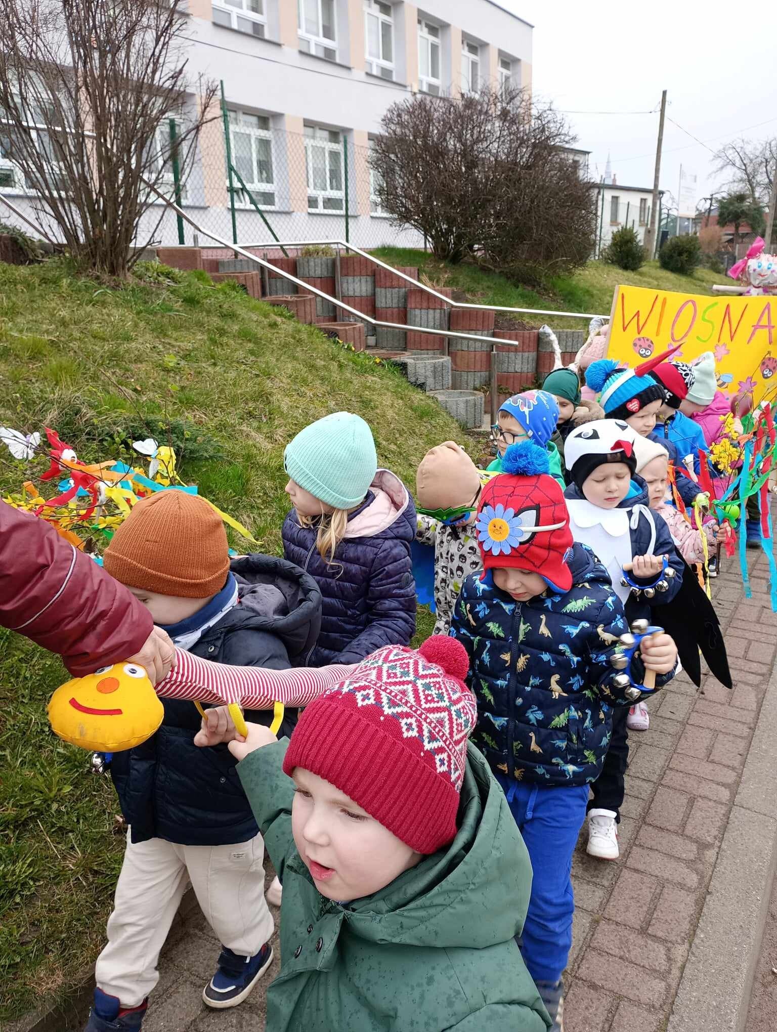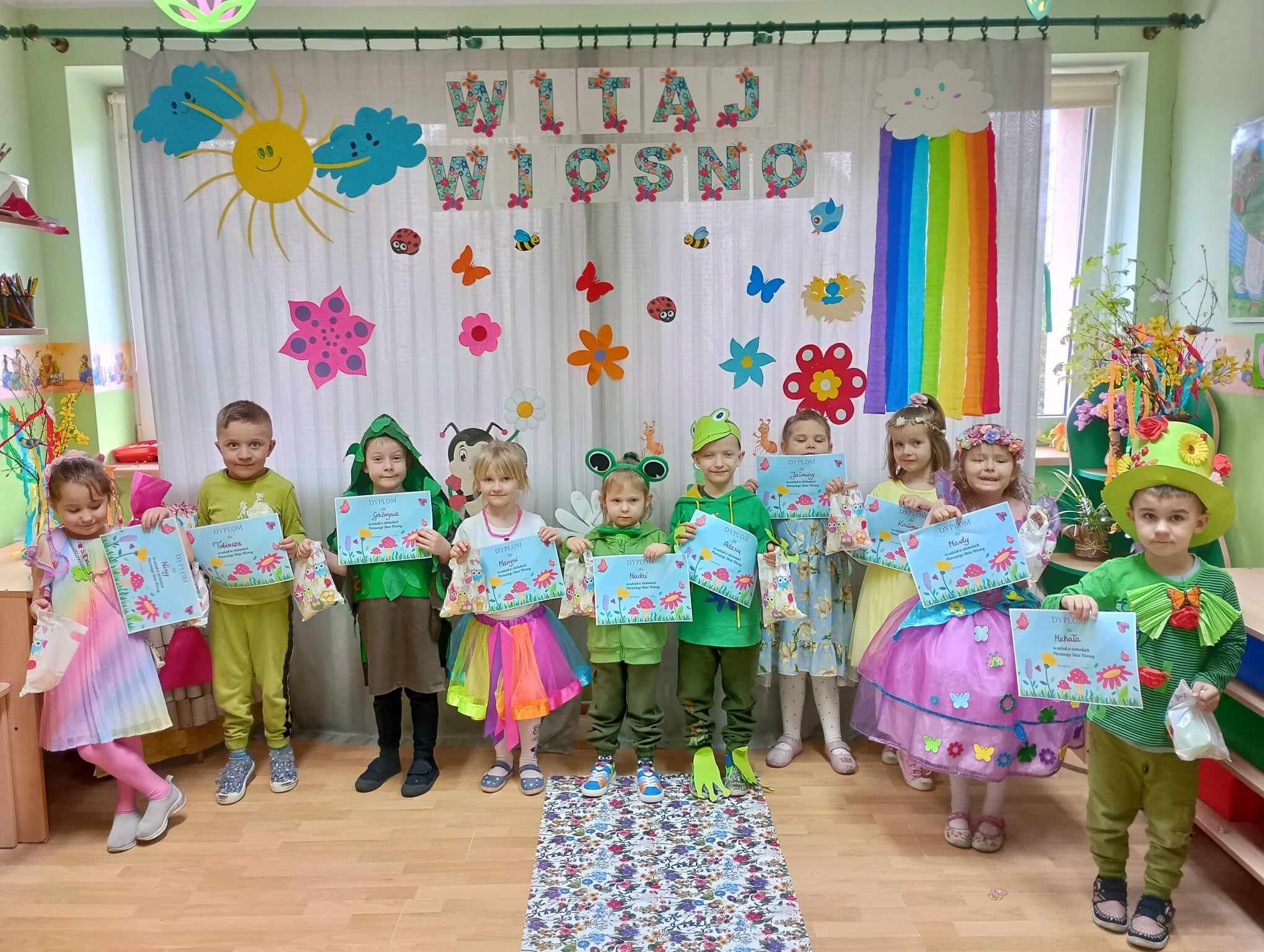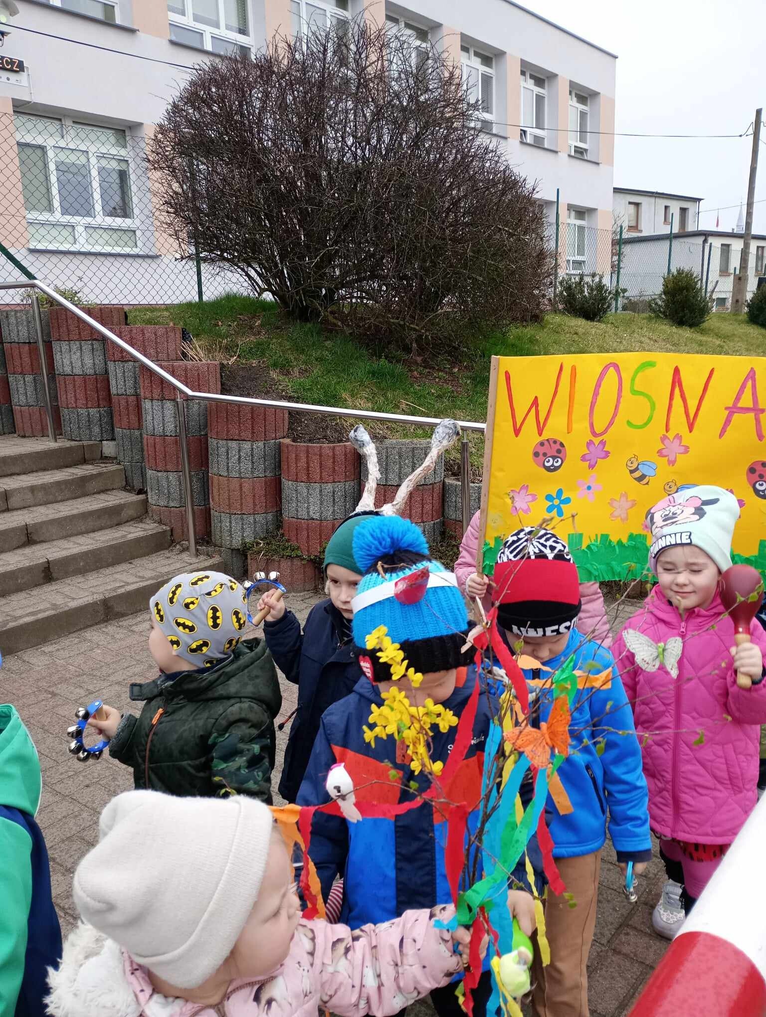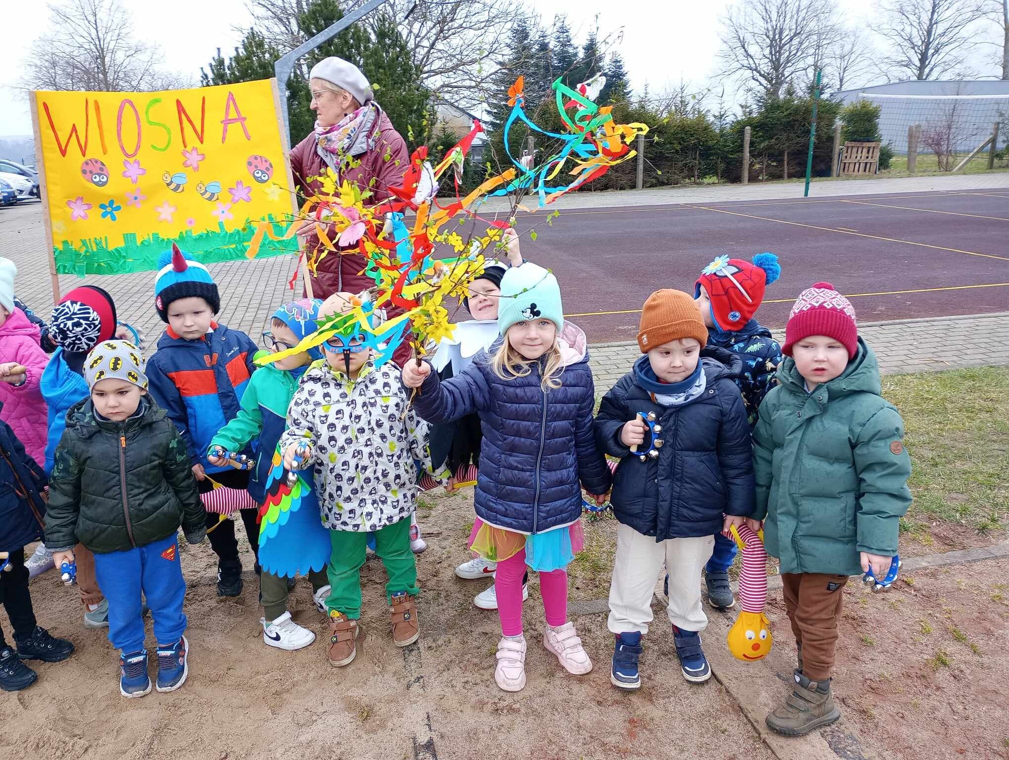 21 Marca dzieci przywitały Wiosnę. Na znak tego szczególnego wydarzenia w naszym przedszkolu odbył się wiosenny pokaz mody, następnie w kolorowych przebraniach wyruszyliśmy na szkolne boisko aby pożegnać Marzannę. Zaraz po tym przedszkolaki wbrały się w drogę , aby w wiosennym korowodzie z instrumentami obwieścić wszystkim, że nadeszła Wiosna. Na koniec tego ważnego wydarzenia wszystkie przedszkolaki otrzymały dyplomy i upominki.