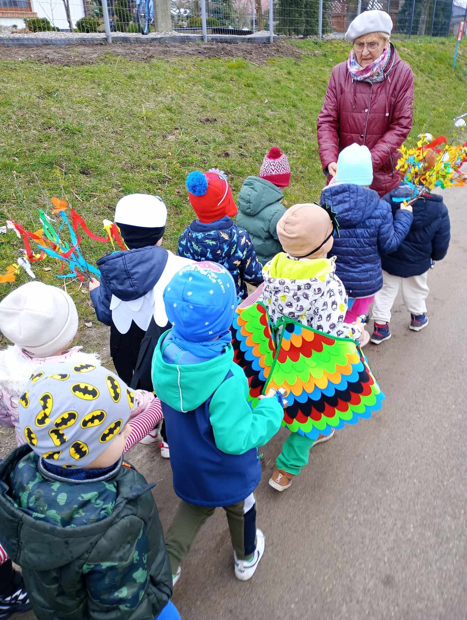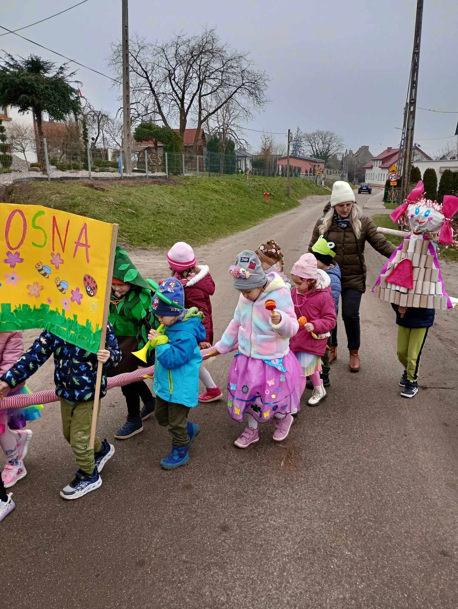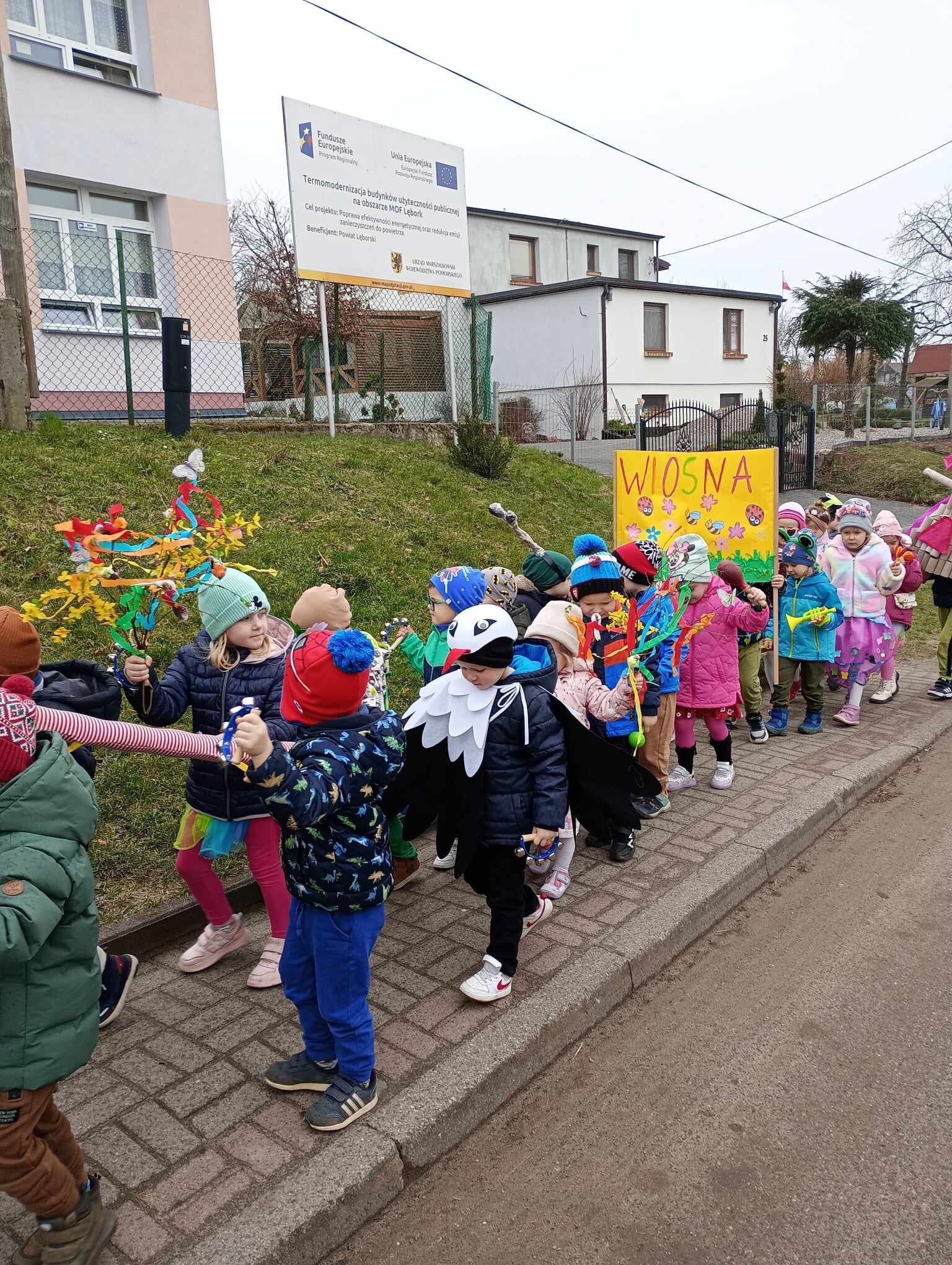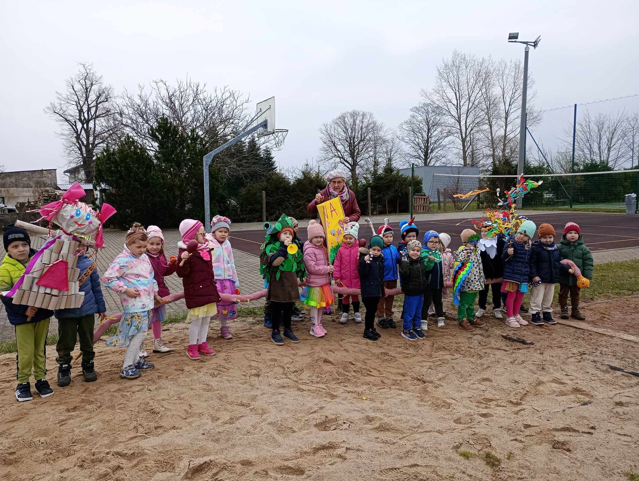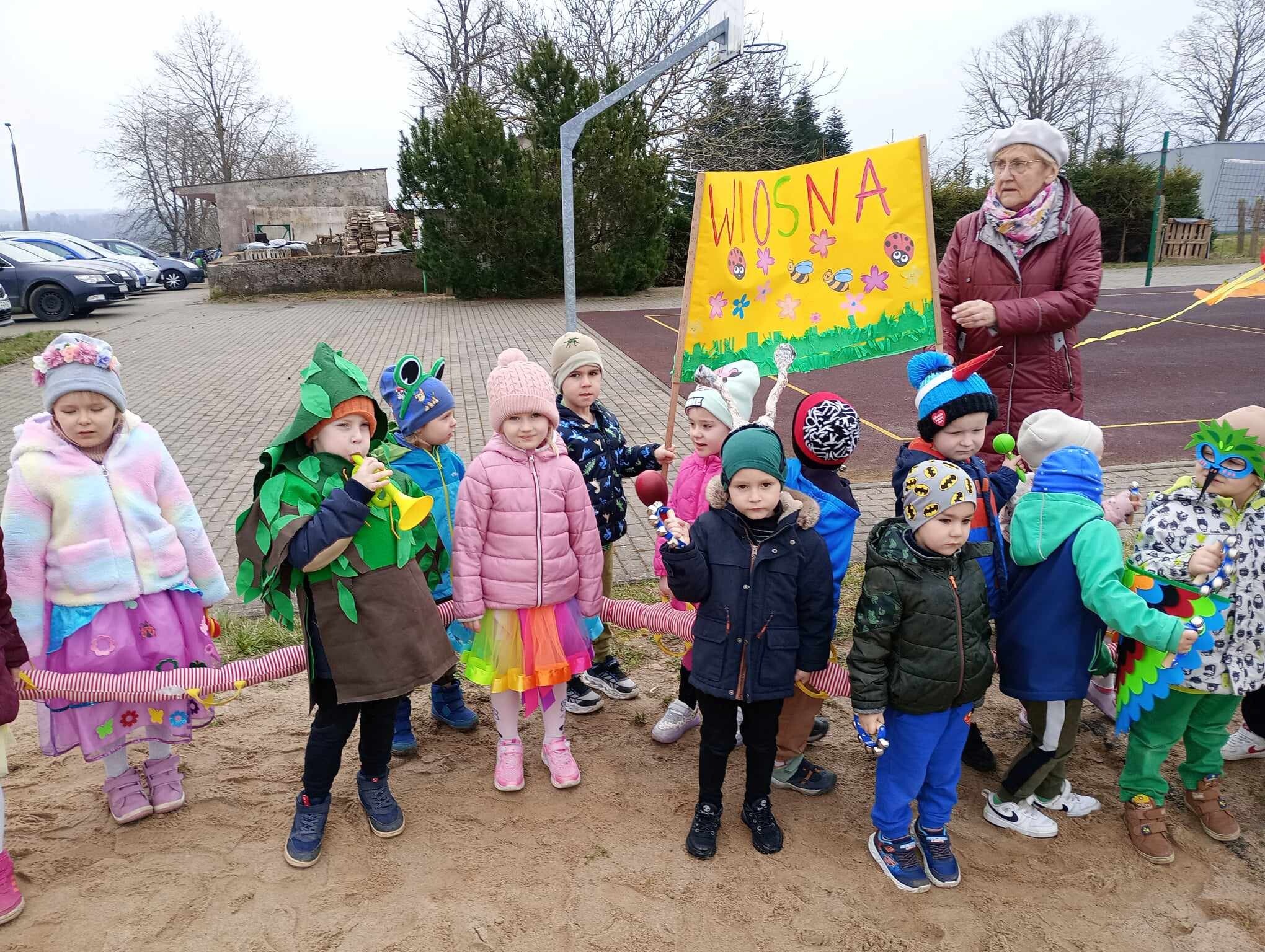 21 Marca dzieci przywitały Wiosnę. Na znak tego szczególnego wydarzenia w naszym przedszkolu odbył się wiosenny pokaz mody, następnie w kolorowych przebraniach wyruszyliśmy na szkolne boisko aby pożegnać Marzannę. Zaraz po tym przedszkolaki wbrały się w drogę , aby w wiosennym korowodzie z instrumentami obwieścić wszystkim, że nadeszła Wiosna. Na koniec tego ważnego wydarzenia wszystkie przedszkolaki otrzymały dyplomy i upominki.