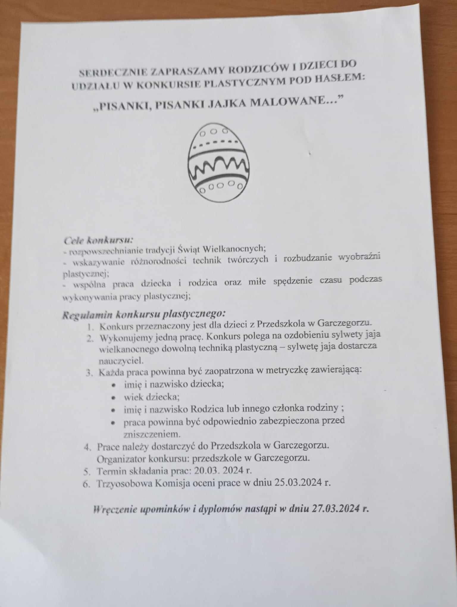 W naszym przedszkolu ogłoszono Rodzinny Konkurs Plastyczny pod hasłem: "PISANKI, PISANKI, JAJKA MALOWANE...". To już tradycja w naszym przedszkolu. Do organizatora wpłynęło 35 różnorodnych prac plastycznych, które zostały ocenione przez Jury. Wszystkie prace, zdaniem członków komisji, zasługiwały na I miejsce. Celem konkursu było rozpowszechnianie tradycji Świąt Wielkanocnych, poznanie i wykorzystanie różnorodnych technik plastycznych oraz miłe spędzenie czasu dzieci i rodziców.
