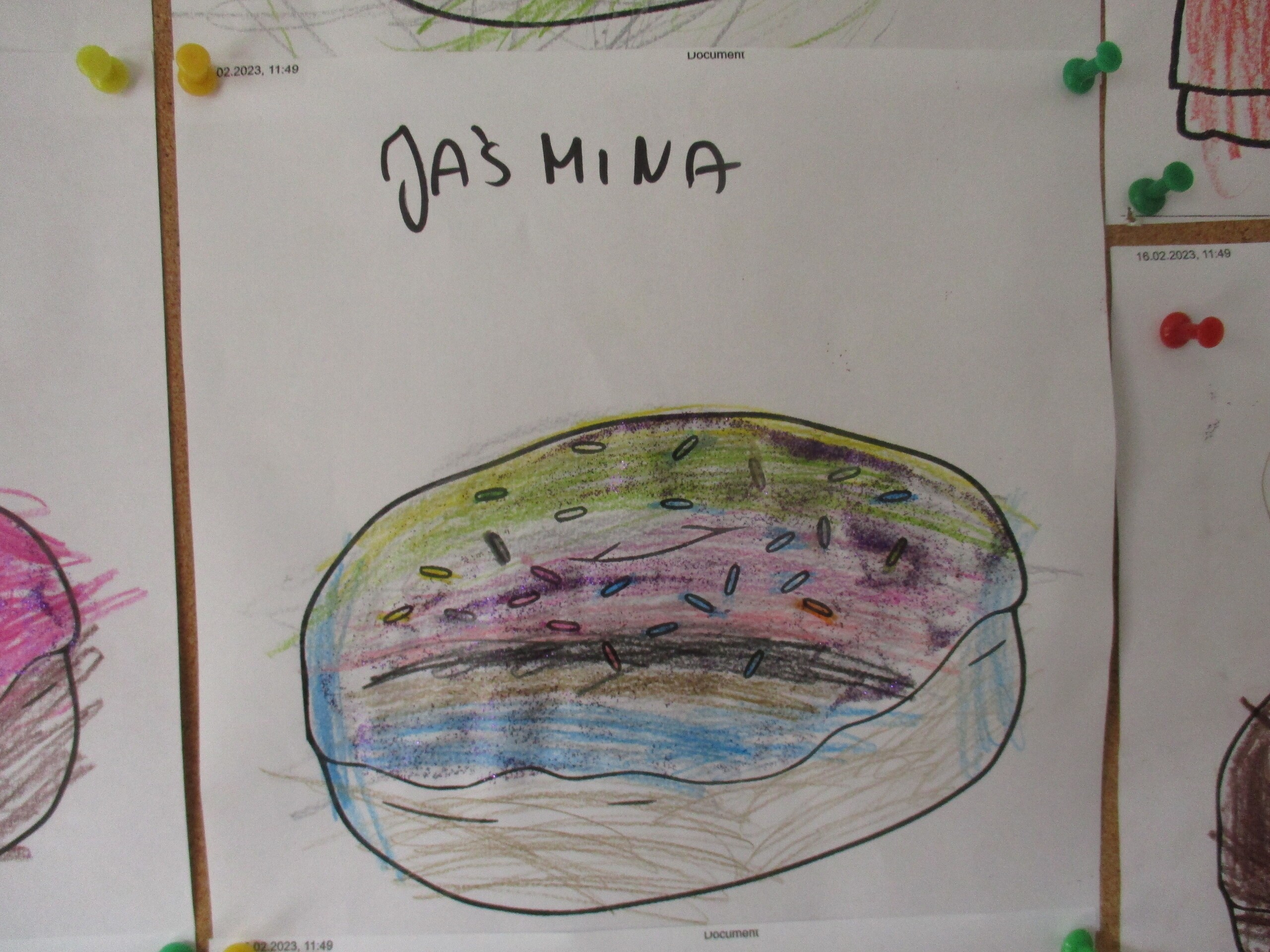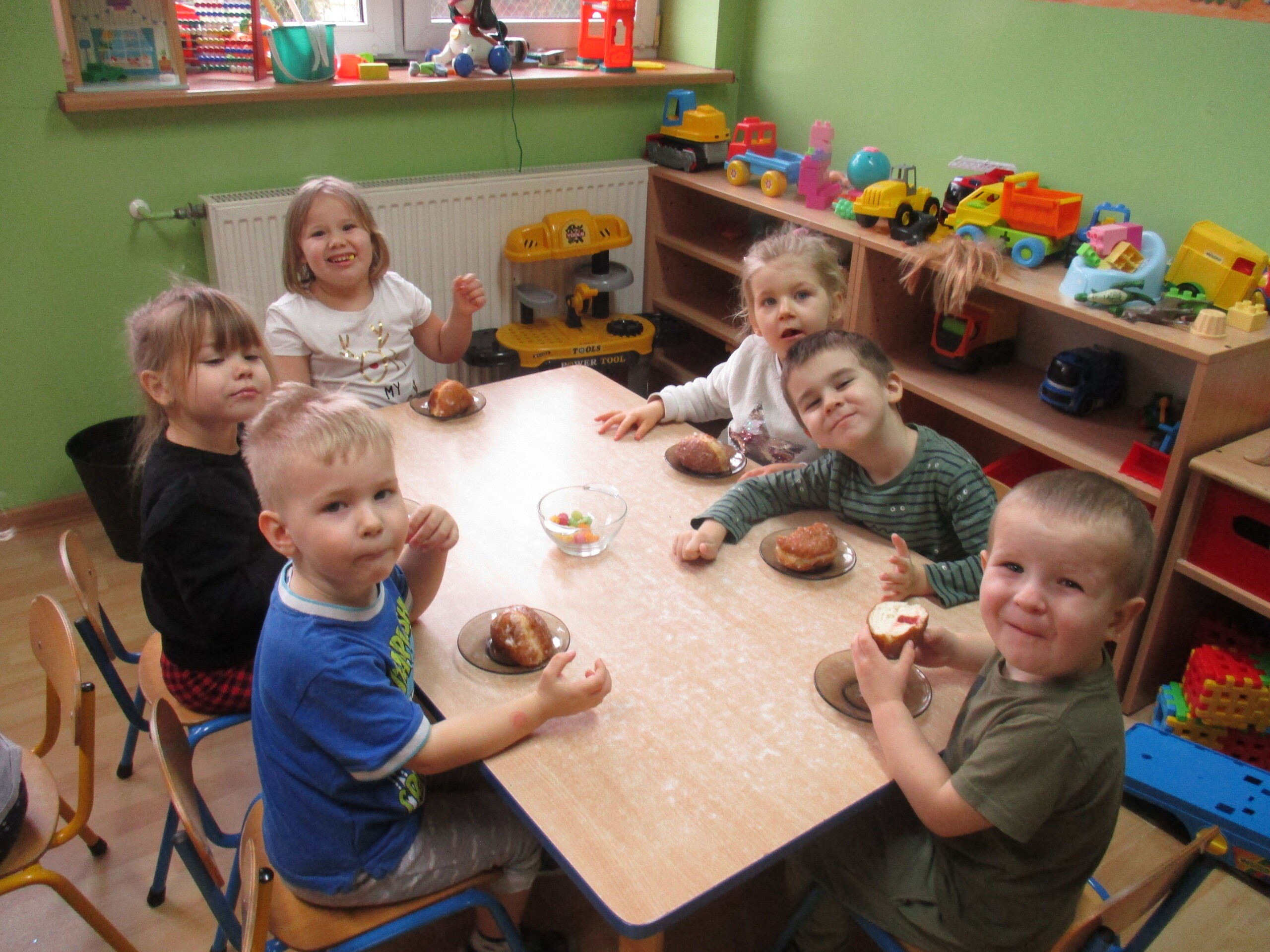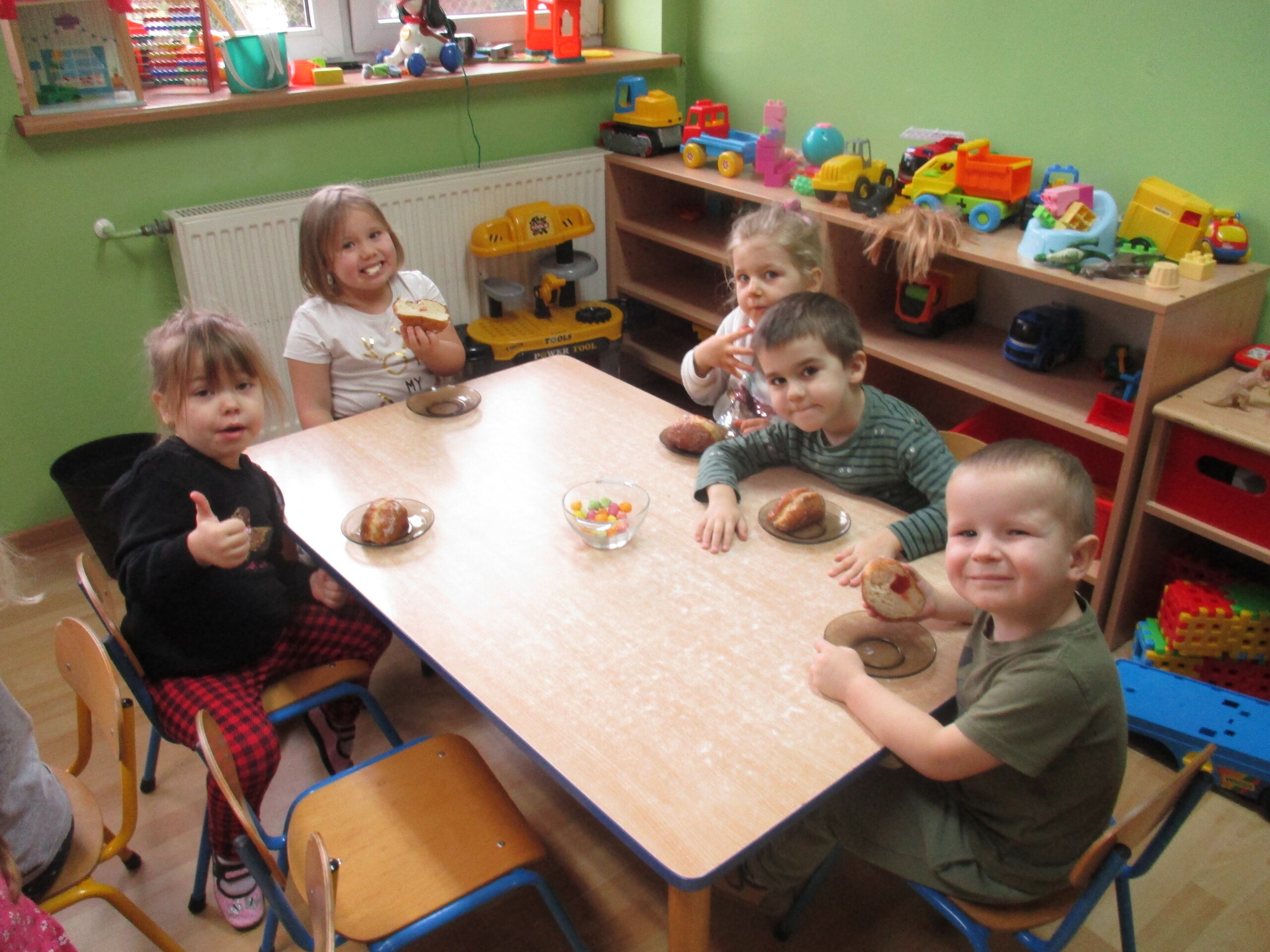 Z okazji Tłustego Czwartku Nikodem z mamą - Panią Dorotą, przyniósł dla wszystkich dzieci pączki. Nikodem powiedział, że przyniósł niespodziankę - pączka, gdyż dziś jest Dzień Pączka. Wszystkie dzieci z przyjemnością zjadły pączki przyniesione przez swojego kolegę.