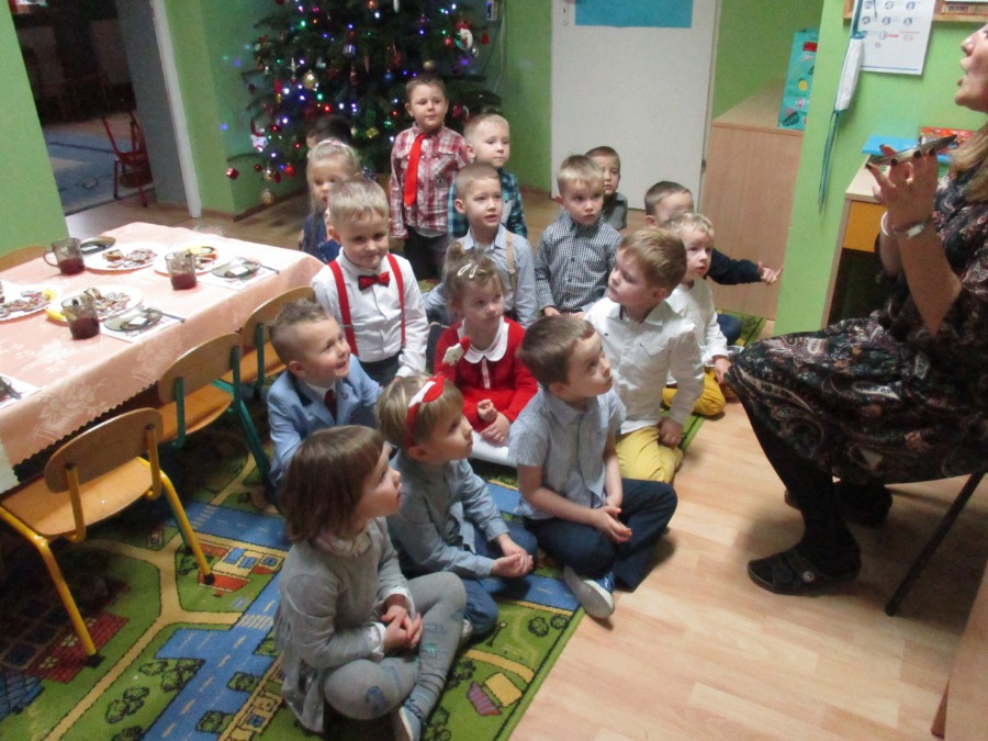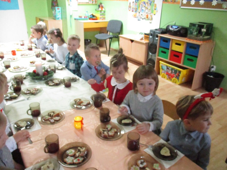 Oto nadszedł długo oczekiwany dzień przedszkolnej Wigilii. 22 grudnia w naszym przedszkolu odbyła się uroczysta Wigilia. Dzieci ubrane w odświętne stroje wraz z nauczycielkami zebrały się w dużej sali zabaw. Wszyscy podzielili się opłatkiem życząc sobie nawzajem wszelkiej pomyślności i Radosnych Świąt. Po życzeniach wszyscy zasiedli do odświętnie udekorownych stołów, na których nie brakowało tradycyjnych potraw związanych z Wigilią: pierogów, barszczu, pierniczków i makowca. Nie zabrakło też wspólnego kolędowania, a płonące lampki choinkowe wpłynęły na uroczysty, świąteczny nastrój pełen życzliwości i serdeczności. Był to dzień, w którym dzieciaczki razem spędziły miłe chwile w przedszkolu przy wigilijnym poczęstunku oraz na wspólnym kolędowaniu. Na pamiątkę wigilijnego spotkania przedszkolaki zabrały do domu samodzielnie zrobione ozdoby choinkowe (młodsze dzieci choinki a starsze bombki), kartki z życzeniami oraz słodkie mikołaje. Wierzymy, że wspólne świętowanie przyczyniło się do kultywowania typowo polskich tradycji i było miłym wstępem do przeżywania Świąt Narodzenia Pańskiego.