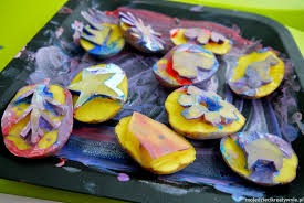 4. Praca plastyczna: Stemplowanie pisankami z ziemniaków.