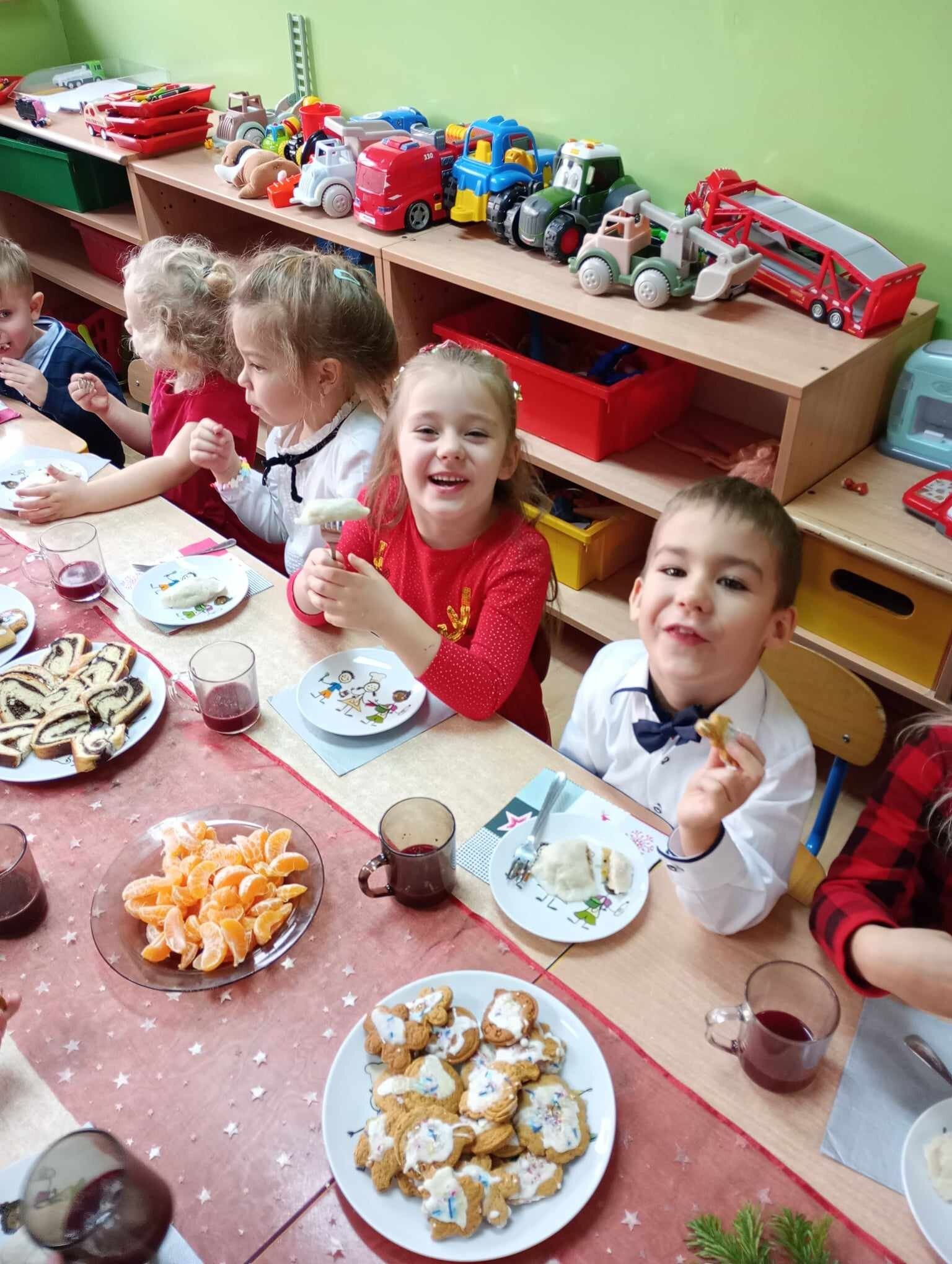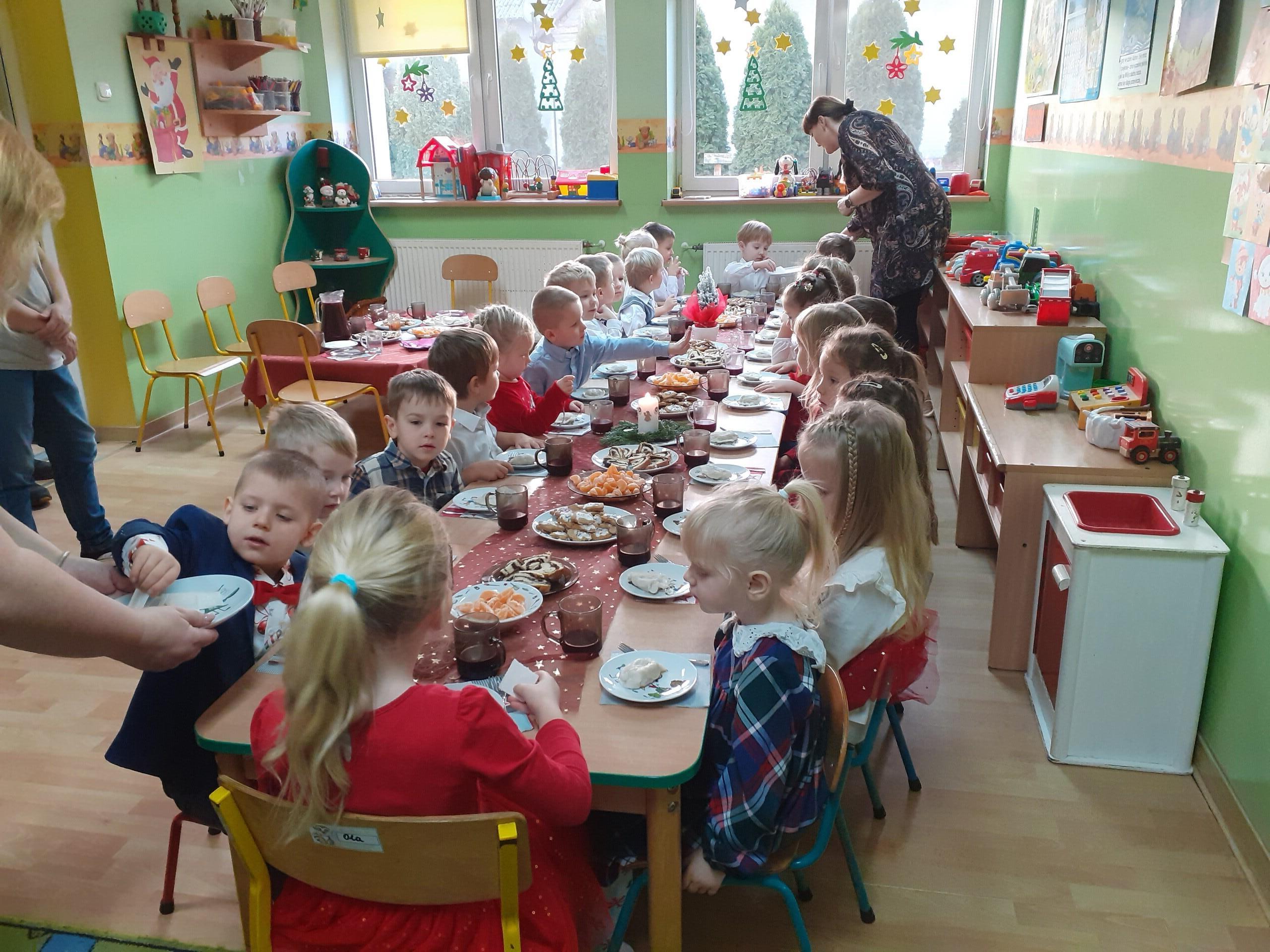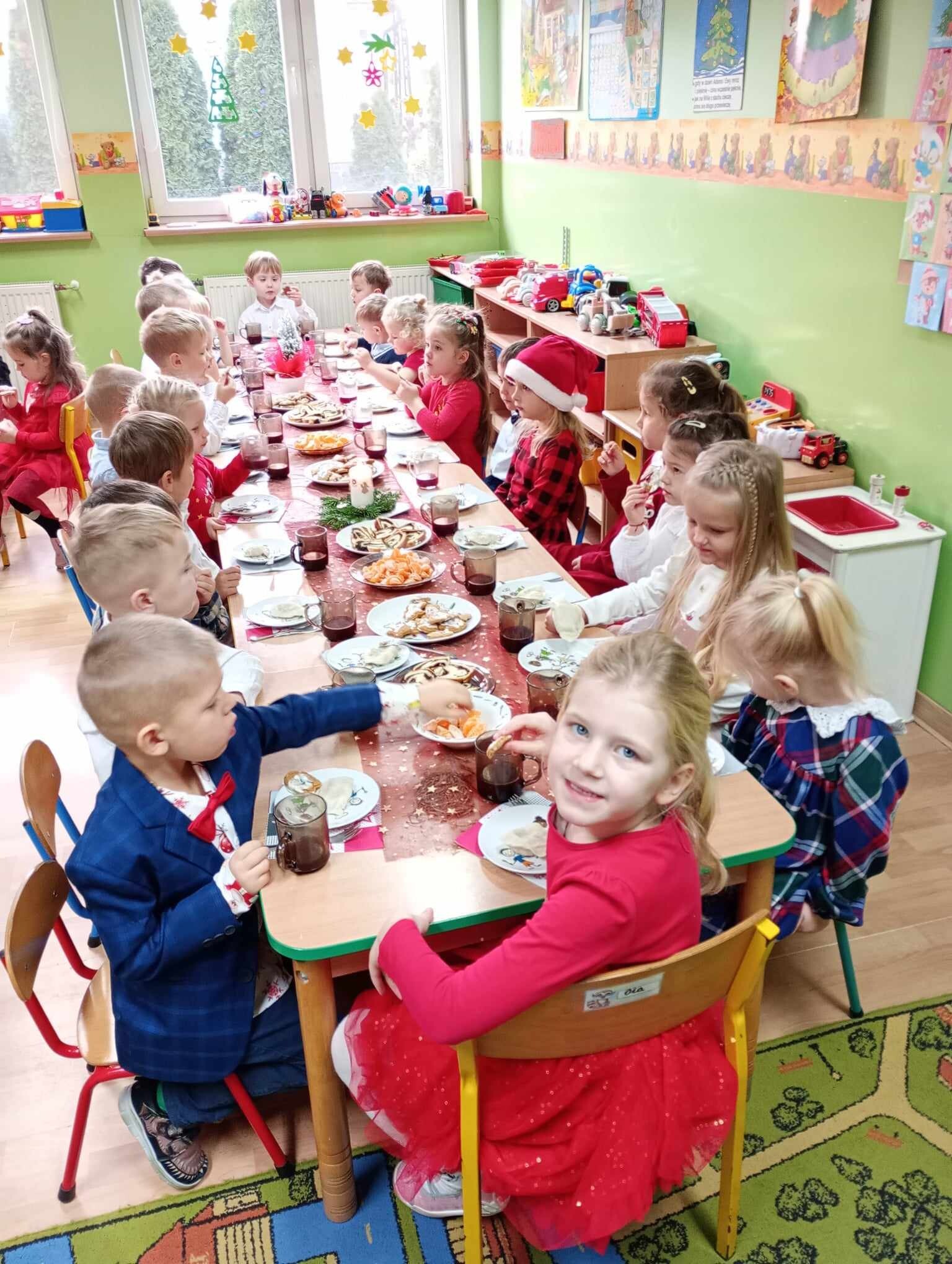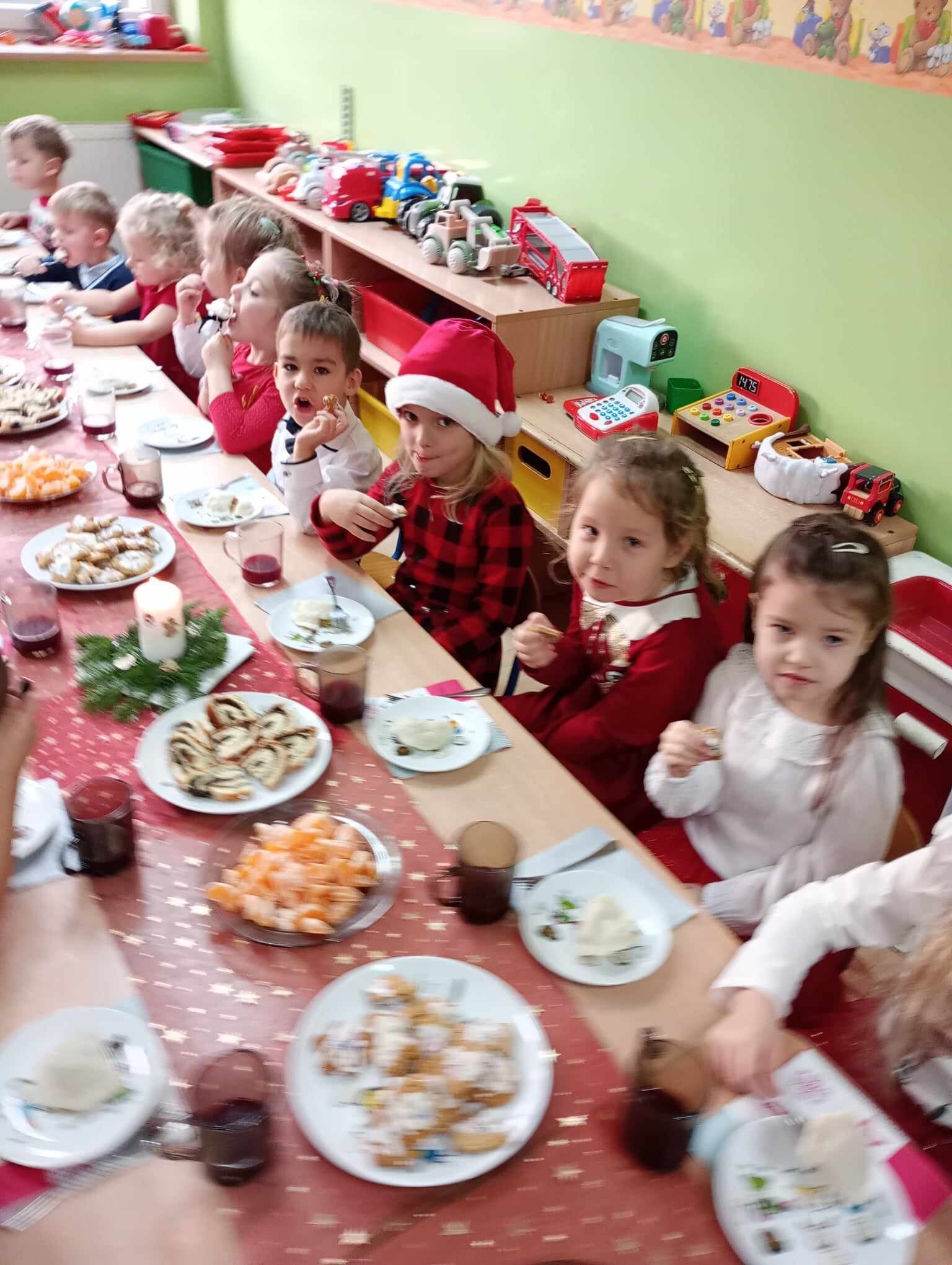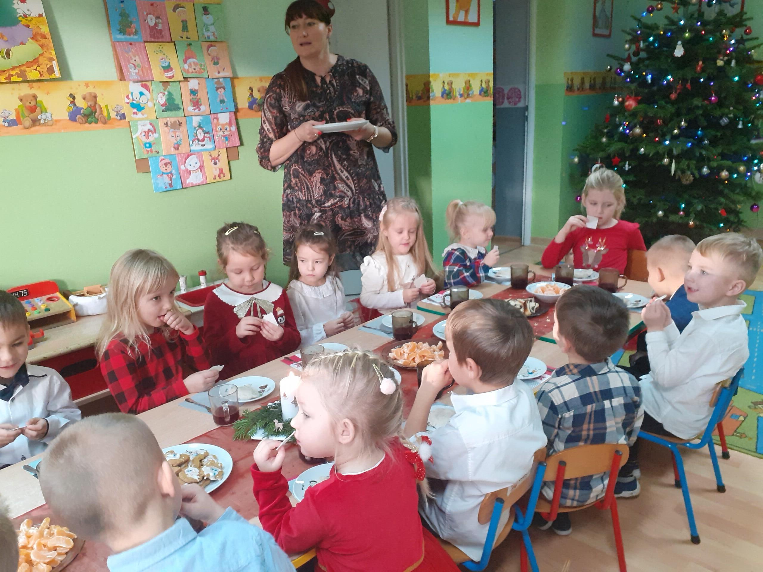 Dzisiaj w przedszkolu odbyła się uroczysta Wigilia. Na stole pojawił się opłatek, barszcz, pierogi, makowiec, pierniczki oraz pachnące mandarynki. Tradycyjnie pod obrusem znalazło się sianko a na stole dodatkowe nakrycie dla gościa. Po złożeniu świątecznych życzeń dzieci zaśpiewały znane kolędy. Odwiedziła nas Pani dyrektor Alicja Guźniczak, którą dzieci zaprosiły do celebrowania Wigilii. Po uroczystym posiłku przedszkolaki powitały gościa z workiem prezentów. Tym gościem okazał się Mikołaj.