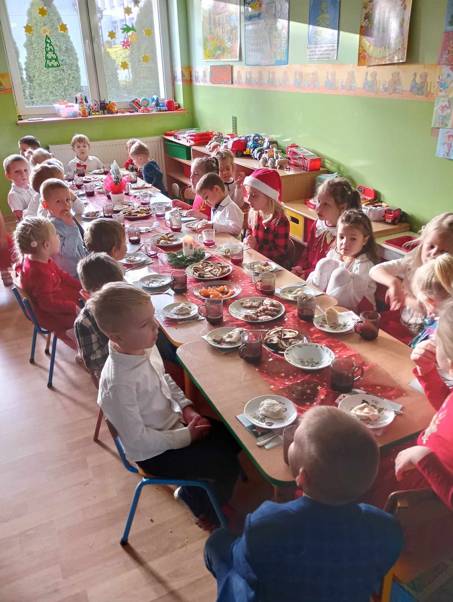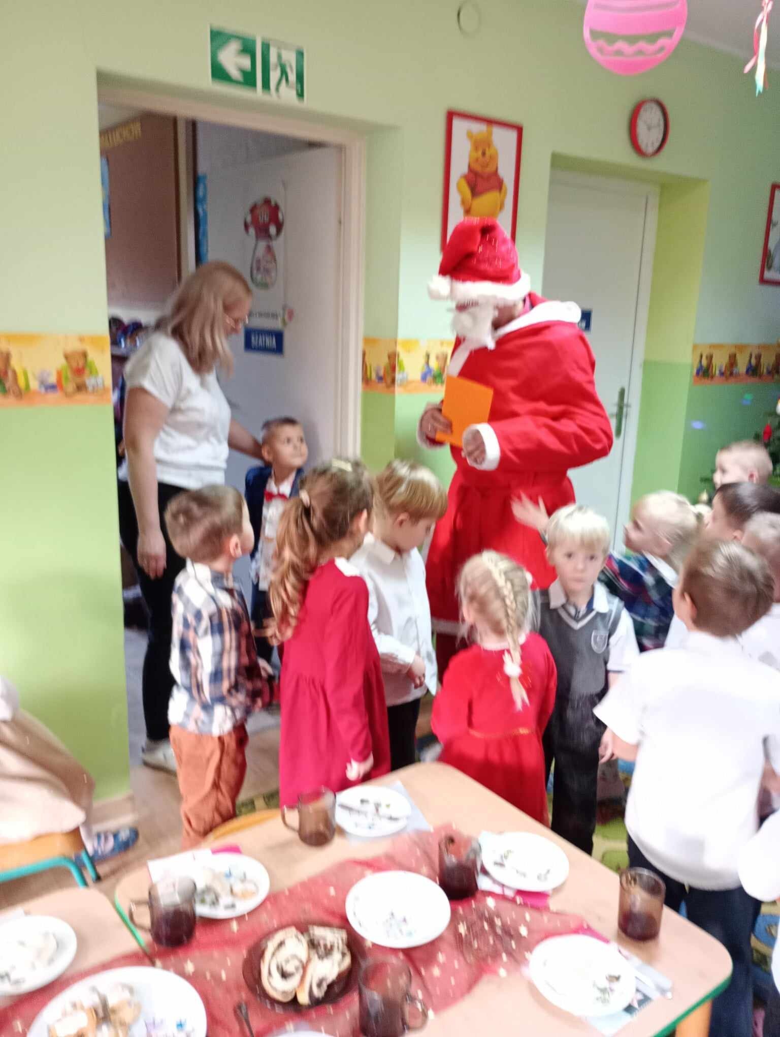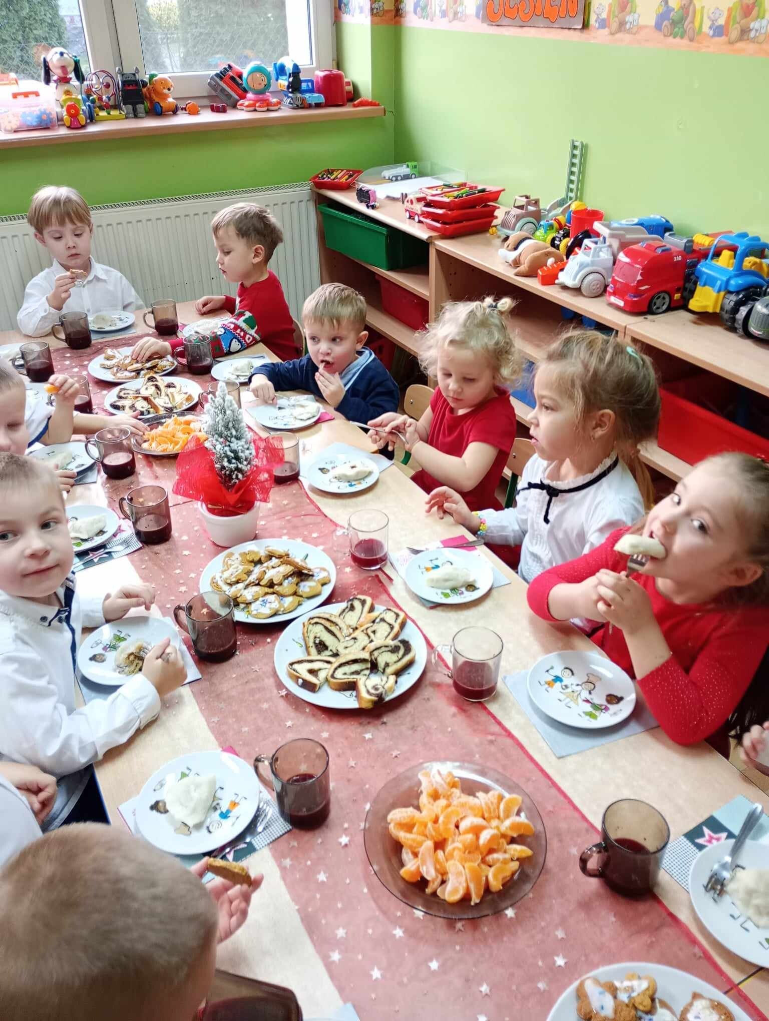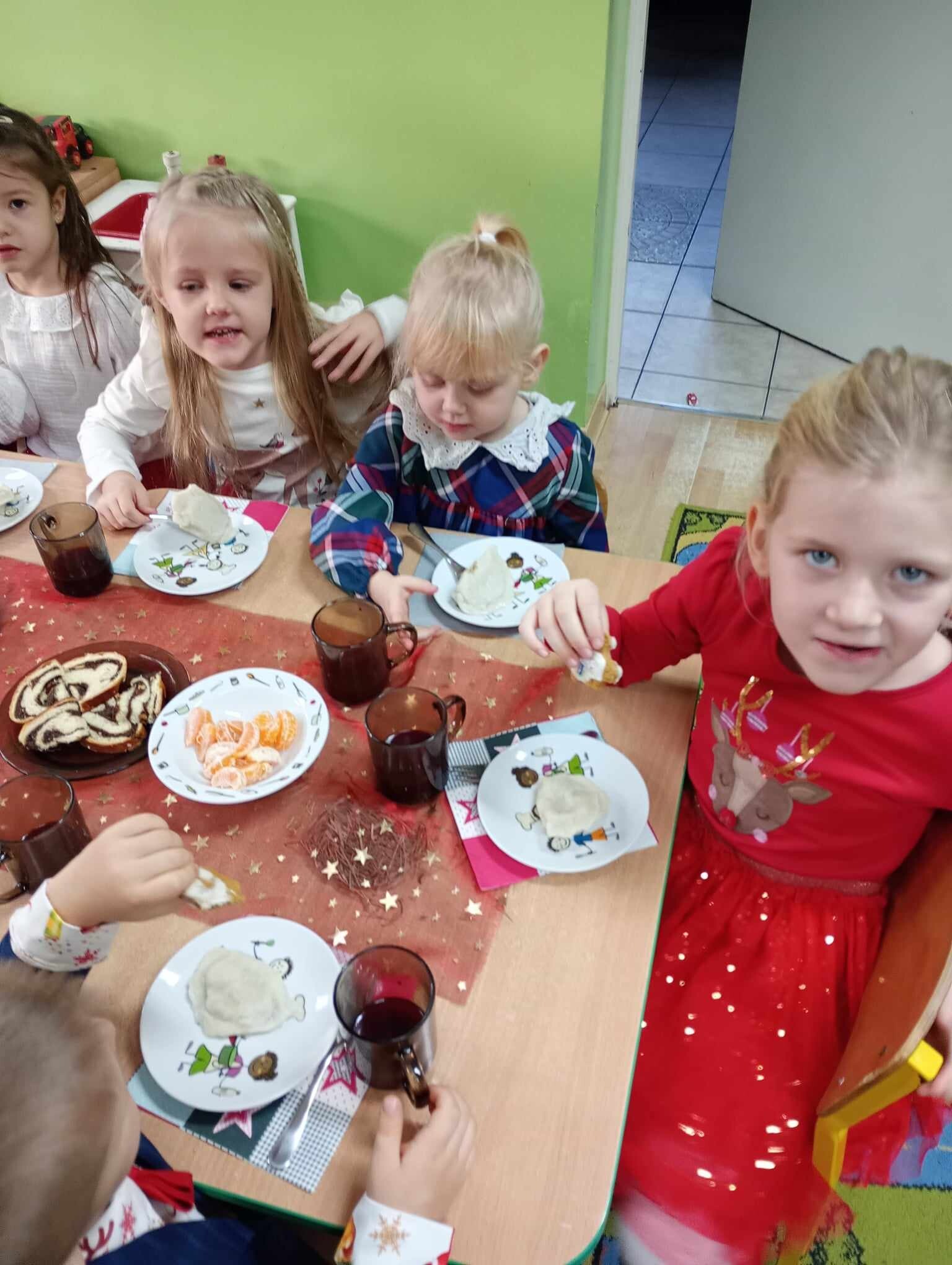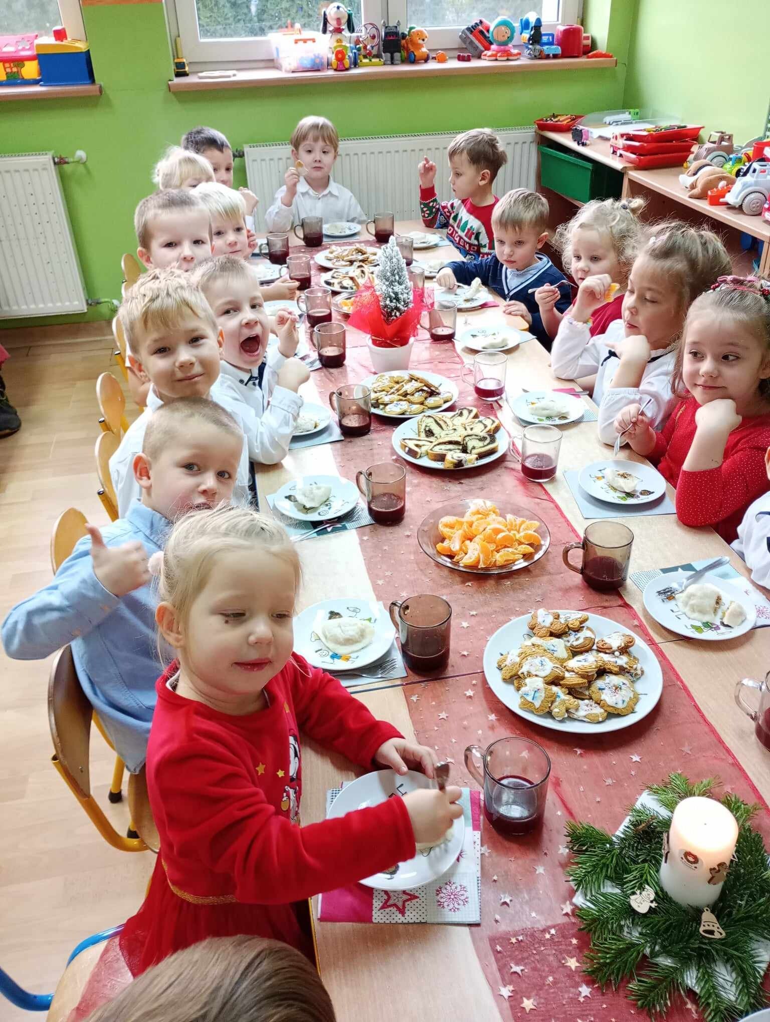 Dzisiaj w przedszkolu odbyła się uroczysta Wigilia. Na stole pojawił się opłatek, barszcz, pierogi, makowiec, pierniczki oraz pachnące mandarynki. Tradycyjnie pod obrusem znalazło się sianko a na stole dodatkowe nakrycie dla gościa. Po złożeniu świątecznych życzeń dzieci zaśpiewały znane kolędy. Odwiedziła nas Pani dyrektor Alicja Guźniczak, którą dzieci zaprosiły do celebrowania Wigilii. Po uroczystym posiłku przedszkolaki powitały gościa z workiem prezentów. Tym gościem okazał się Mikołaj.