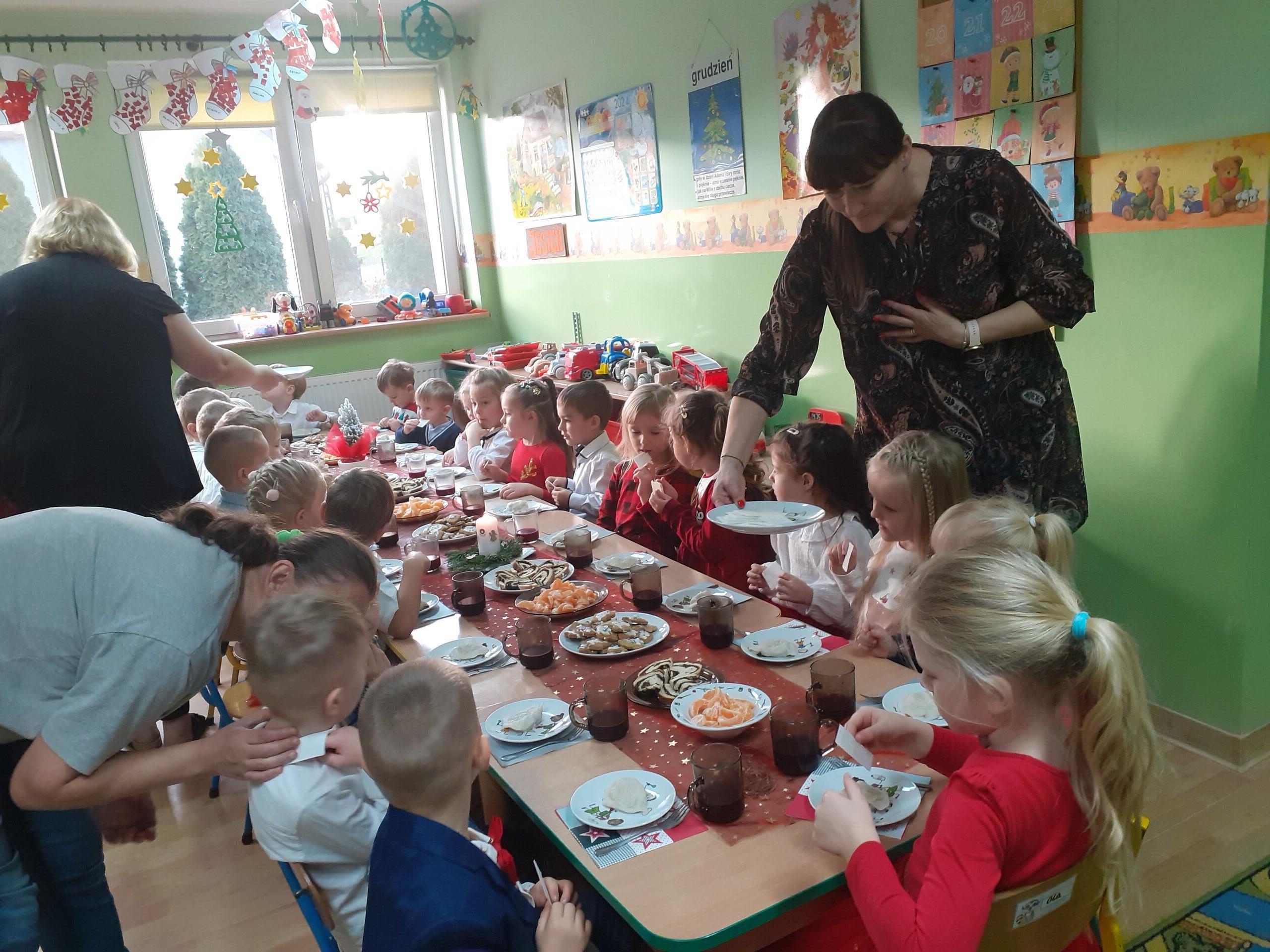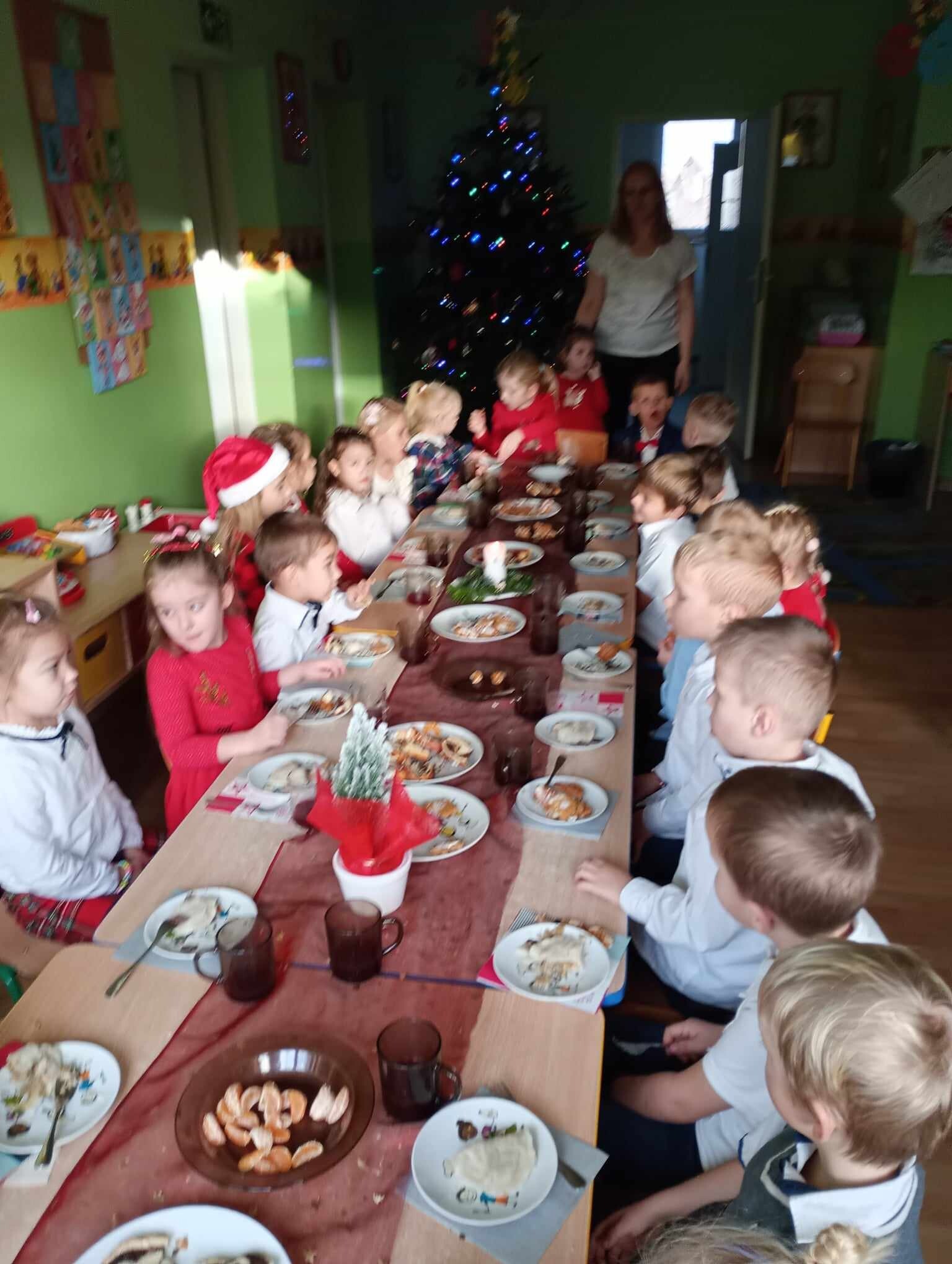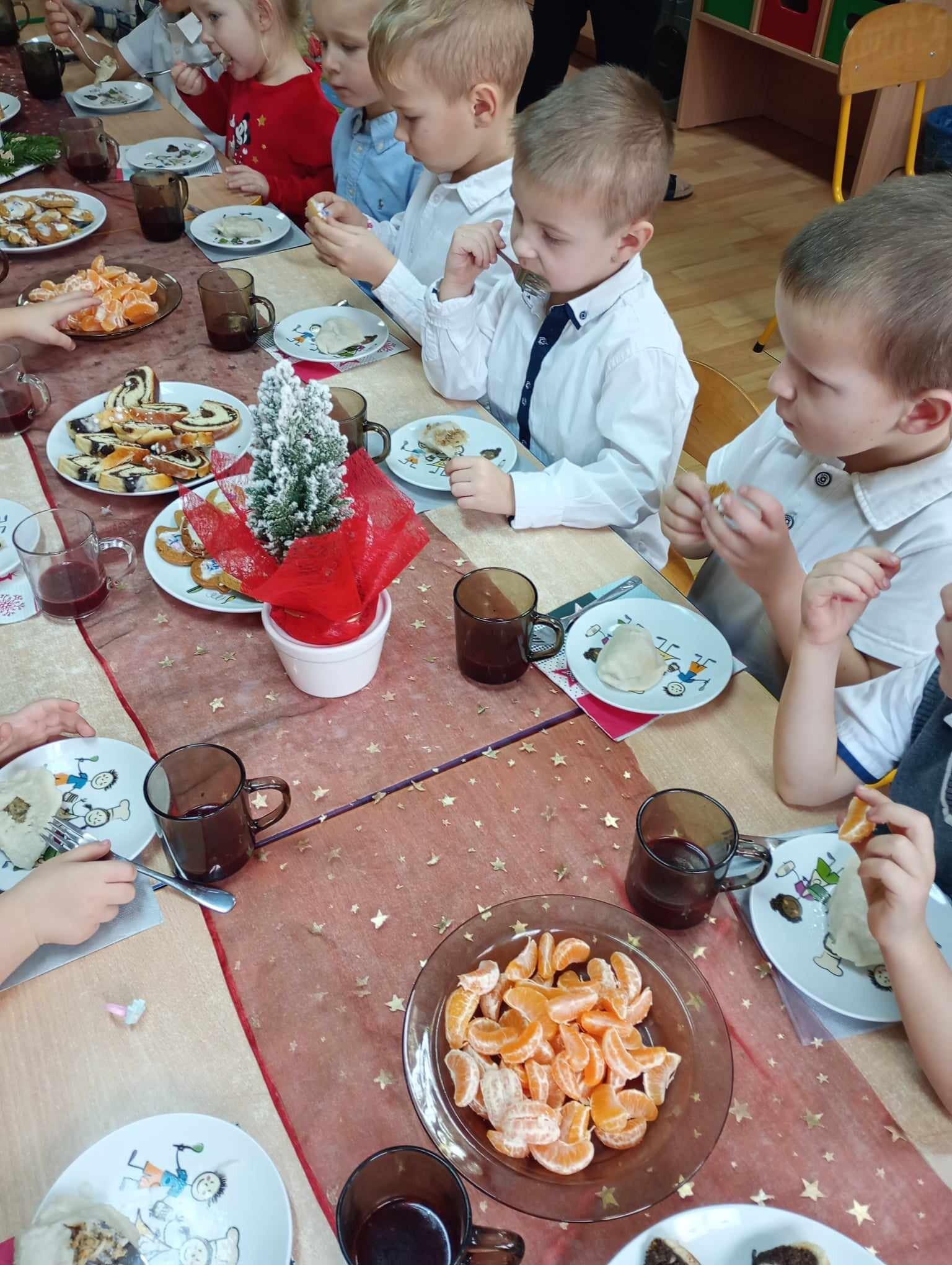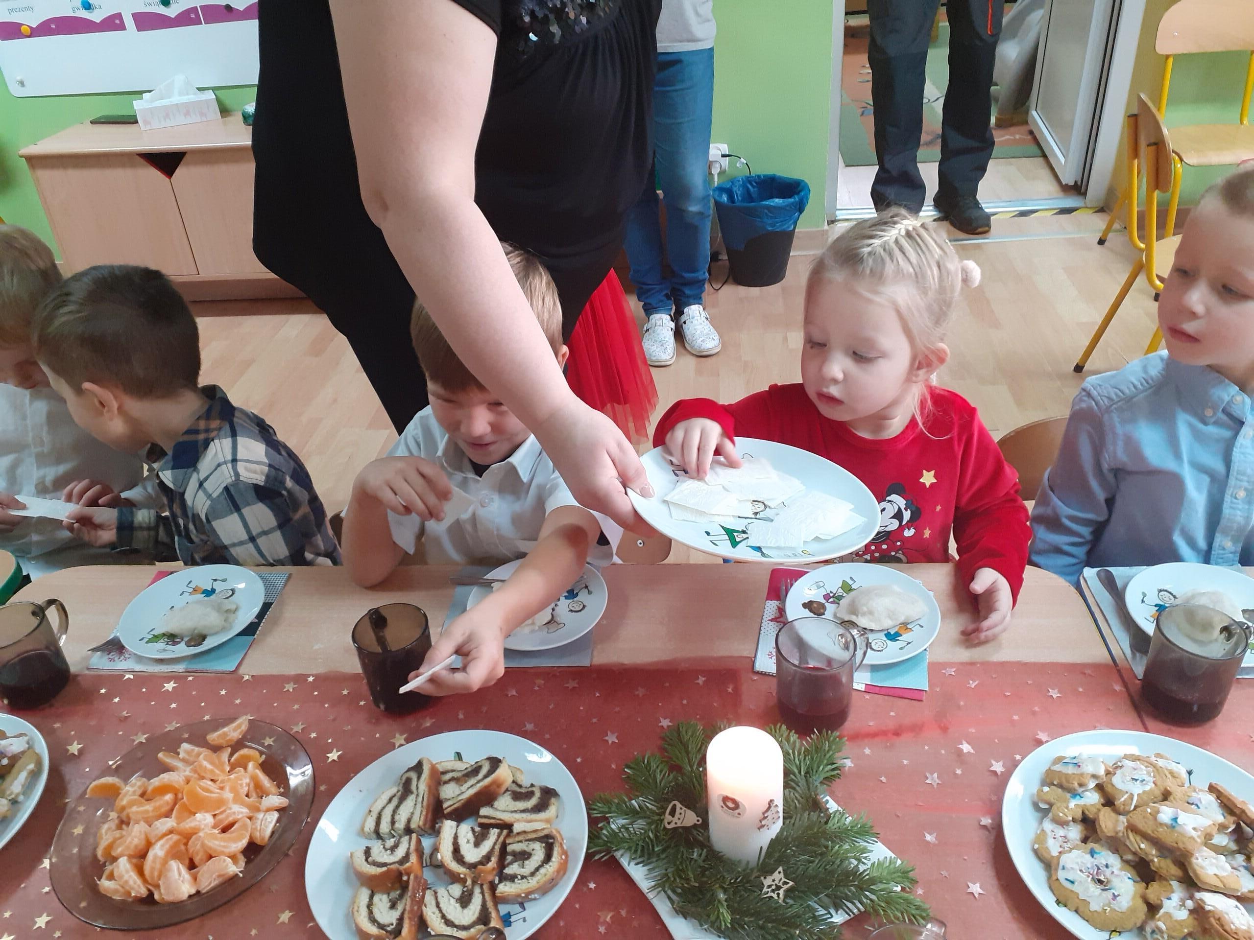 Dzisiaj w przedszkolu odbyła się uroczysta Wigilia. Na stole pojawił się opłatek, barszcz, pierogi, makowiec, pierniczki oraz pachnące mandarynki. Tradycyjnie pod obrusem znalazło się sianko a na stole dodatkowe nakrycie dla gościa. Po złożeniu świątecznych życzeń dzieci zaśpiewały znane kolędy. Odwiedziła nas Pani dyrektor Alicja Guźniczak, którą dzieci zaprosiły do celebrowania Wigilii. Po uroczystym posiłku przedszkolaki powitały gościa z workiem prezentów. Tym gościem okazał się Mikołaj.