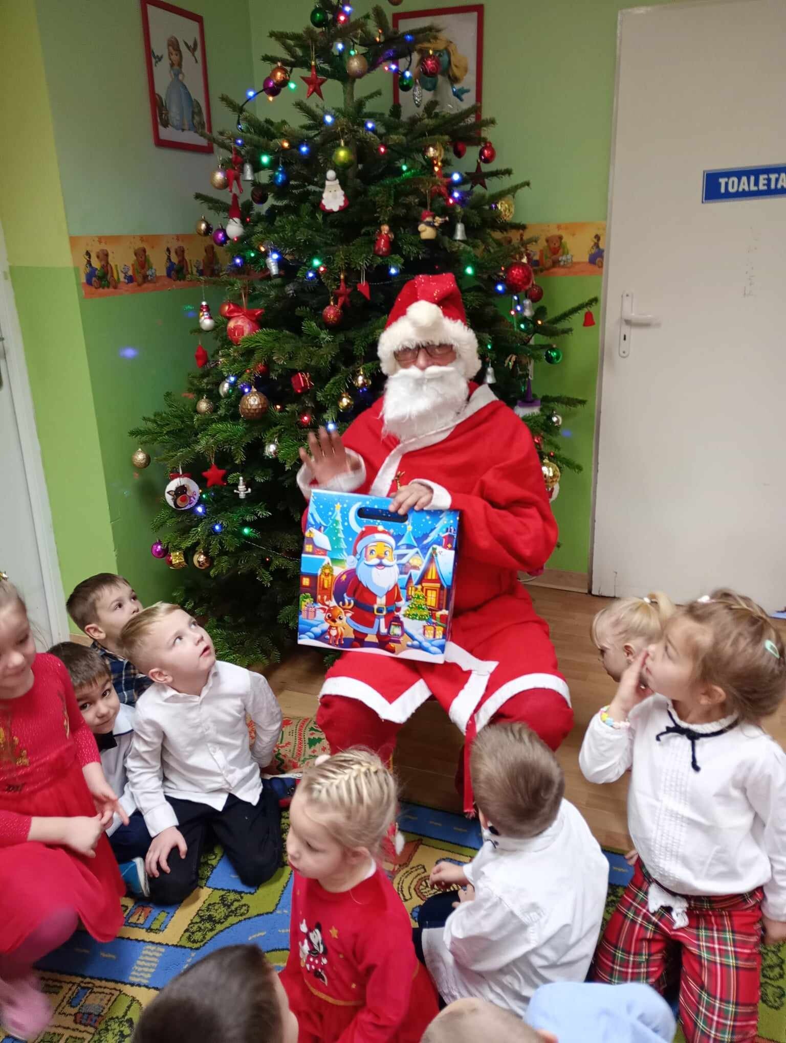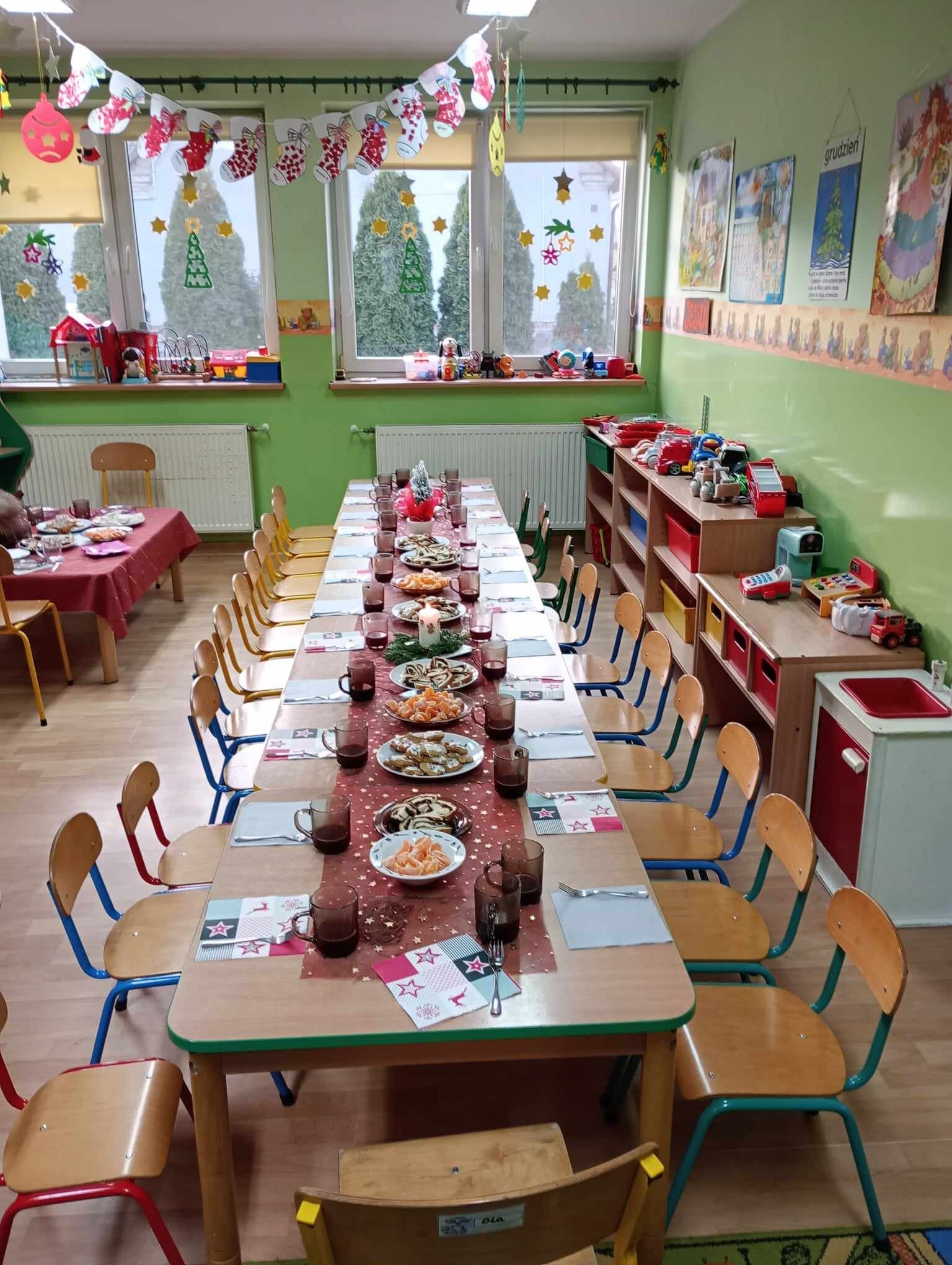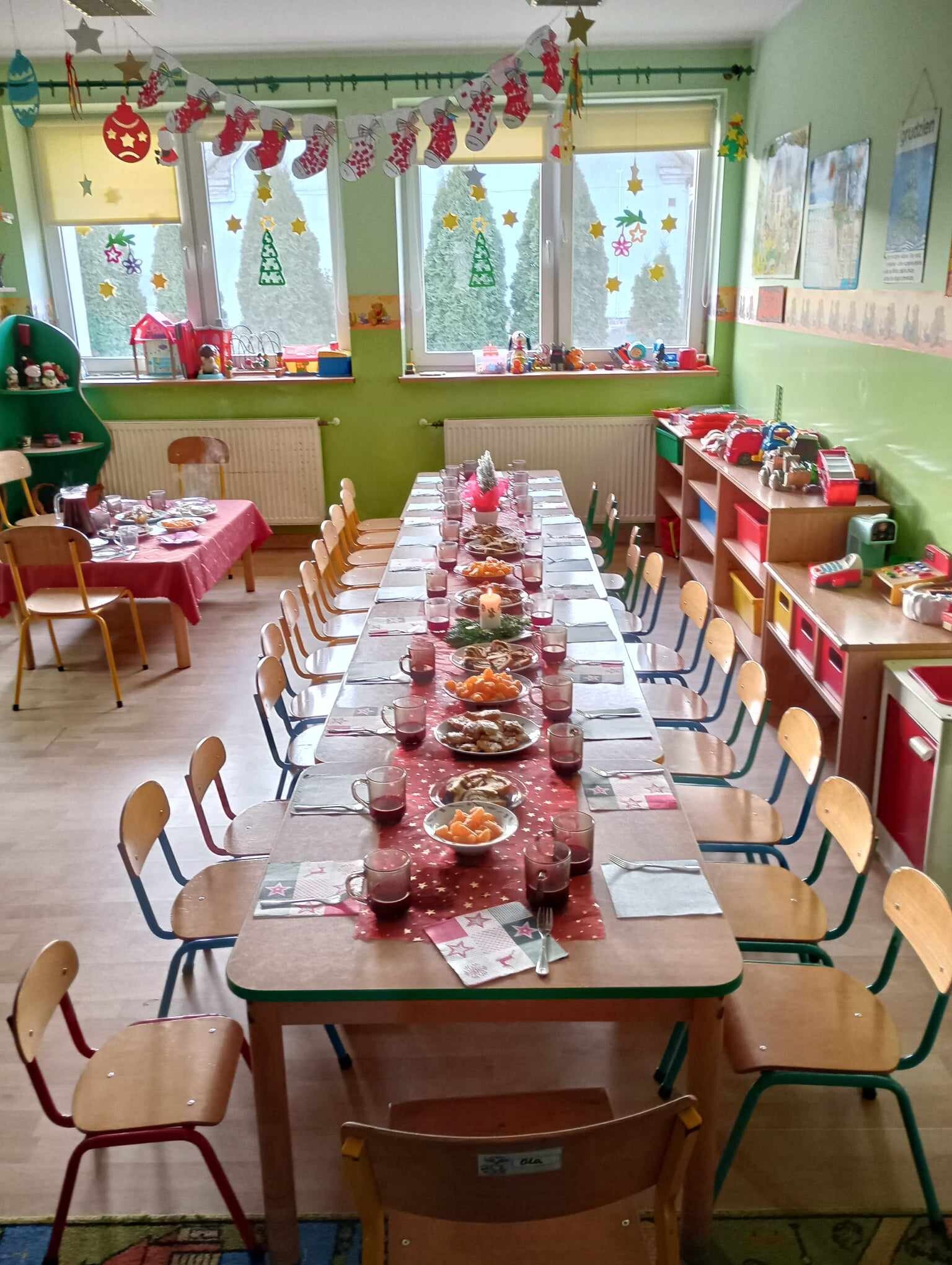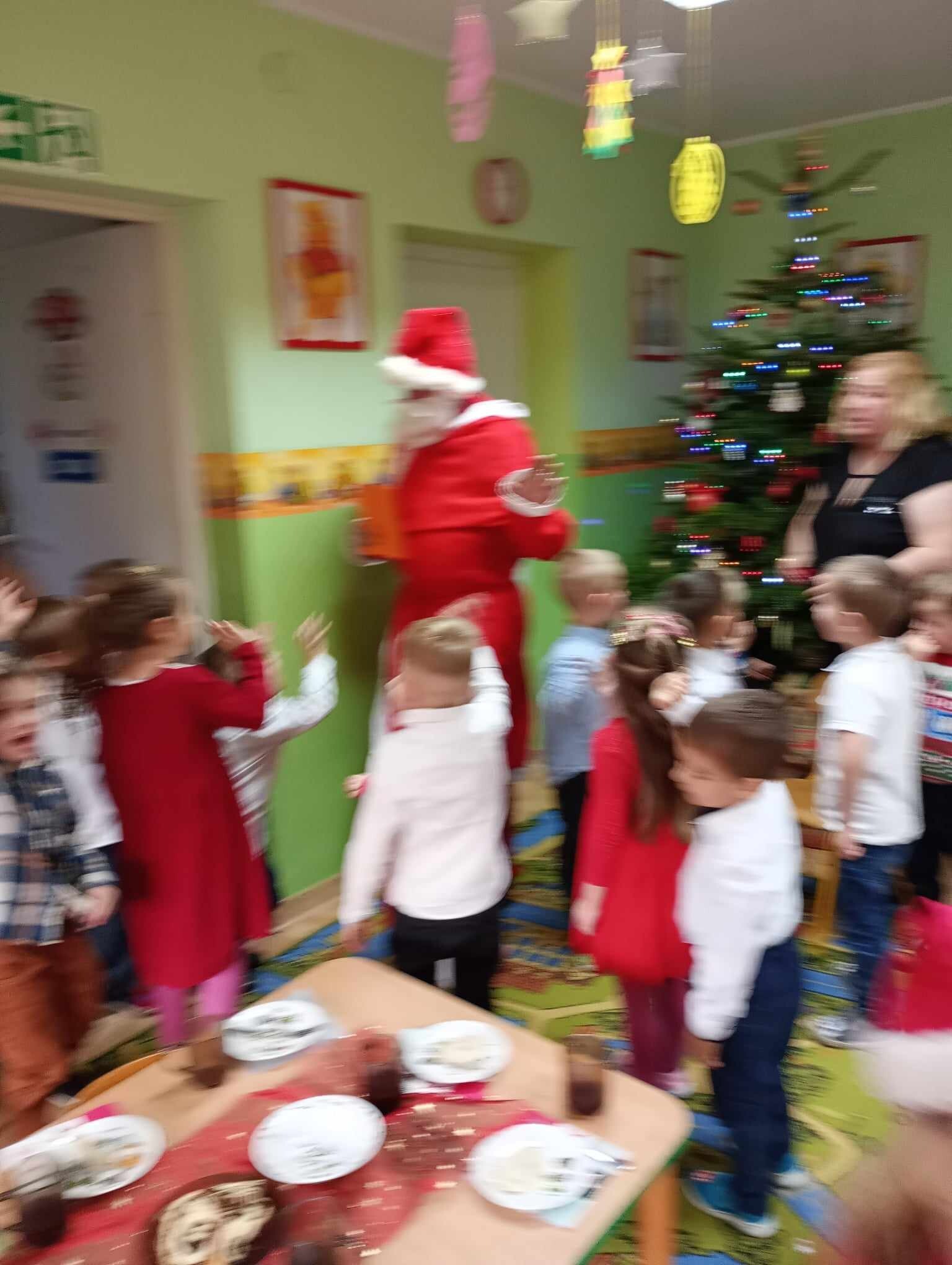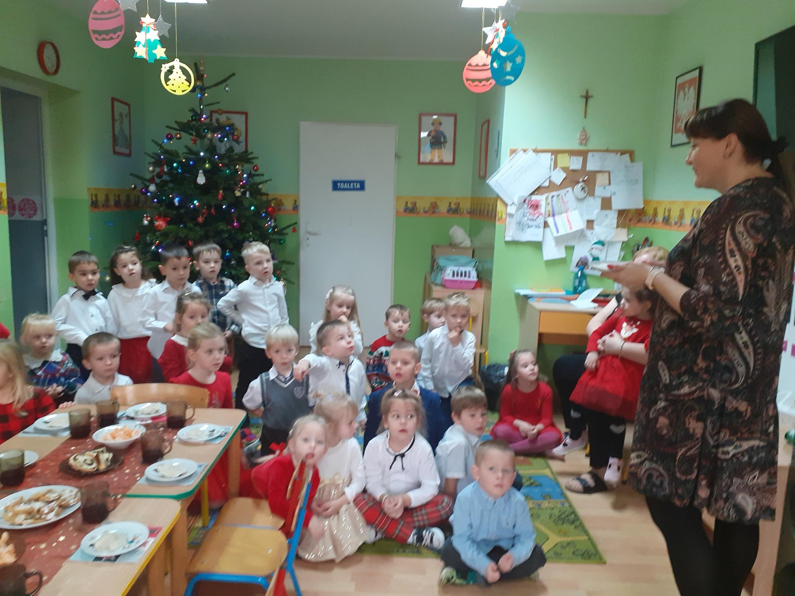 Dzisiaj w przedszkolu odbyła się uroczysta Wigilia. Na stole pojawił się opłatek, barszcz, pierogi, makowiec, pierniczki oraz pachnące mandarynki. Tradycyjnie pod obrusem znalazło się sianko a na stole dodatkowe nakrycie dla gościa. Po złożeniu świątecznych życzeń dzieci zaśpiewały znane kolędy. Odwiedziła nas Pani dyrektor Alicja Guźniczak, którą dzieci zaprosiły do celebrowania Wigilii. Po uroczystym posiłku przedszkolaki powitały gościa z workiem prezentów. Tym gościem okazał się Mikołaj.