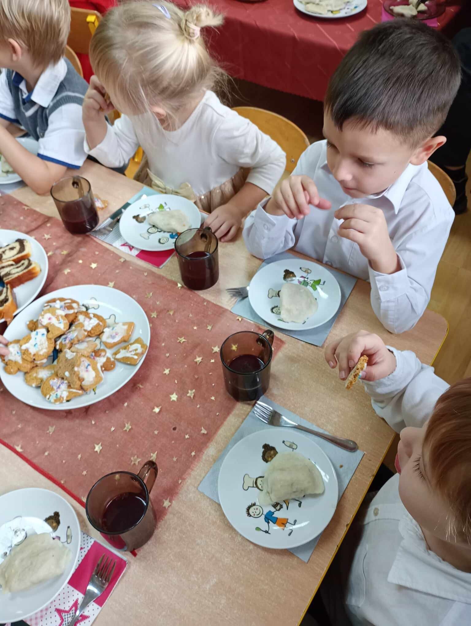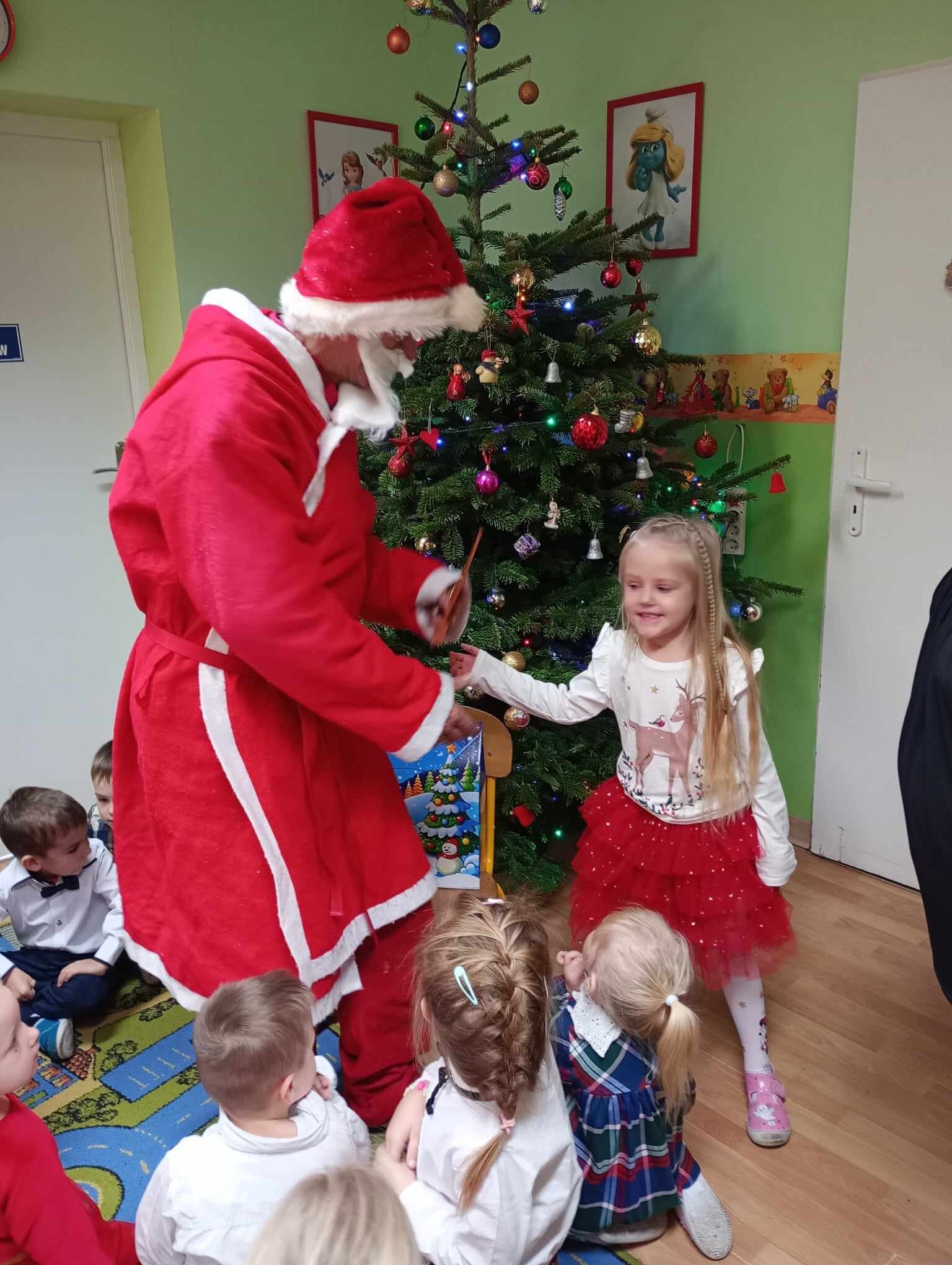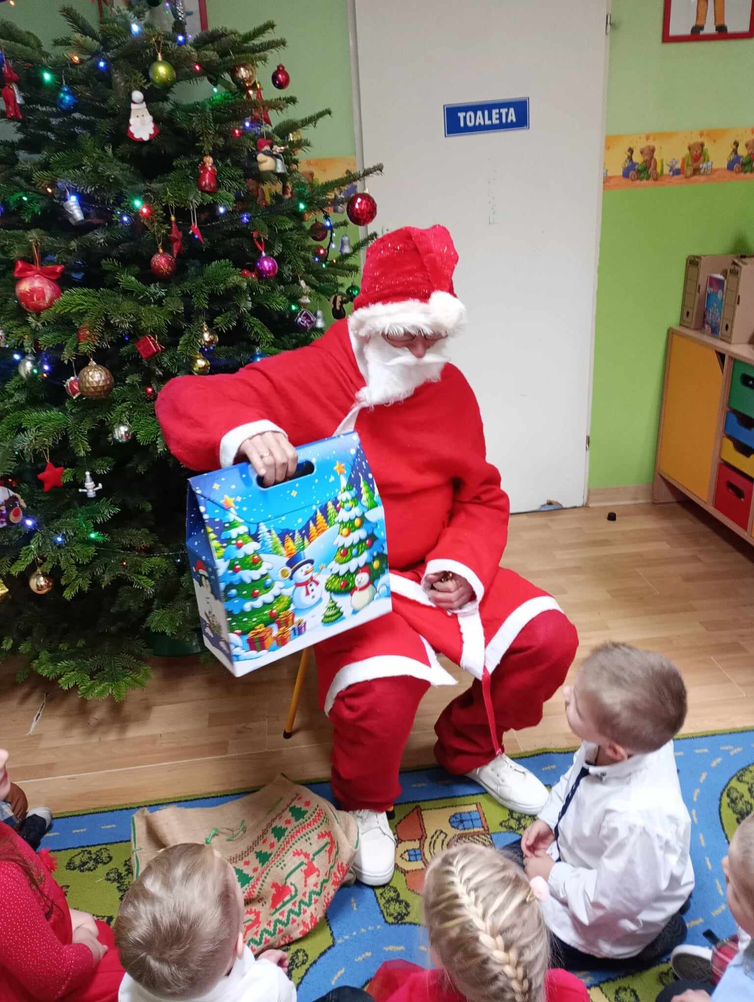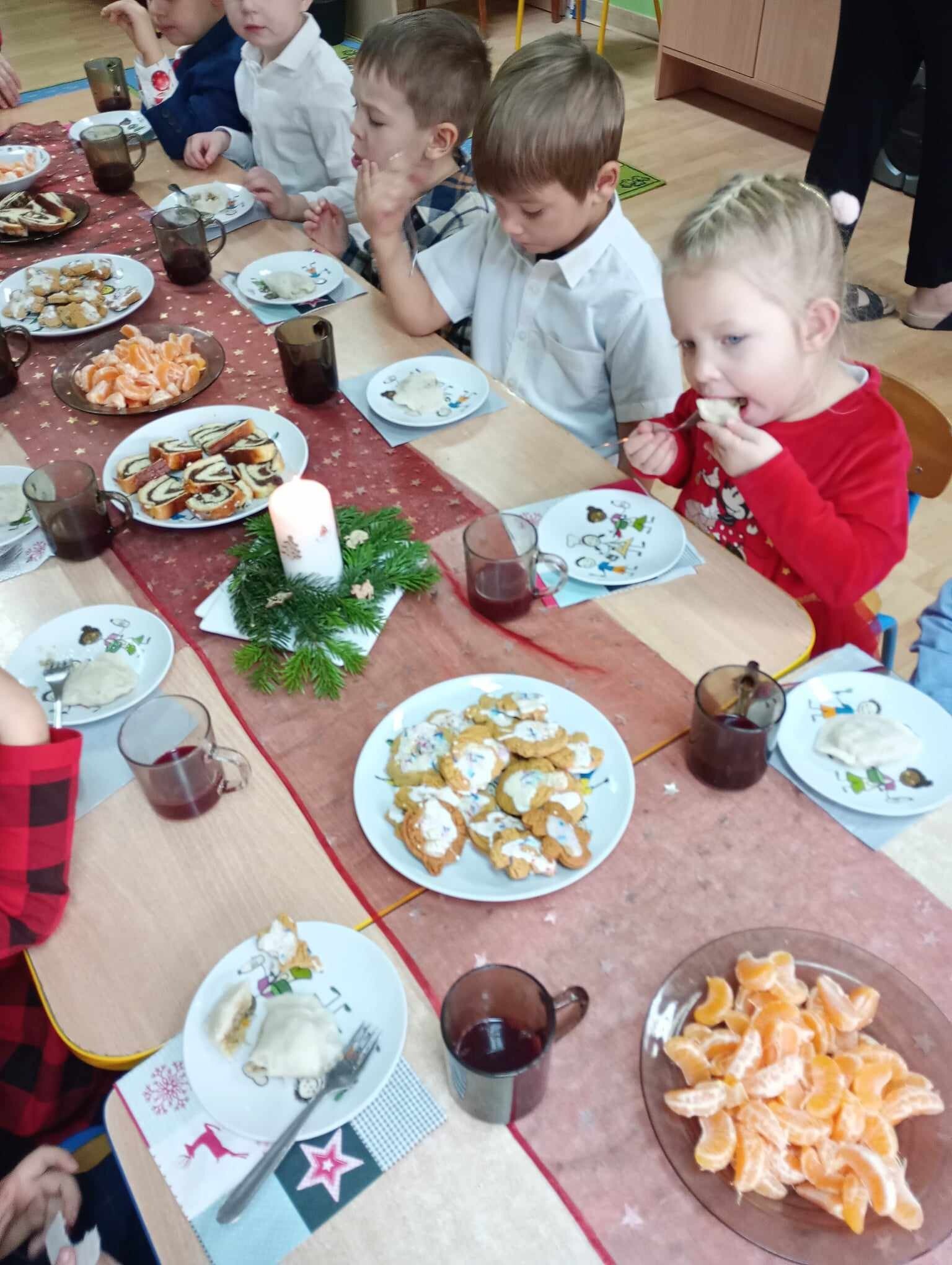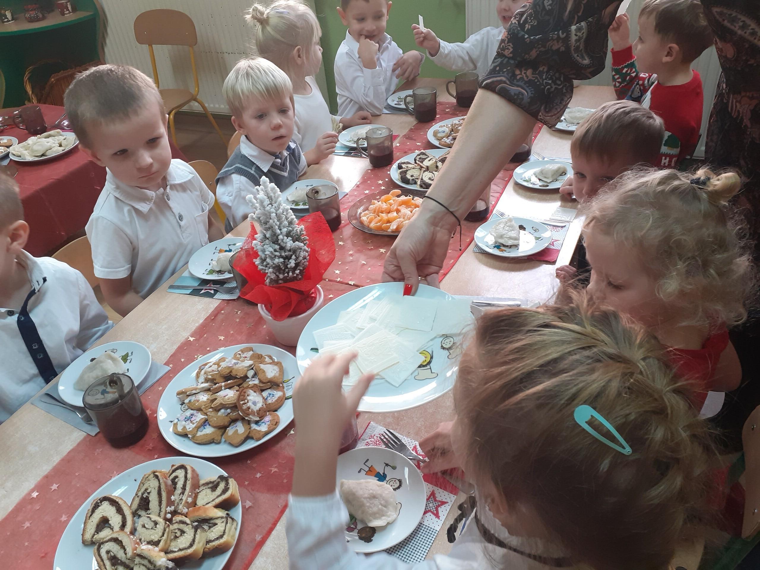 Dzisiaj w przedszkolu odbyła się uroczysta Wigilia. Na stole pojawił się opłatek, barszcz, pierogi, makowiec, pierniczki oraz pachnące mandarynki. Tradycyjnie pod obrusem znalazło się sianko a na stole dodatkowe nakrycie dla gościa. Po złożeniu świątecznych życzeń dzieci zaśpiewały znane kolędy. Odwiedziła nas Pani dyrektor Alicja Guźniczak, którą dzieci zaprosiły do celebrowania Wigilii. Po uroczystym posiłku przedszkolaki powitały gościa z workiem prezentów. Tym gościem okazał się Mikołaj.