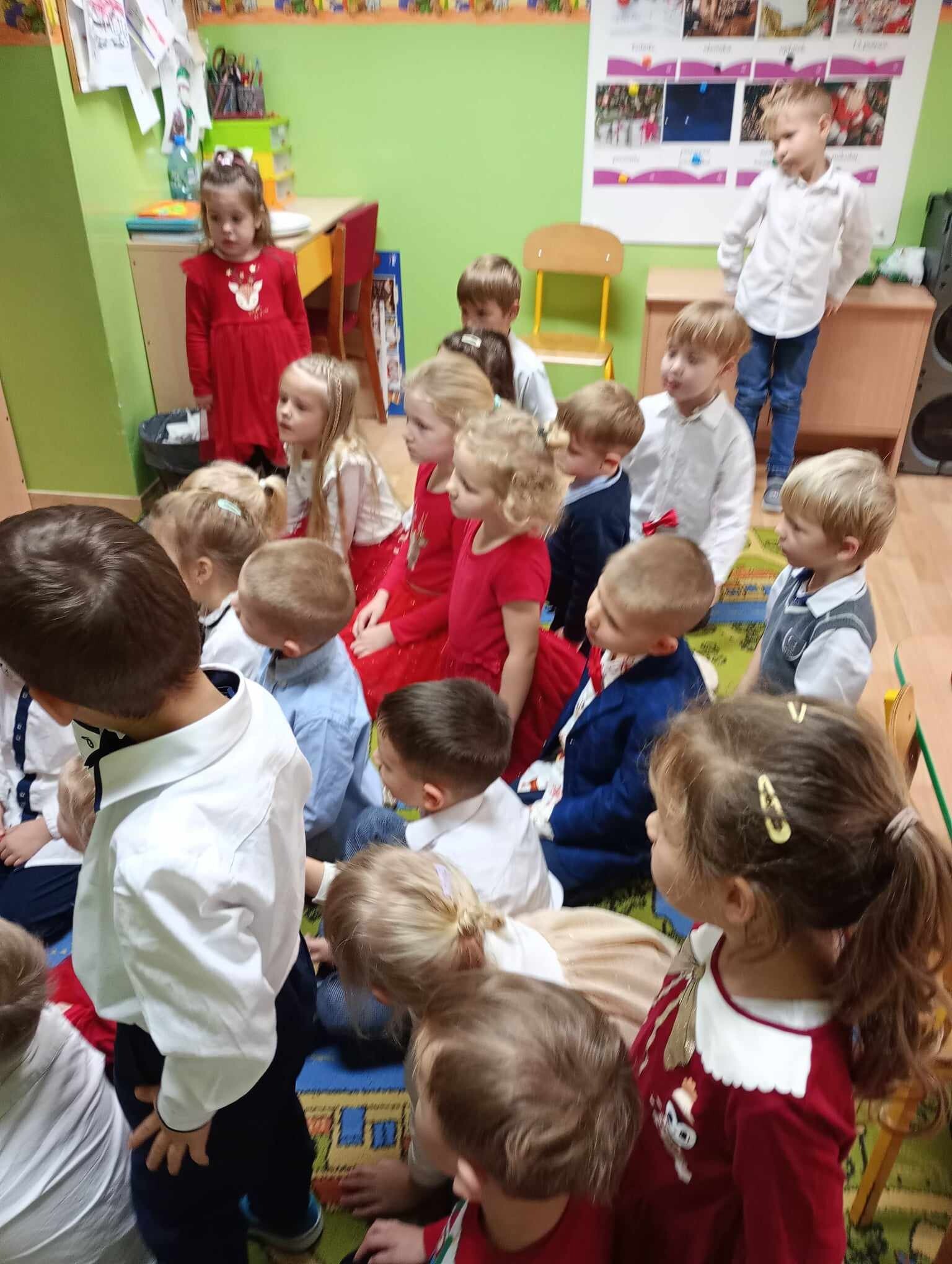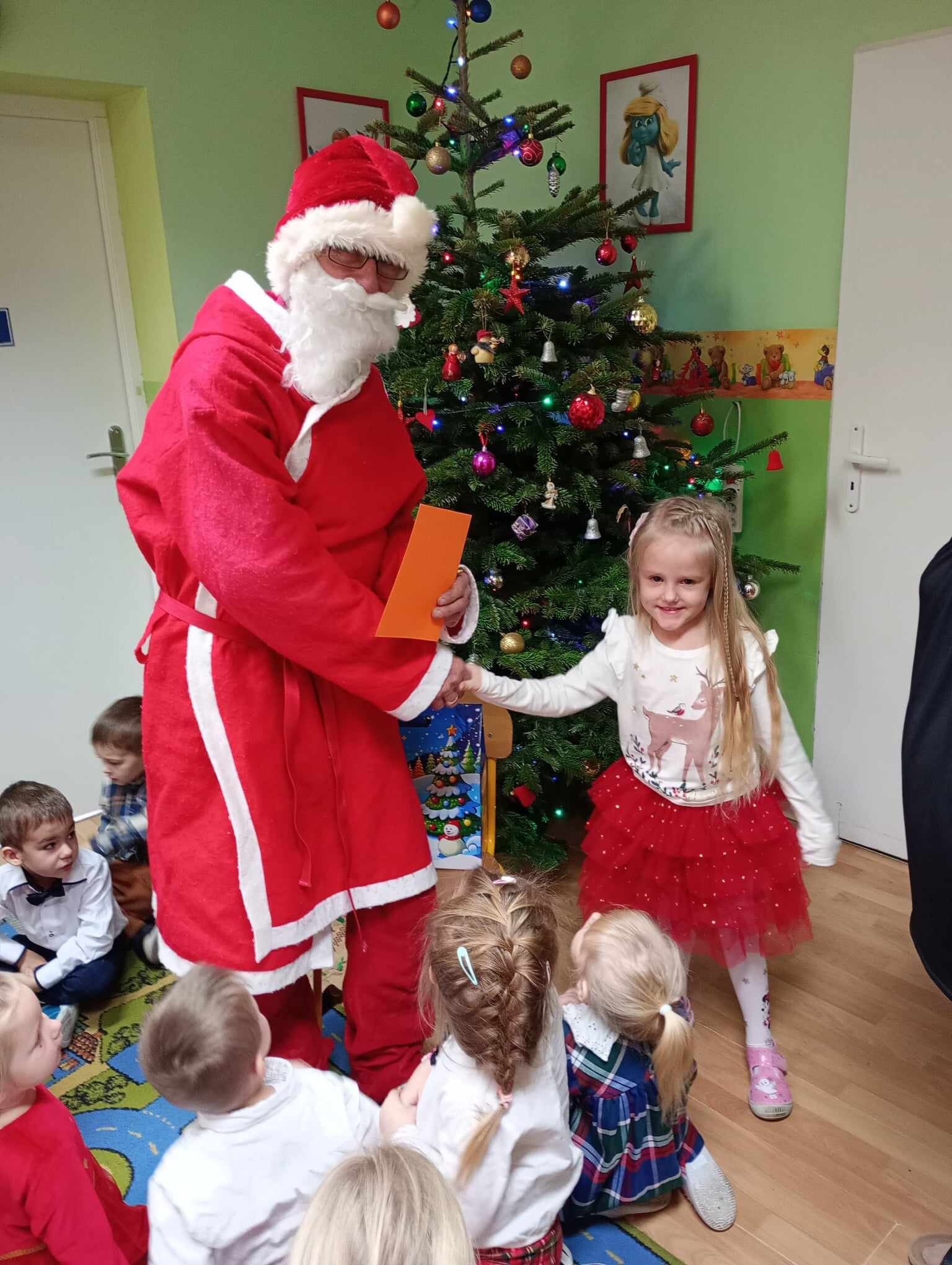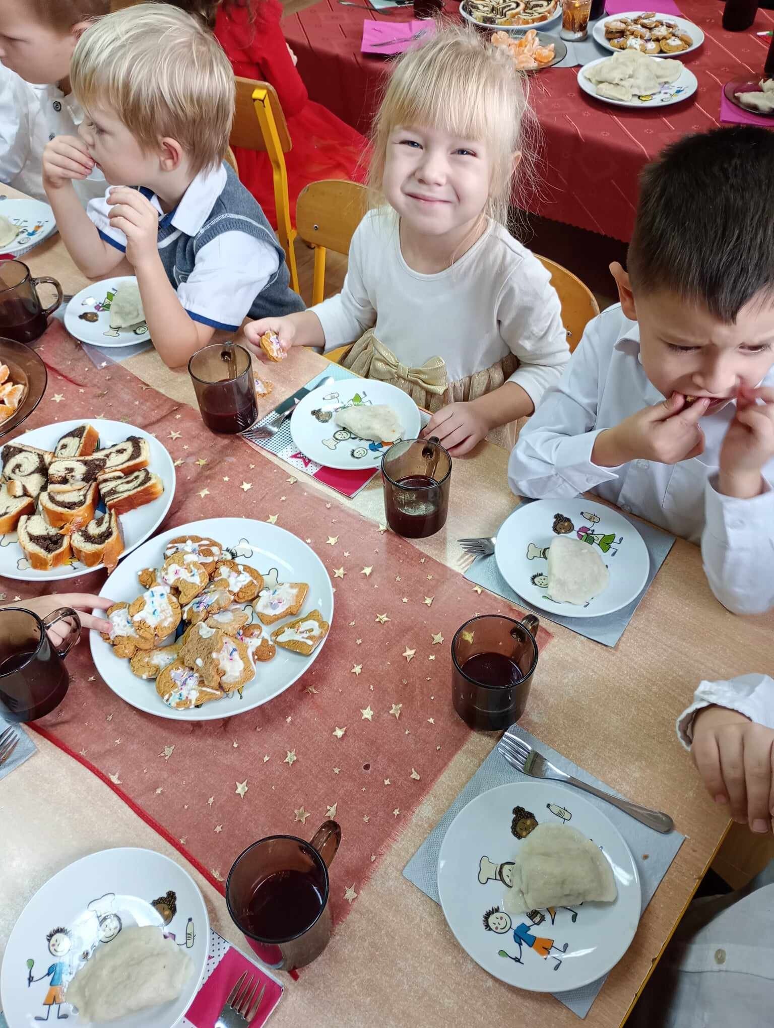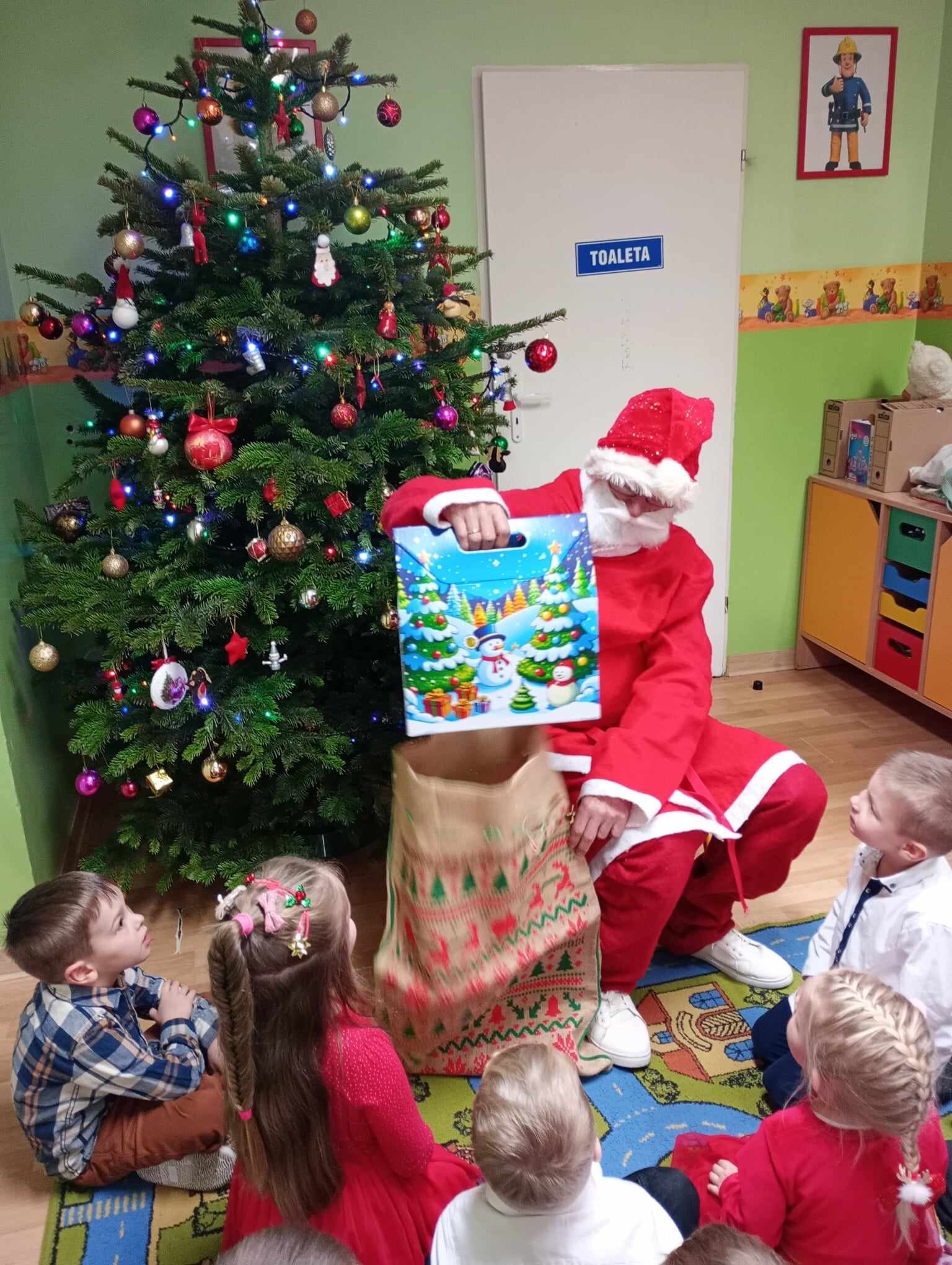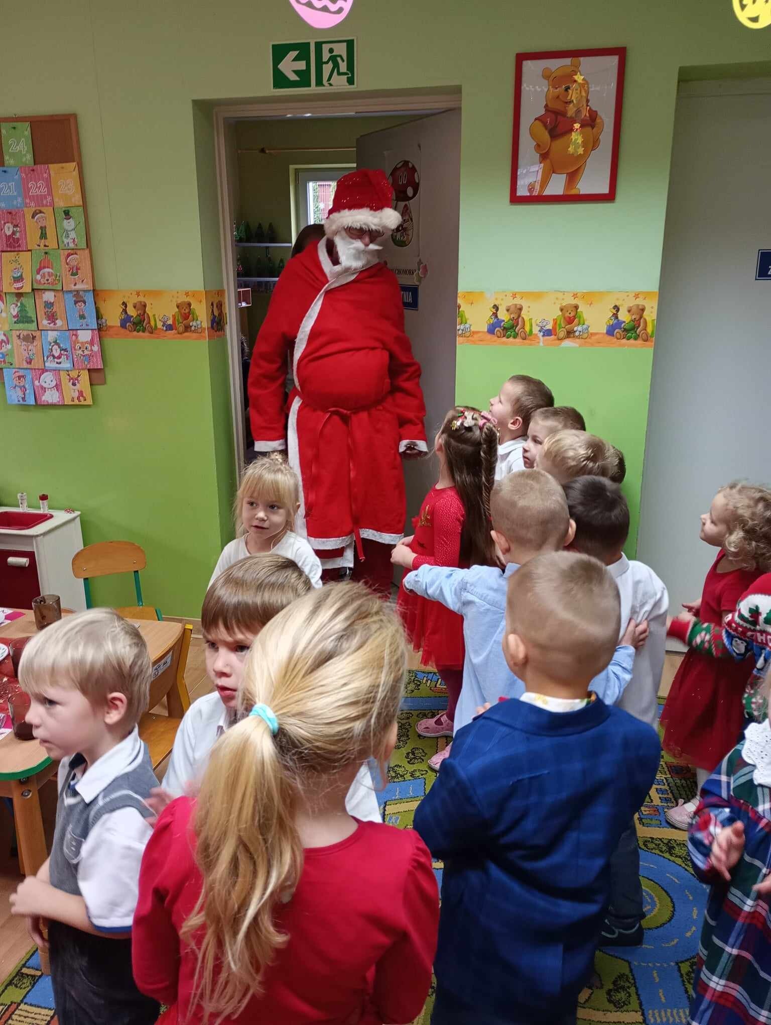 Dzisiaj w przedszkolu odbyła się uroczysta Wigilia. Na stole pojawił się opłatek, barszcz, pierogi, makowiec, pierniczki oraz pachnące mandarynki. Tradycyjnie pod obrusem znalazło się sianko a na stole dodatkowe nakrycie dla gościa. Po złożeniu świątecznych życzeń dzieci zaśpiewały znane kolędy. Odwiedziła nas Pani dyrektor Alicja Guźniczak, którą dzieci zaprosiły do celebrowania Wigilii. Po uroczystym posiłku przedszkolaki powitały gościa z workiem prezentów. Tym gościem okazał się Mikołaj.