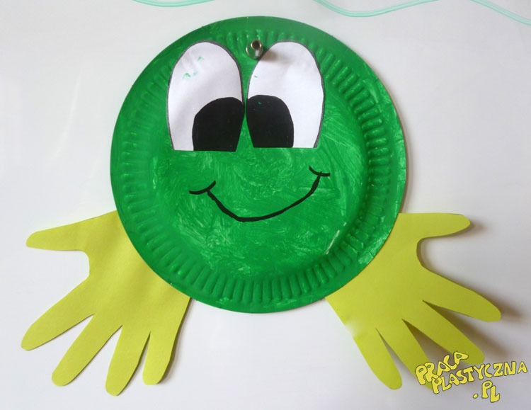 Do tej pracy potrzebujemy papierowy talerzyk. Trzeba go wymalować zieloną farbą. Odłożyć na chwilkę aby wyschła. W tym czasie dziecko odrysowuje swoje dłonie i wycina. Przyklejamy nasze dłonie na dole talerzyka. Oczy można wykleić bądź domalować flamastrem.