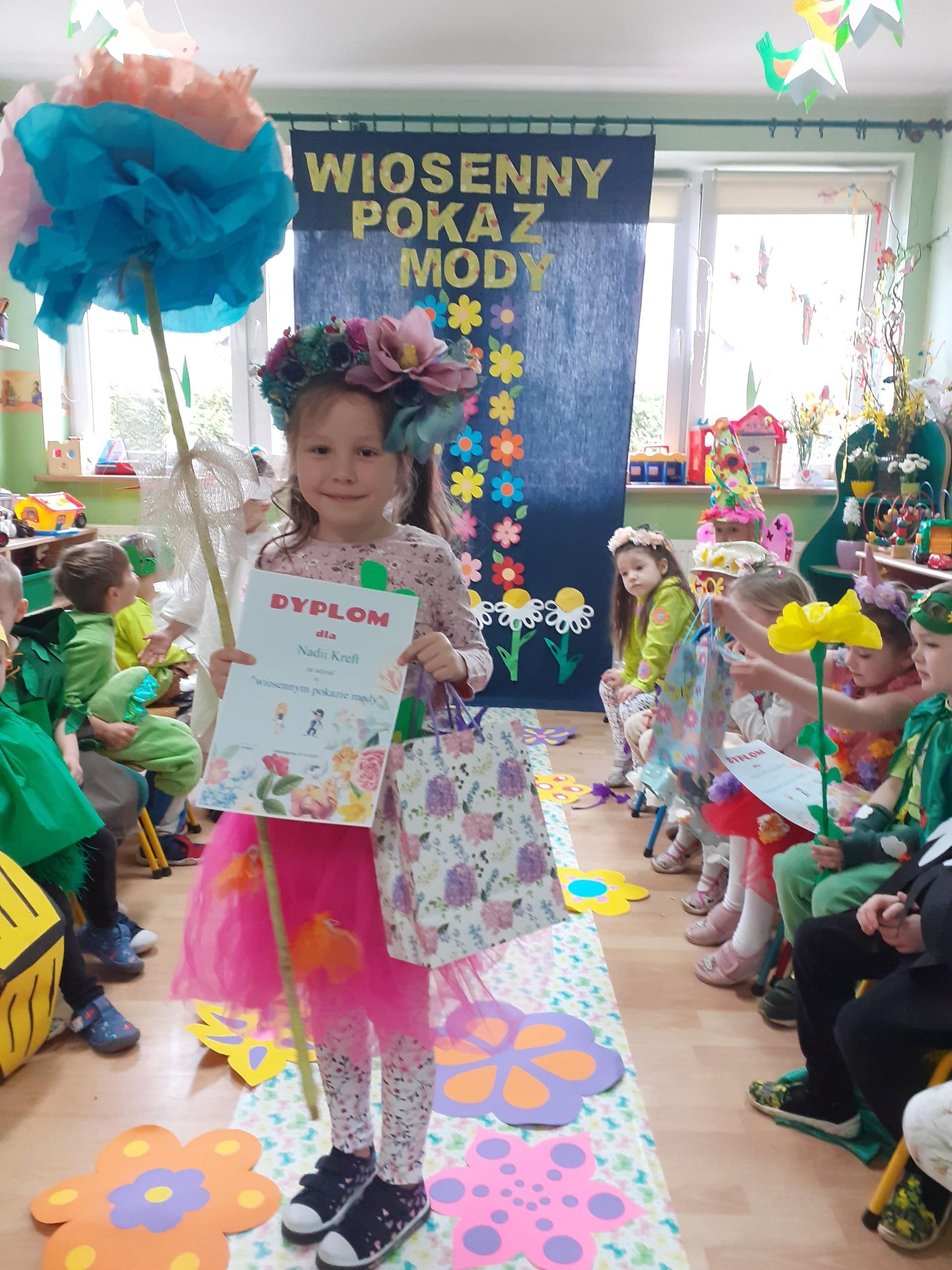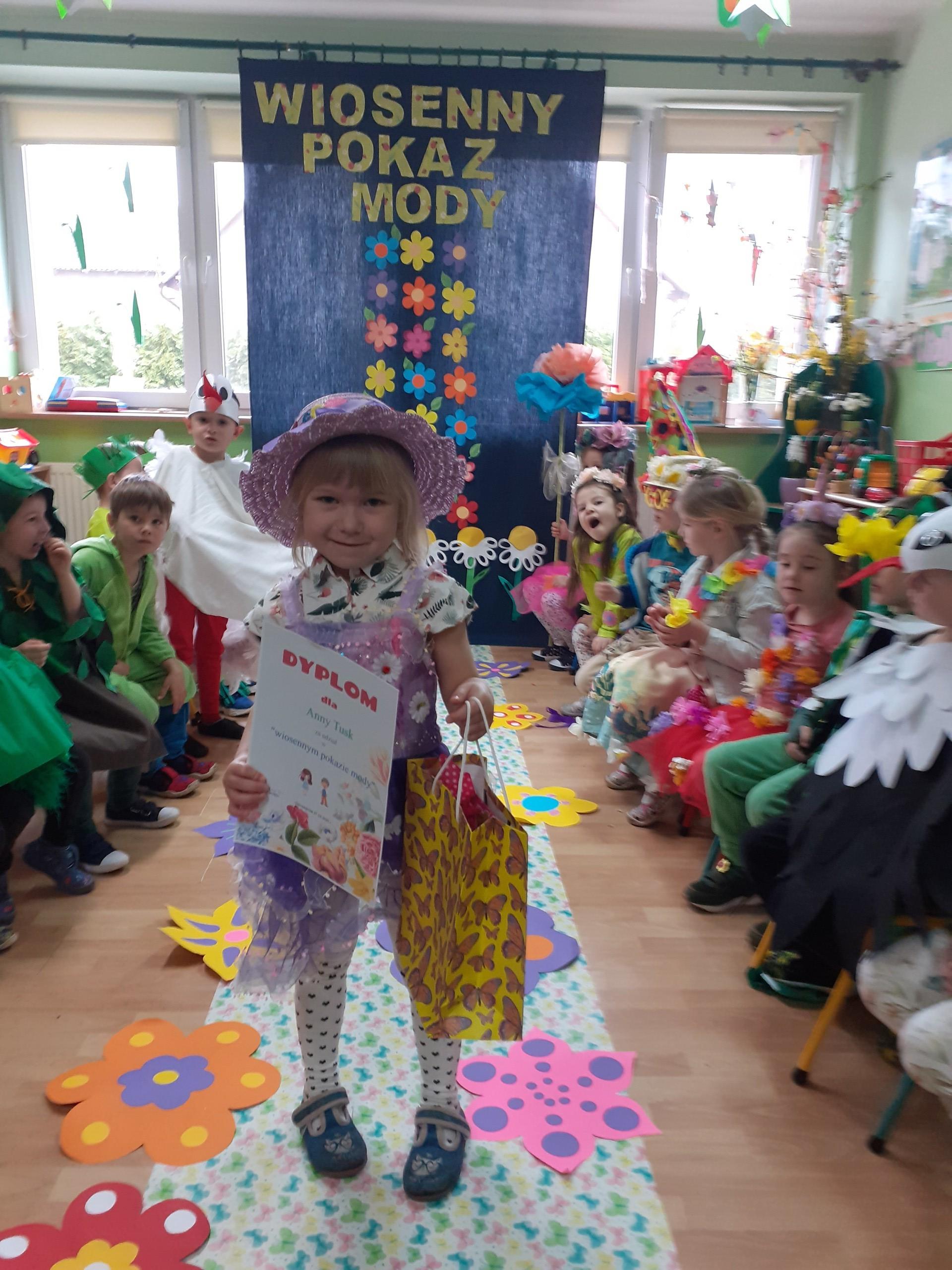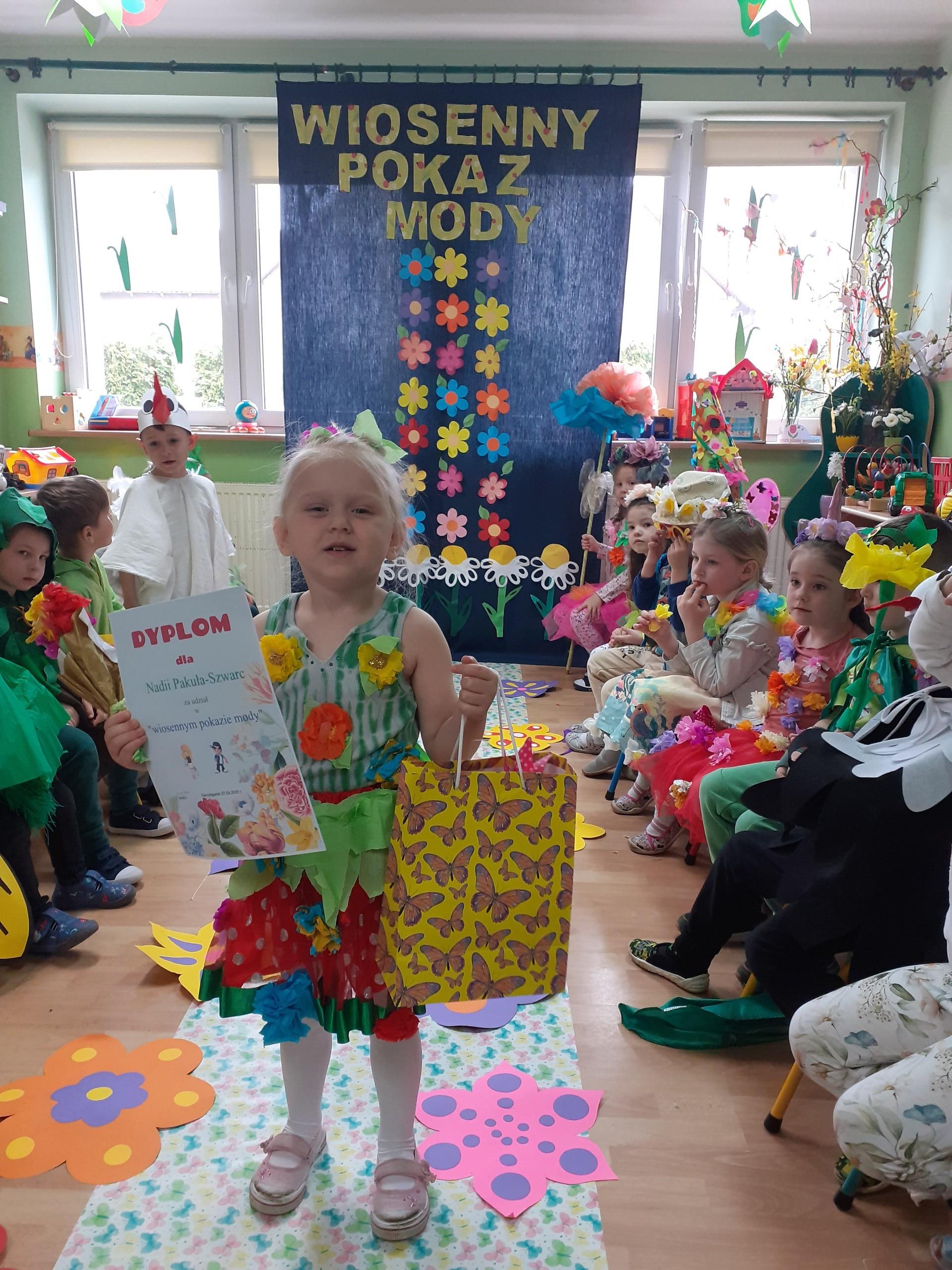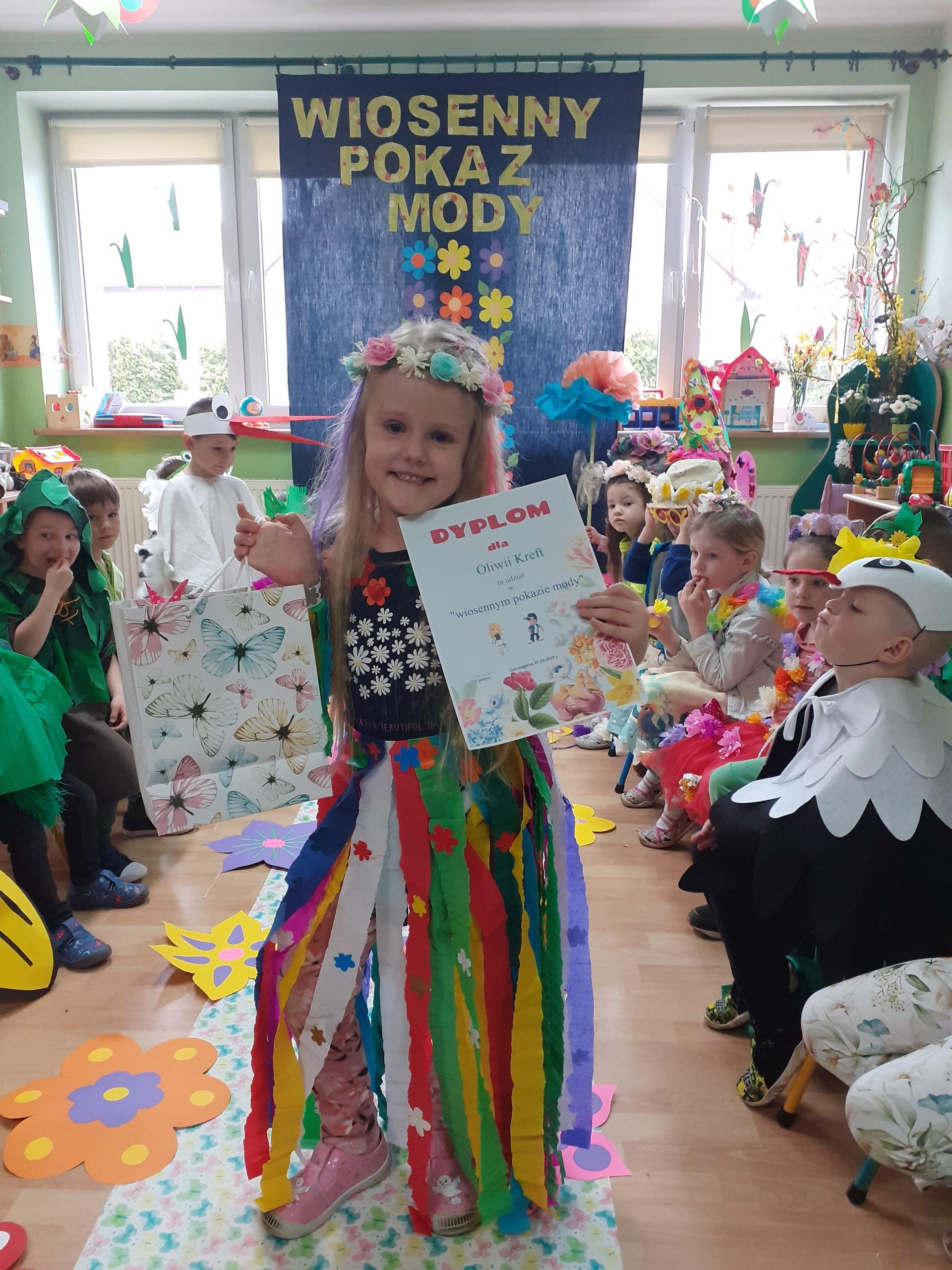 W tym dniu w przedszkolu zagościła prawdziwa Wiosna. Wszystkie przedszkolaki przybyły do przedszkola w wyjątkowych strojach, aby zaprezentować się na specjalnym wybiegu. Nie zawiodła pomysłowość Dzieci i Rodziców. Kreacje przygotowano według własnych pomysłów, wykonano je z wszelkich dostępnych materiałów: różnorodnych tkanin, bibuły, wstążek, kwiatów. Wszystkie były wyjątkowe, a przede wszystkim kolorowe i oryginalne.