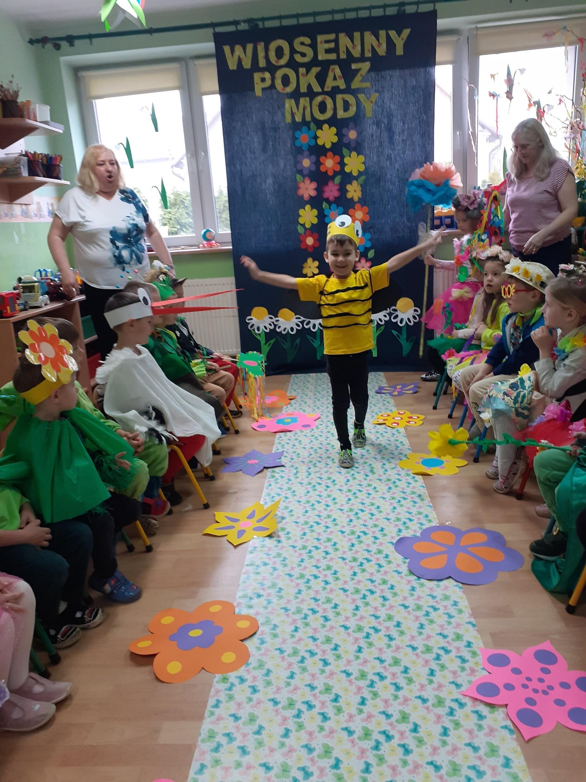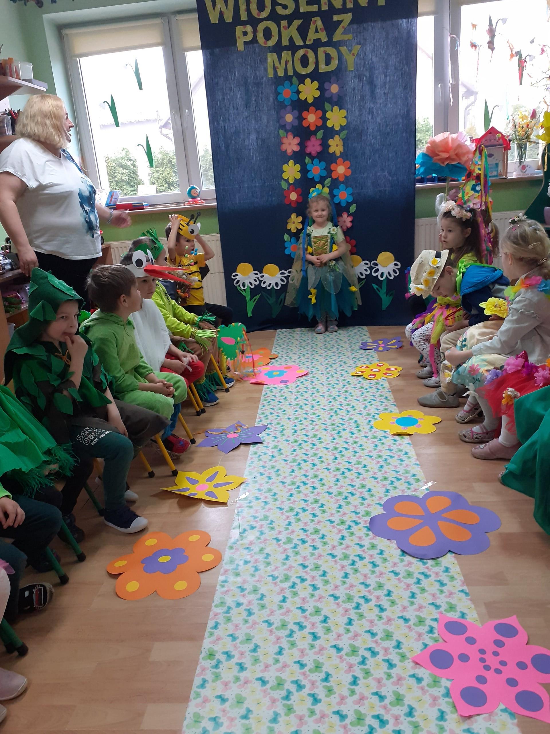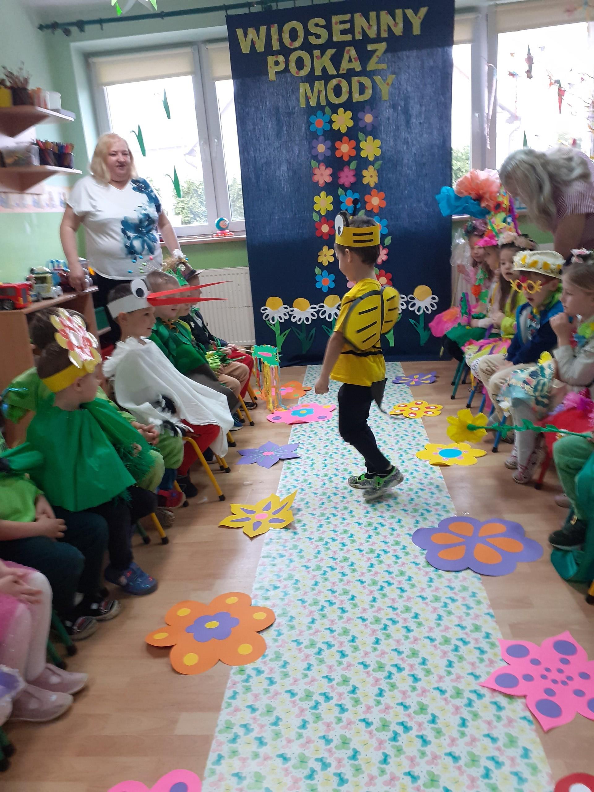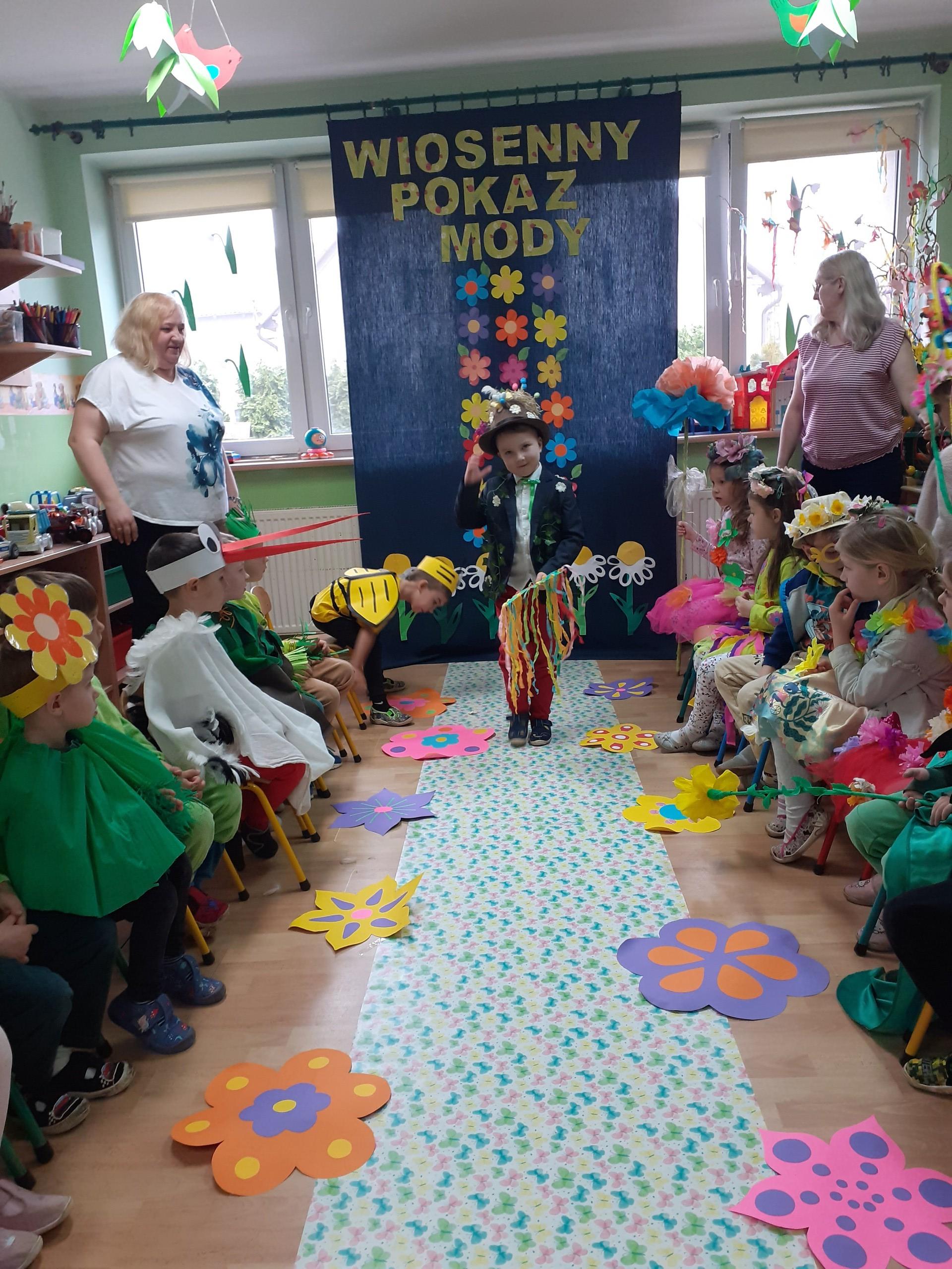 Po wybiegu spacerowały bociany, żabki, pszczółki, wiosenna trawa, nie zabrakło Pani Wiosny, Pana Wiosny, Wiosennych Dam i Dżentelmenów, Dzieci - Kwiatów, Dzieci – Drzew oraz innych cudownych wiosennych postaci. Wszyscy bawili się wspaniale, a dzieci za zaprezentowanie kreacji na wiosennym dywanie otrzymały nagrody i dyplomy.