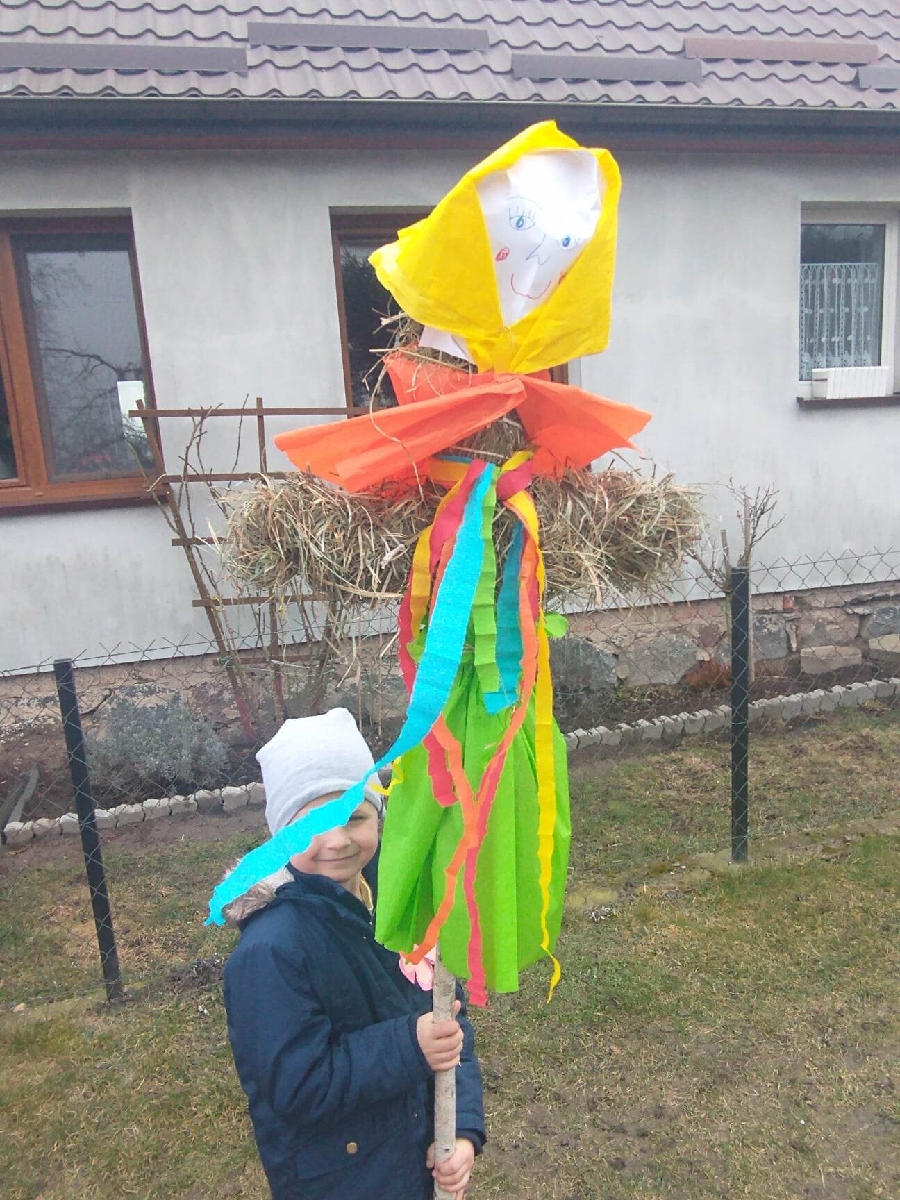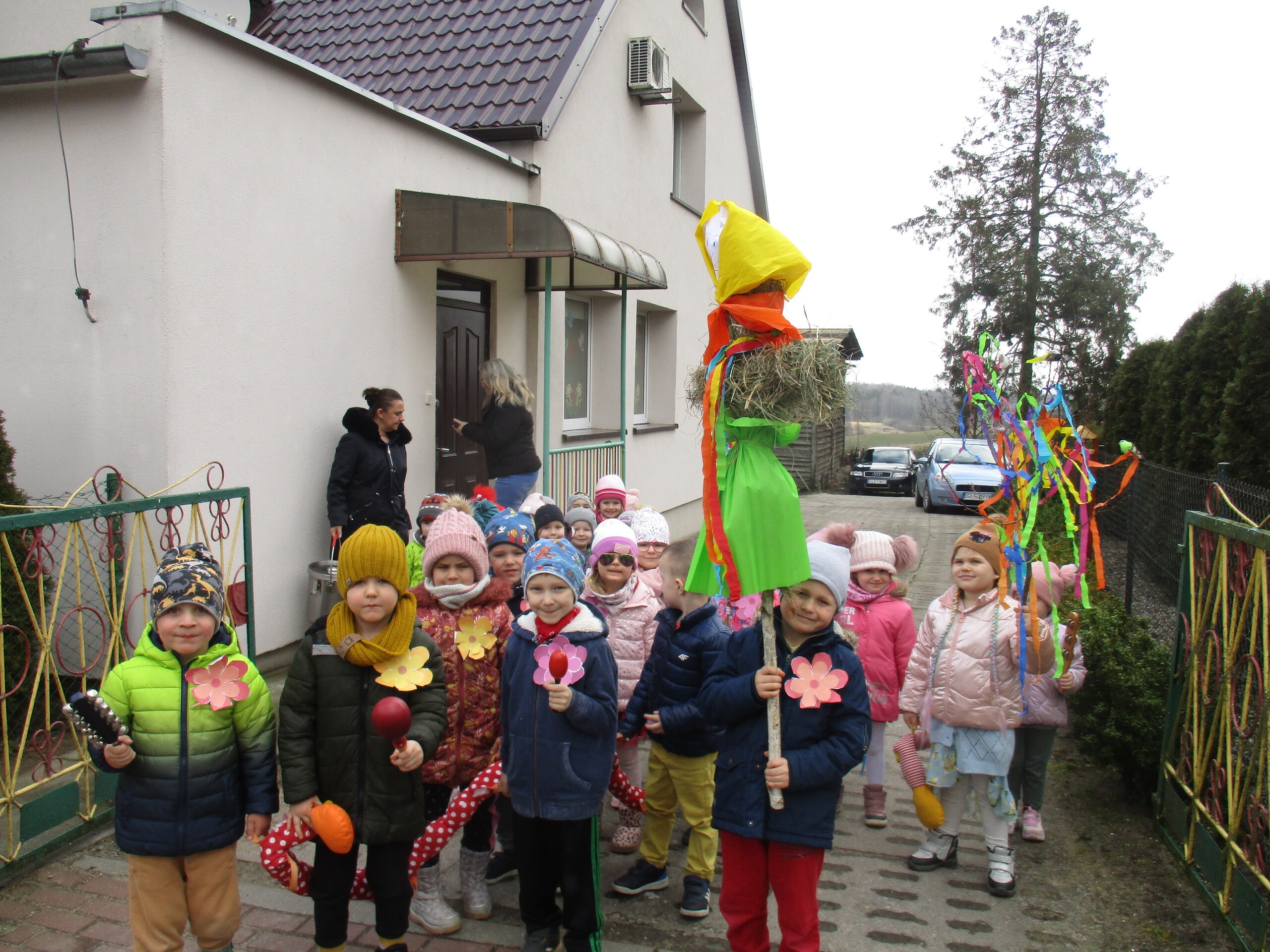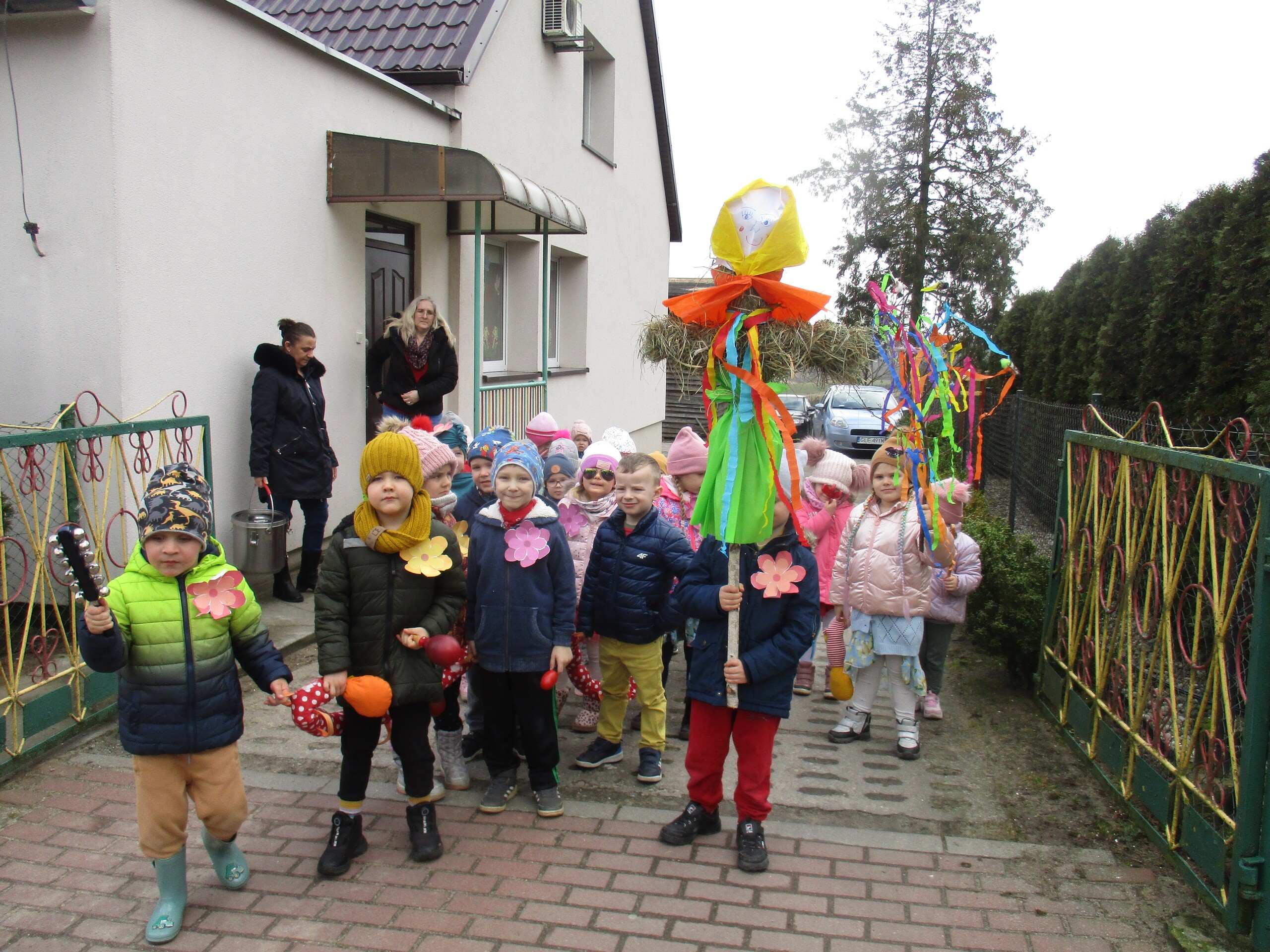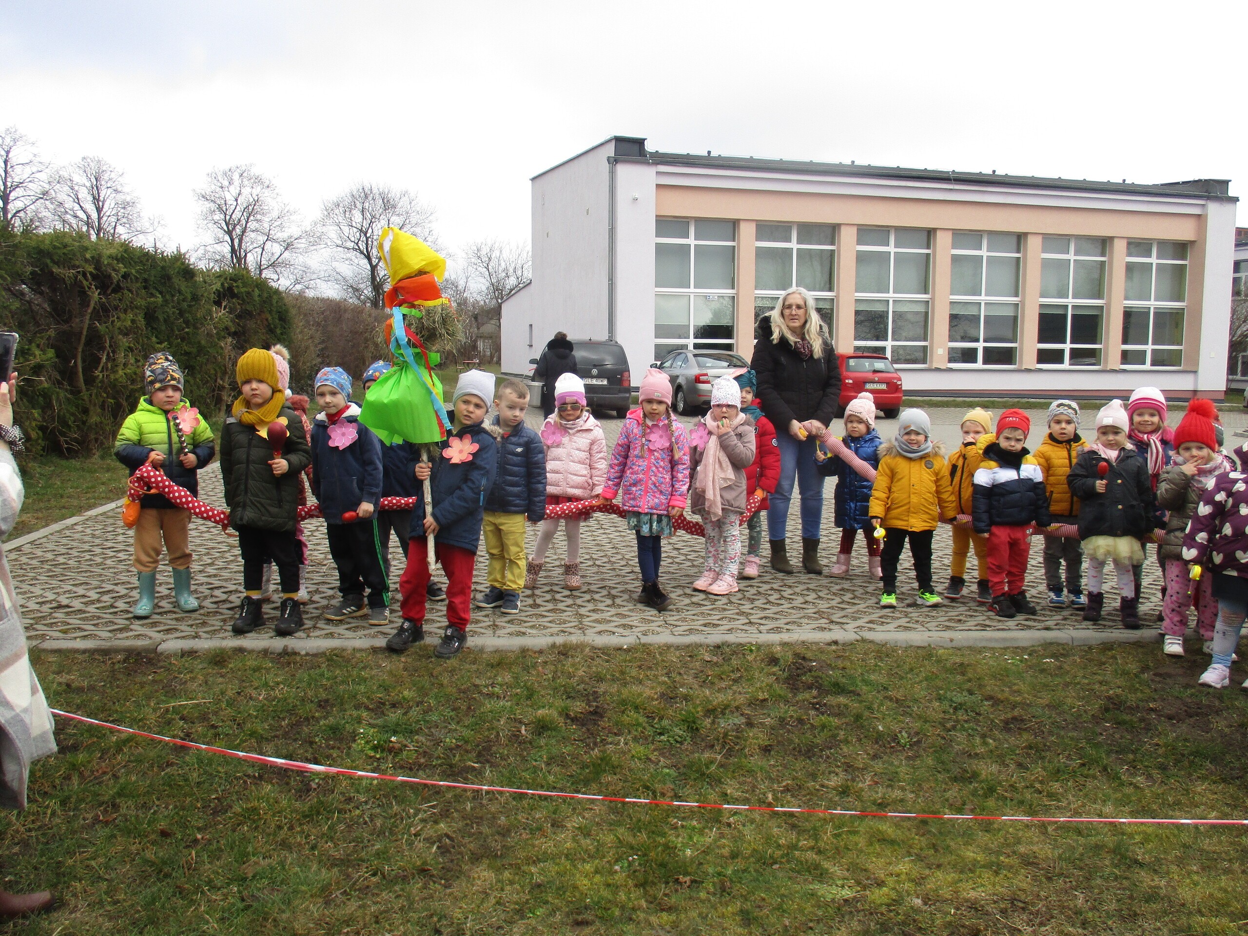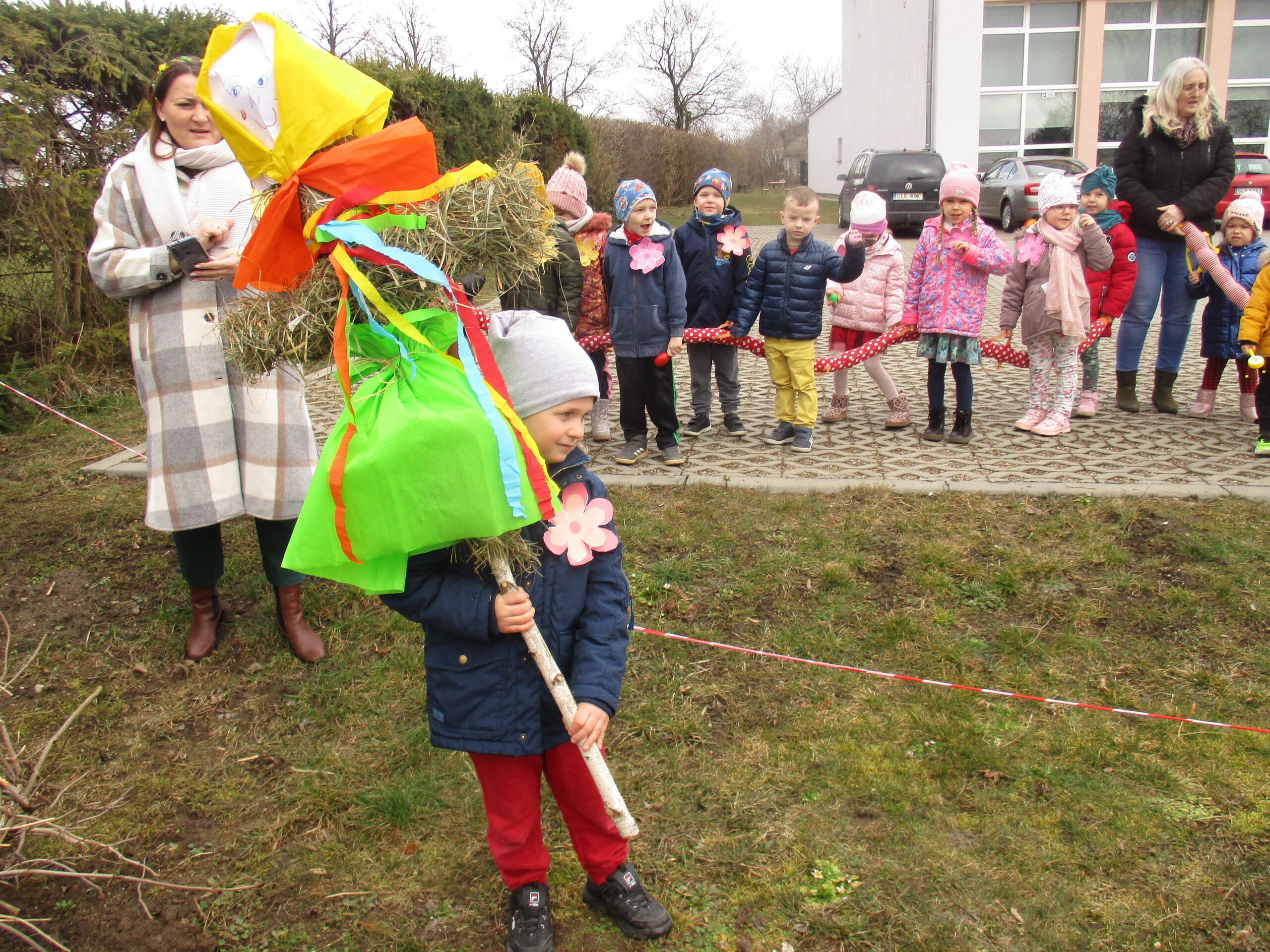 Dzisiaj wszystkie przedszkolaki żegnały Zimę i witały Wiosnę. Dzieci przyszły do przedszkola w ubranich w kolorach wiosennych. Młodsza grupa tańczyła przy piosence "Wiosna w błękitnej sukience", rozmawiała o tradycji związanej z paleniem Marzanny oraz strojeniem gaika, pokolorowała obrazek przedstawiający Panią Wiosnę. Starsza grupa wykonała Marzannę. Wszystkie dzieci ruszyły razem z Marzanną i Gaikiem na boisko szkolne. Tak Kajetan w imieniu wszystkich dzieci w ognisku spalił zimową pannę. Następnie dzieci z instrumentami poszły na spacer szukać Wiosny. Jaśmina szła na czele wiosennego pochodu i niosła Gaik - oznakę Wiosny.