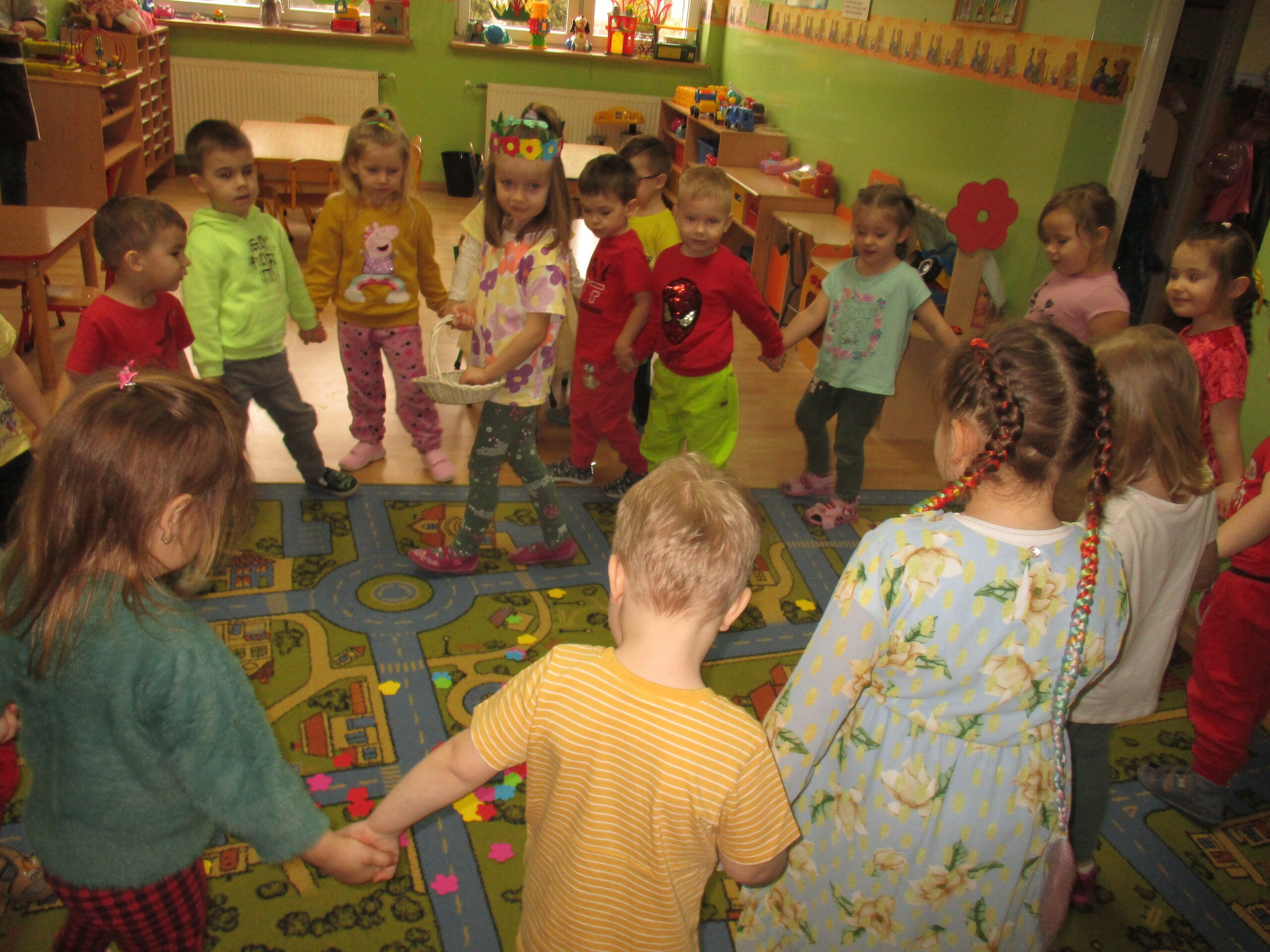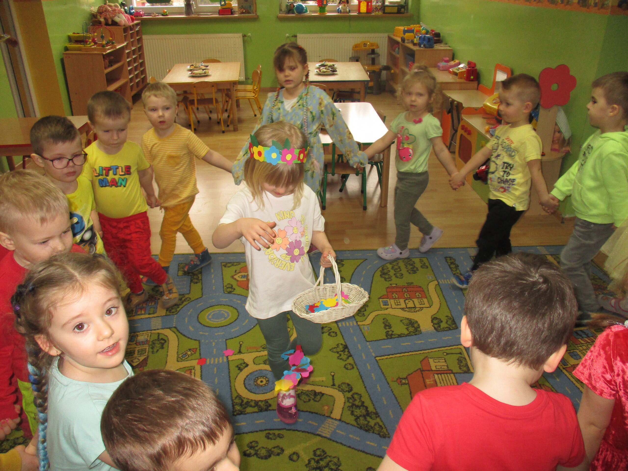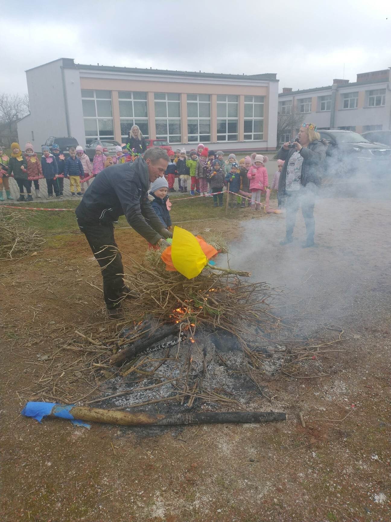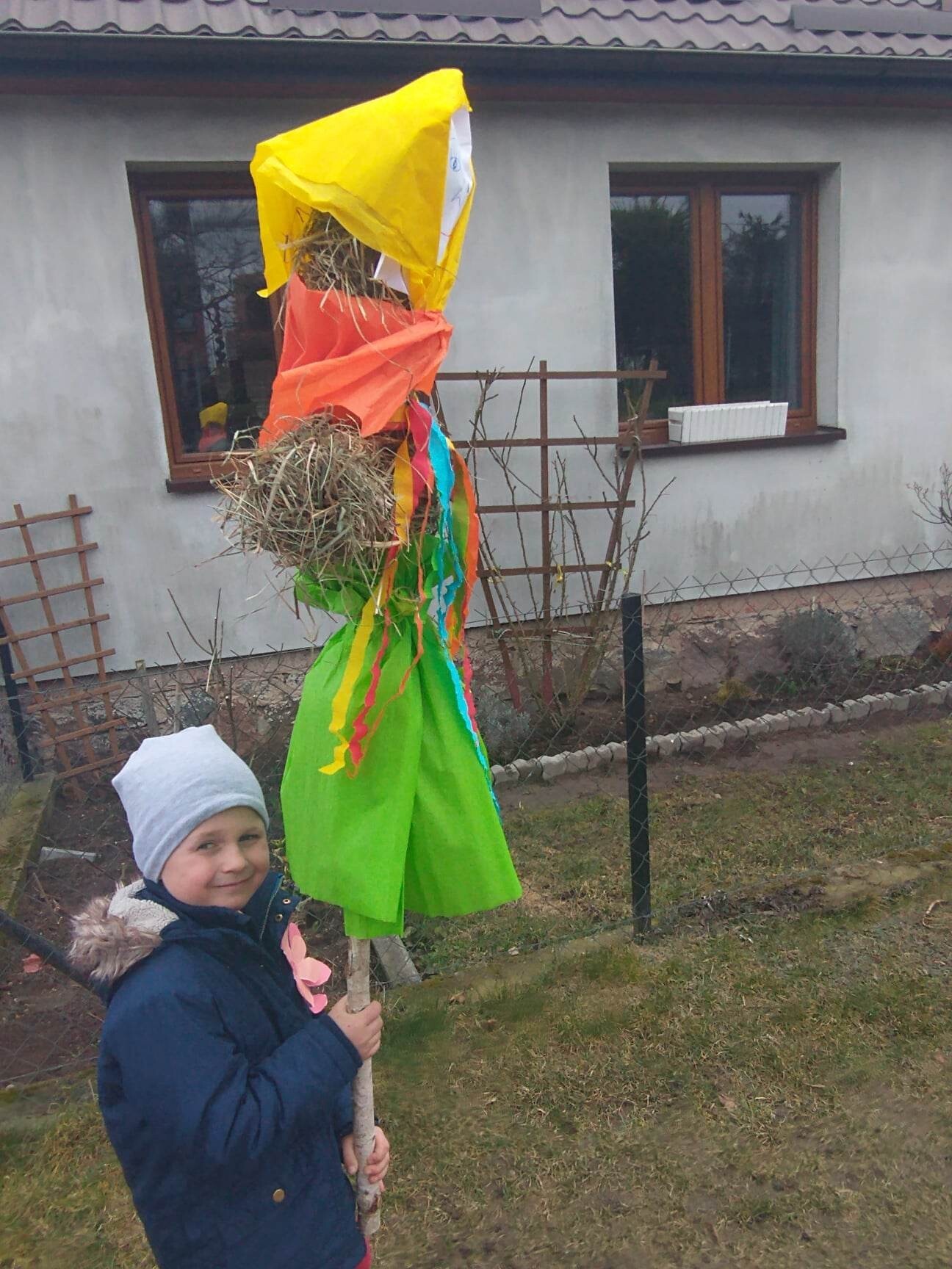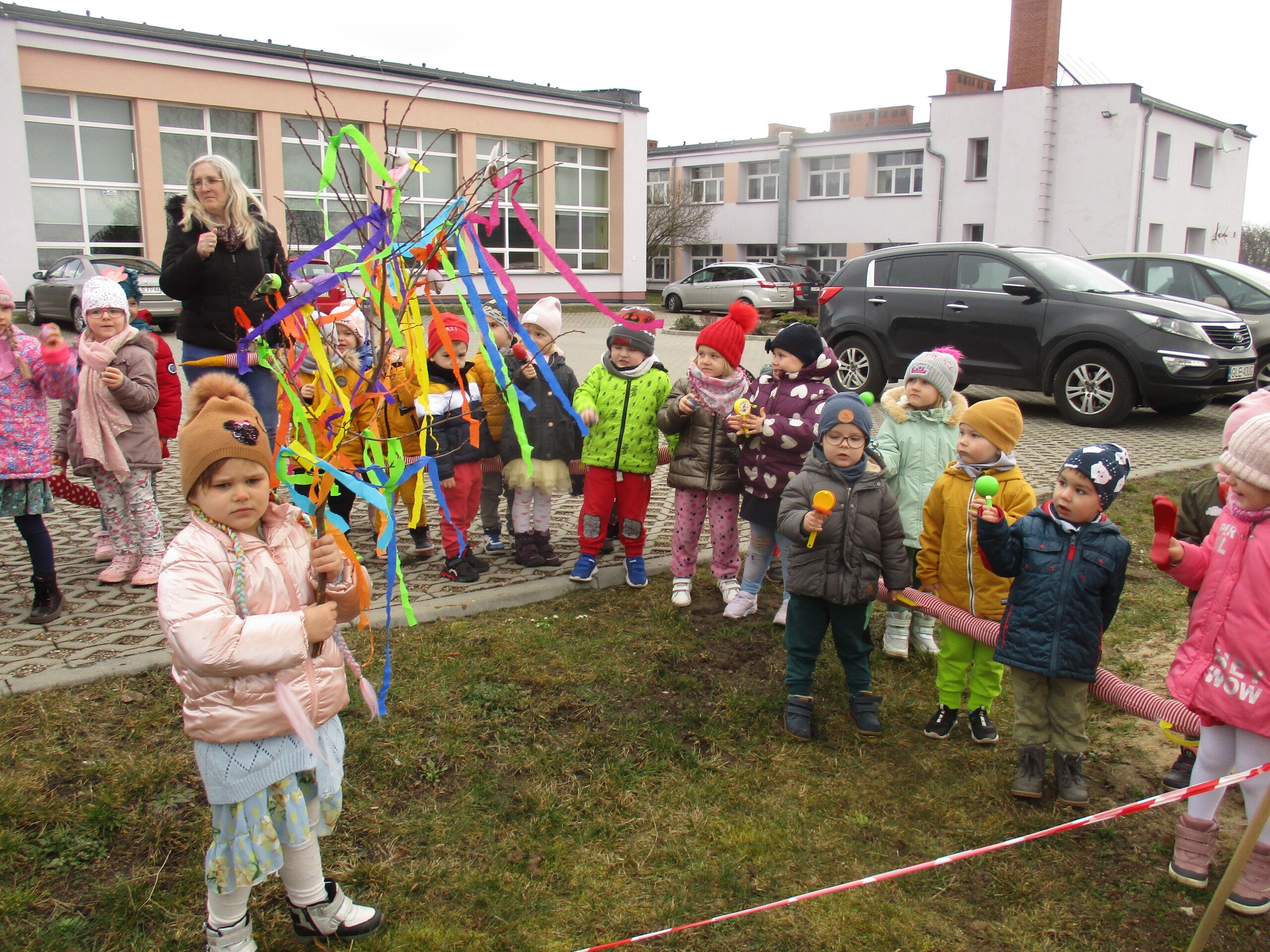 Dzisiaj wszystkie przedszkolaki żegnały Zimę i witały Wiosnę. Dzieci przyszły do przedszkola w ubranich w kolorach wiosennych. Młodsza grupa tańczyła przy piosence "Wiosna w błękitnej sukience", rozmawiała o tradycji związanej z paleniem Marzanny oraz strojeniem gaika, pokolorowała obrazek przedstawiający Panią Wiosnę. Starsza grupa wykonała Marzannę. Wszystkie dzieci ruszyły razem z Marzanną i Gaikiem na boisko szkolne. Tak Kajetan w imieniu wszystkich dzieci w ognisku spalił zimową pannę. Następnie dzieci z instrumentami poszły na spacer szukać Wiosny. Jaśmina szła na czele wiosennego pochodu i niosła Gaik - oznakę Wiosny.