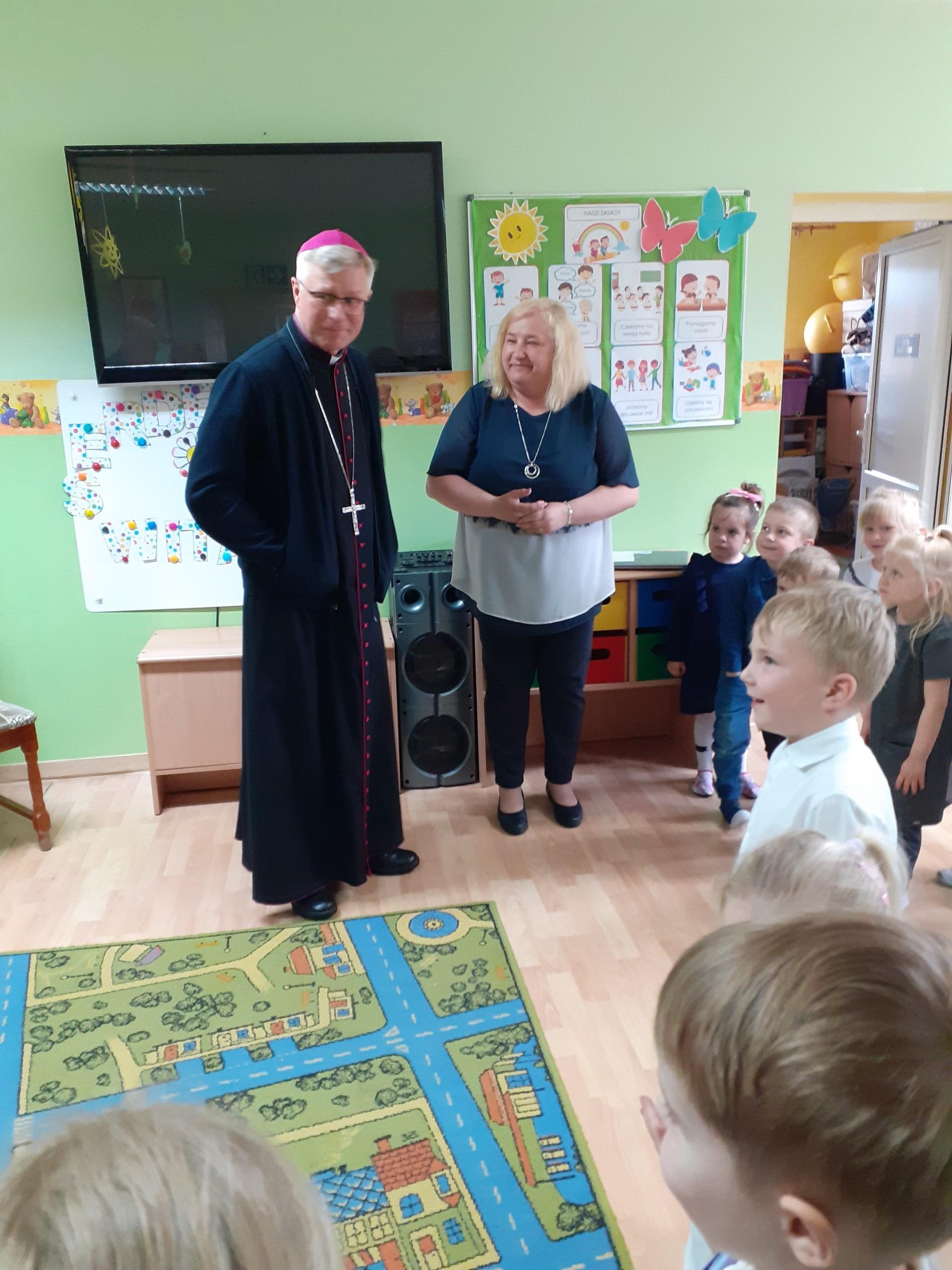 16 maja był w naszym przedszkolu dniem bardzo szczególnym i uroczystym. Mieliśmy zaszczyt i przyjemność gościć w naszych progach Księdza Biskupa Diecezji Pelplińskiej dr Arkadiusza Okroja. Biskupowi towarzyszył nasz Ksiądz Proboszcz Czesław Kubera, który w naszym przedszkolu uczy religii.