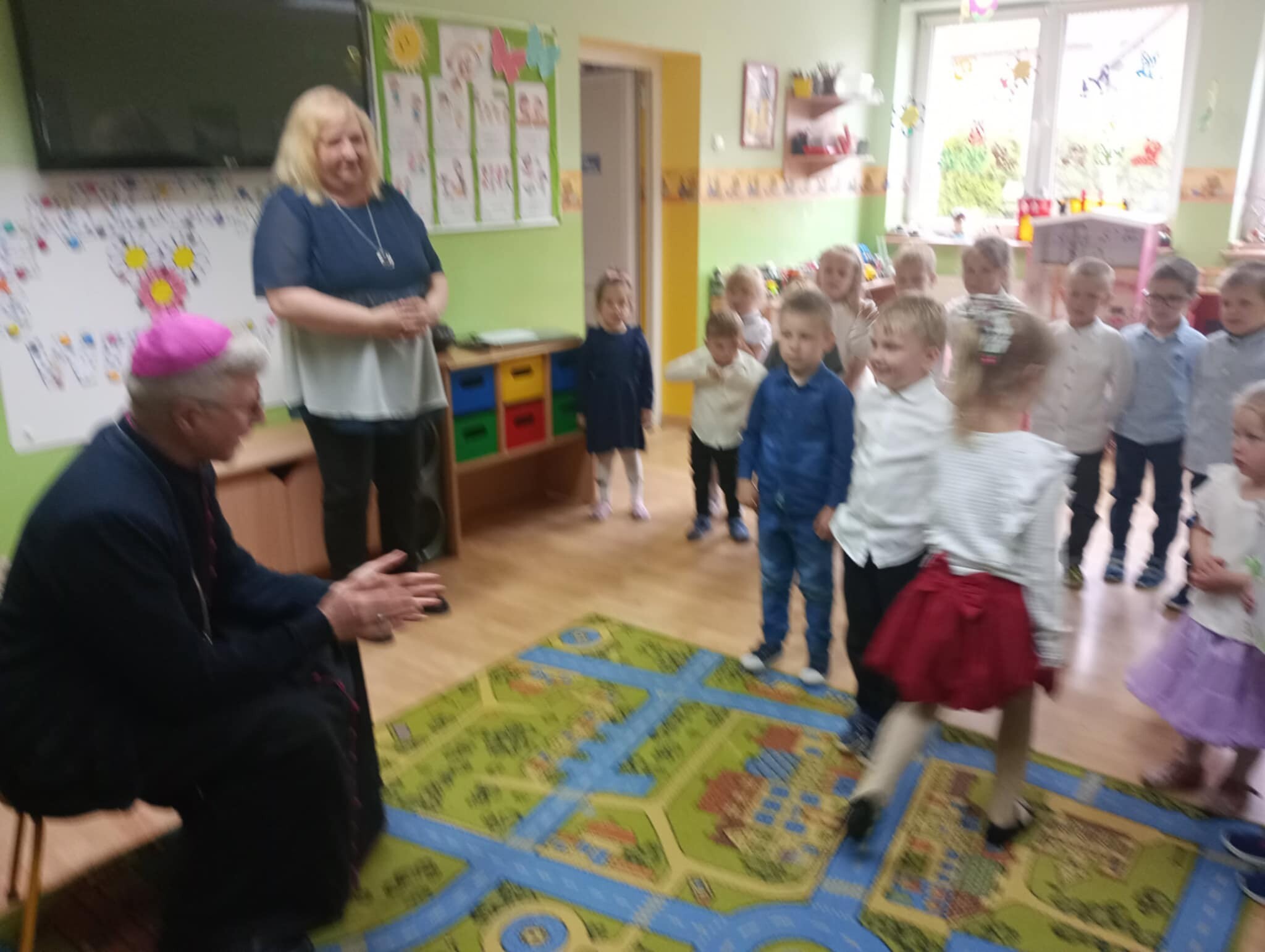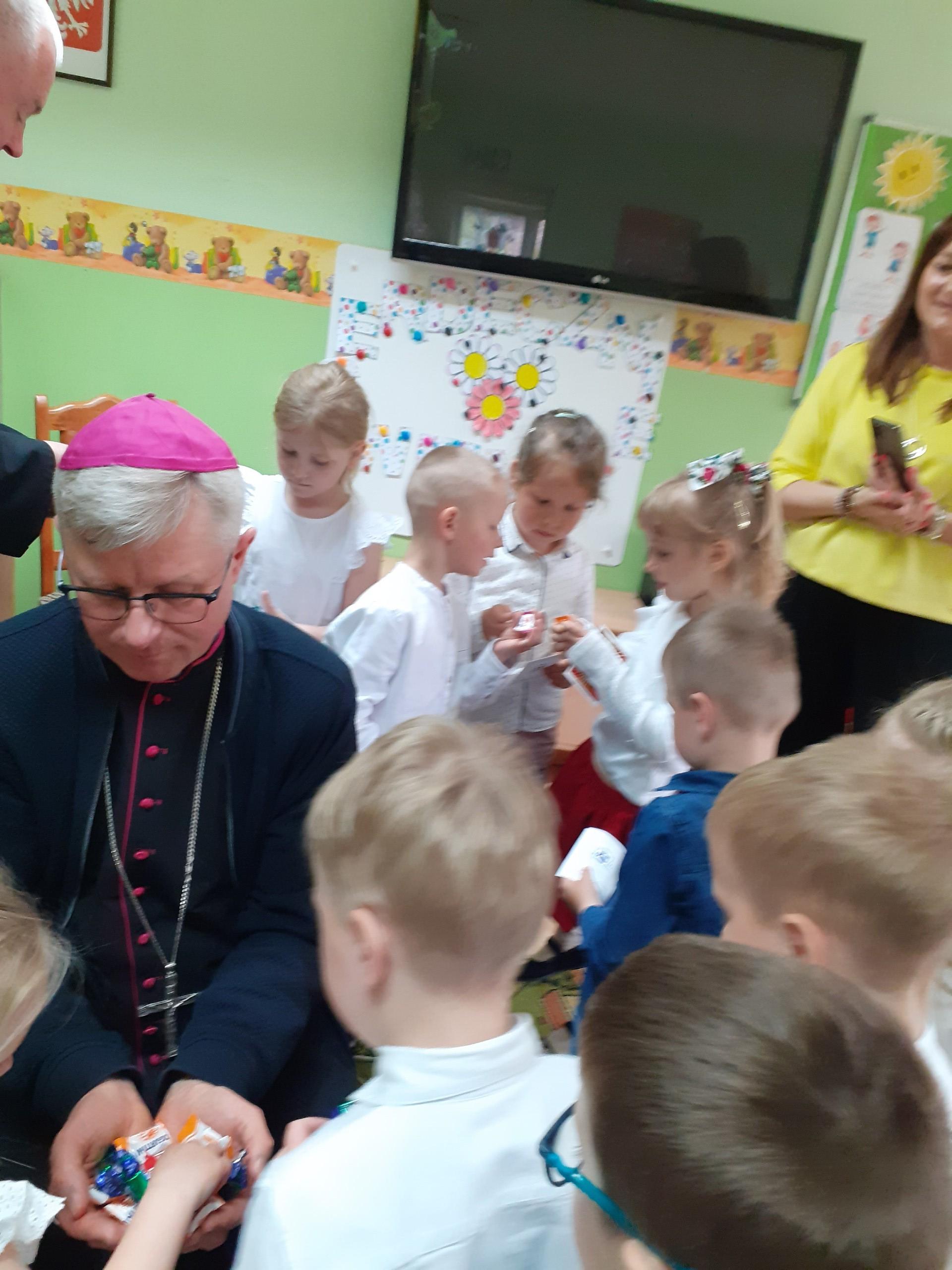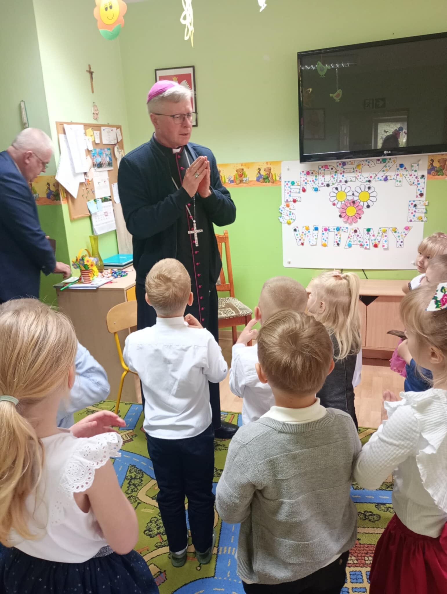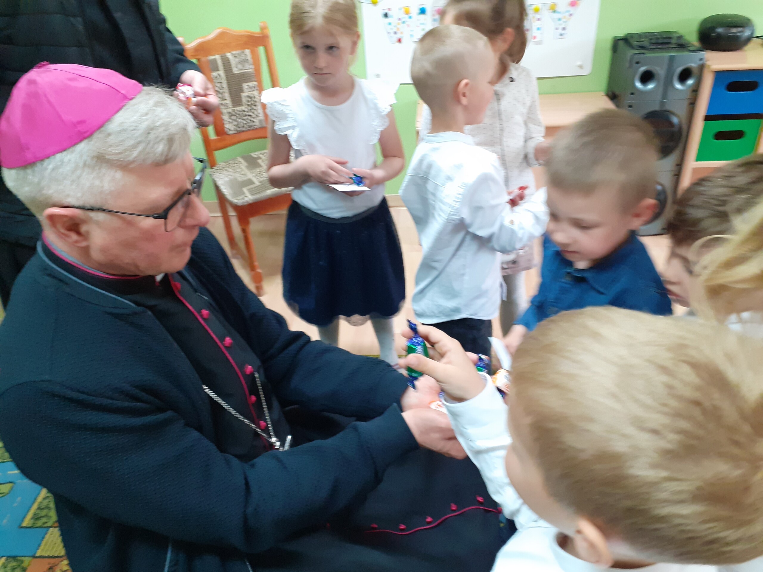 Delegacja dzieci w imieniu wszystkich złożyła życzenia oraz wręczyła kwiaty i laurki prosząc jednocześnie o błogosławieństwo. Dziecięce, pełne szczerości słowa, płynące z ust najmłodszych bardzo ucieszyły gości. Ksiądz Biskup razem z dziećmi zaśpiewał znane piosenki religijne oraz przybliżył przypowieść o Jezusie. Dzieci zadawały Gościowi trudne pytania, na które usłyszały satysfakcjonujące Ich odpowiedzi.