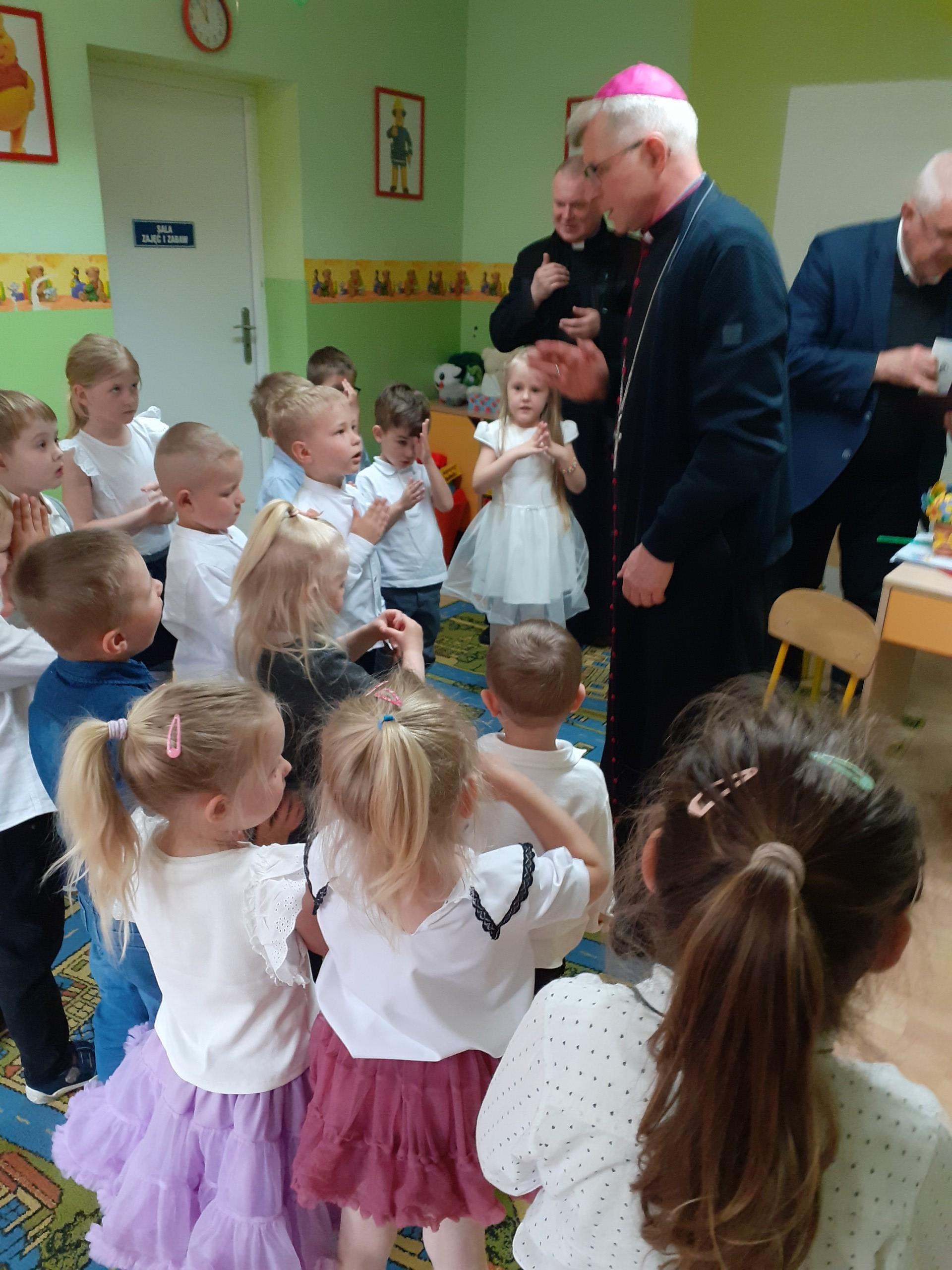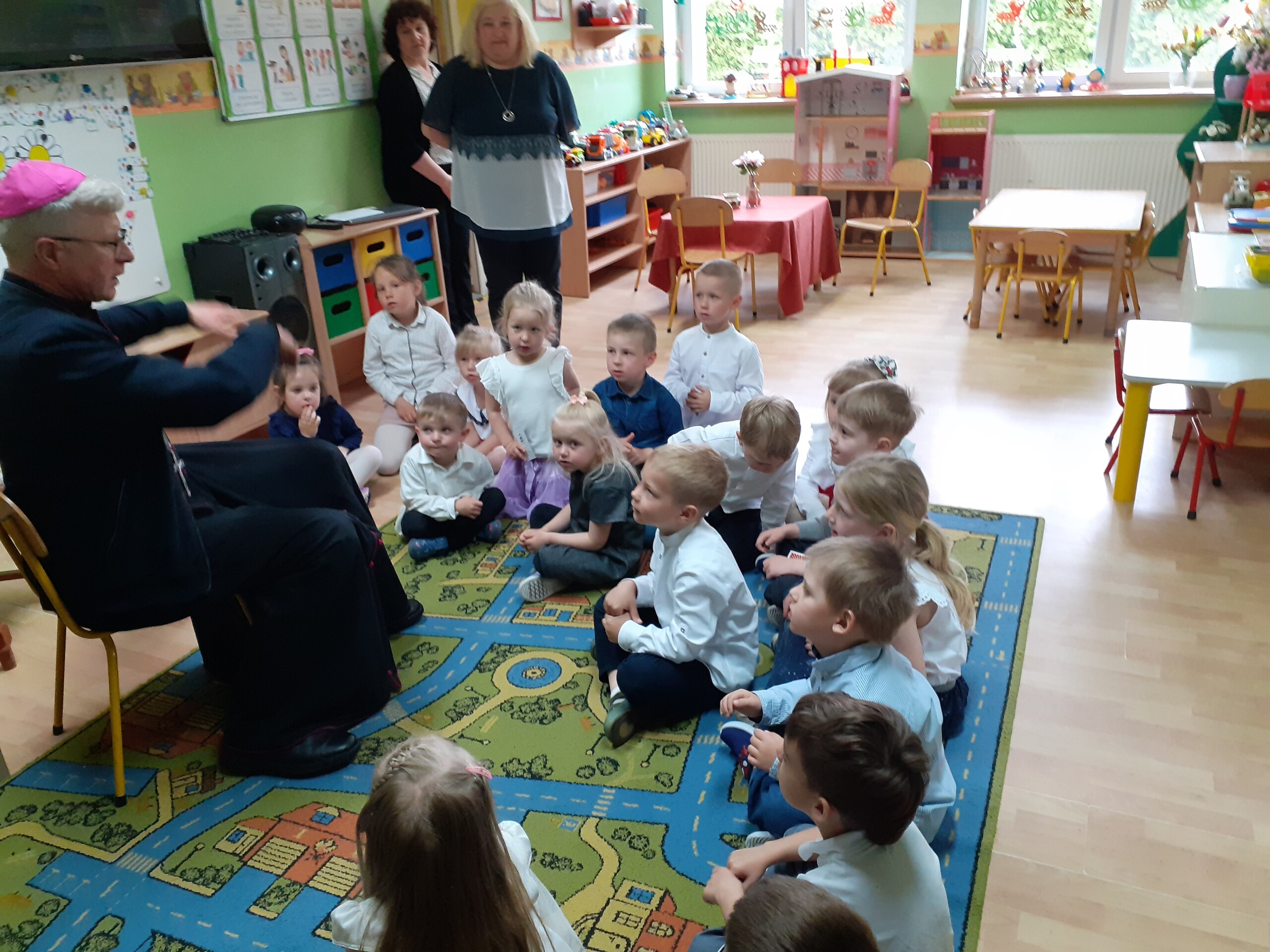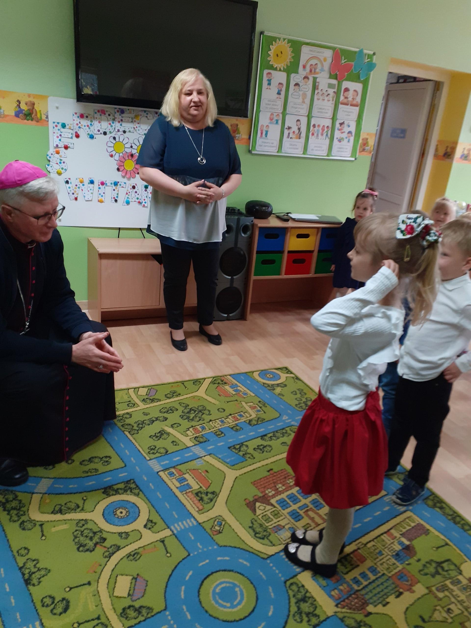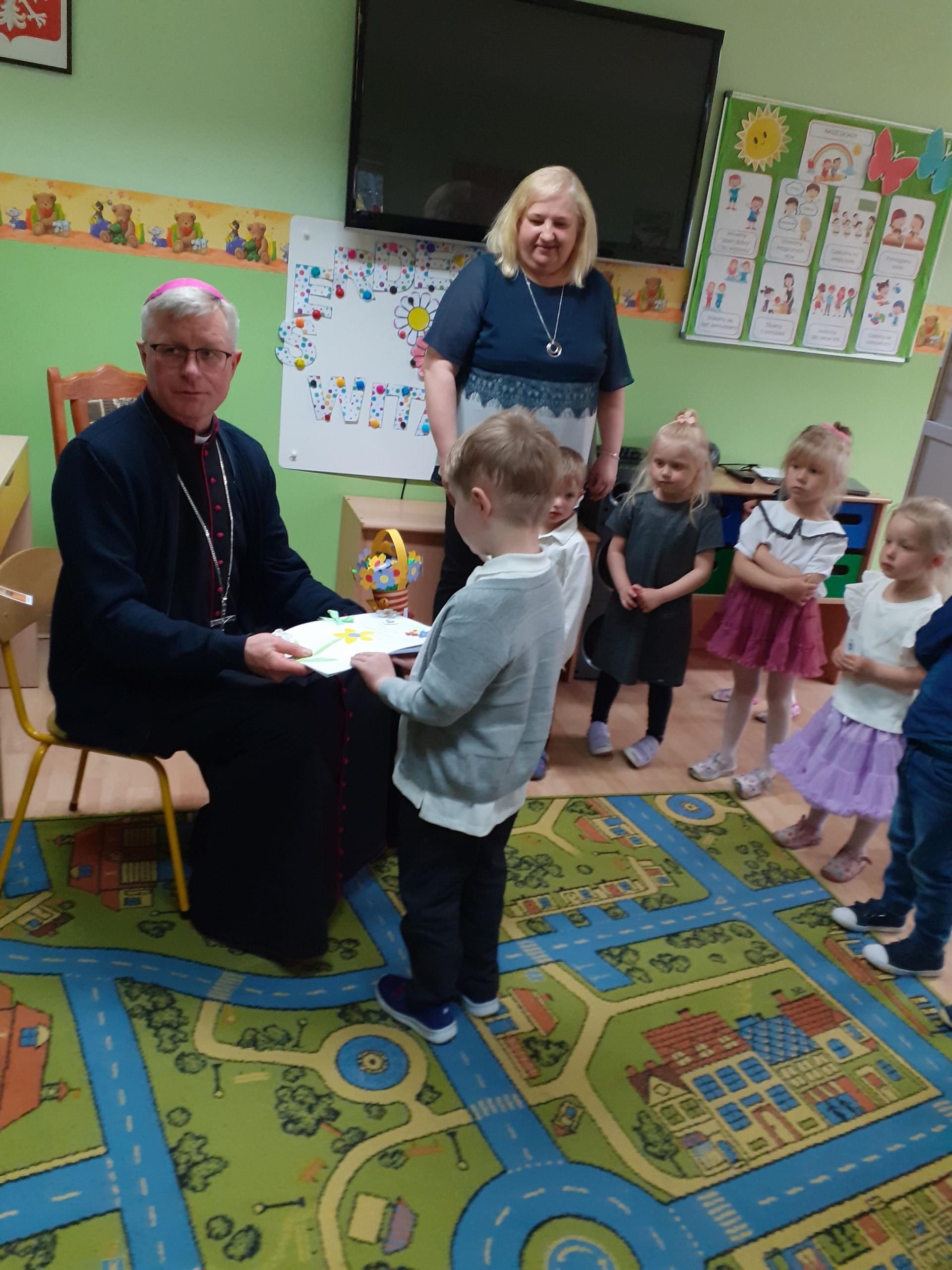 Delegacja dzieci w imieniu wszystkich złożyła życzenia oraz wręczyła kwiaty i laurki prosząc jednocześnie o błogosławieństwo. Dziecięce, pełne szczerości słowa, płynące z ust najmłodszych bardzo ucieszyły gości. Ksiądz Biskup razem z dziećmi zaśpiewał znane piosenki religijne oraz przybliżył przypowieść o Jezusie. Dzieci zadawały Gościowi trudne pytania, na które usłyszały satysfakcjonujące Ich odpowiedzi.