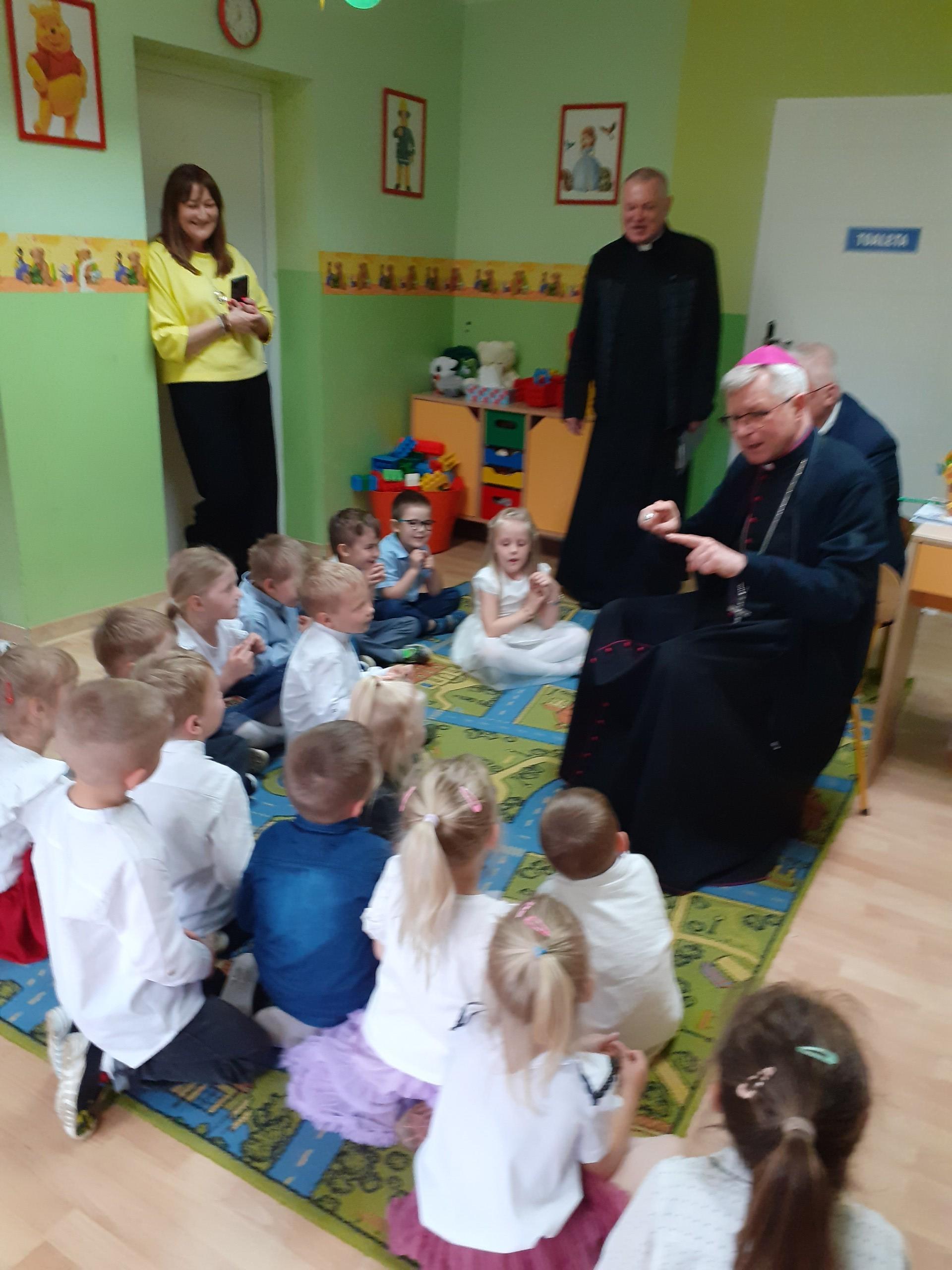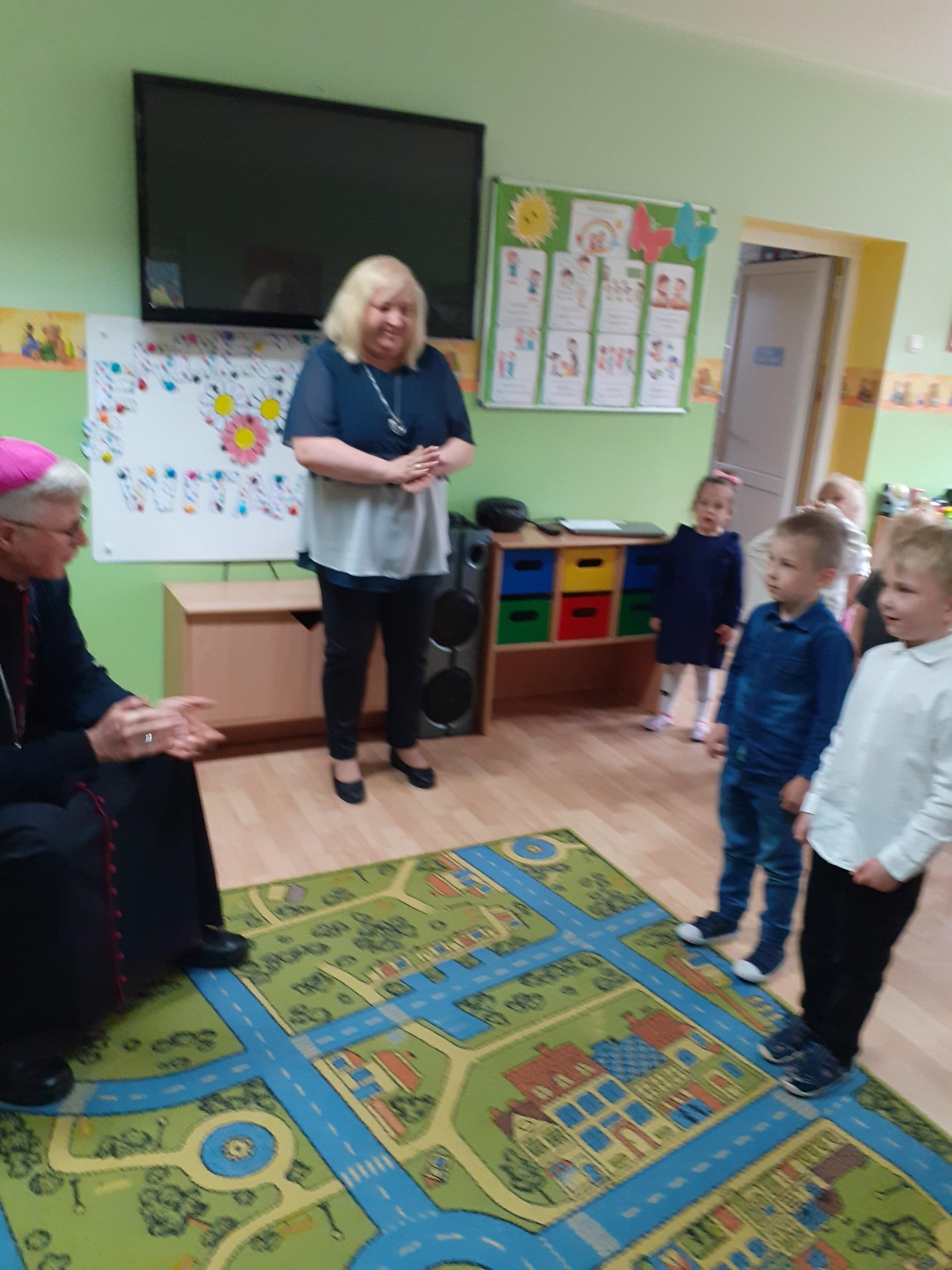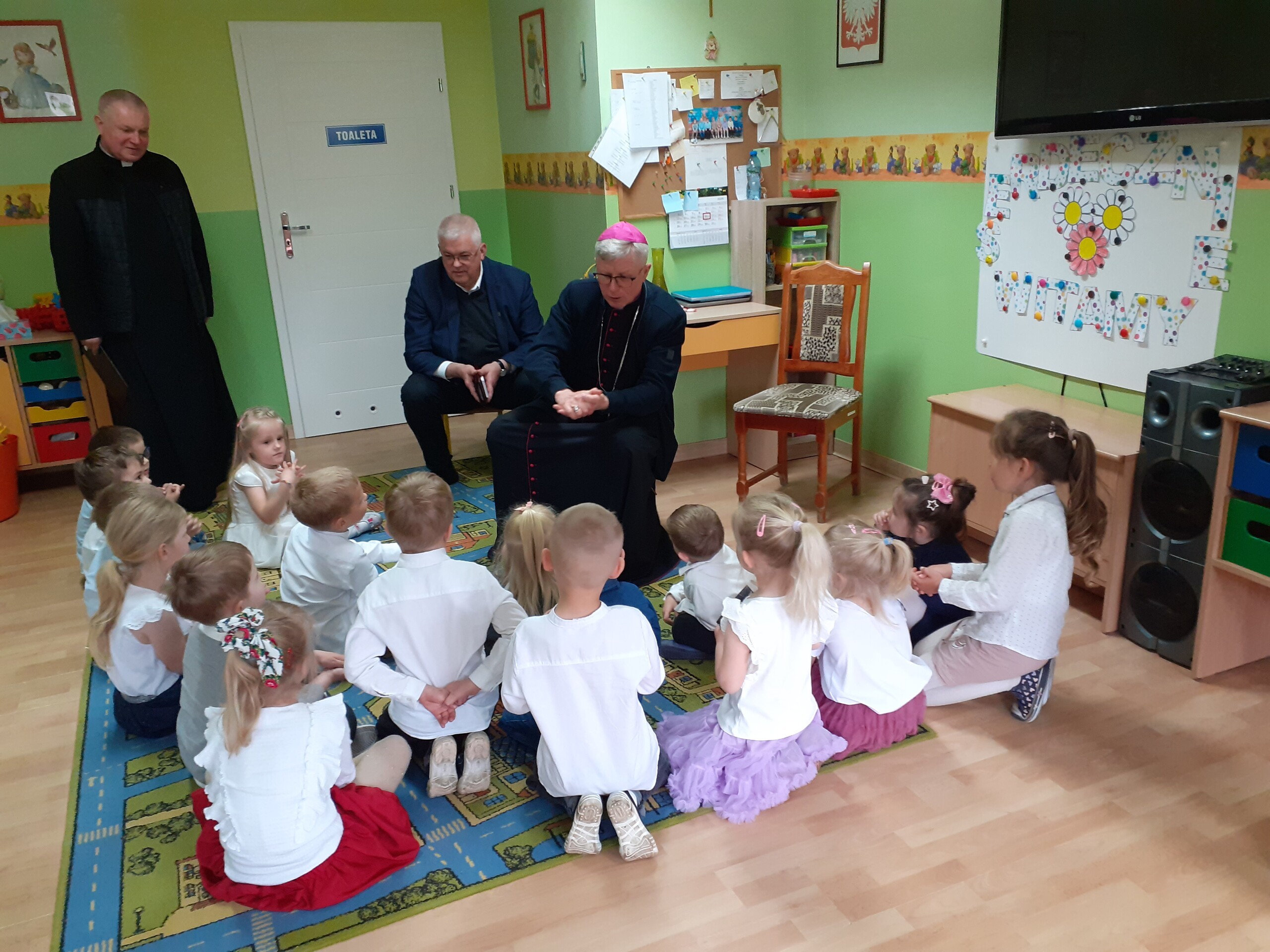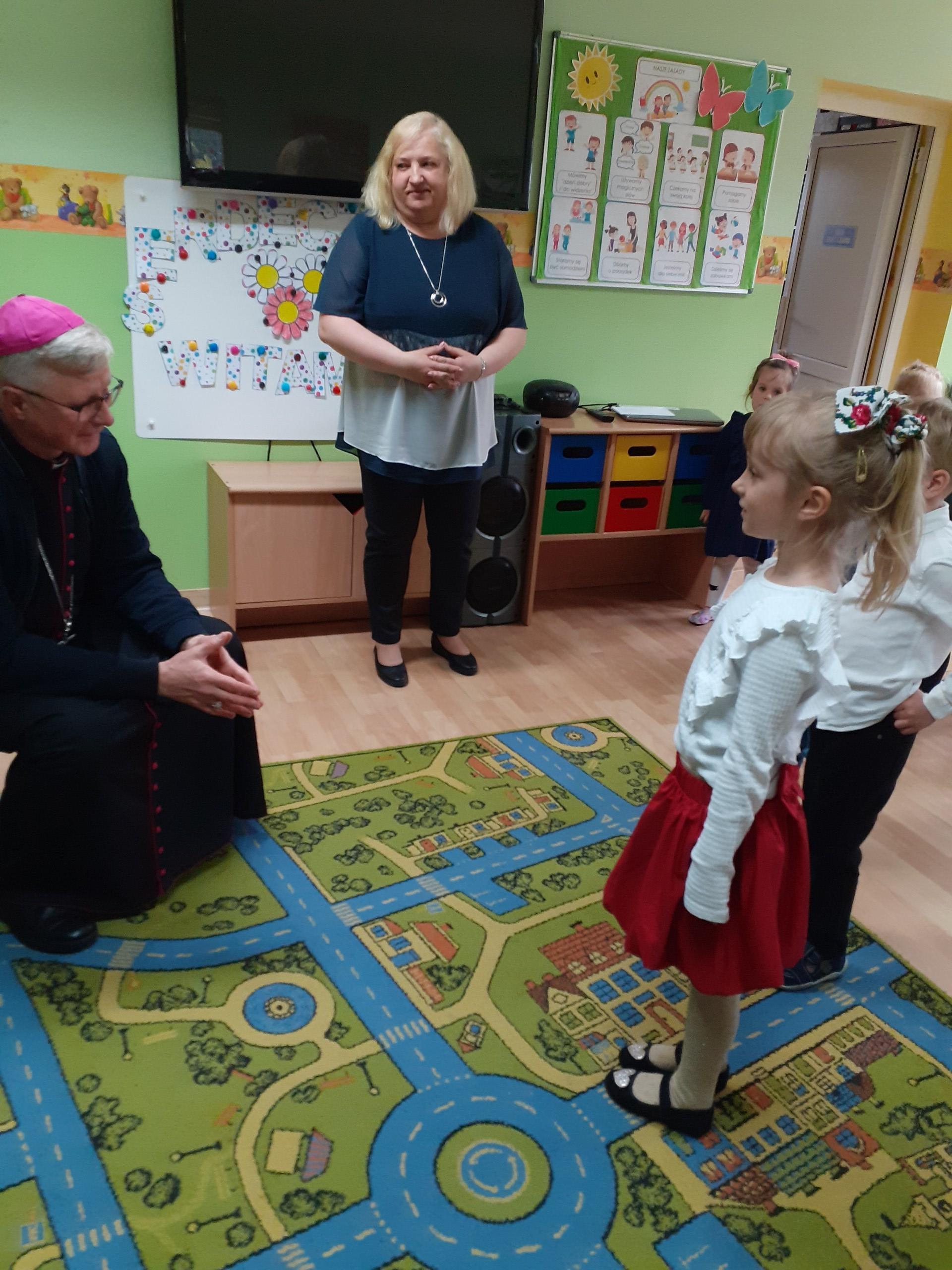 Delegacja dzieci w imieniu wszystkich złożyła życzenia oraz wręczyła kwiaty i laurki prosząc jednocześnie o błogosławieństwo. Dziecięce, pełne szczerości słowa, płynące z ust najmłodszych bardzo ucieszyły gości. Ksiądz Biskup razem z dziećmi zaśpiewał znane piosenki religijne oraz przybliżył przypowieść o Jezusie. Dzieci zadawały Gościowi trudne pytania, na które usłyszały satysfakcjonujące Ich odpowiedzi.