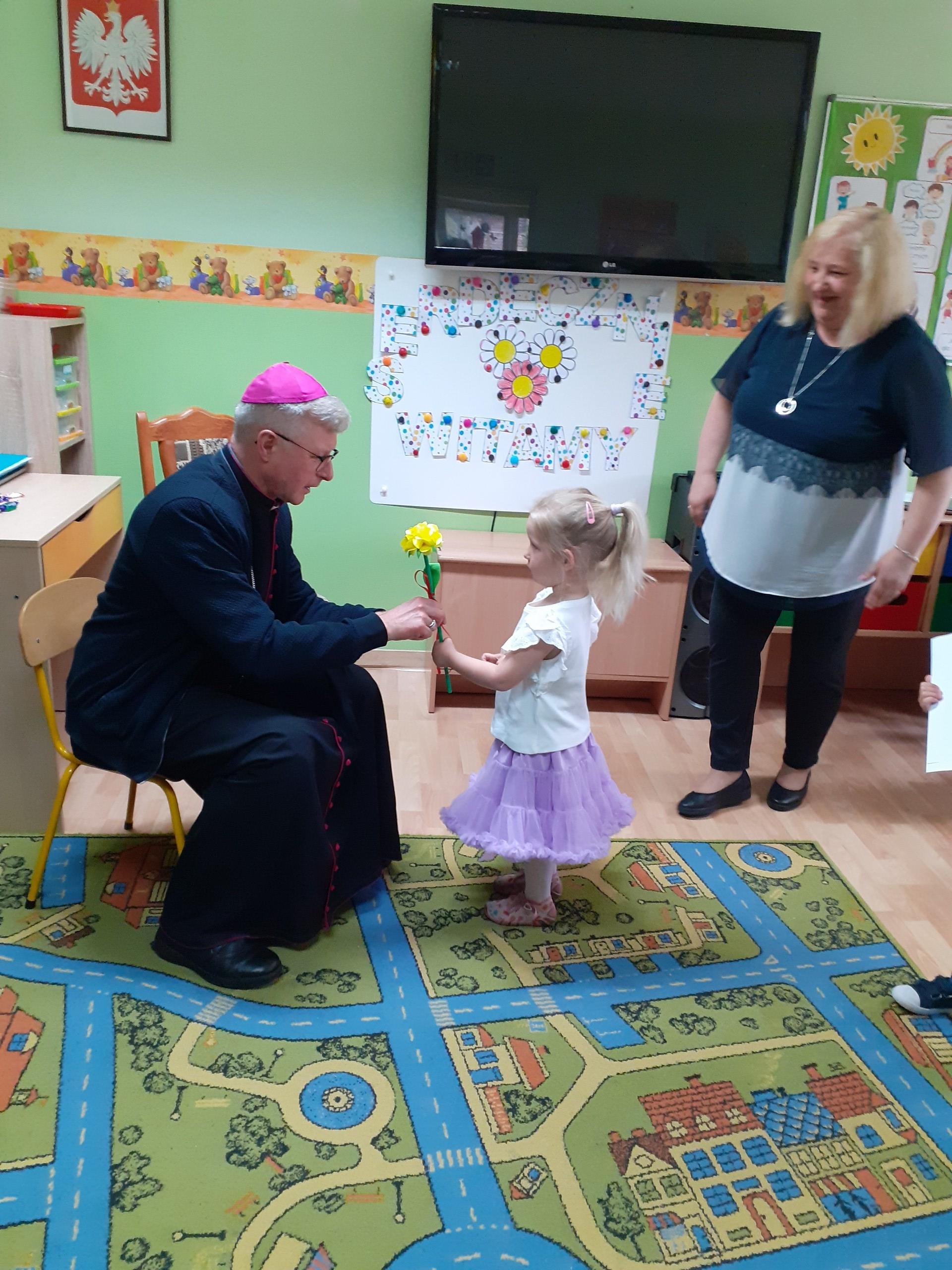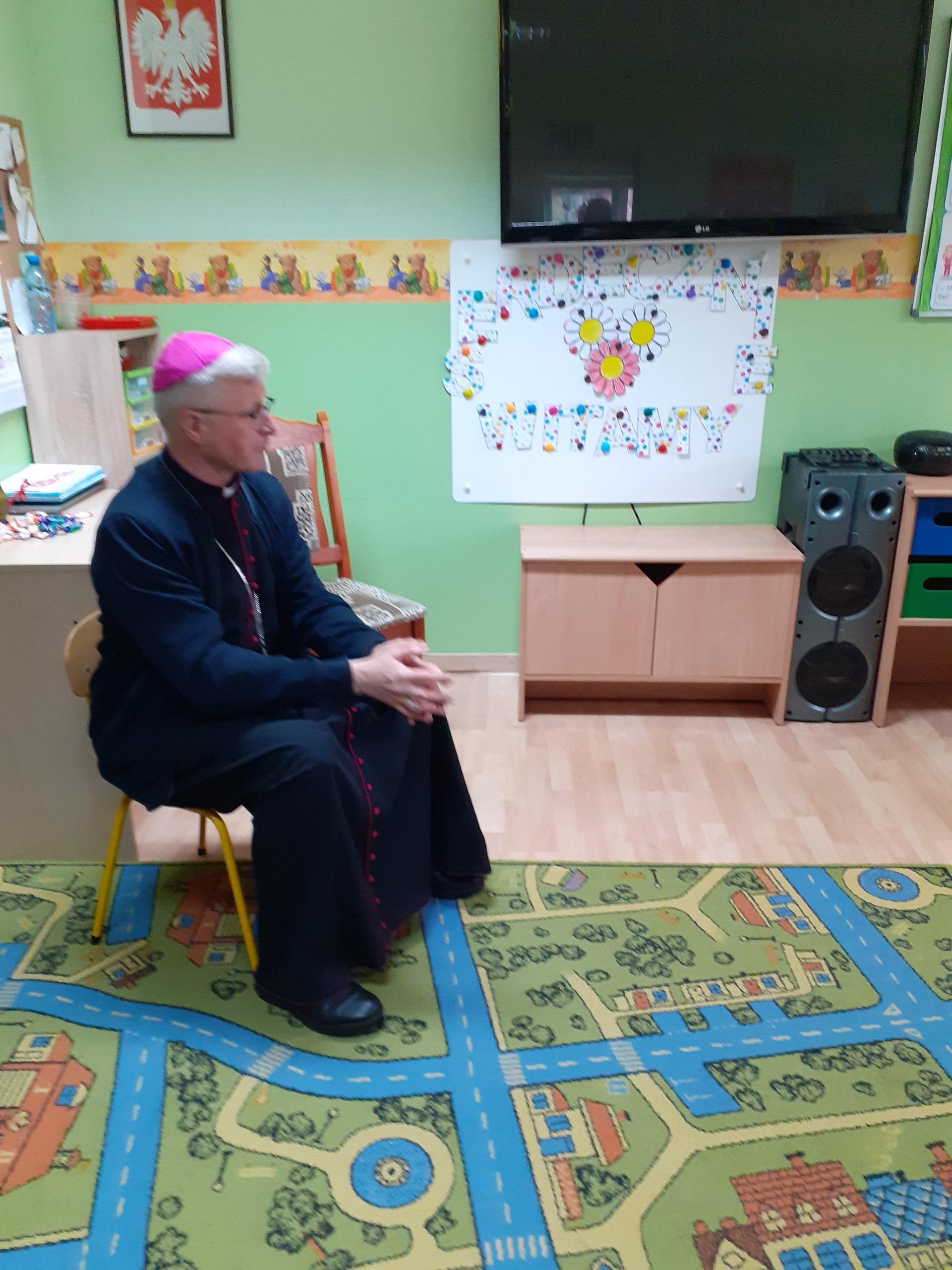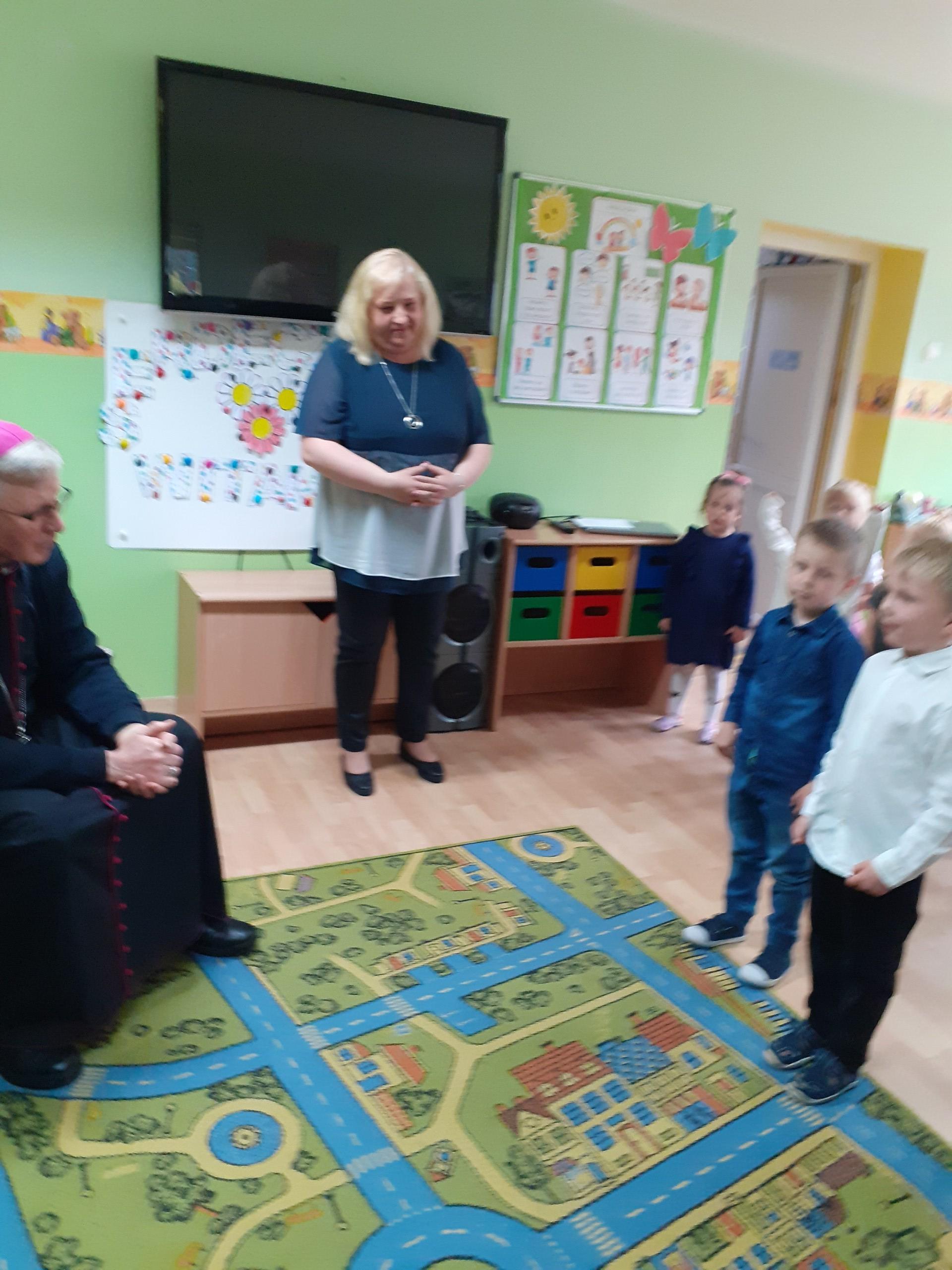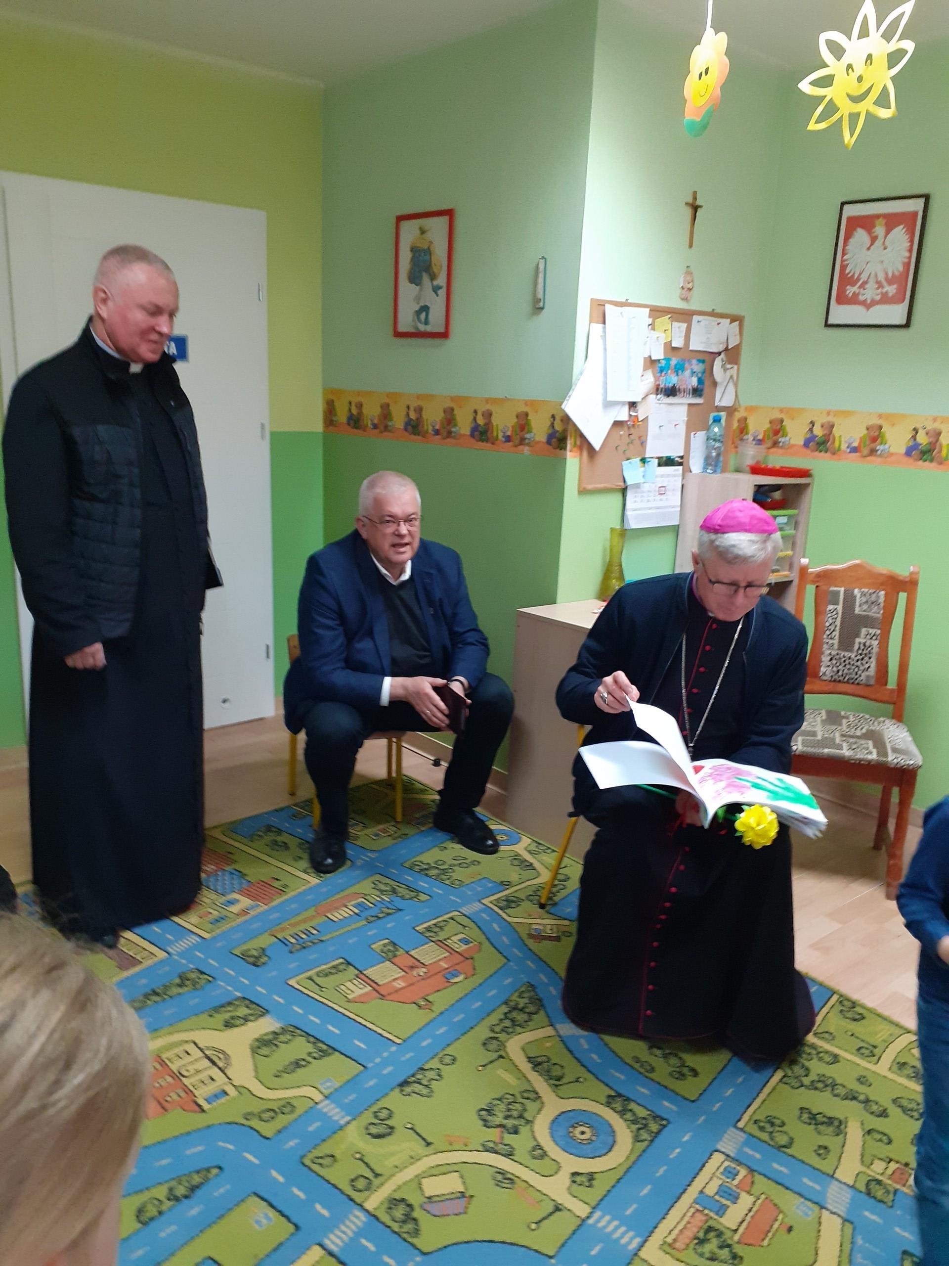 Delegacja dzieci w imieniu wszystkich złożyła życzenia oraz wręczyła kwiaty i laurki prosząc jednocześnie o błogosławieństwo. Dziecięce, pełne szczerości słowa, płynące z ust najmłodszych bardzo ucieszyły gości. Ksiądz Biskup razem z dziećmi zaśpiewał znane piosenki religijne oraz przybliżył przypowieść o Jezusie. Dzieci zadawały Gościowi trudne pytania, na które usłyszały satysfakcjonujące Ich odpowiedzi.