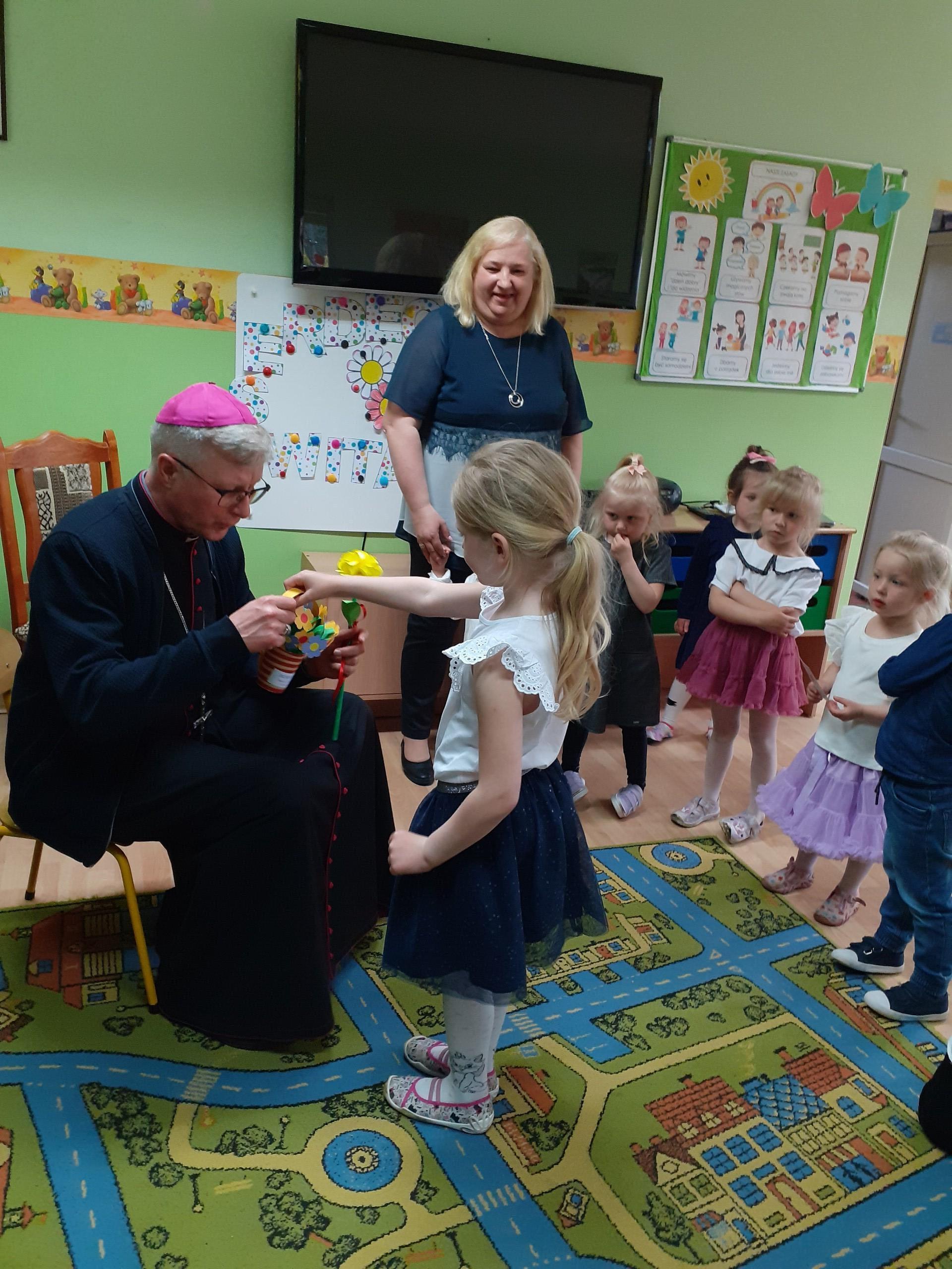 Na zakończenie spotkania Jego Ekscelencja Ksiądz Biskup Arkadiusz Okroj pomodlił się z uczestnikami spotkania i udzielił pasterskiego błogosławieństwa. Wychowankowie, nauczycielki oraz pracownicy przedszkola otrzymali pamiątkowe obrazki.