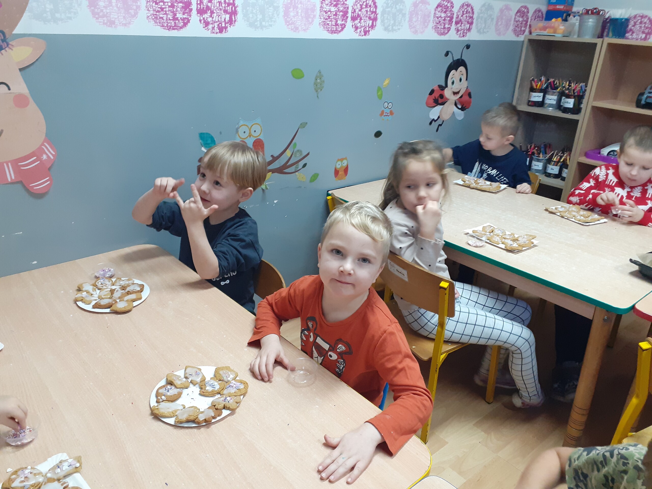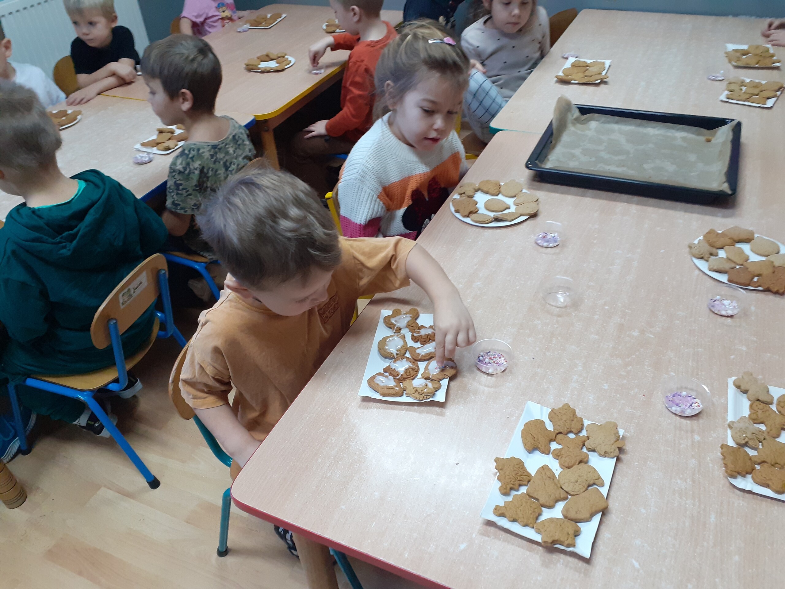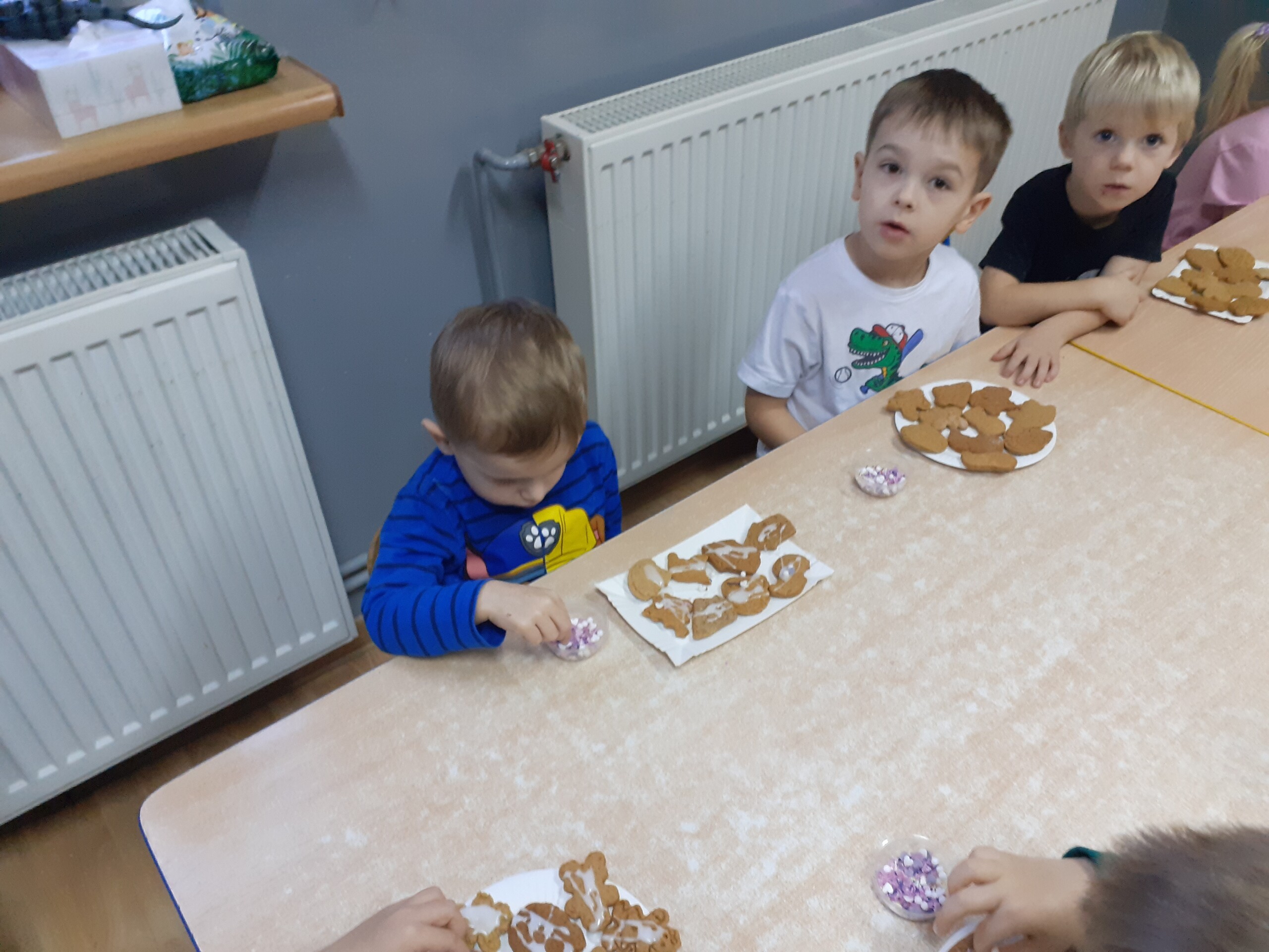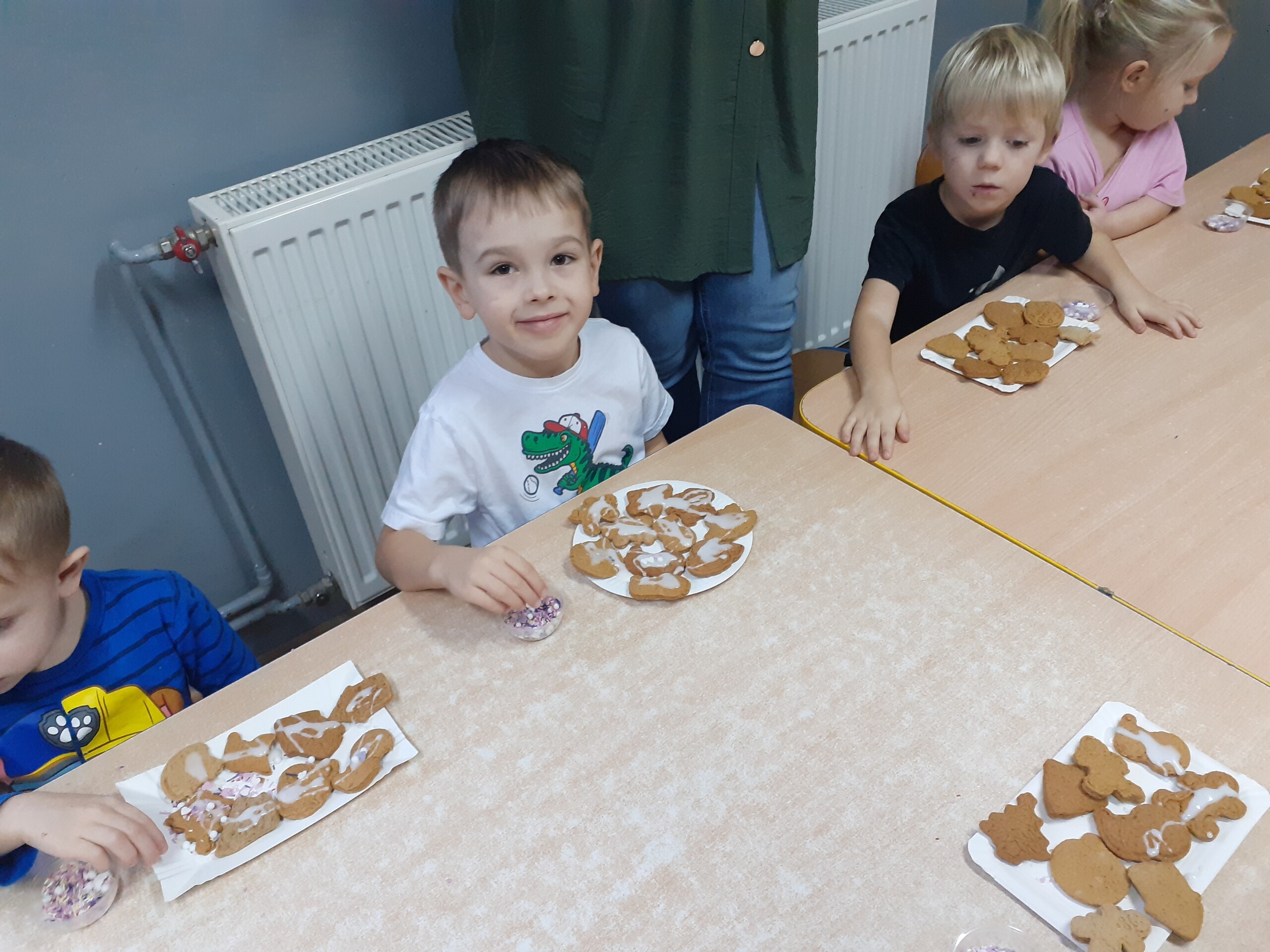 Dzieci z dwóch grup wspólnie dekorowały pierniczki wcześniej przygotowane przez Starszaków.