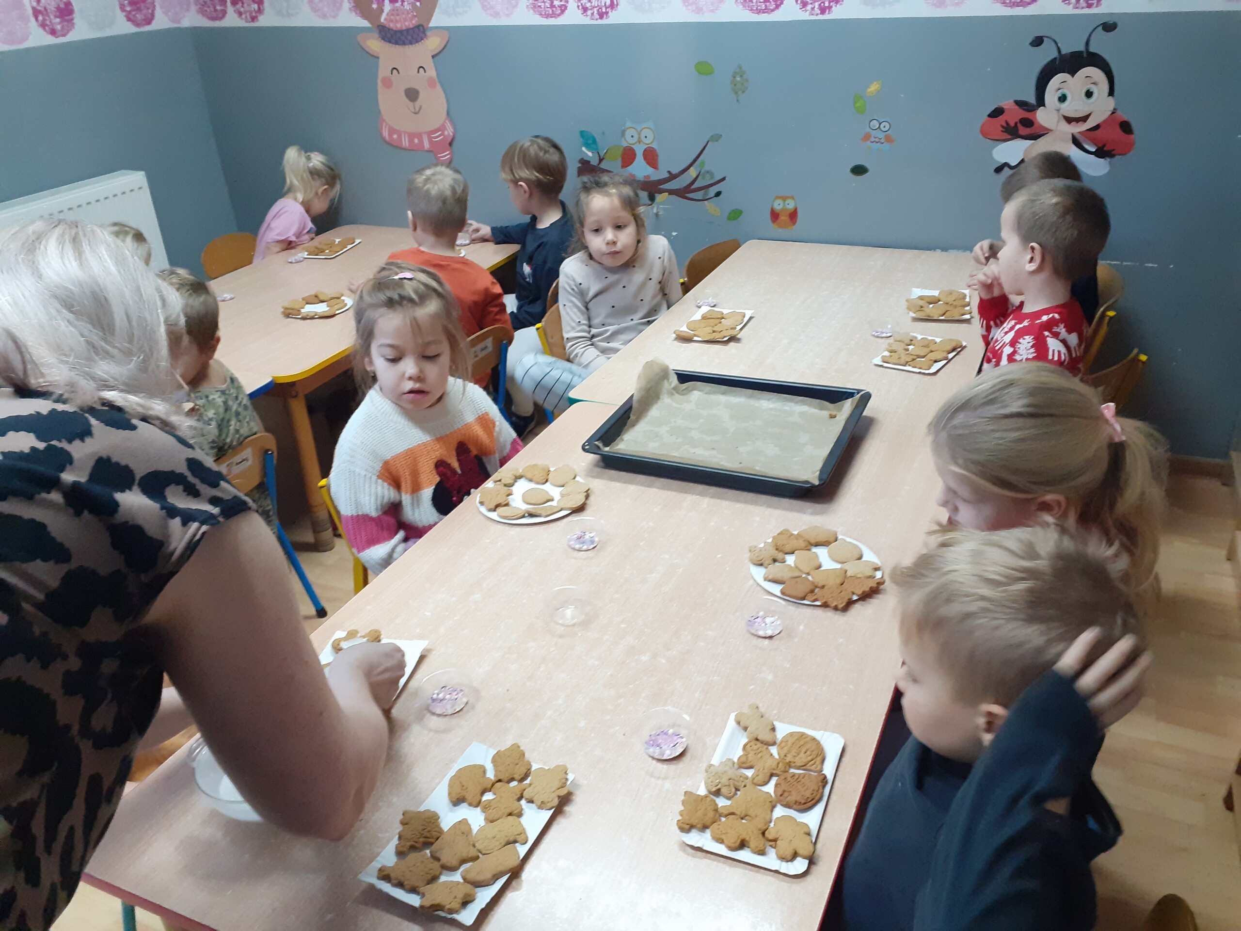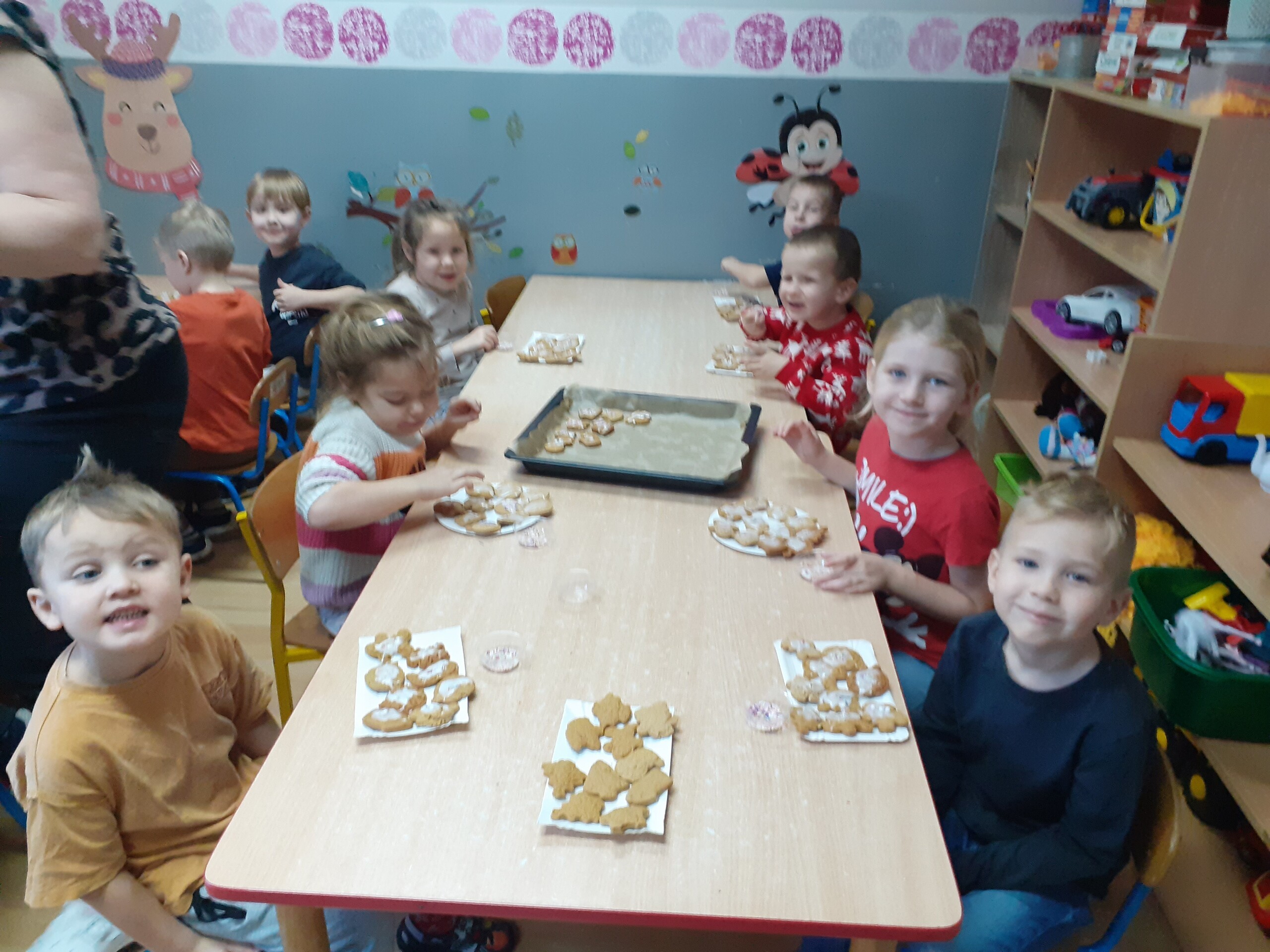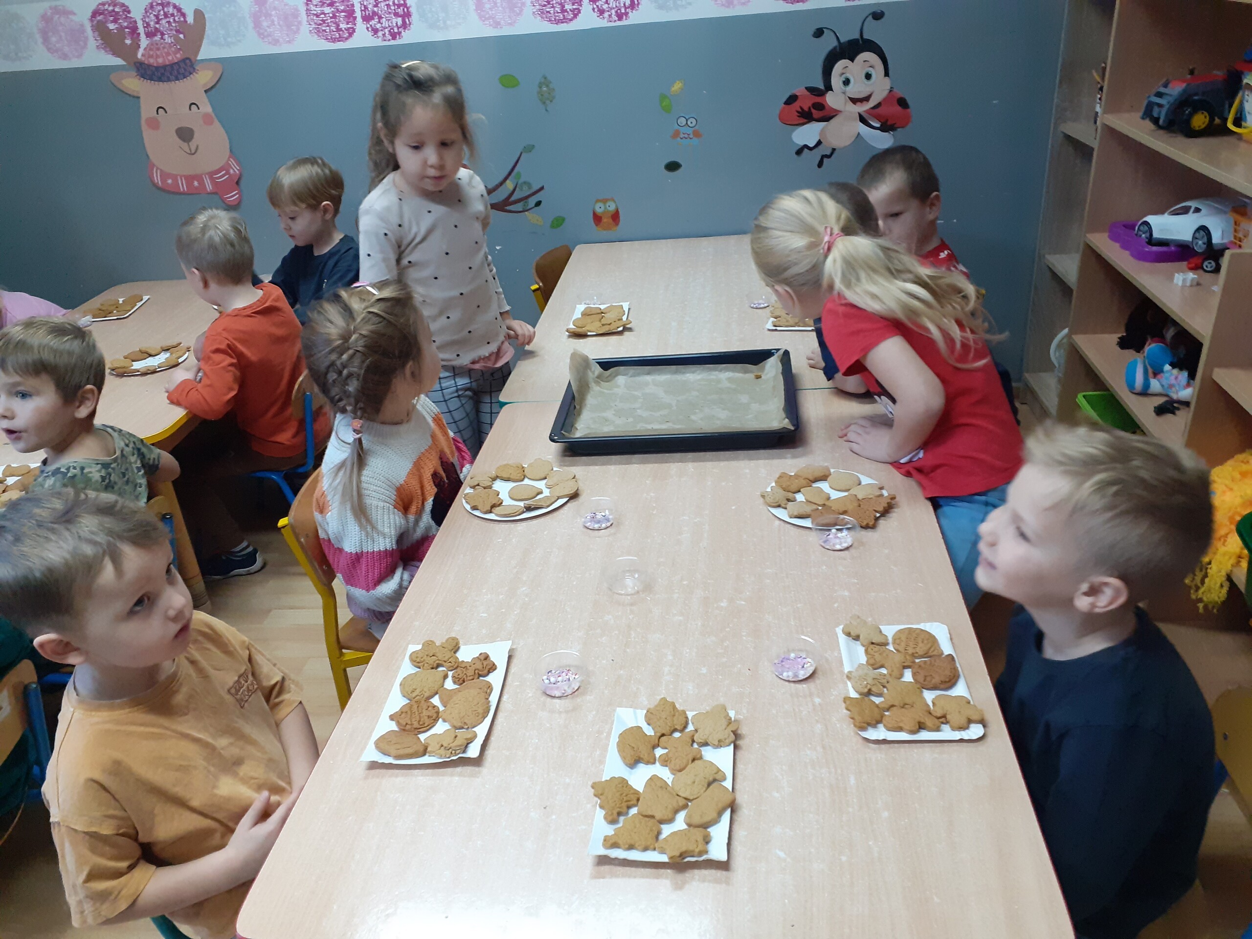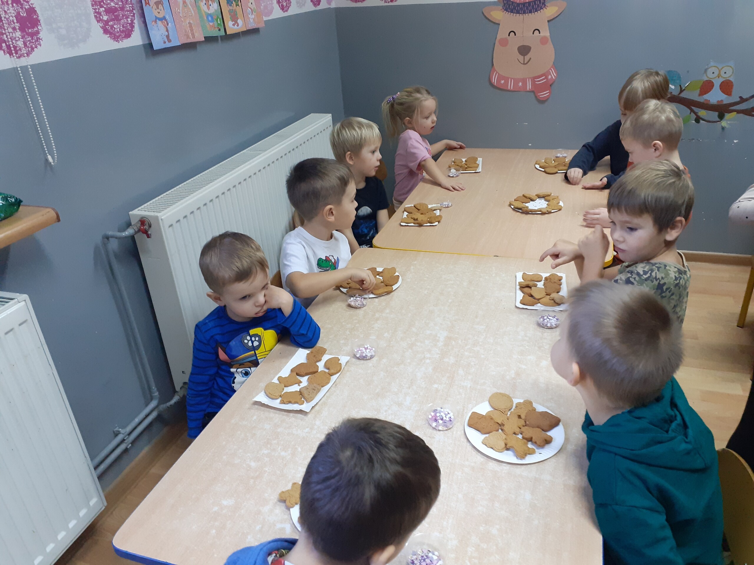 Dzieci z dwóch grup wspólnie dekorowały pierniczki wcześniej przygotowane przez Starszaków.