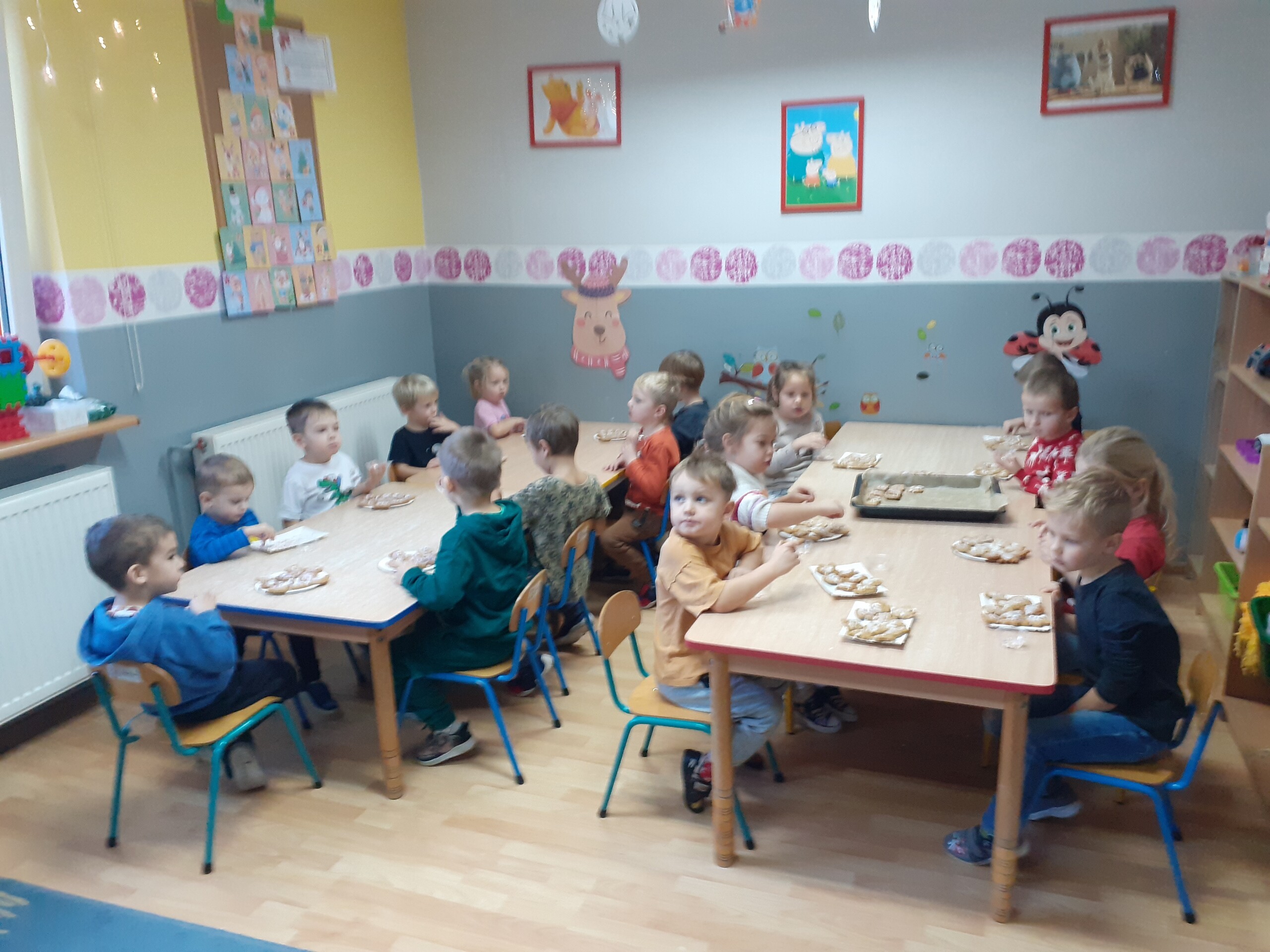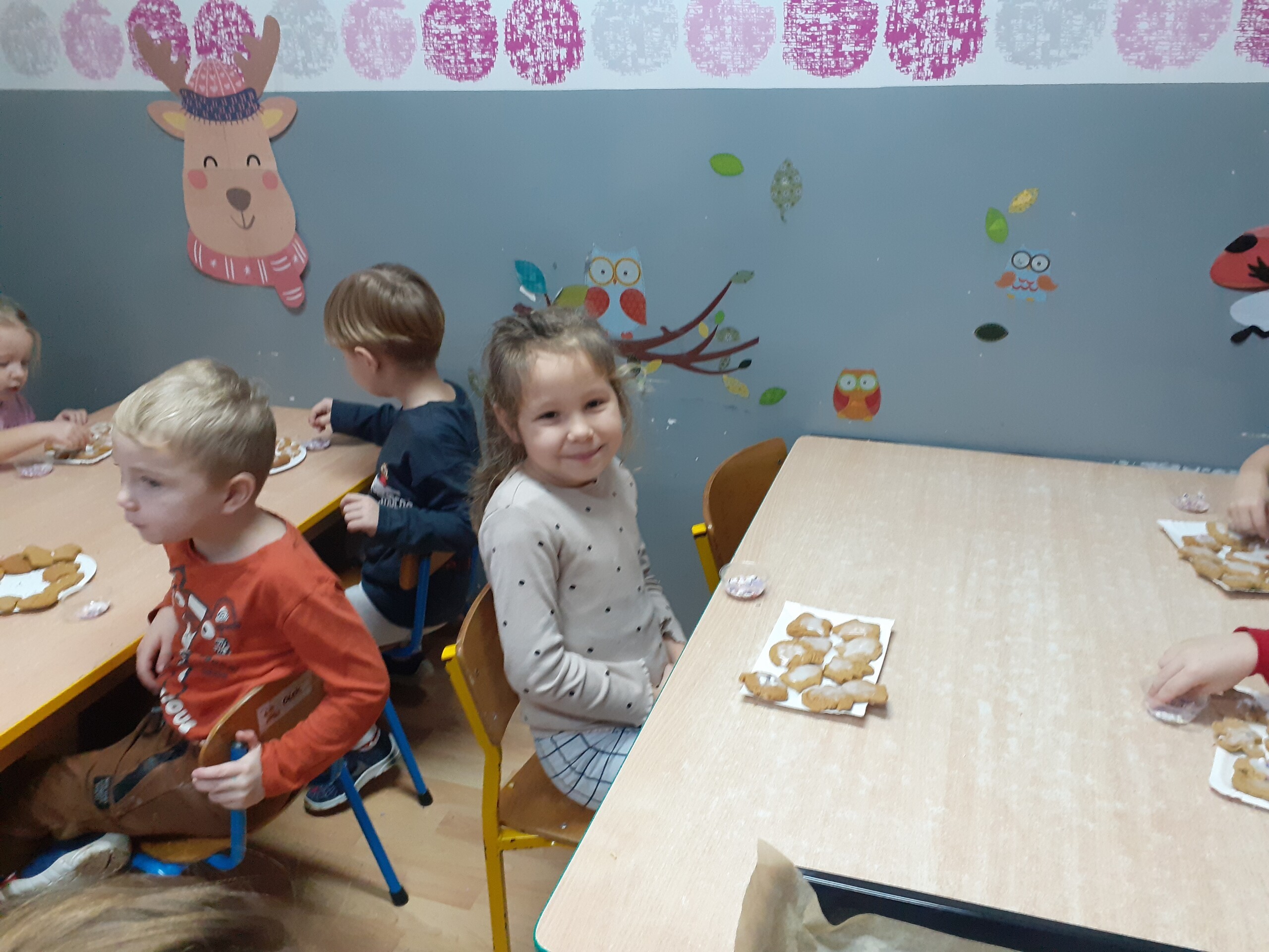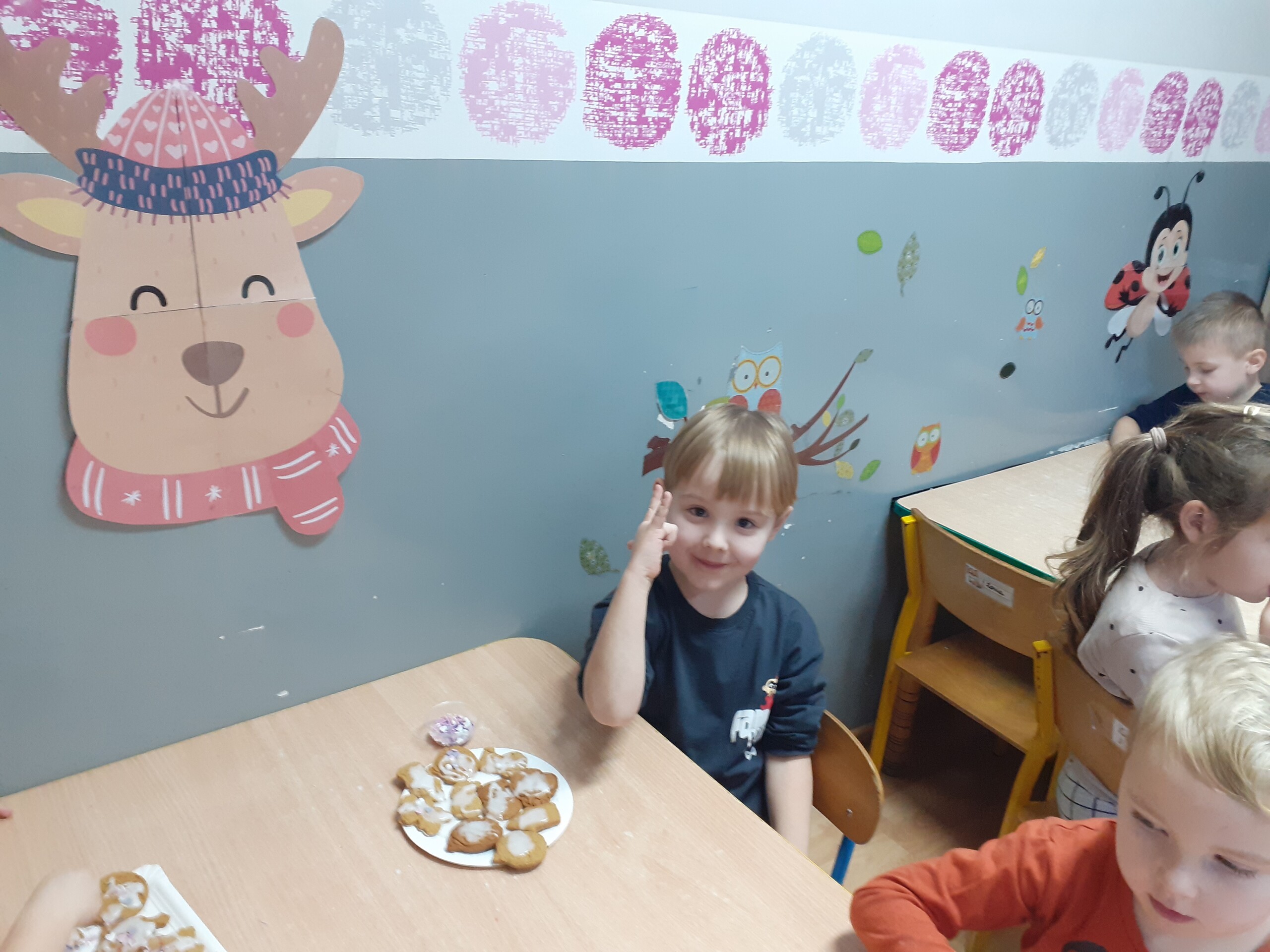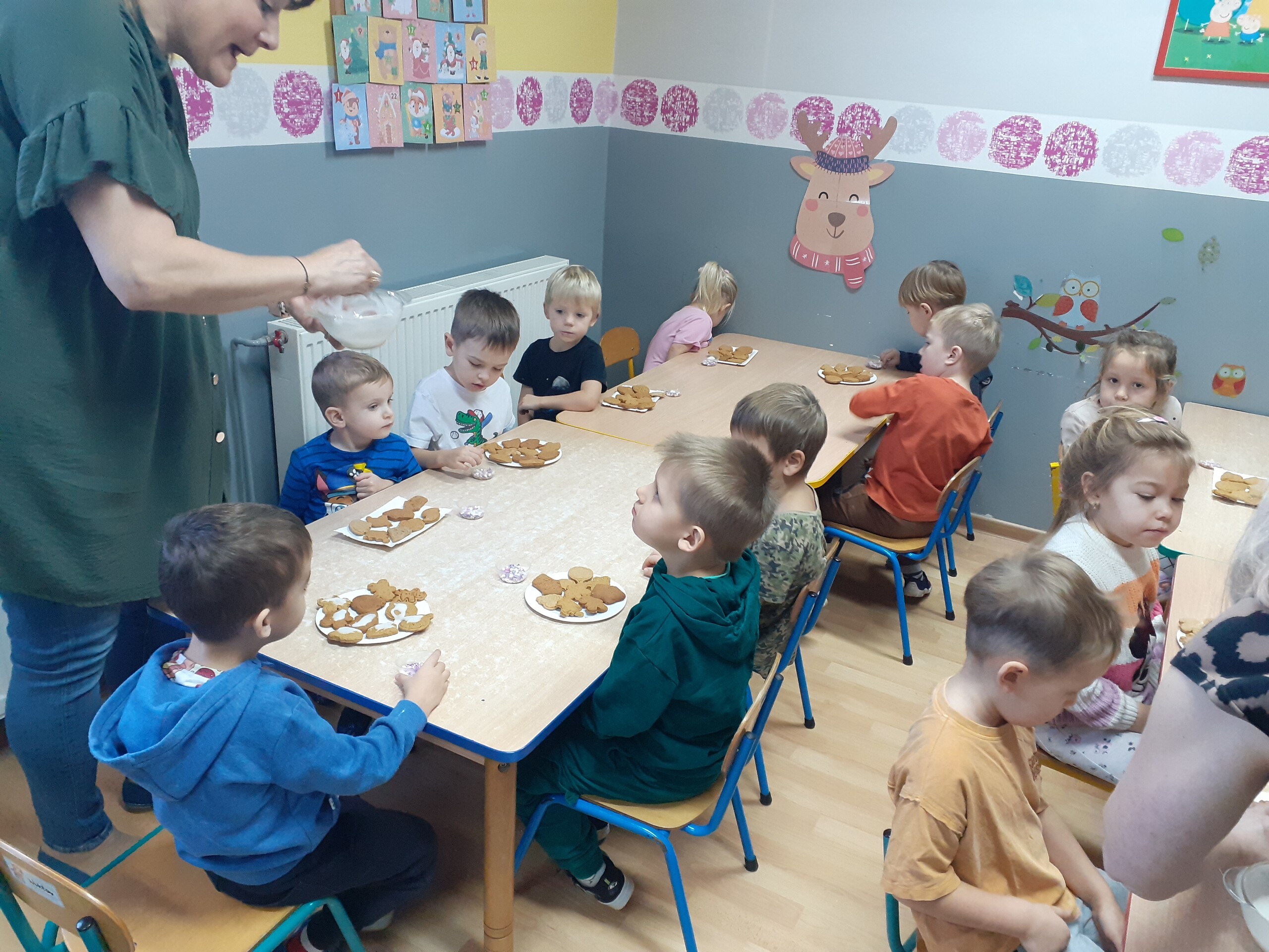 Dzieci z dwóch grup wspólnie dekorowały pierniczki wcześniej przygotowane przez Starszaków.