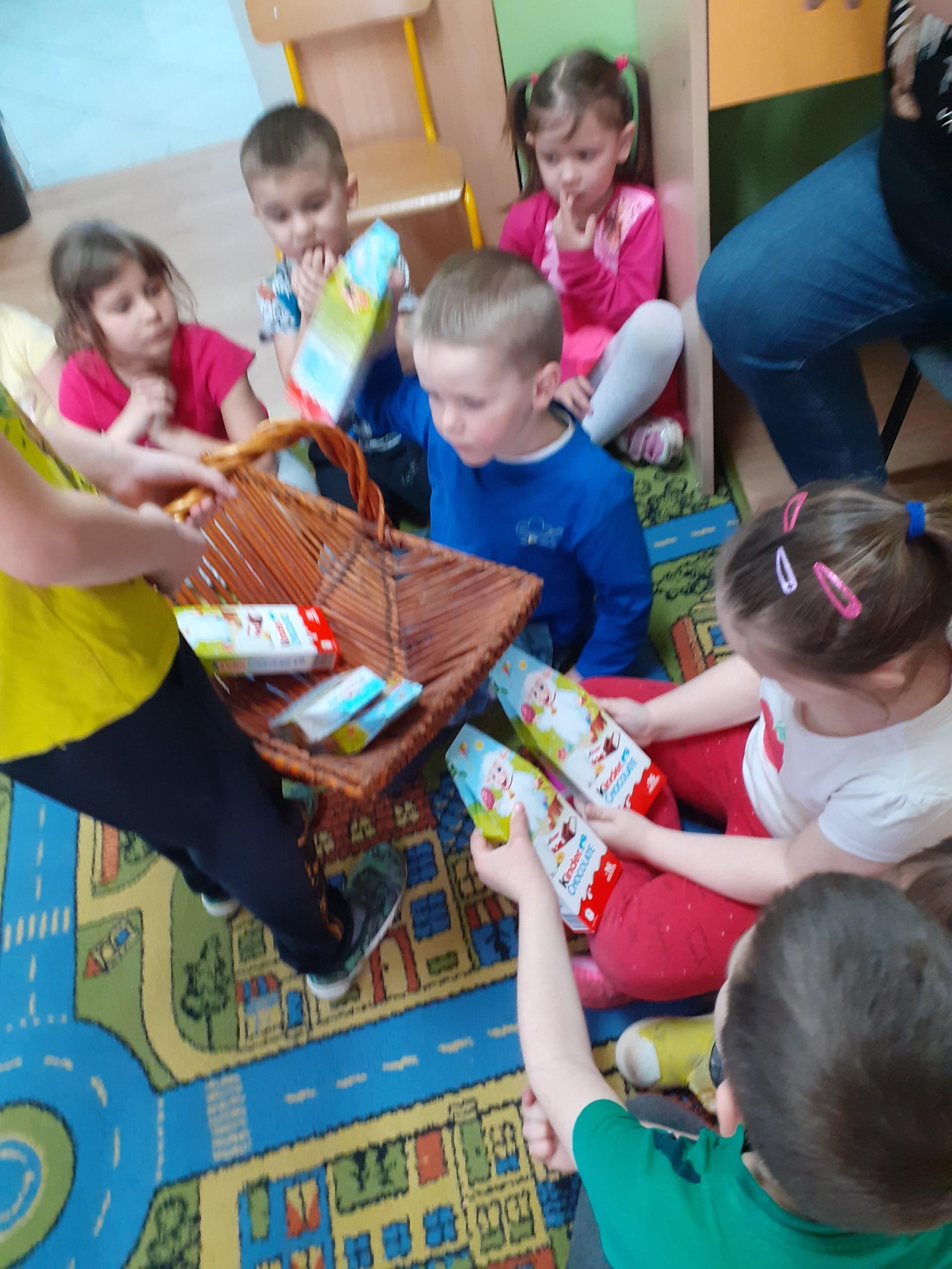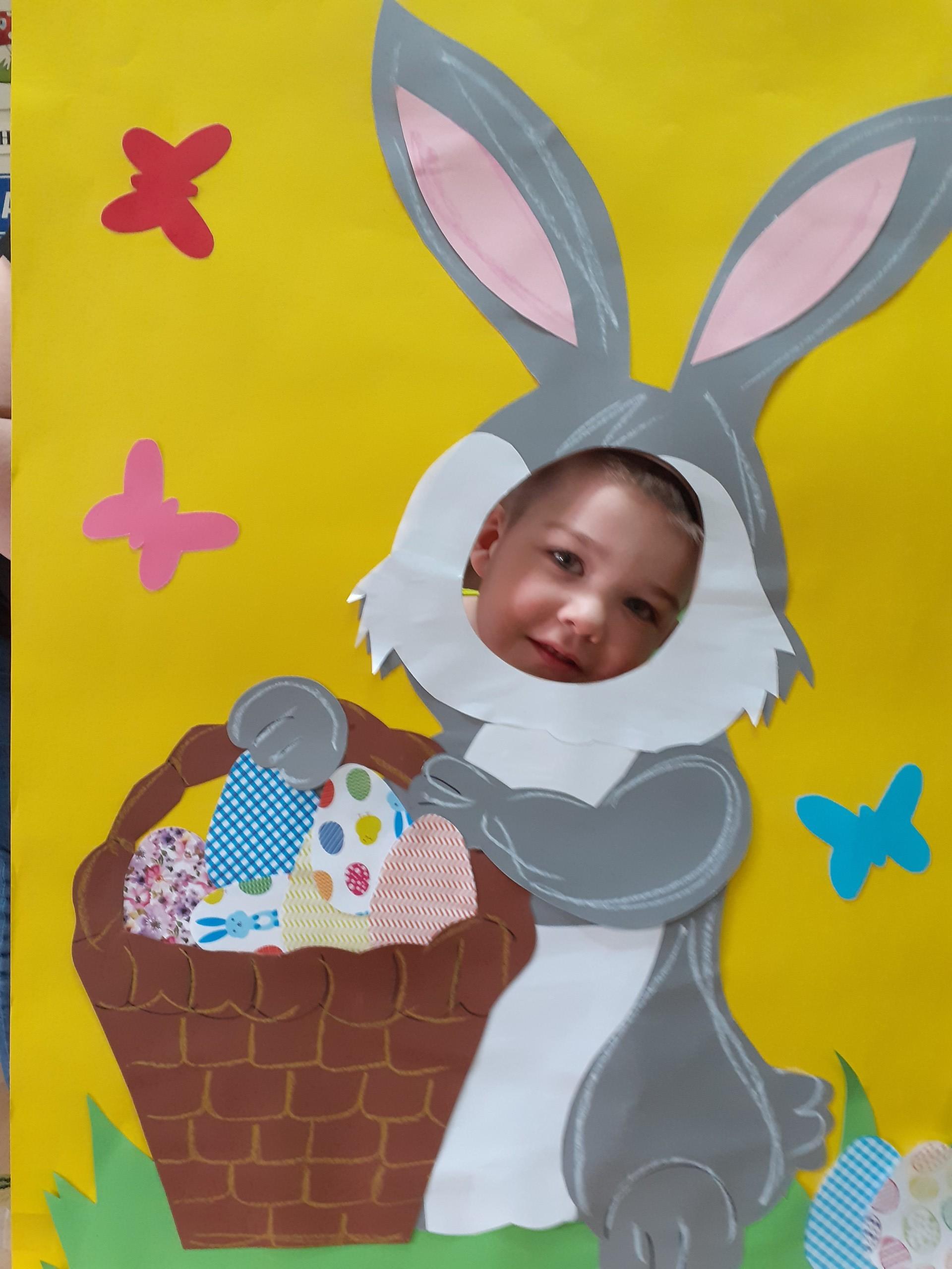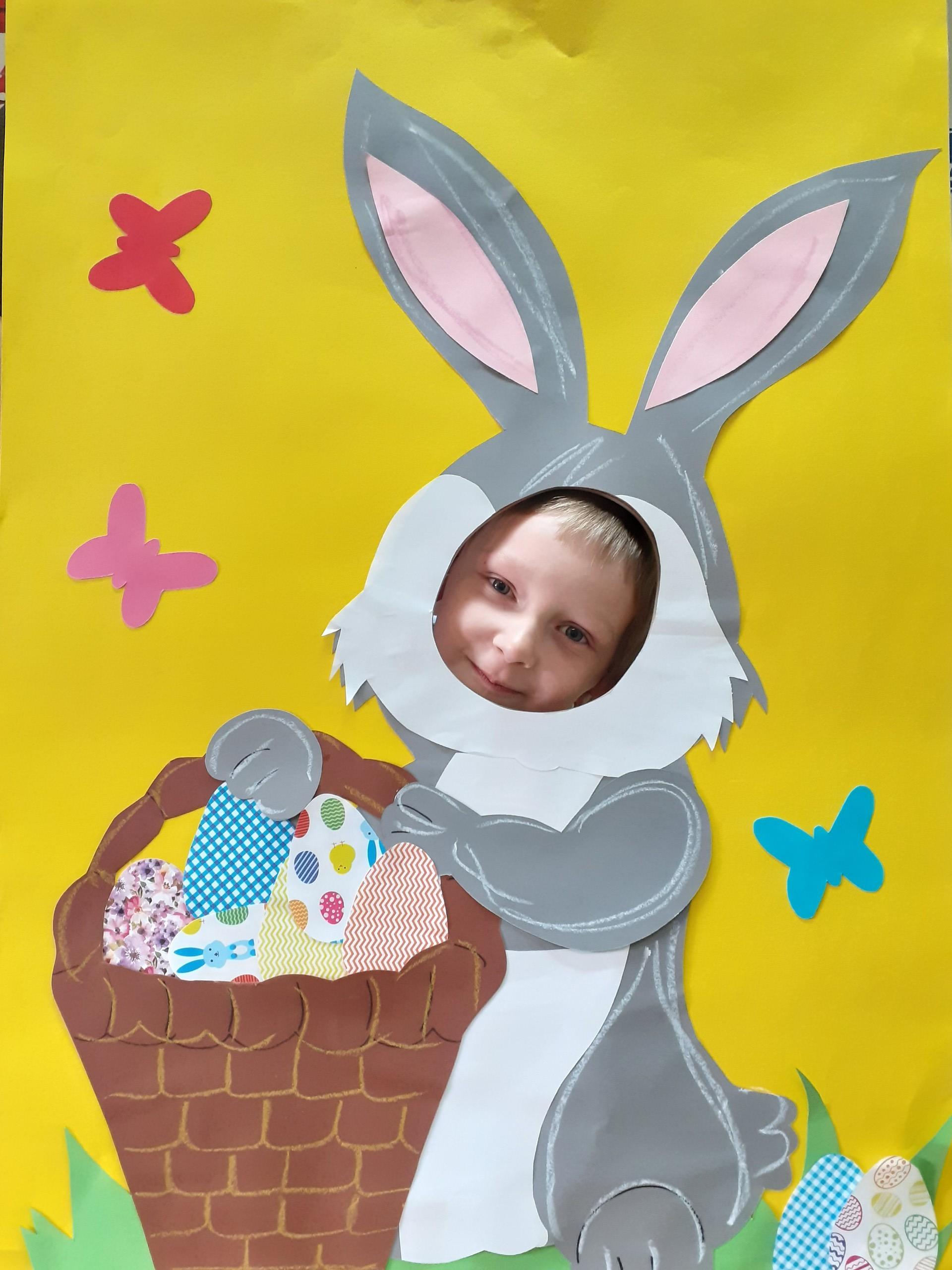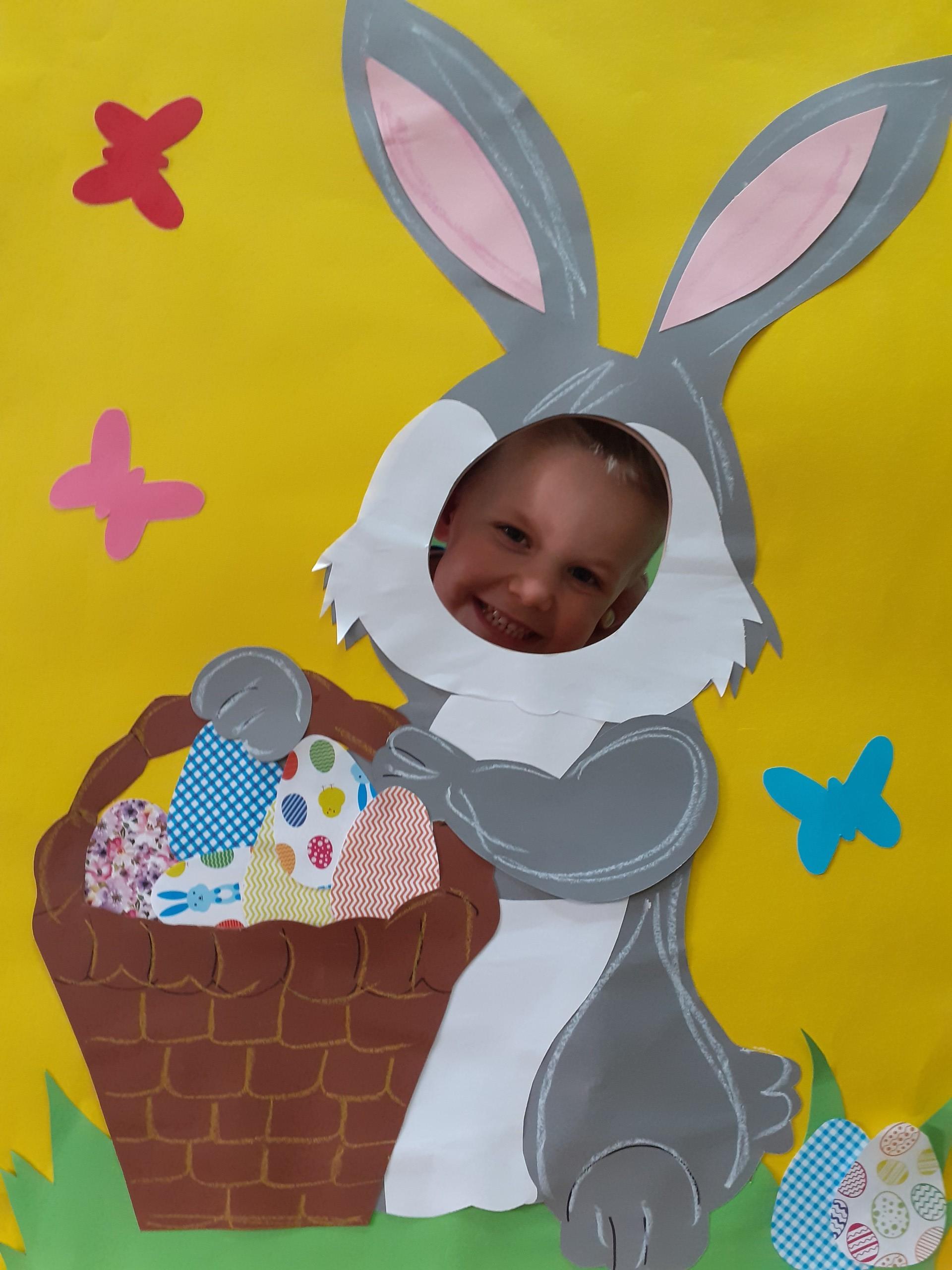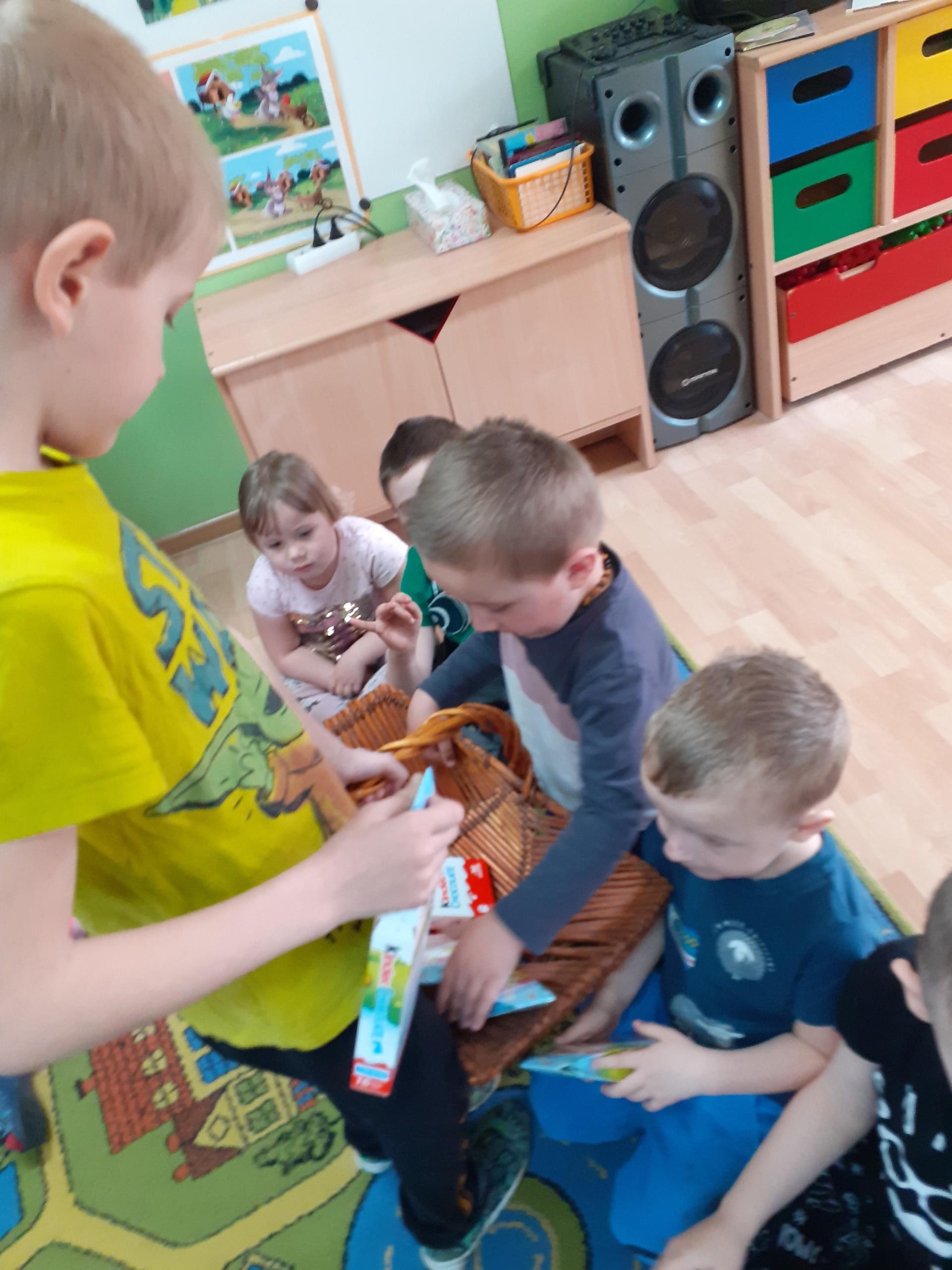 Dzisiaj do przedszkola zawitał tajemniczy gość. Był to Zając wielkanocny, który przyniósł dzieciom kosz z niespodzianką. Wszystkie dzieci z wielkim zaangażowaniem szukały kosza. Tymoteusz pierwszy znalazł upominek od zająca. Tymoteusz rozdał przedszkolakom czekoladki pozostawione w prezencie przez wielkanocnego gościa.
