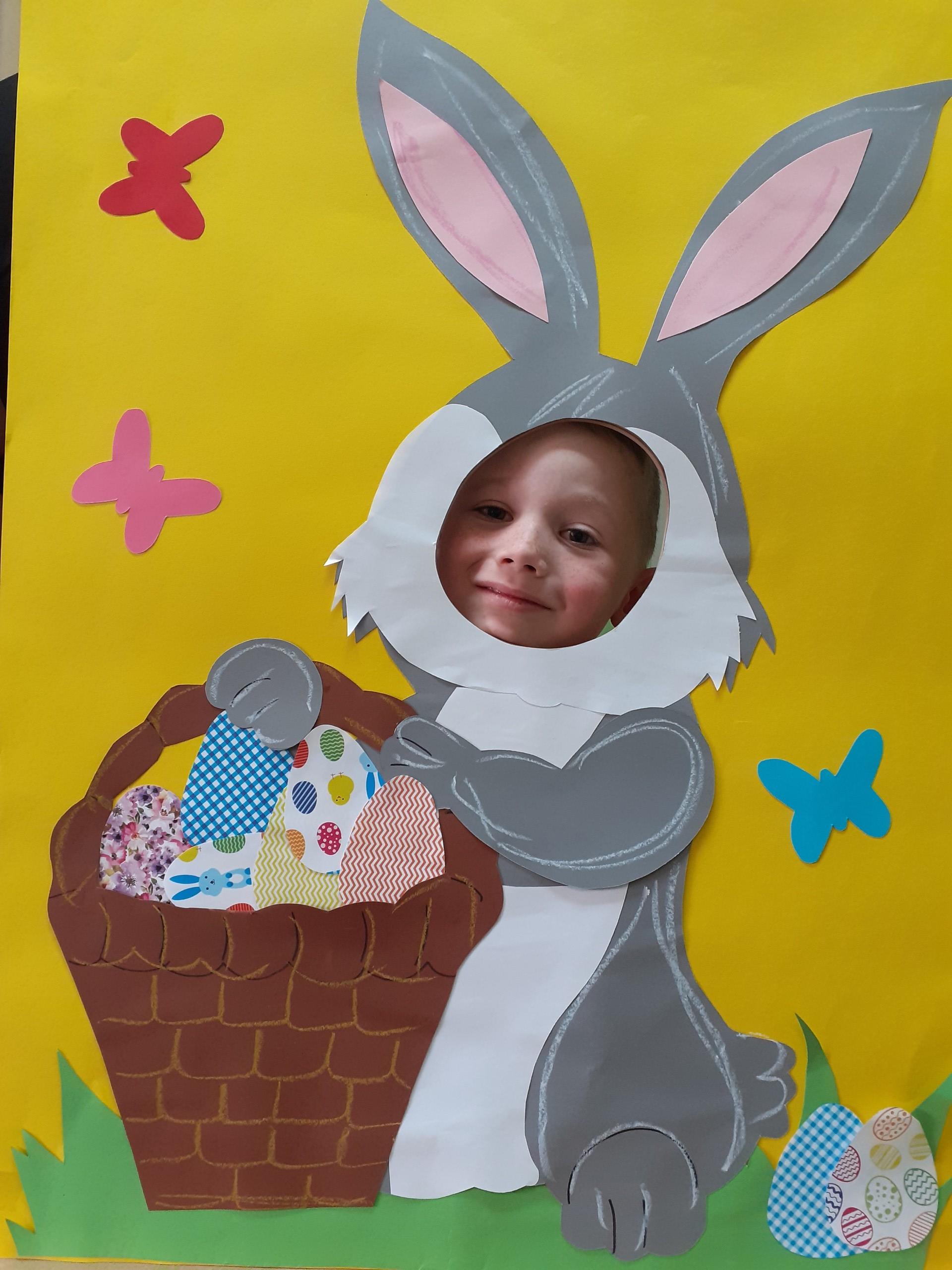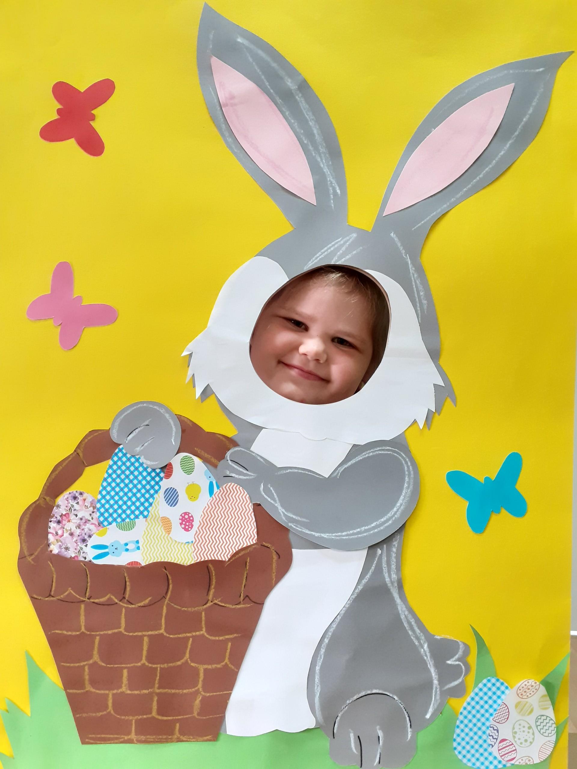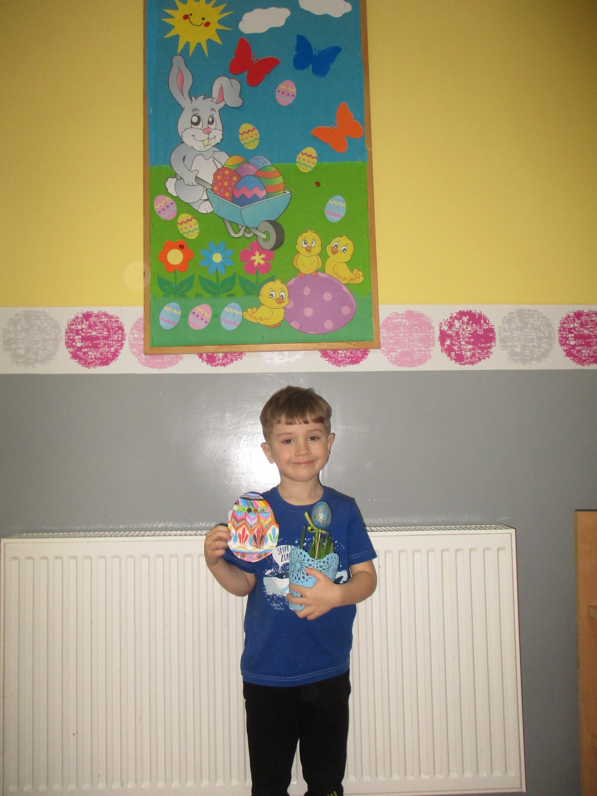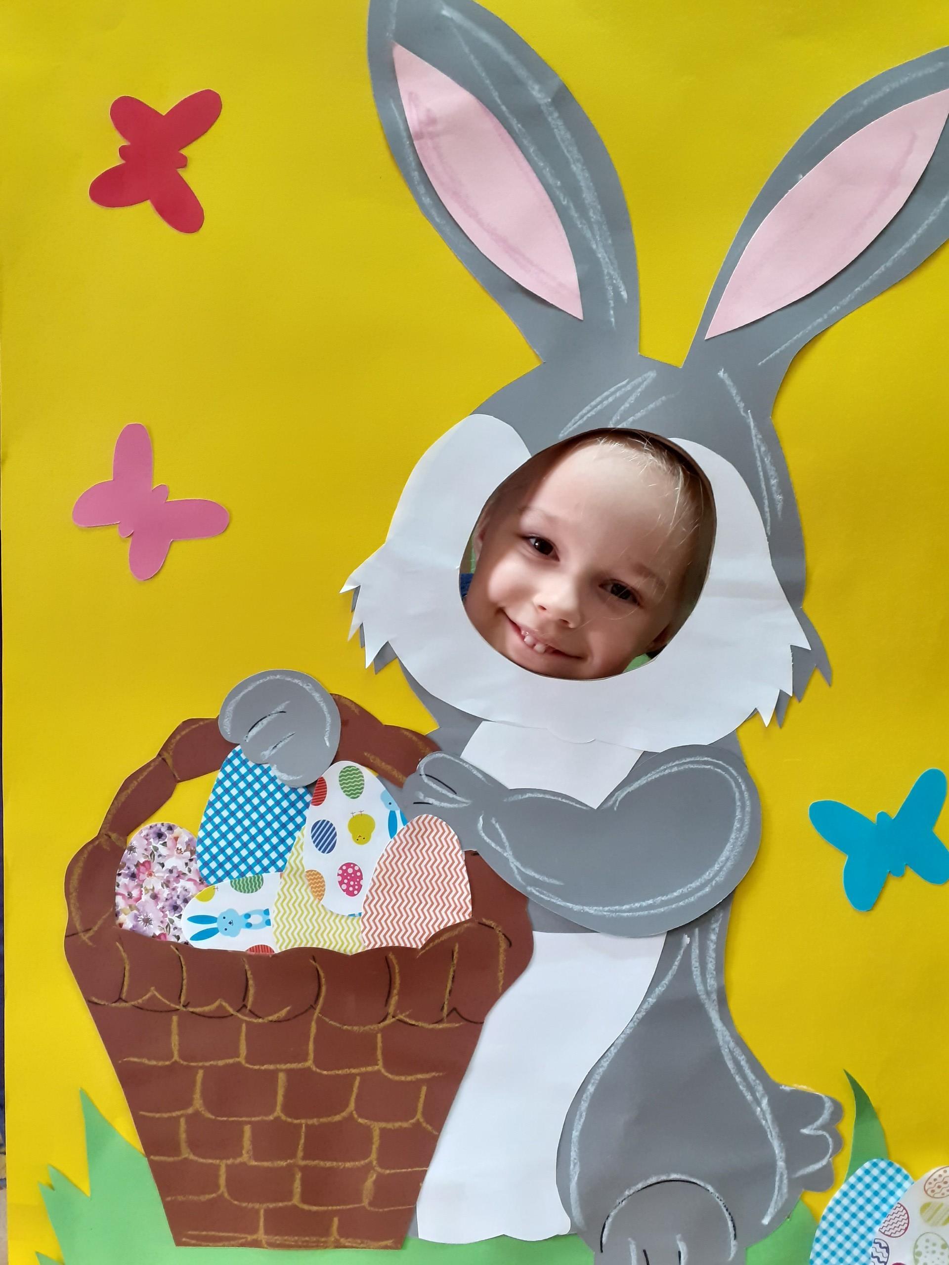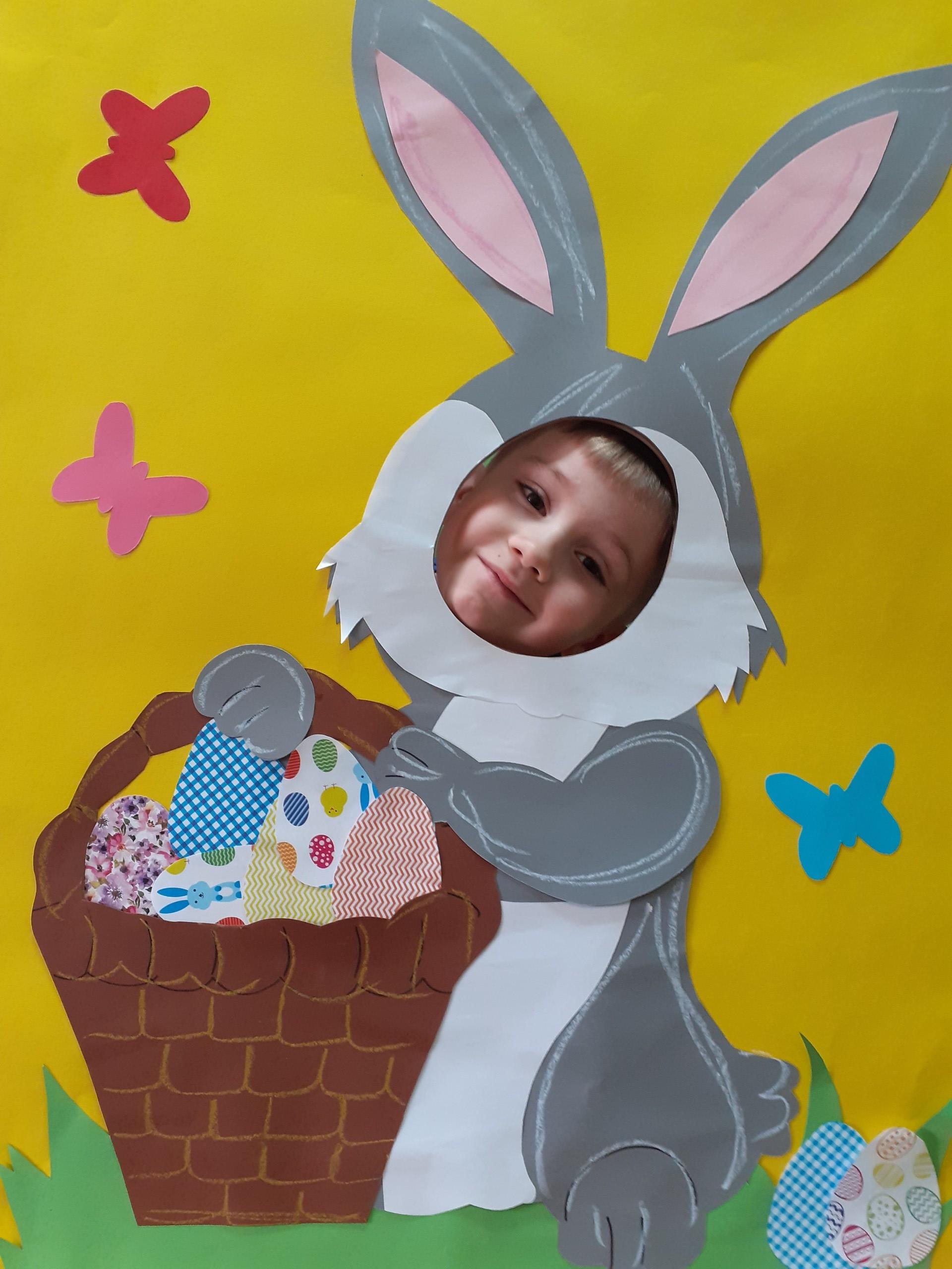 Dzisiaj do przedszkola zawitał tajemniczy gość. Był to Zając wielkanocny, który przyniósł dzieciom kosz z niespodzianką. Wszystkie dzieci z wielkim zaangażowaniem szukały kosza. Tymoteusz pierwszy znalazł upominek od zająca. Tymoteusz rozdał przedszkolakom czekoladki pozostawione w prezencie przez wielkanocnego gościa.