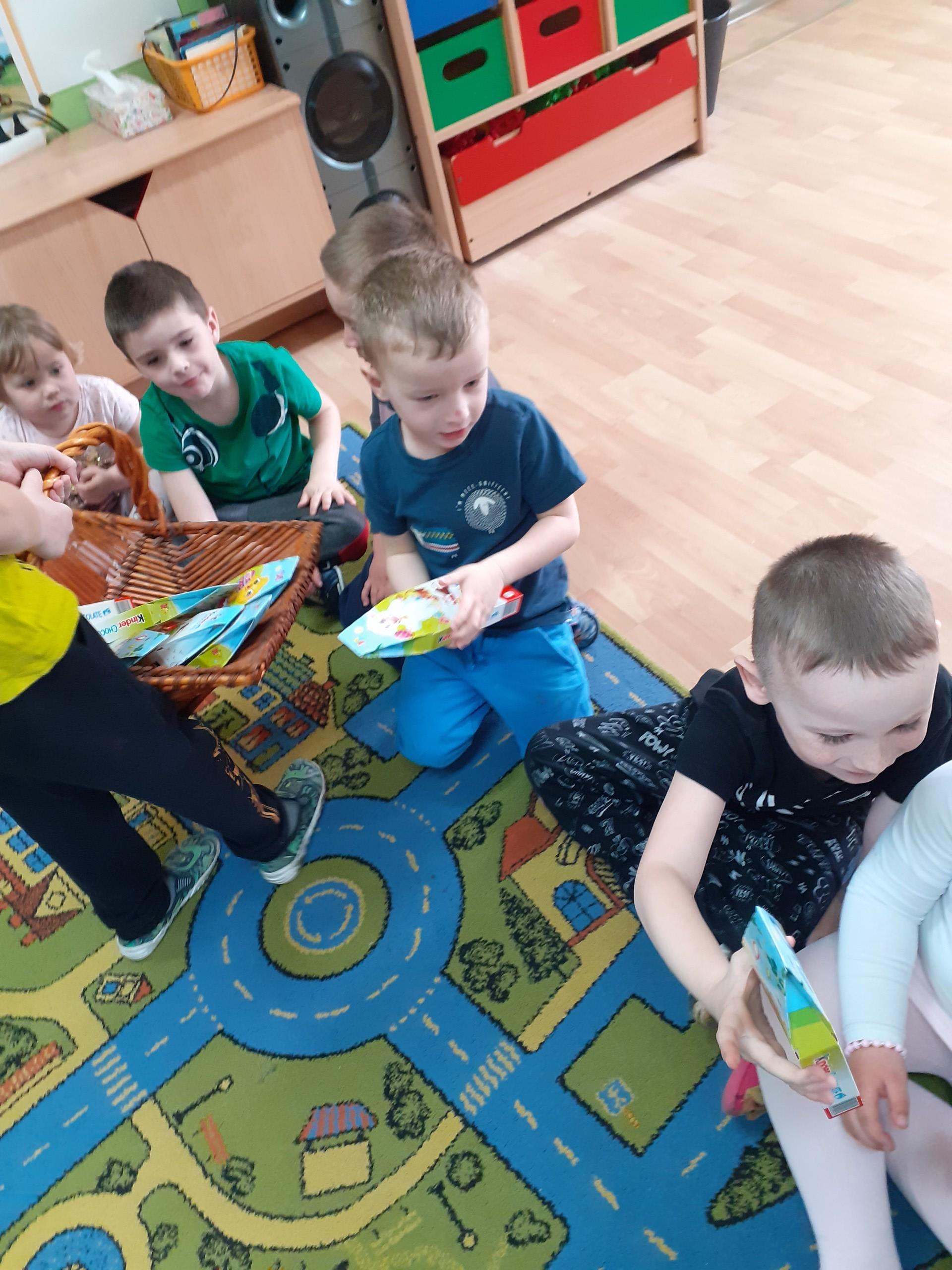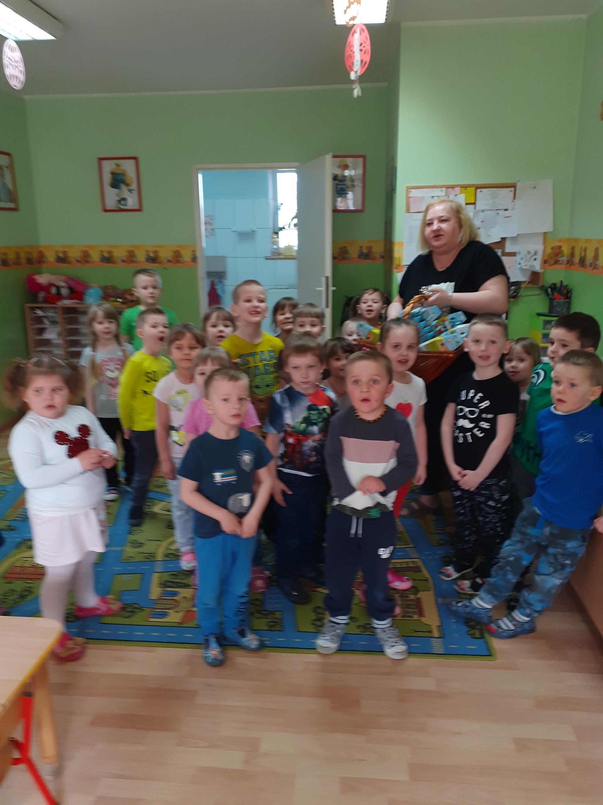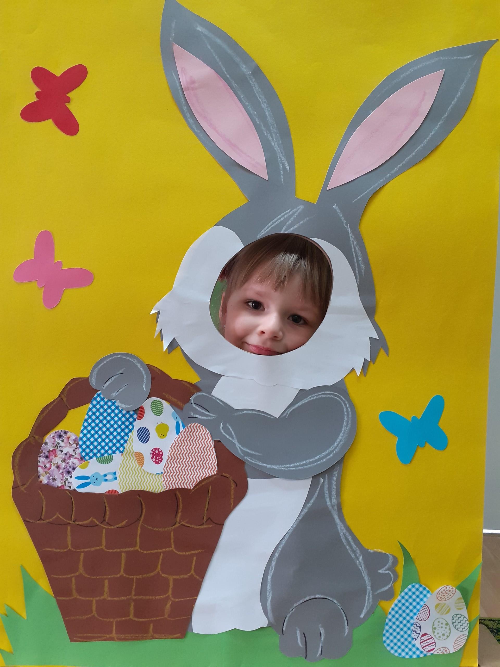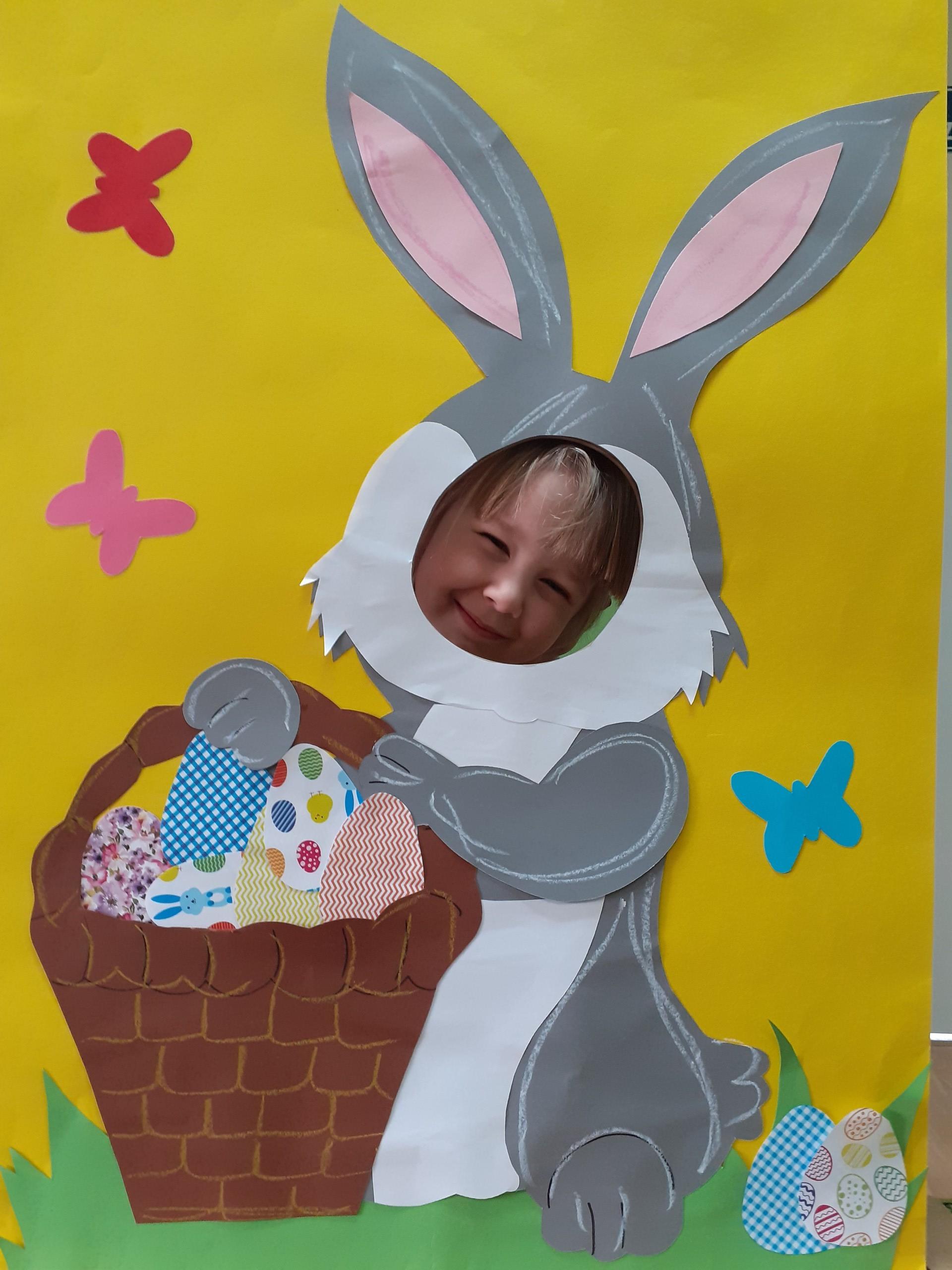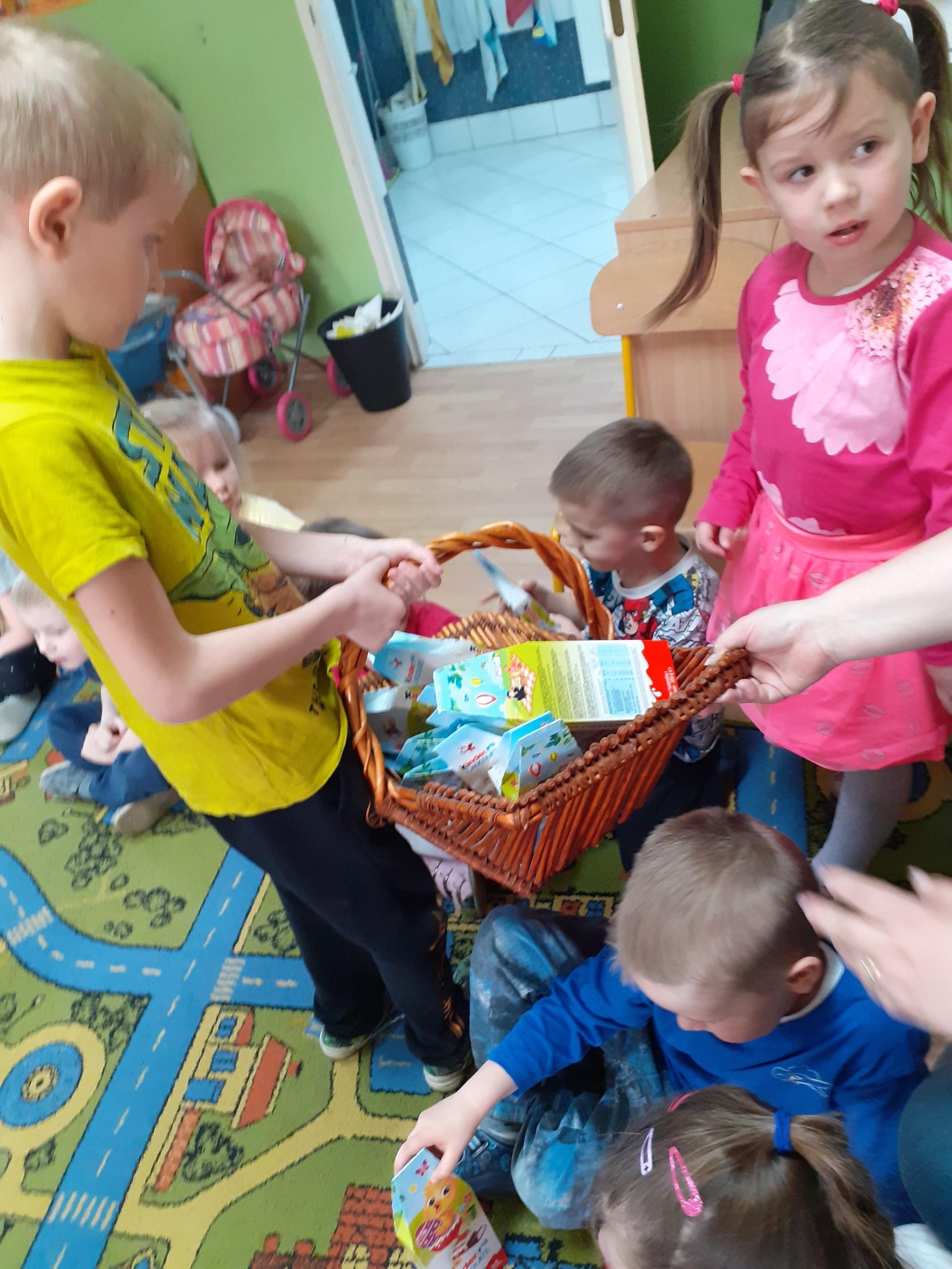 Dzisiaj do przedszkola zawitał tajemniczy gość. Był to Zając wielkanocny, który przyniósł dzieciom kosz z niespodzianką. Wszystkie dzieci z wielkim zaangażowaniem szukały kosza. Tymoteusz pierwszy znalazł upominek od zająca. Tymoteusz rozdał przedszkolakom czekoladki pozostawione w prezencie przez wielkanocnego gościa.