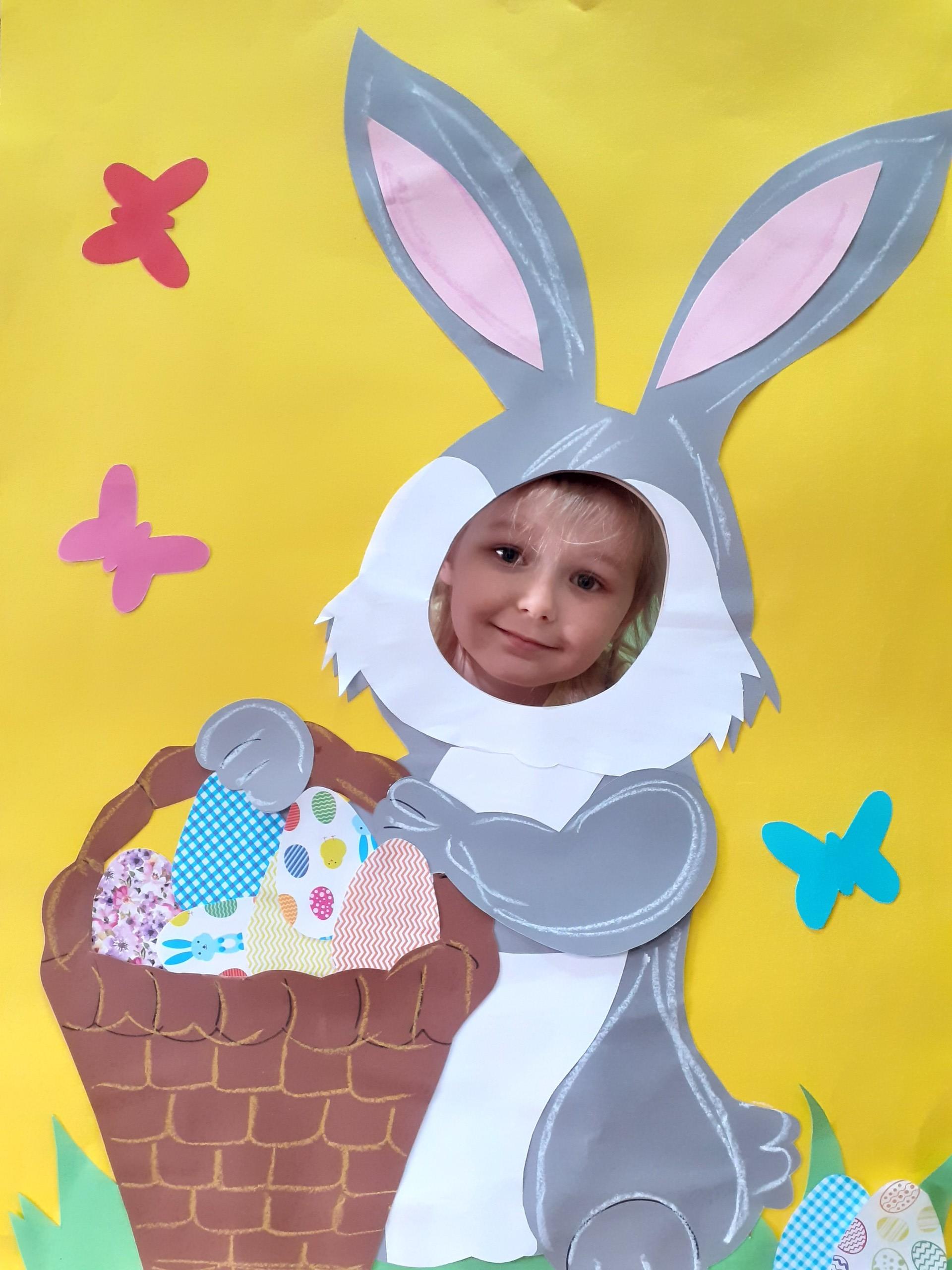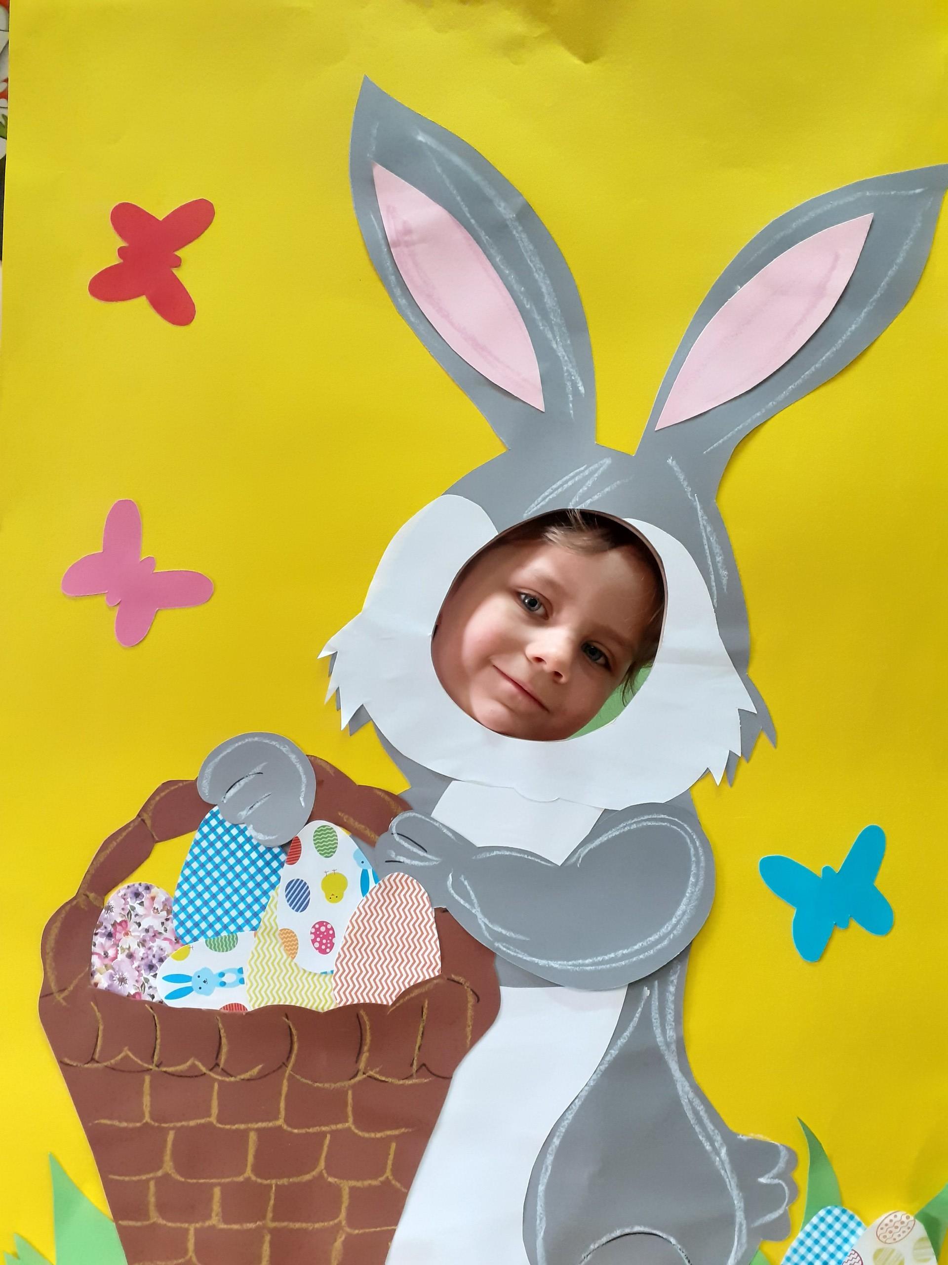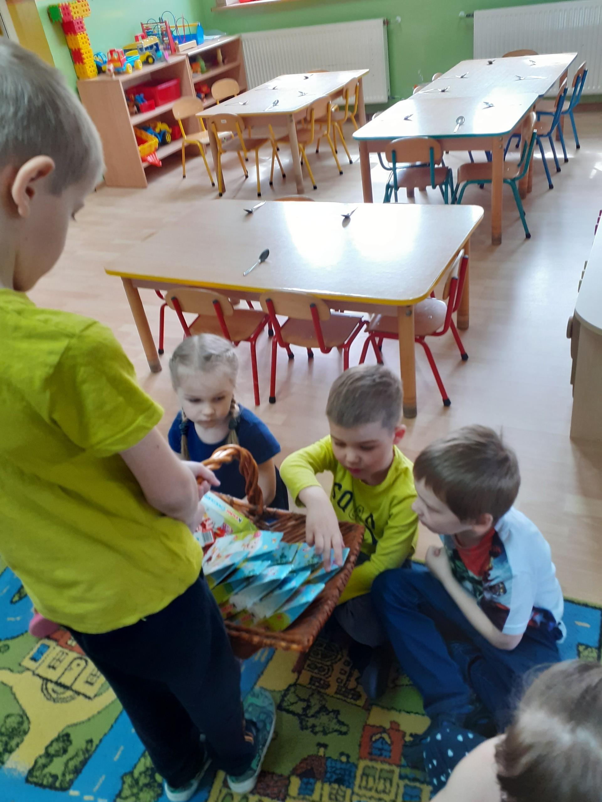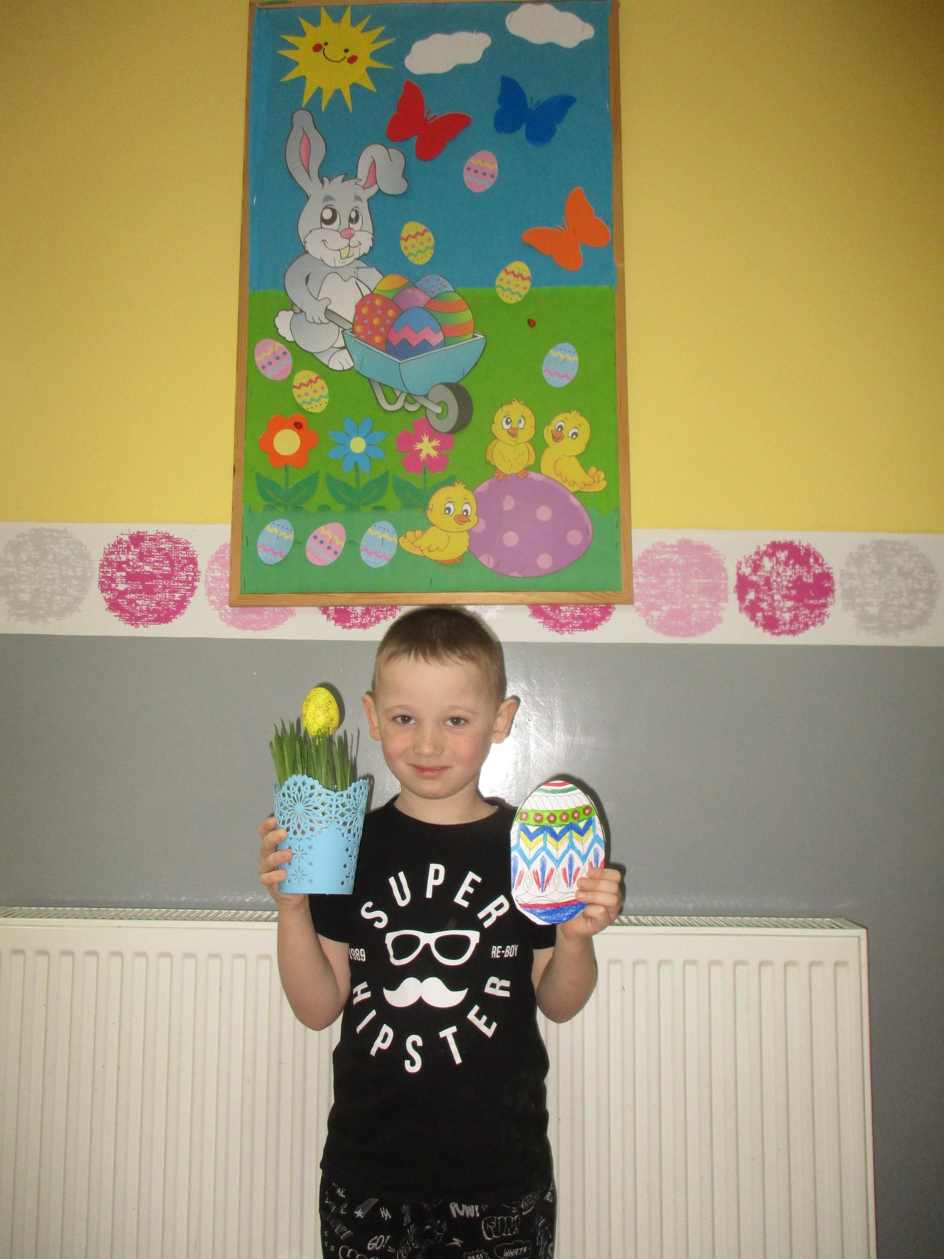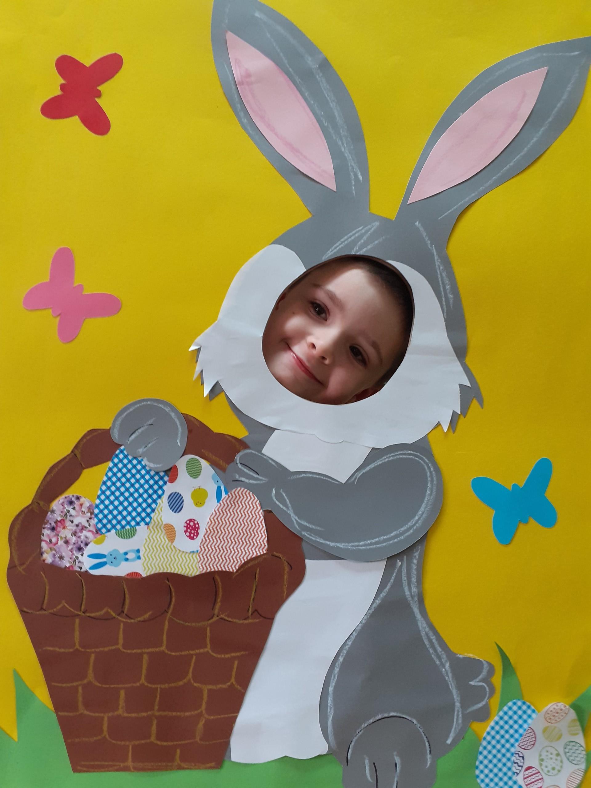 Dzisiaj do przedszkola zawitał tajemniczy gość. Był to Zając wielkanocny, który przyniósł dzieciom kosz z niespodzianką. Wszystkie dzieci z wielkim zaangażowaniem szukały kosza. Tymoteusz pierwszy znalazł upominek od zająca. Tymoteusz rozdał przedszkolakom czekoladki pozostawione w prezencie przez wielkanocnego gościa.