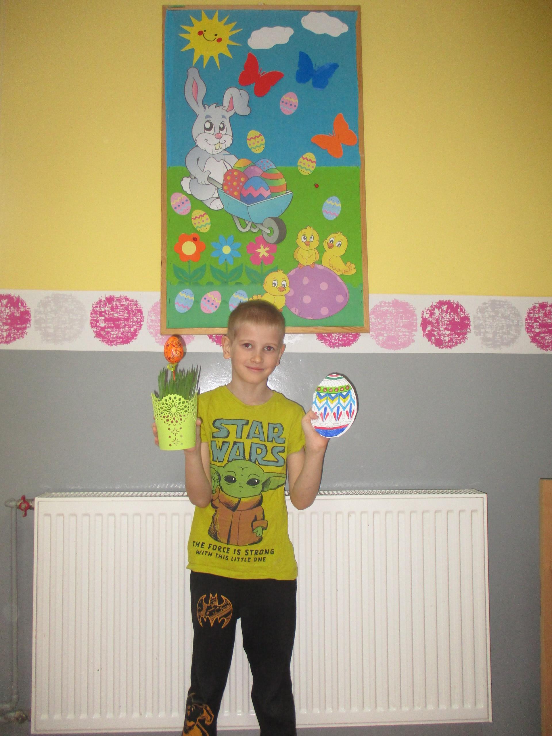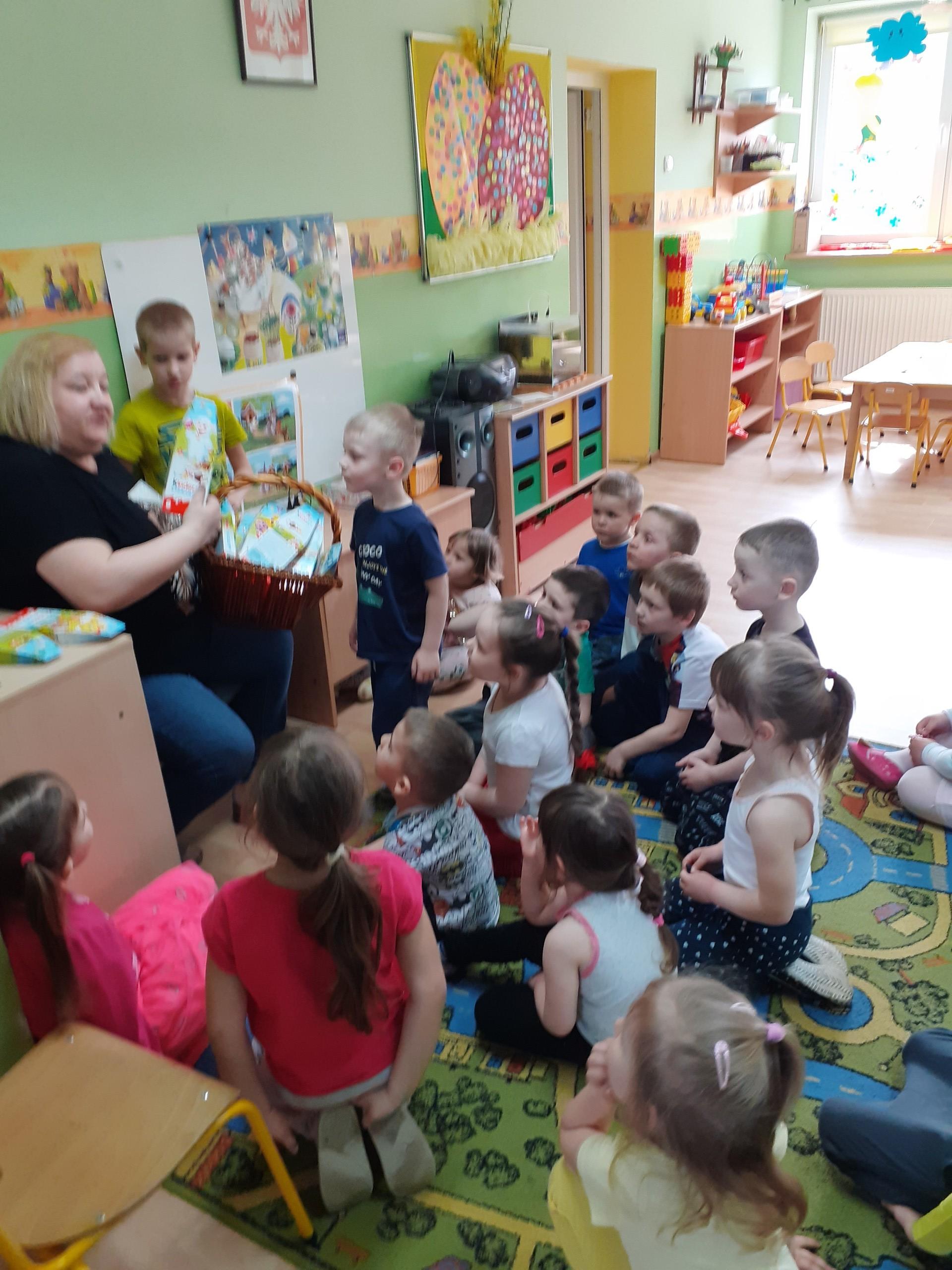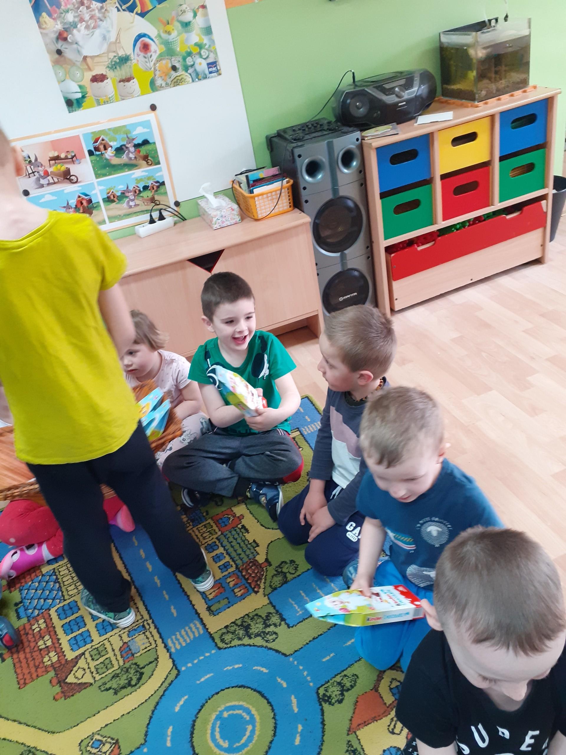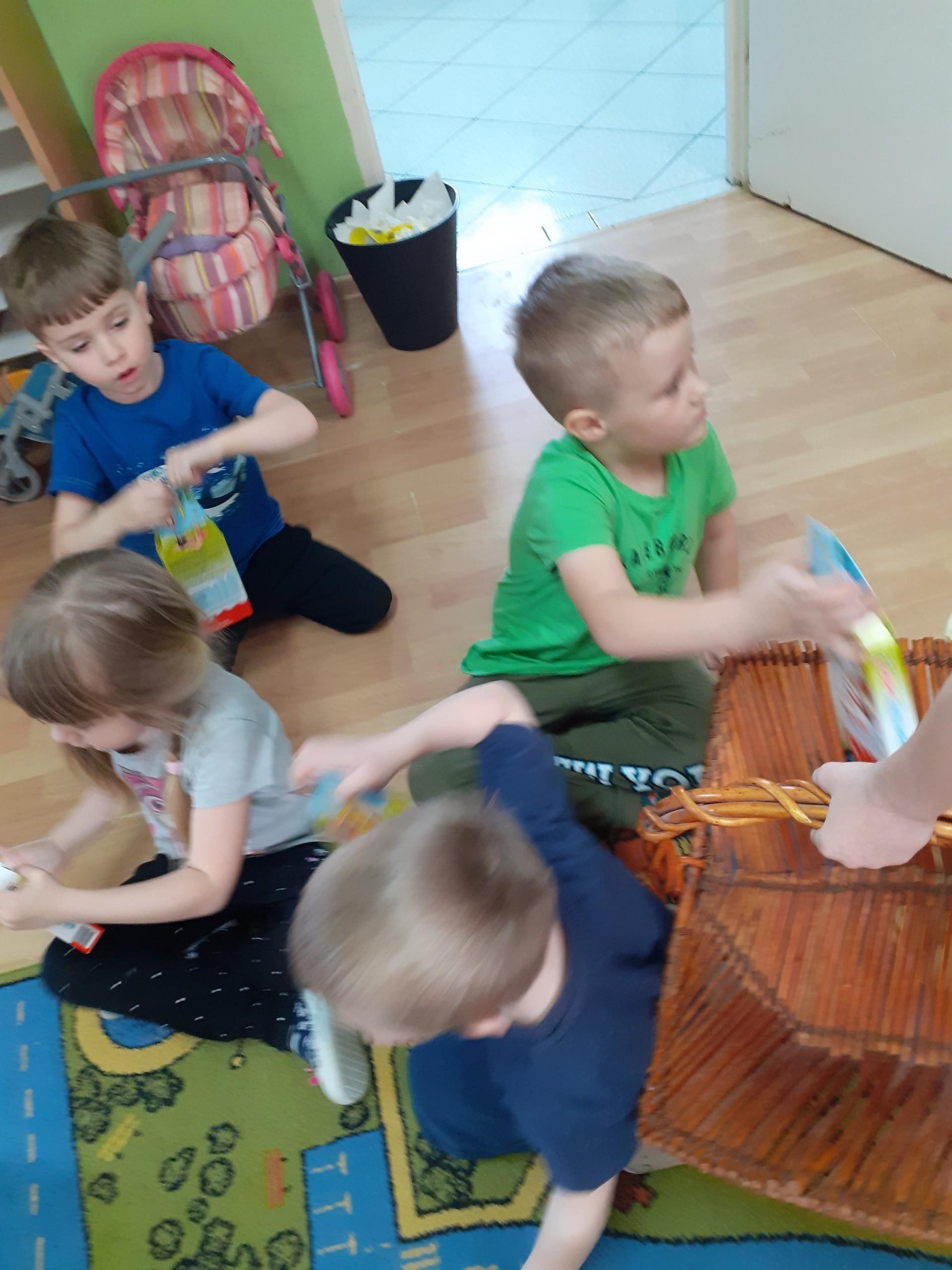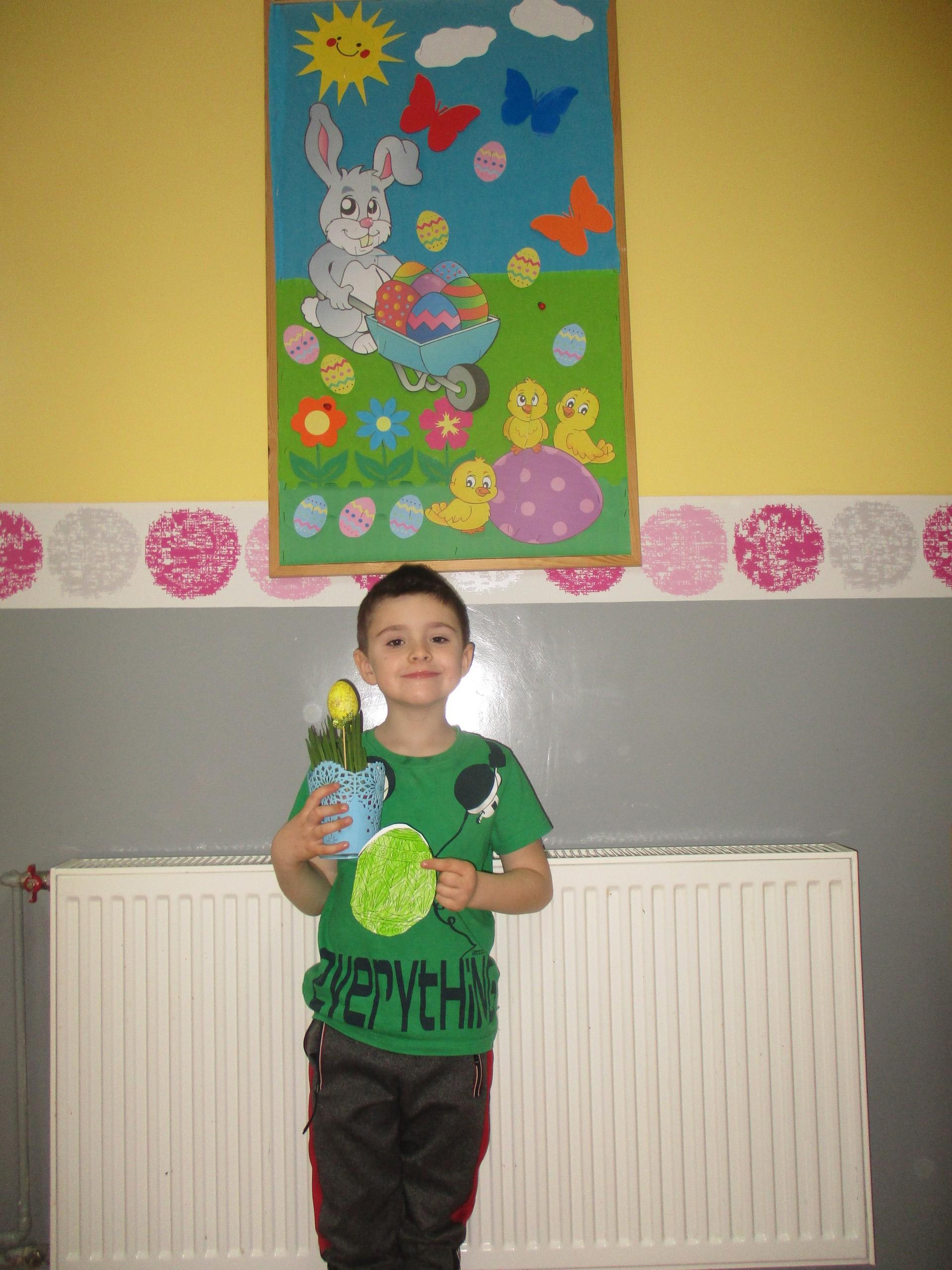 Dzisiaj do przedszkola zawitał tajemniczy gość. Był to Zając wielkanocny, który przyniósł dzieciom kosz z niespodzianką. Wszystkie dzieci z wielkim zaangażowaniem szukały kosza. Tymoteusz pierwszy znalazł upominek od zająca. Tymoteusz rozdał przedszkolakom czekoladki pozostawione w prezencie przez wielkanocnego gościa.