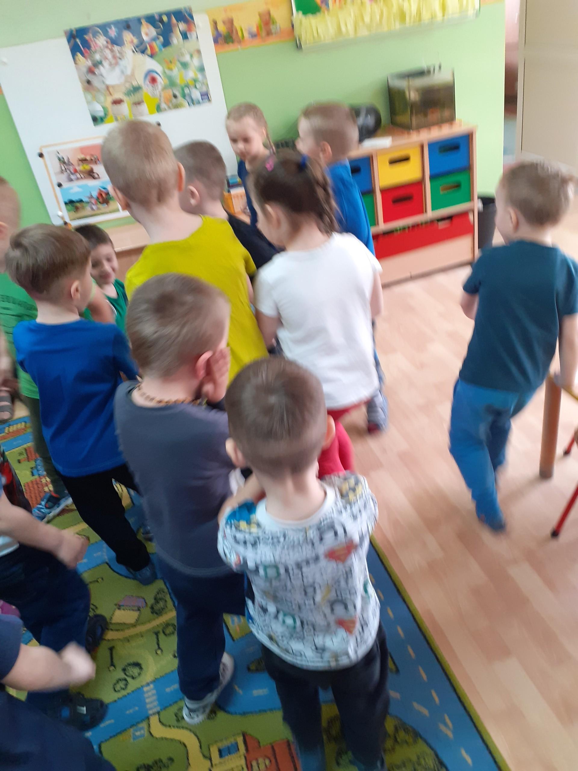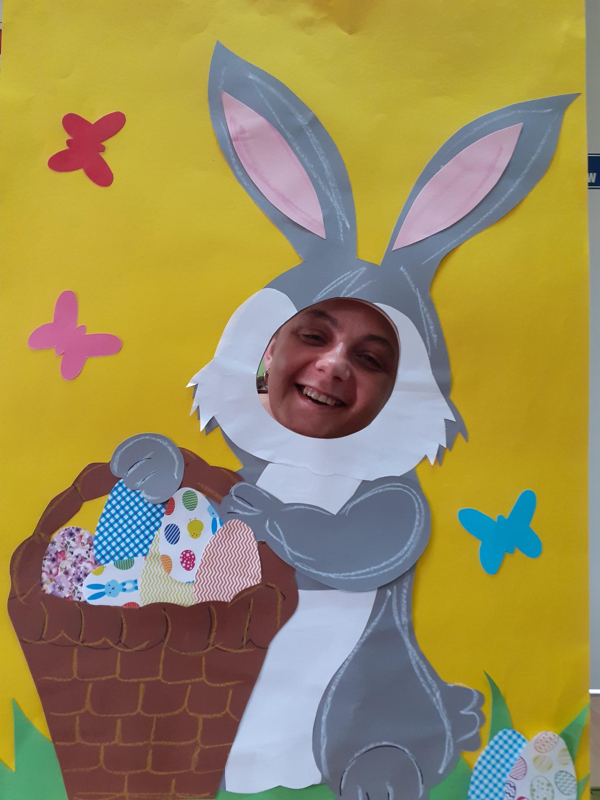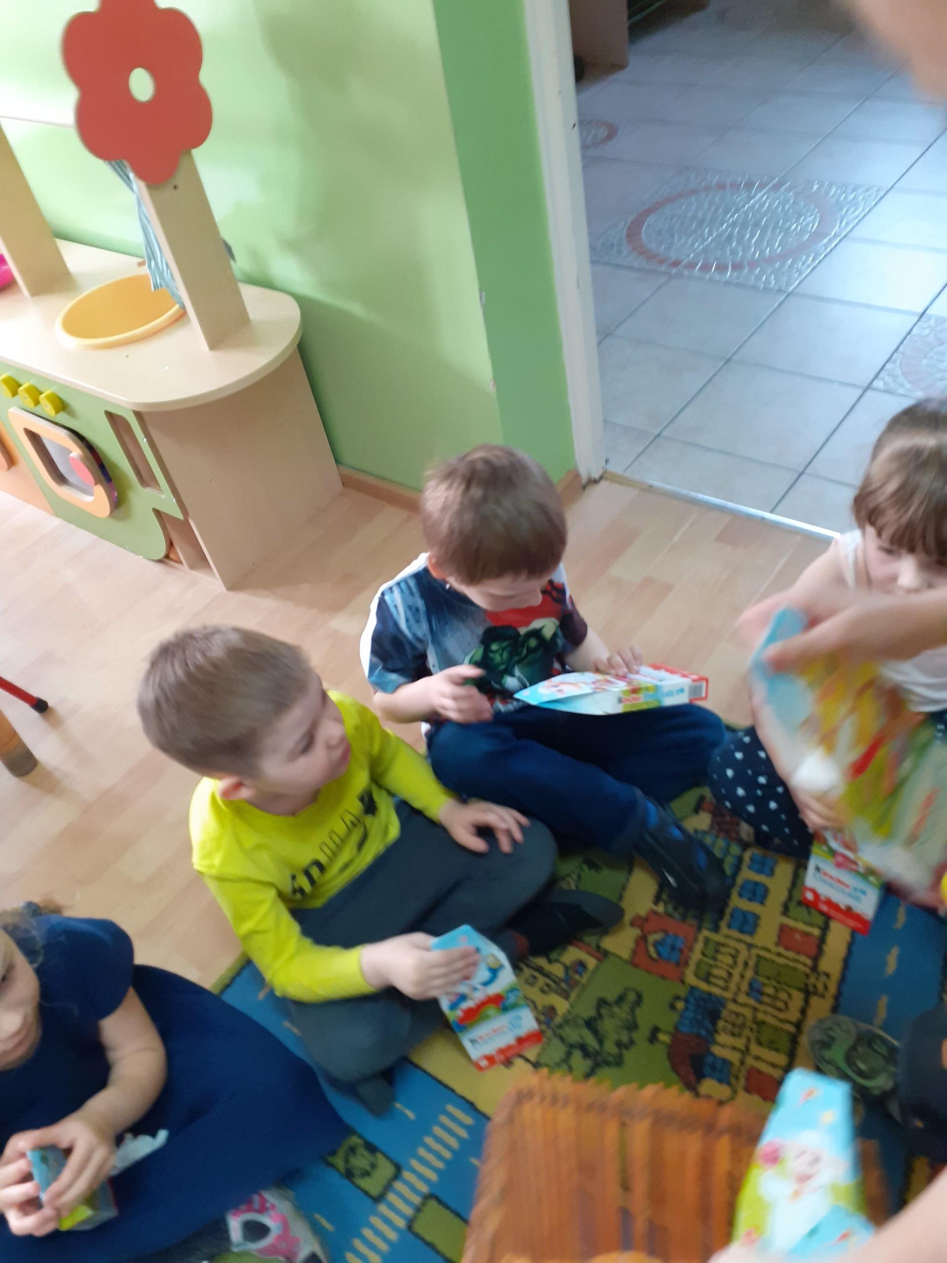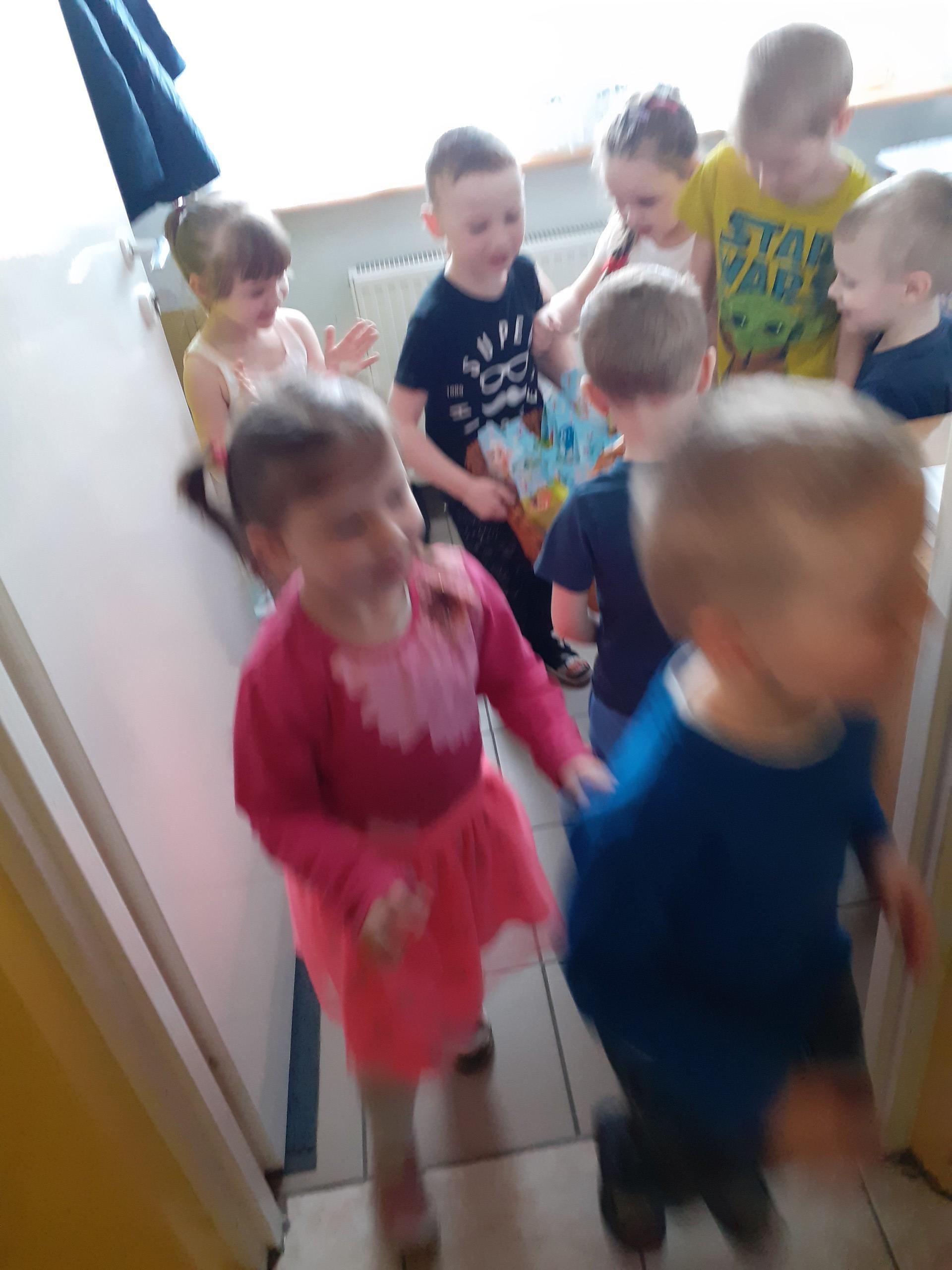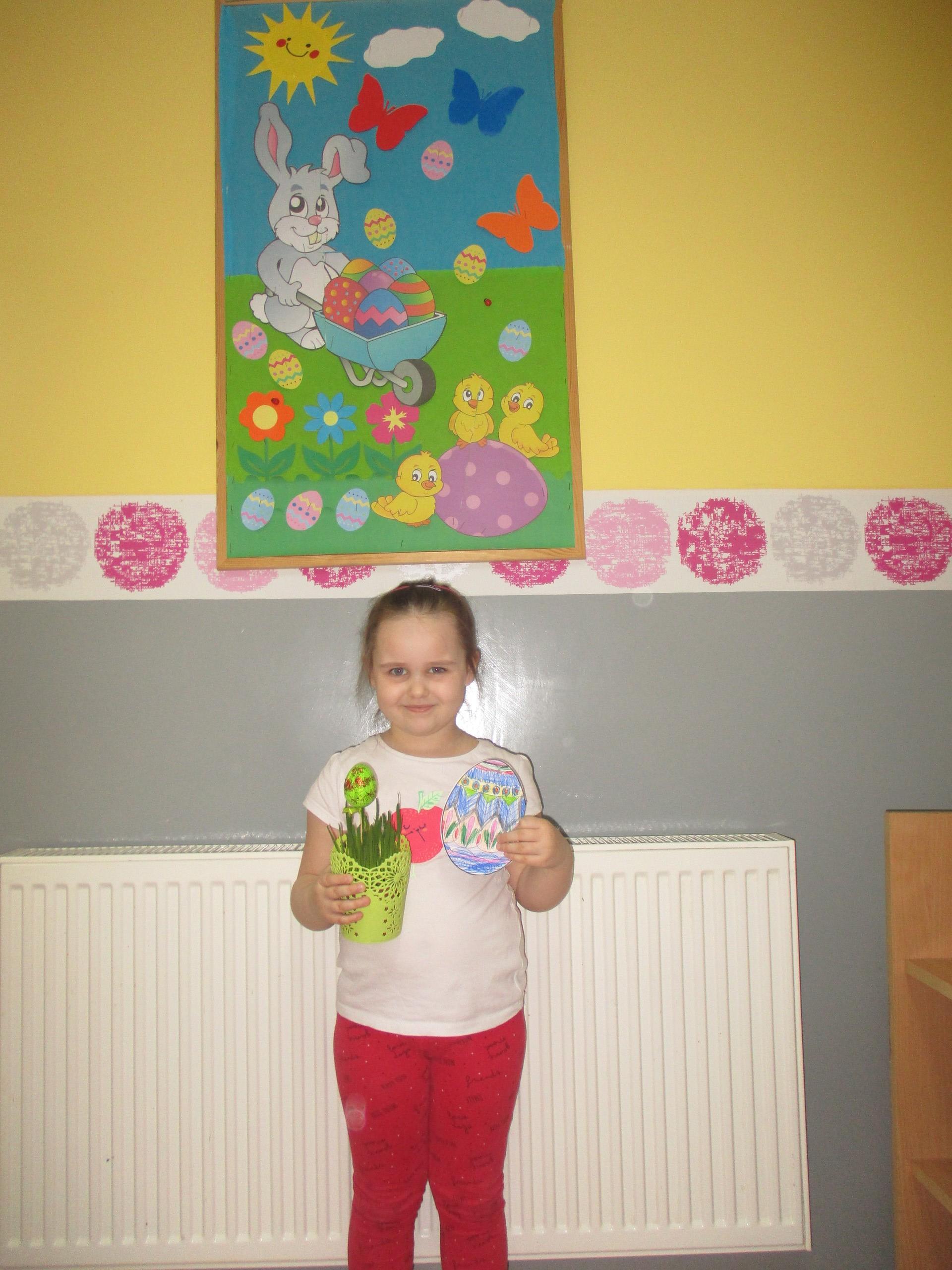 Dzisiaj do przedszkola zawitał tajemniczy gość. Był to Zając wielkanocny, który przyniósł dzieciom kosz z niespodzianką. Wszystkie dzieci z wielkim zaangażowaniem szukały kosza. Tymoteusz pierwszy znalazł upominek od zająca. Tymoteusz rozdał przedszkolakom czekoladki pozostawione w prezencie przez wielkanocnego gościa.